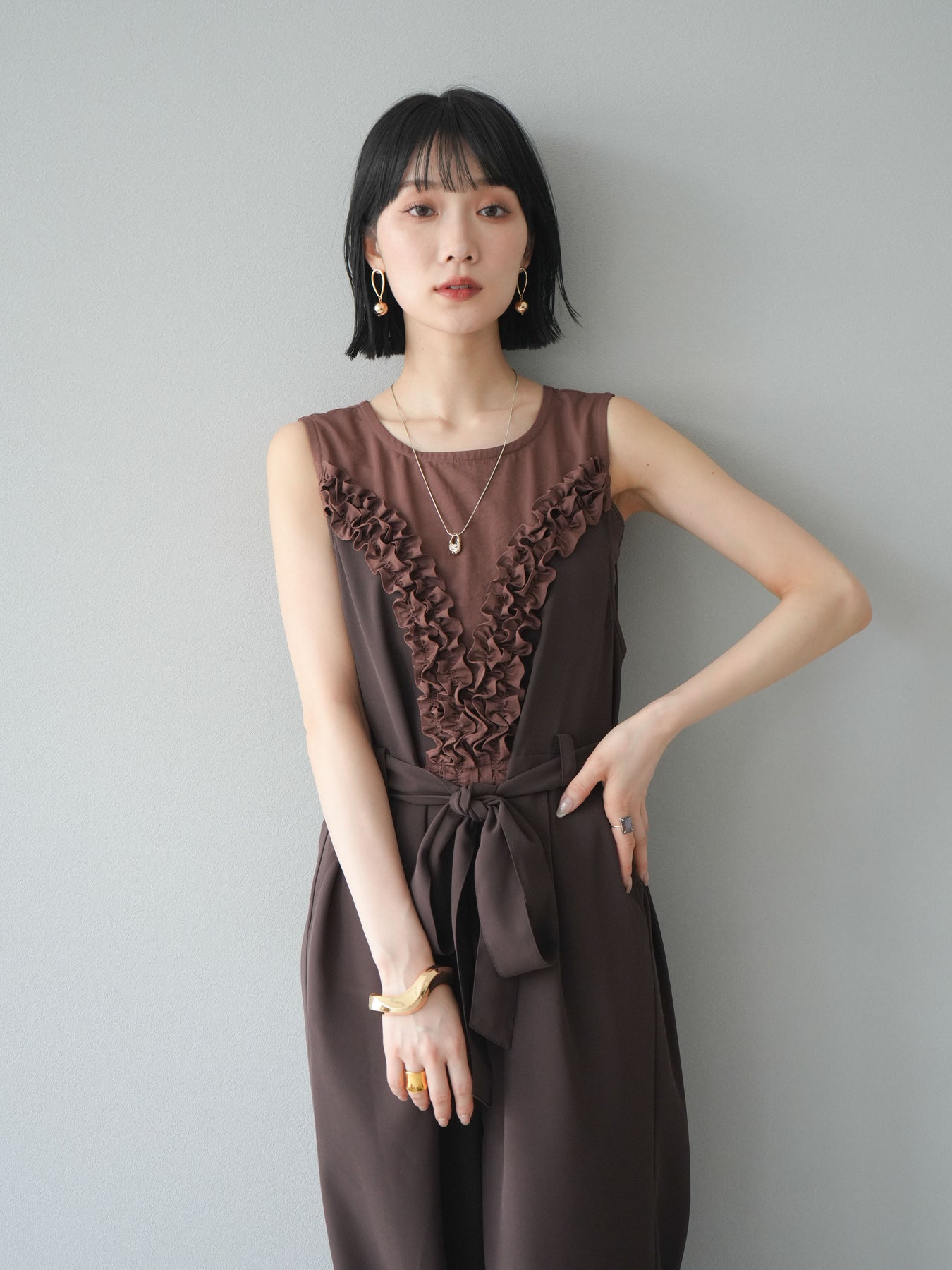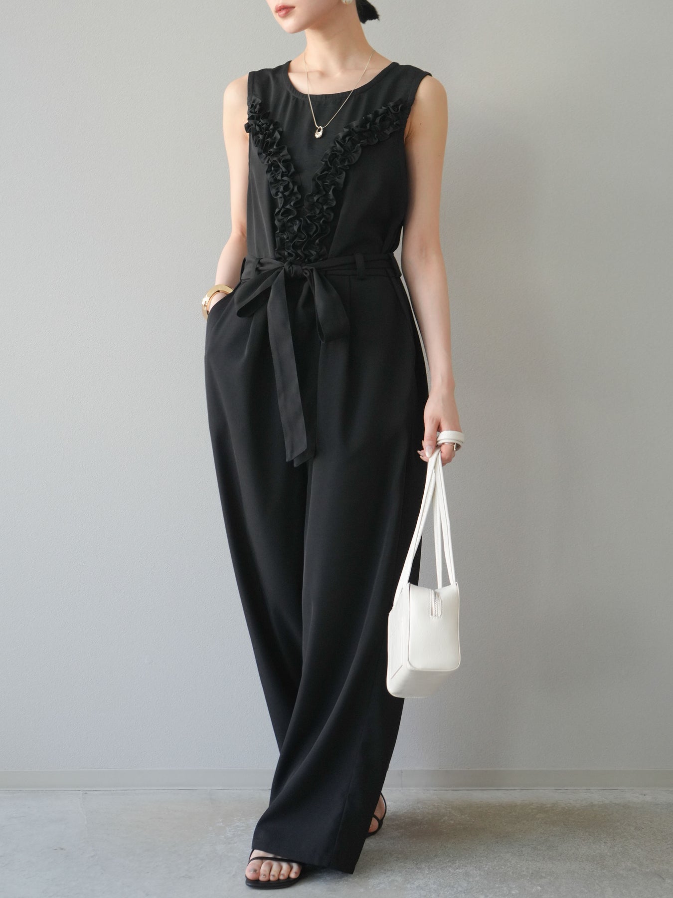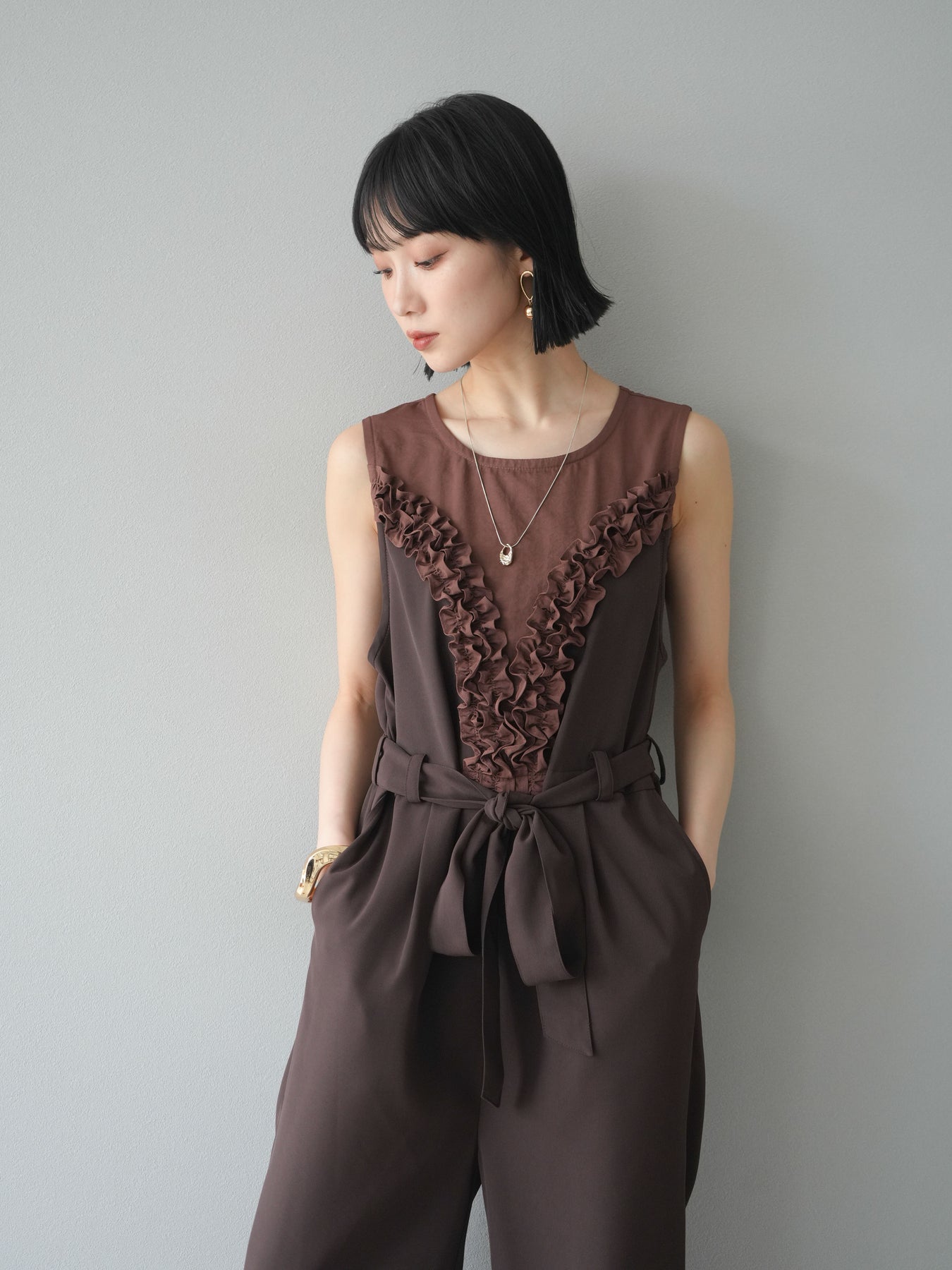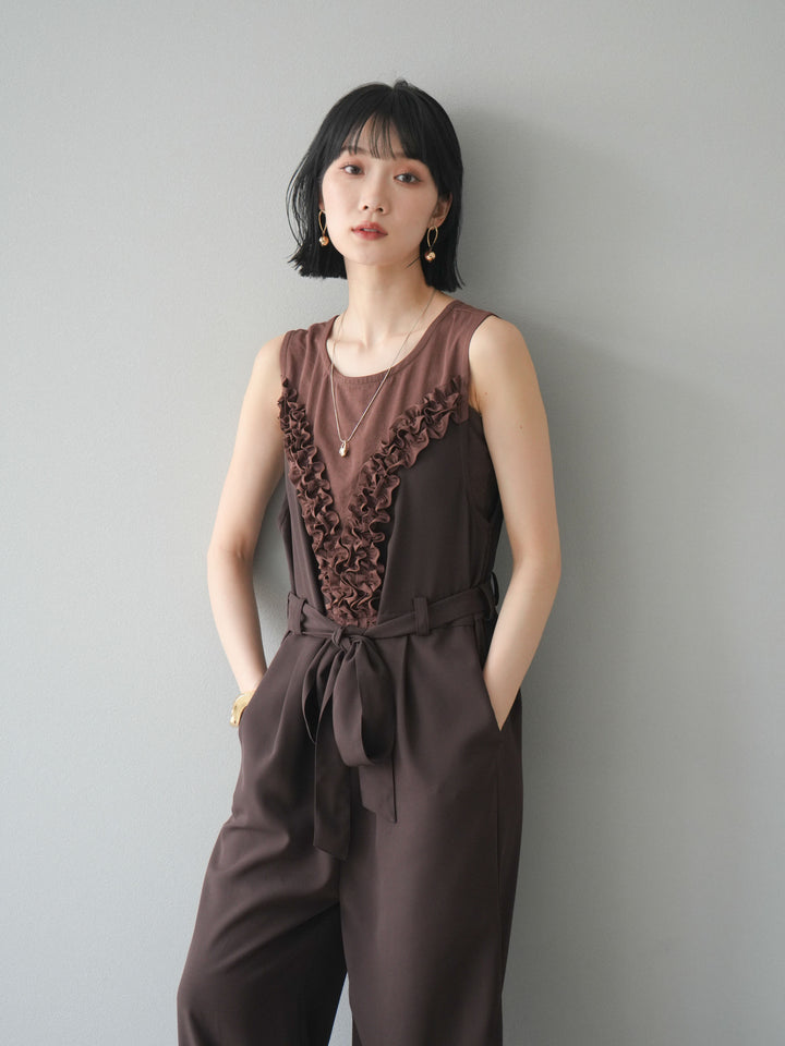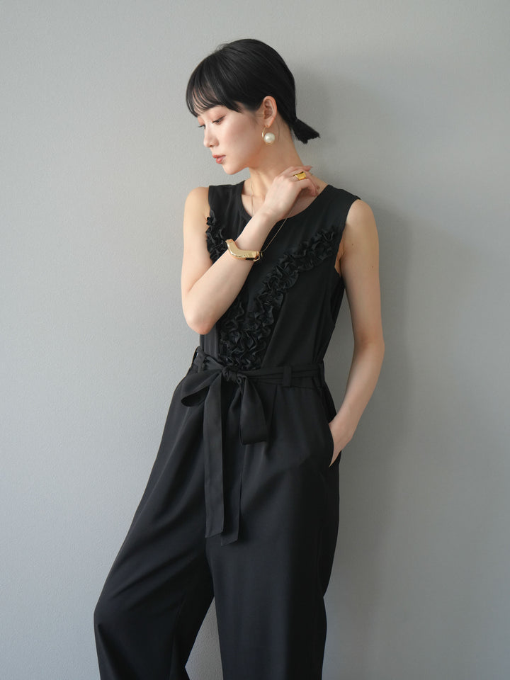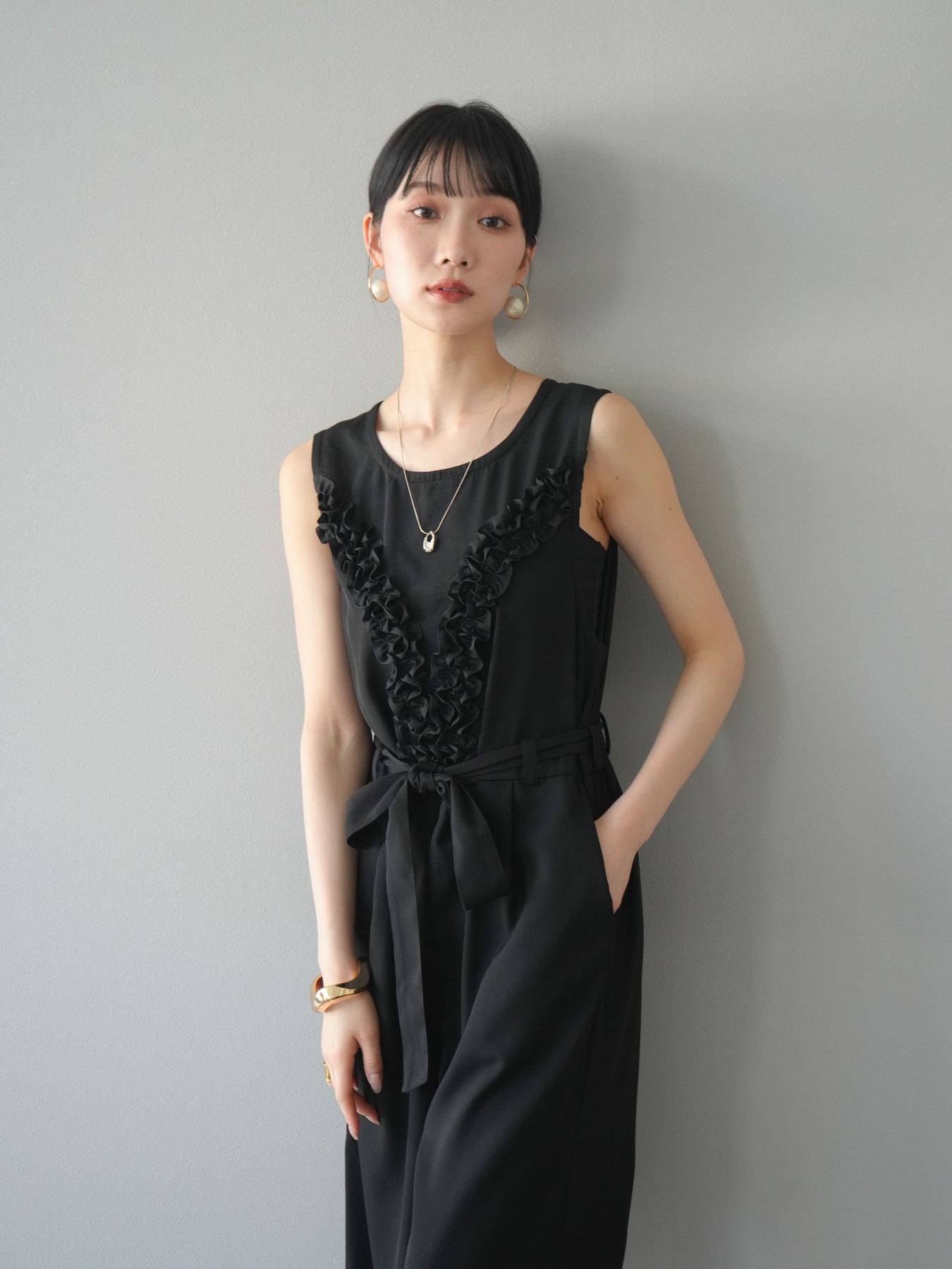 胸元に施した立体感のあるフリルが華やかなアクセントになるジャンプスーツ。ウエストのリボンベルトでメリハリのあるシルエットが叶い、スタイルアップ効果も期待できます。落ち感のある素材で、きれいめにもカジュアルにも着こなせる万能アイテム。トレンド感と女性らしさを両立した一着です。 ※ボトムス、キャミソール(インナー)以外の商品は一律でインナーは付属していません