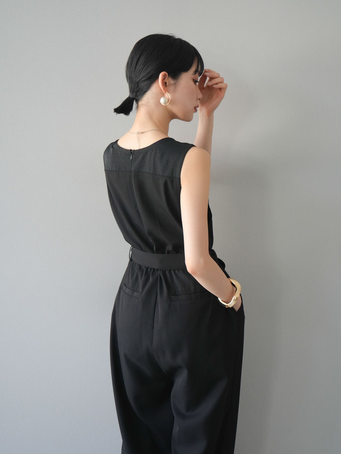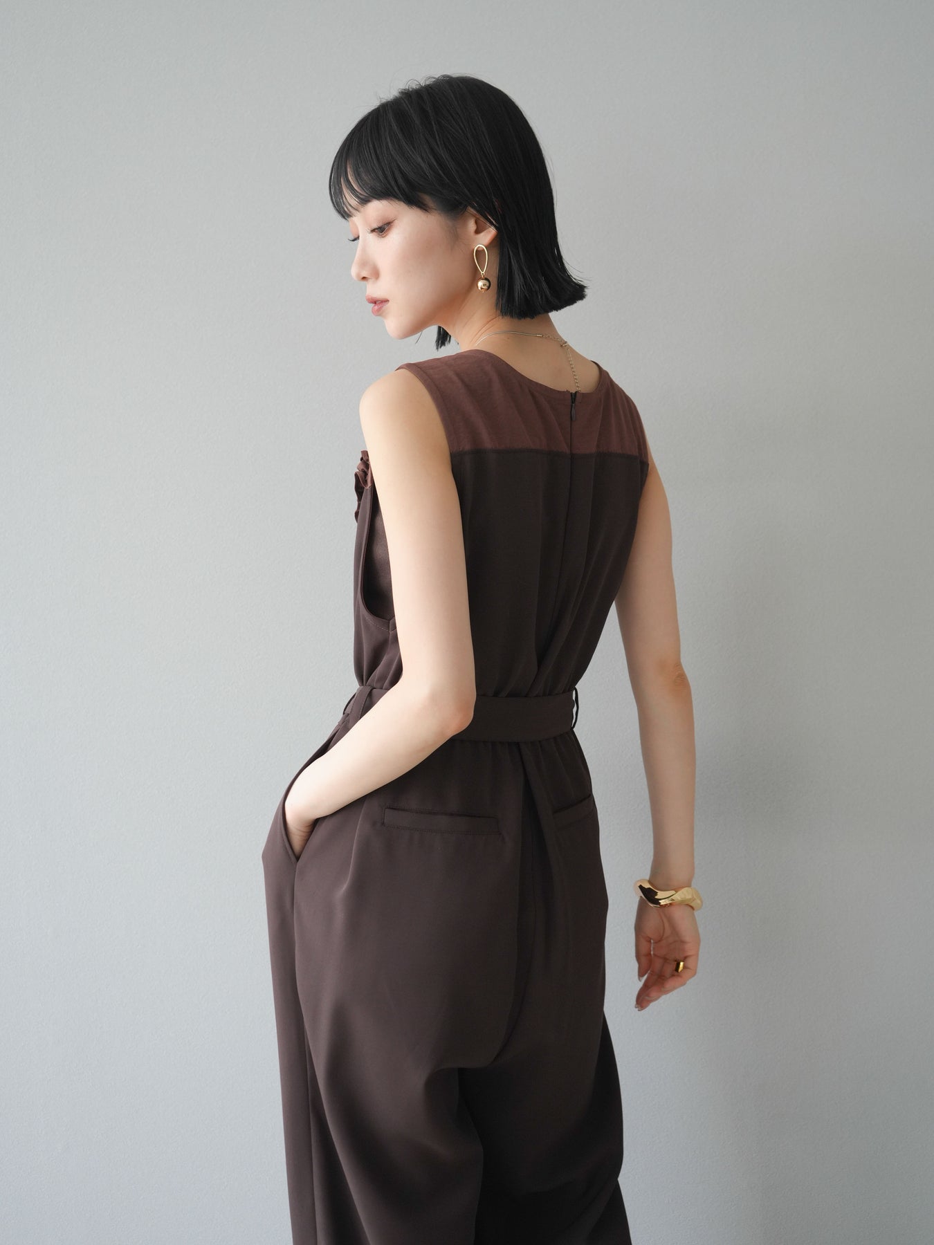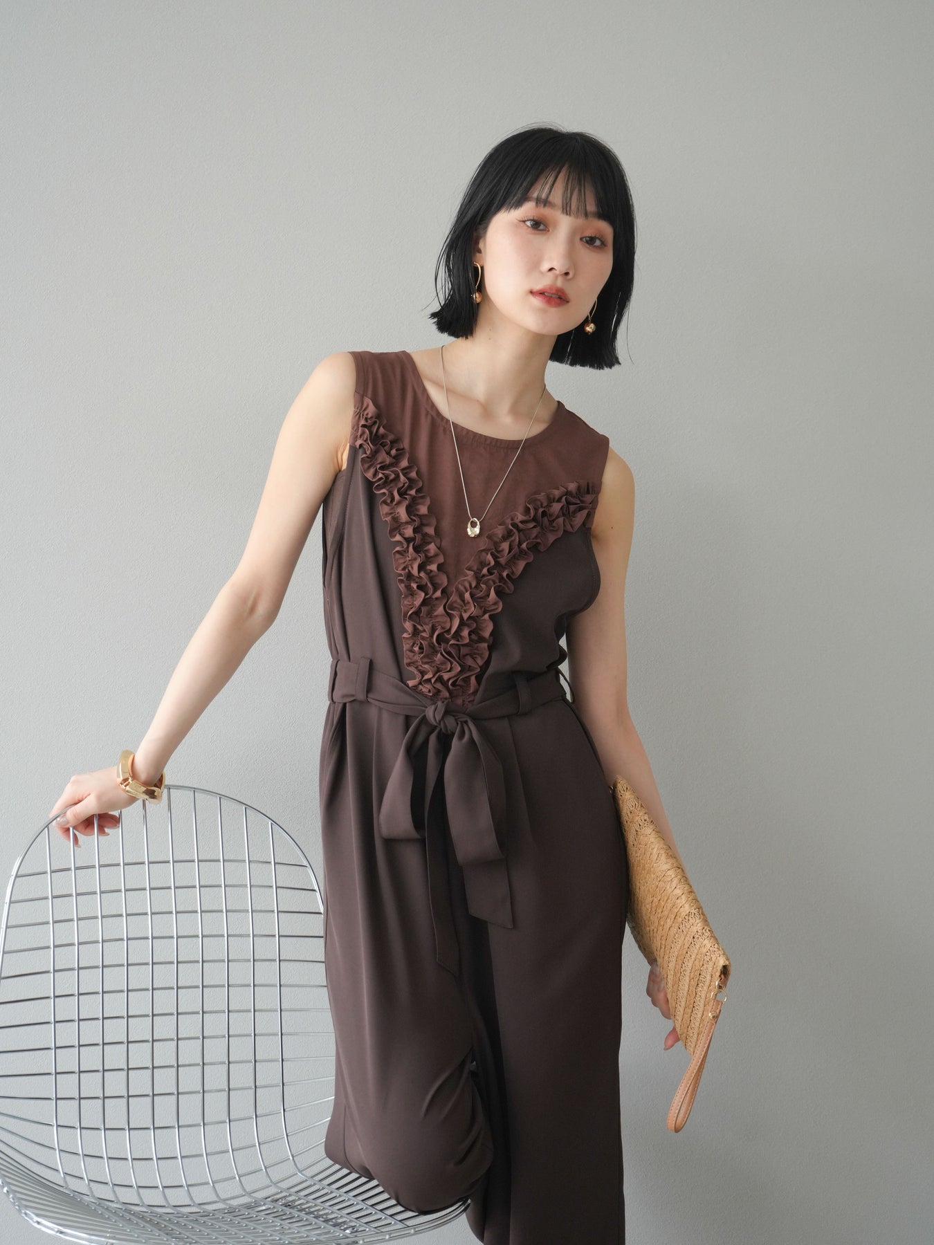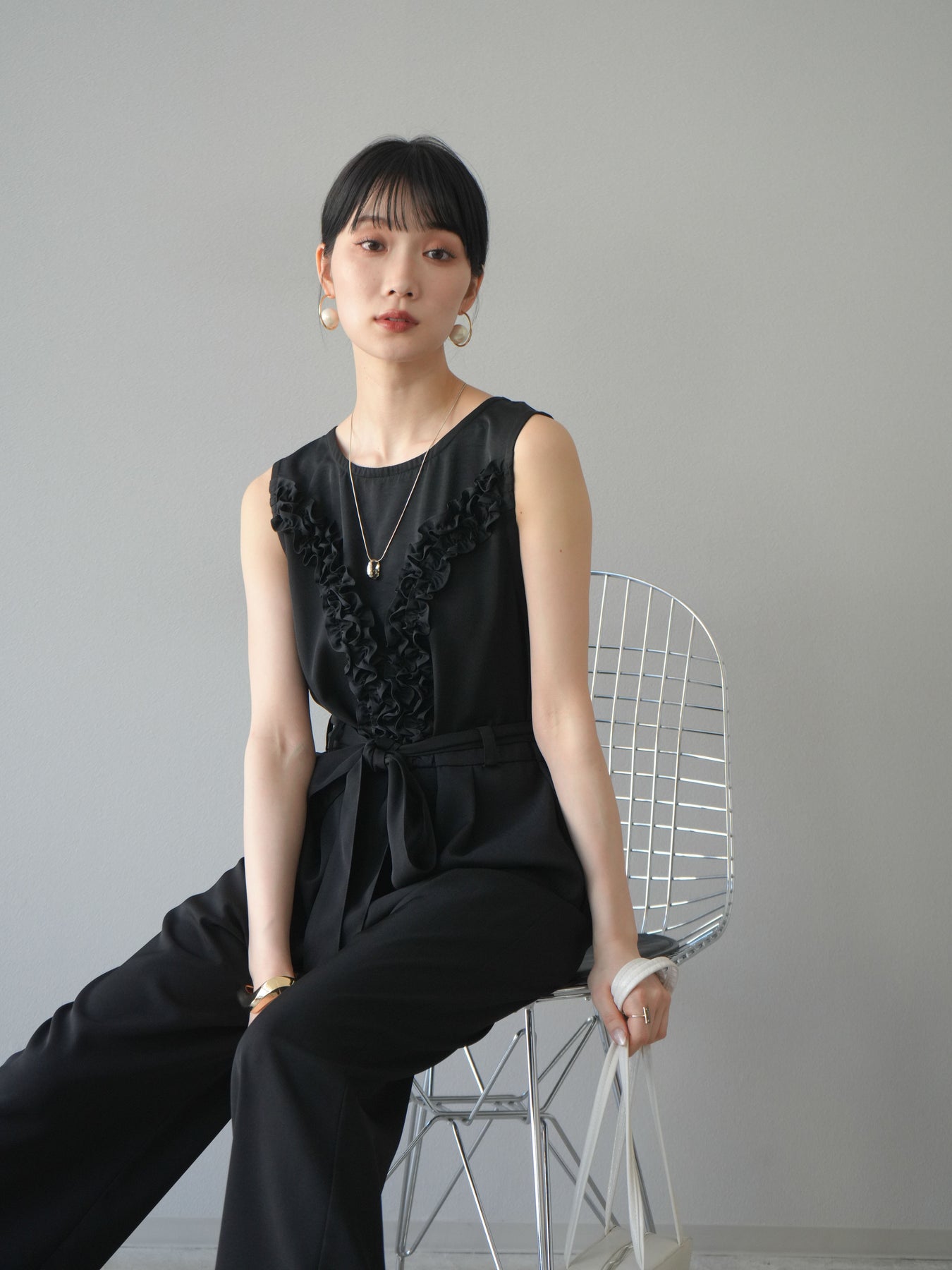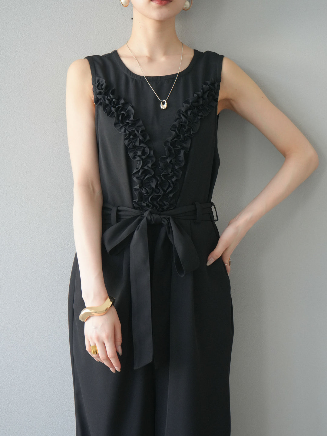 胸元に施した立体感のあるフリルが華やかなアクセントになるジャンプスーツ。ウエストのリボンベルトでメリハリのあるシルエットが叶い、スタイルアップ効果も期待できます。落ち感のある素材で、きれいめにもカジュアルにも着こなせる万能アイテム。トレンド感と女性らしさを両立した一着です。 ※ボトムス、キャミソール(インナー)以外の商品は一律でインナーは付属していません