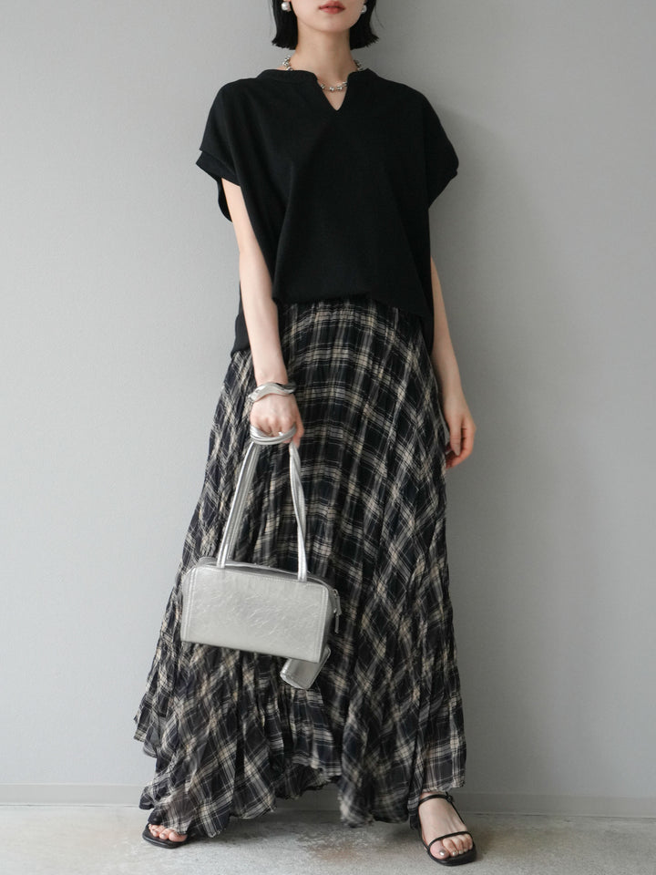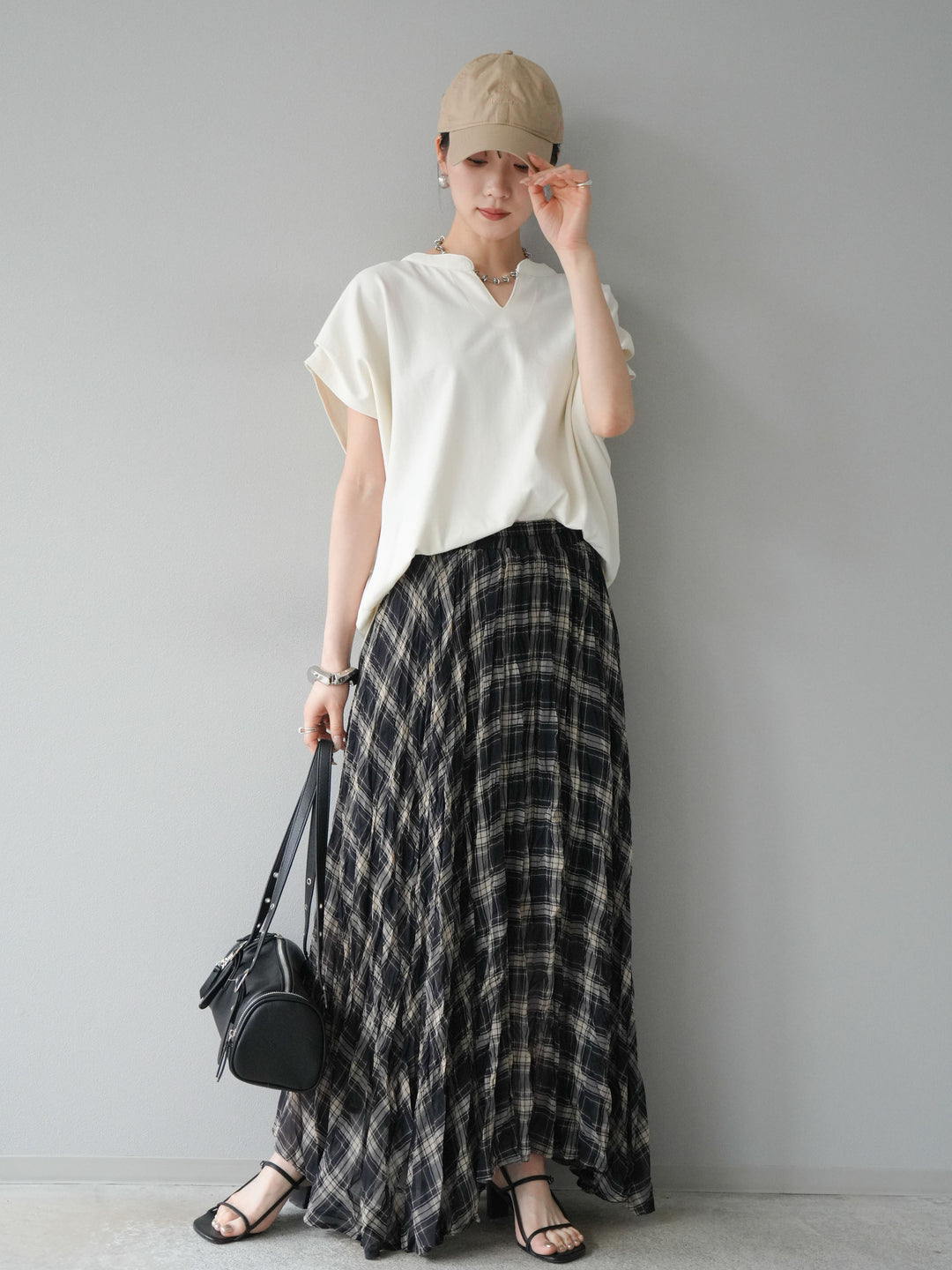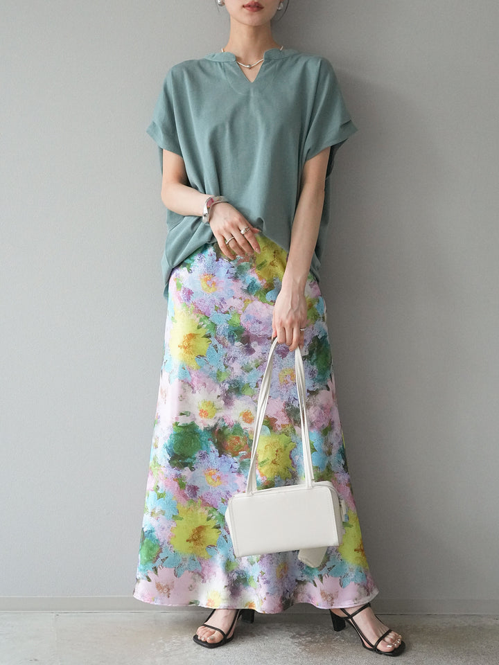 柔らかなコットン素材を使用し、リラックス感たっぷりのルーズシルエットが魅力のTシャツ。キーネックデザインがさりげない抜け感を演出し、顔周りをすっきり見せてくれます。ドルマンスリーブで動きやすく、こなれた大人カジュアルスタイルにぴったりな一枚です。デニムからスカートまで幅広いボトムと好相性。 ※ボトムス、キャミソール(インナー)以外の商品は一律でインナーは付属していません