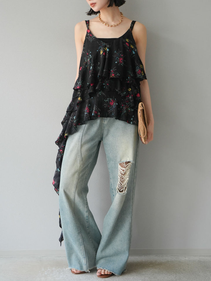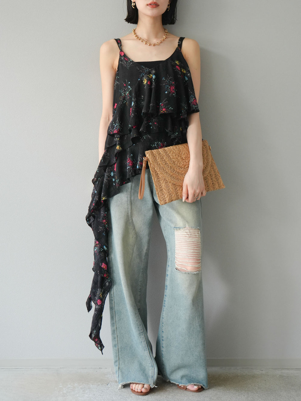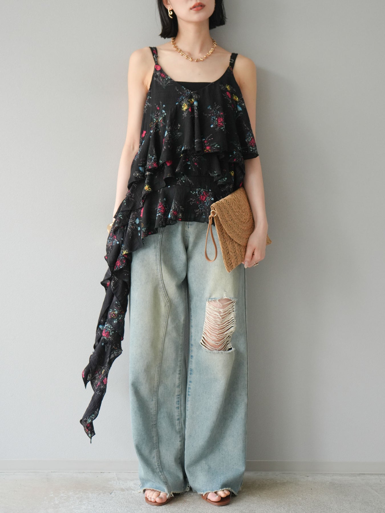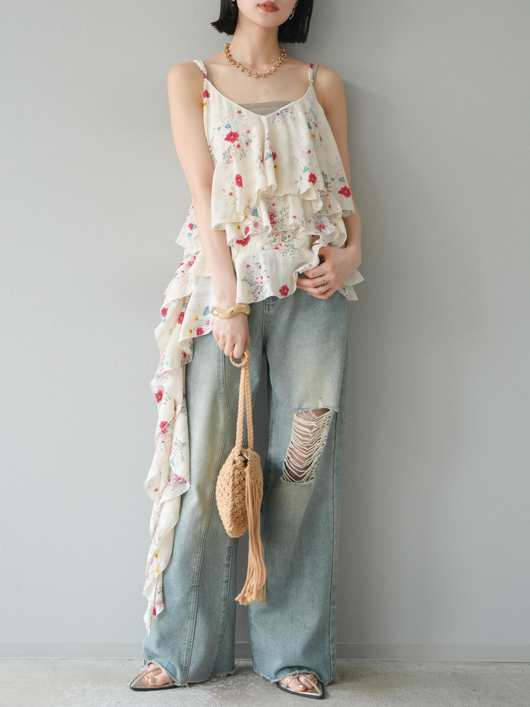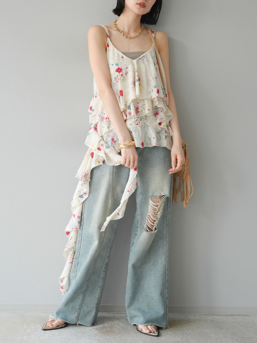 [SET]フラワープリントラッフルキャミソール+ベルトアシンメトリーダメージデニム(2set)