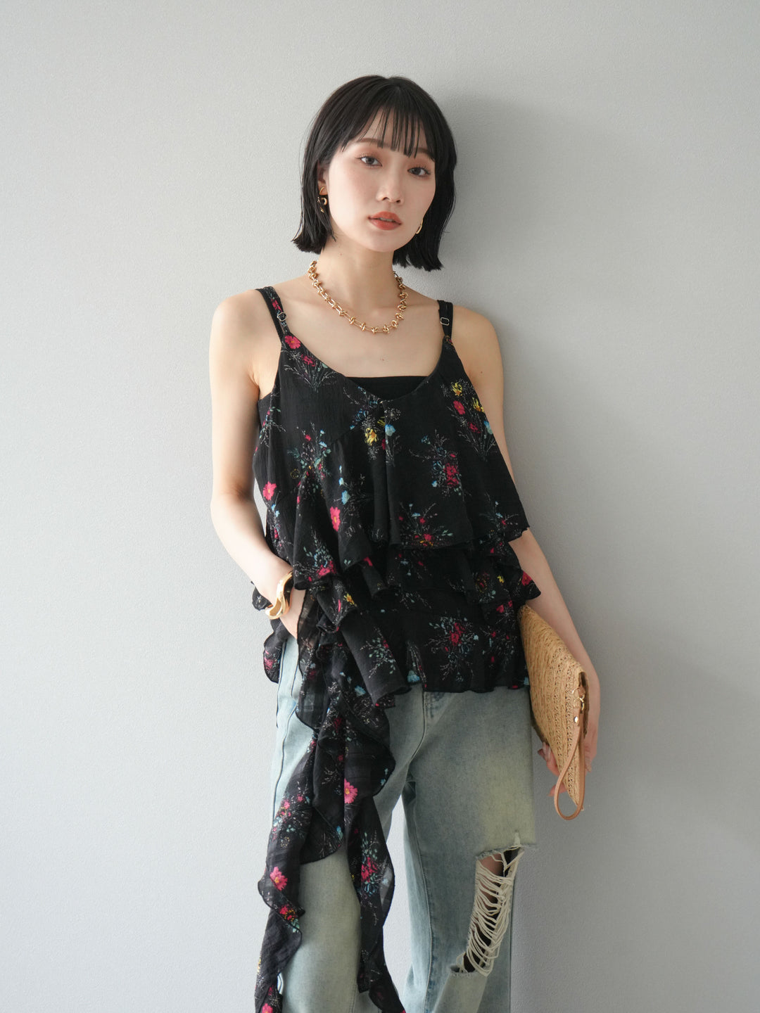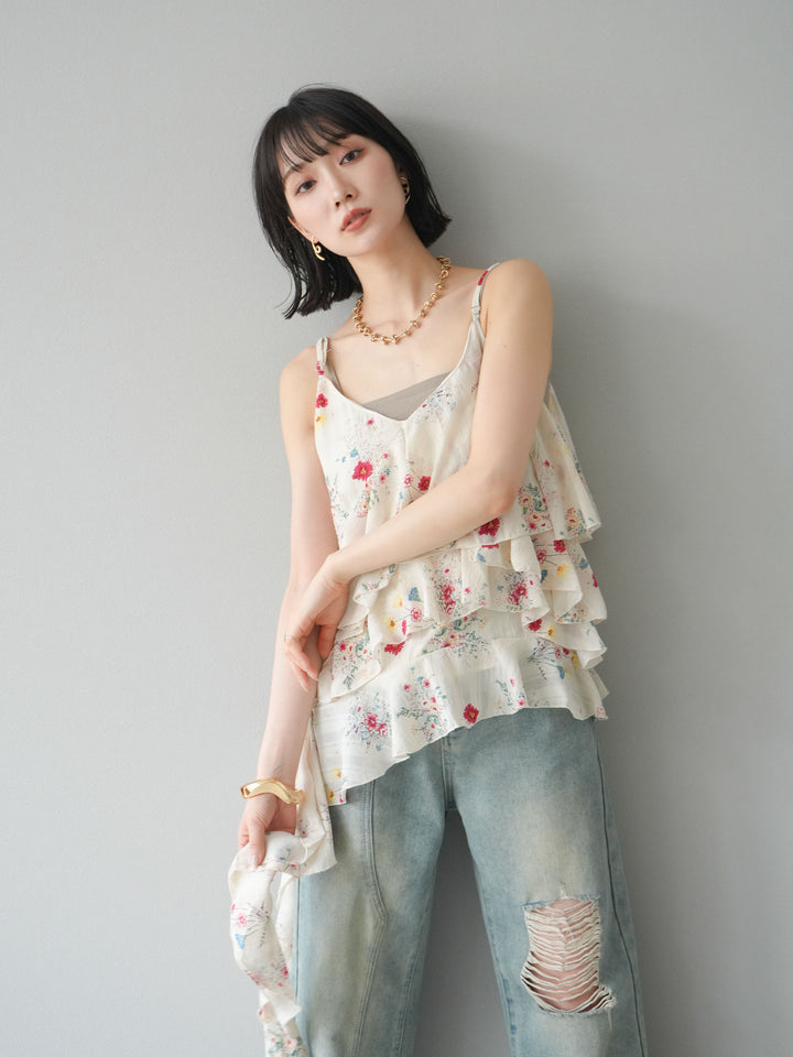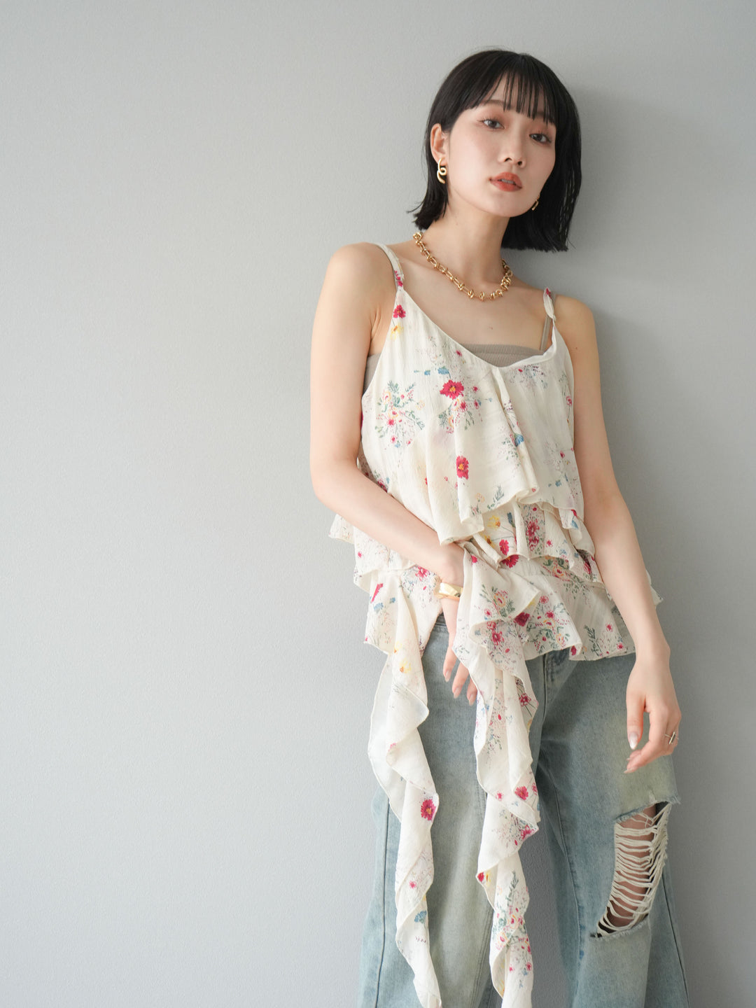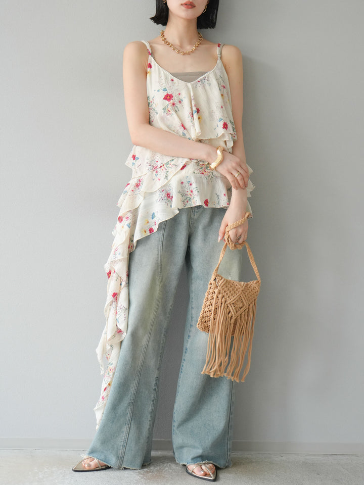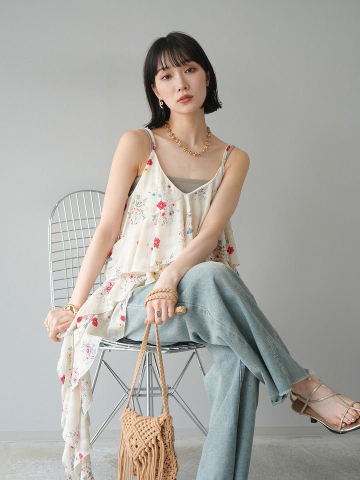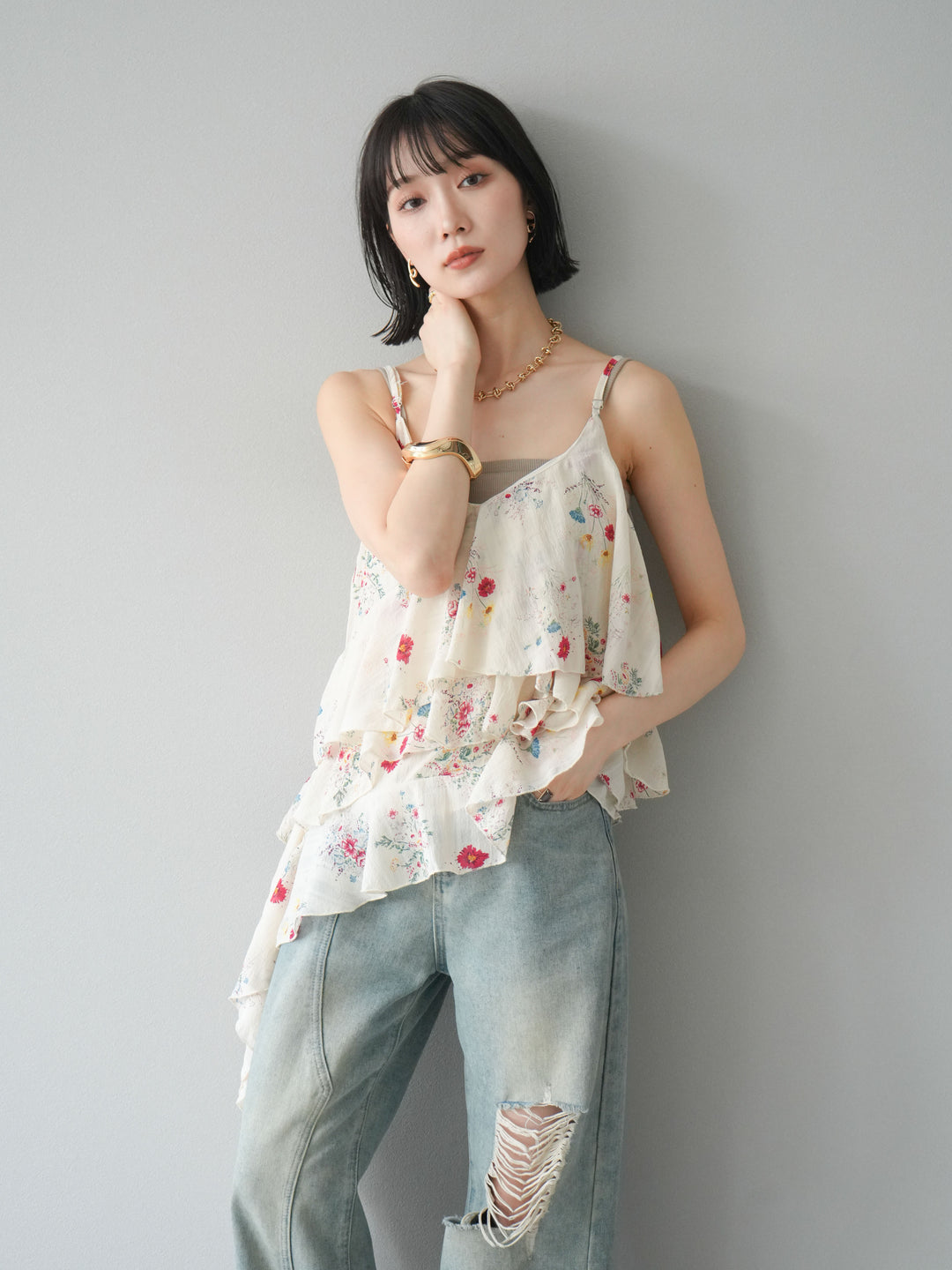 [SET]フラワープリントラッフルキャミソール+ベルトアシンメトリーダメージデニム(2set)