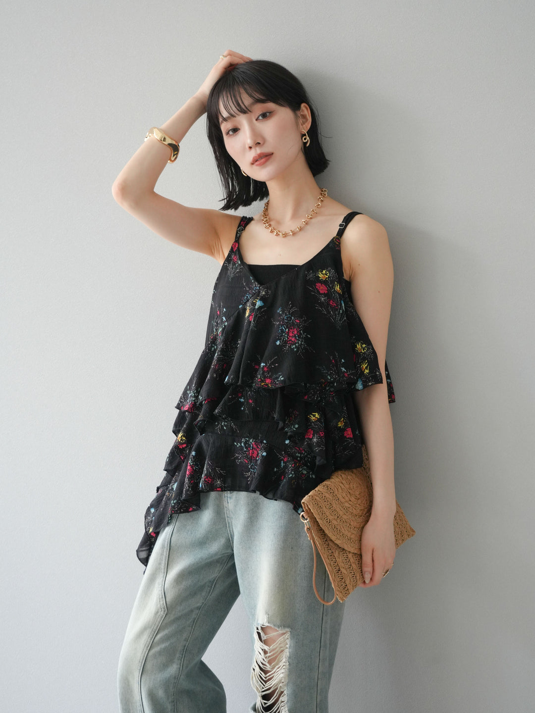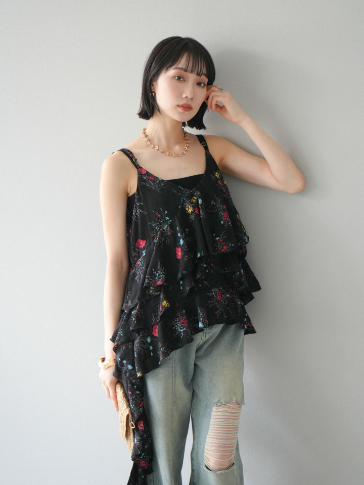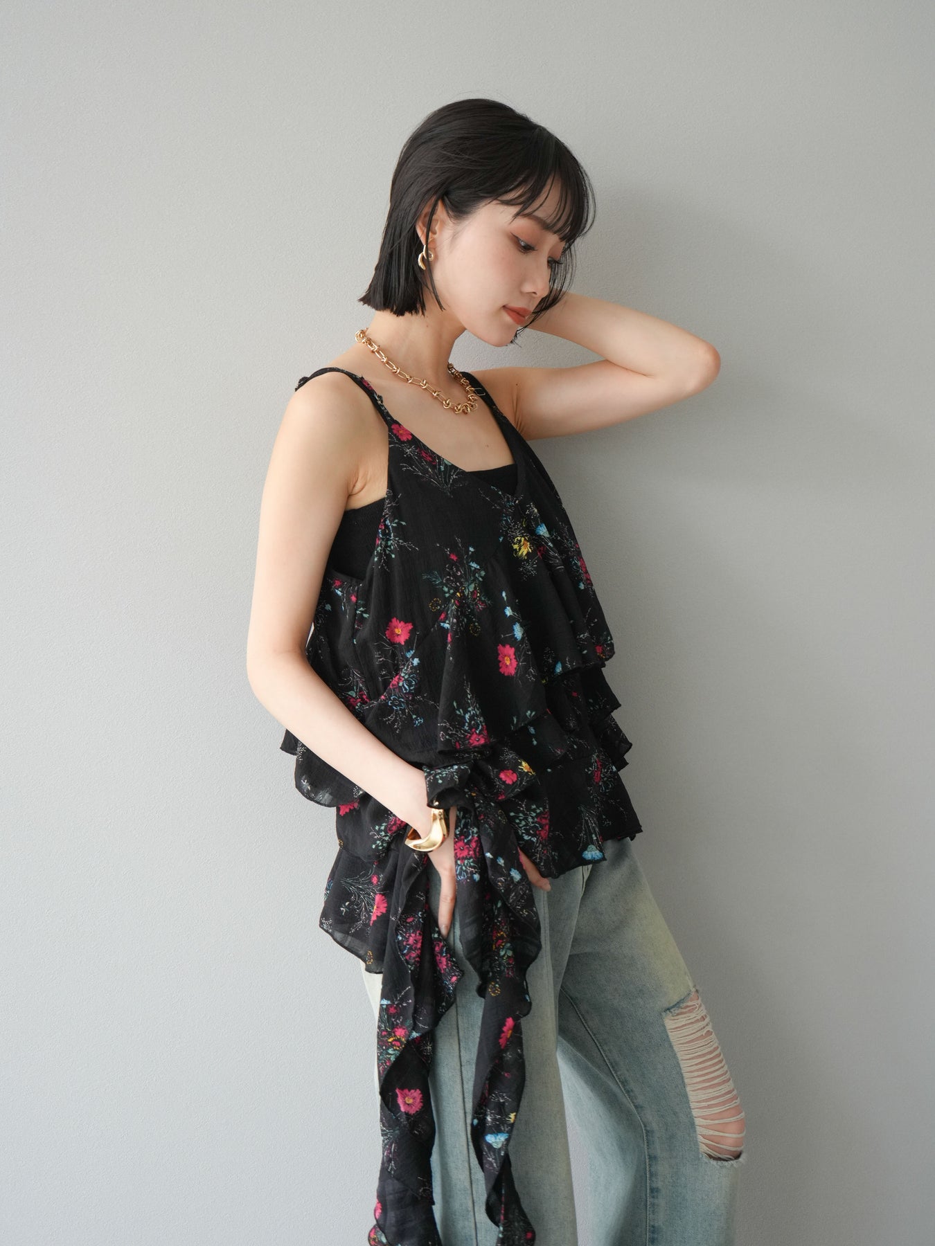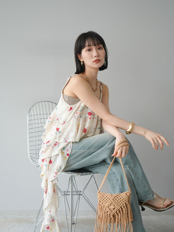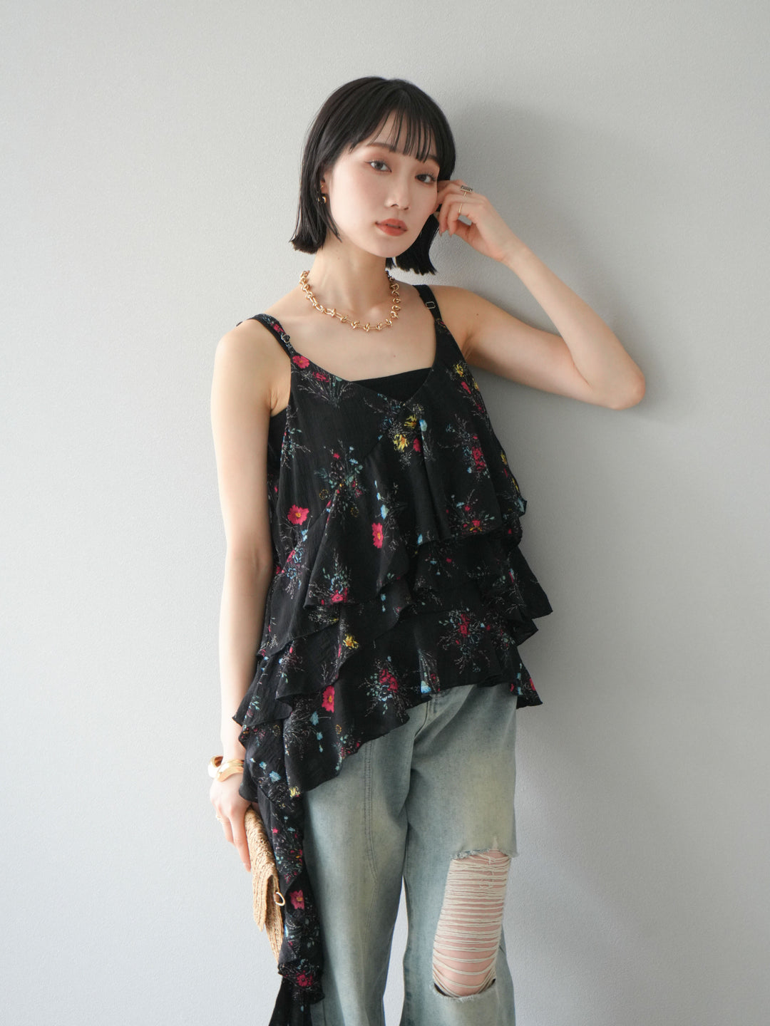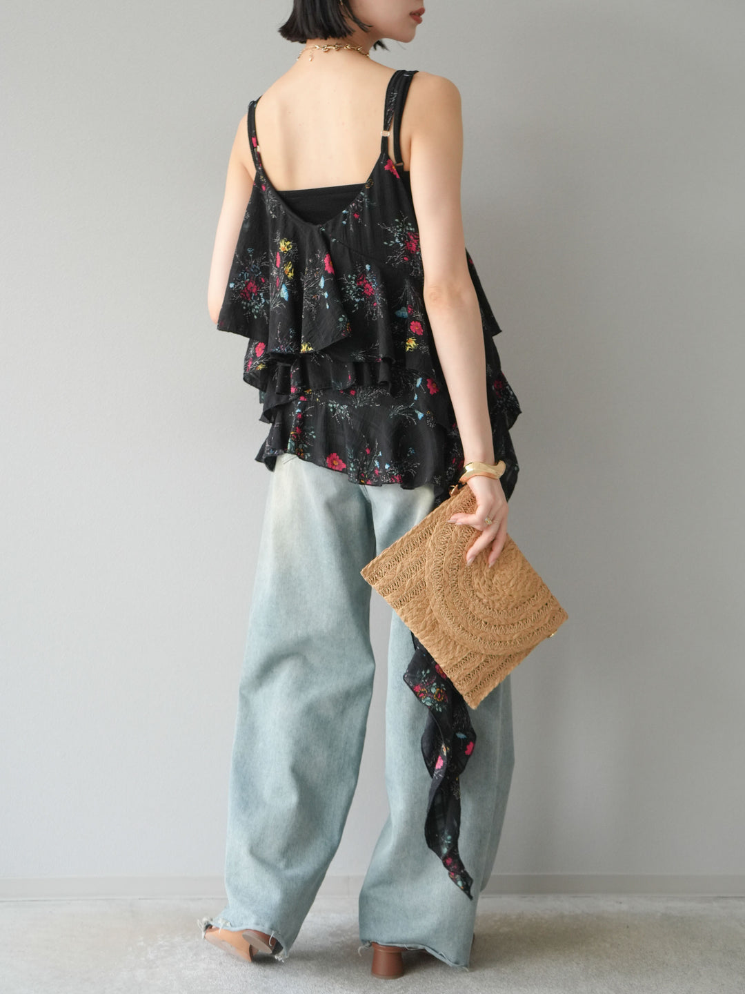 [SET]フラワープリントラッフルキャミソール+ベルトアシンメトリーダメージデニム(2set)
