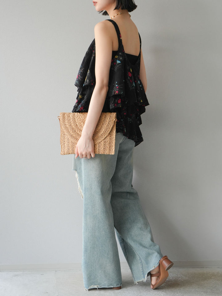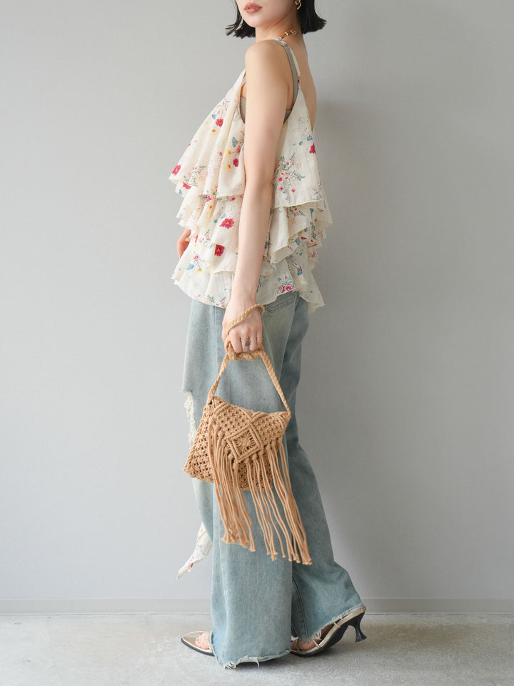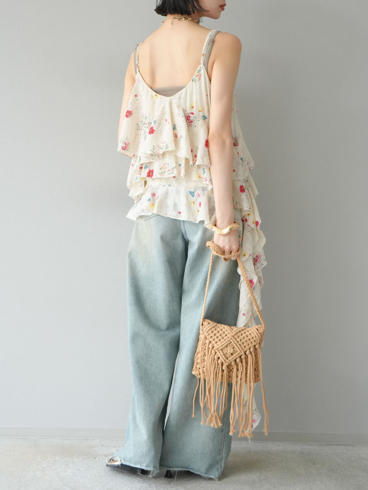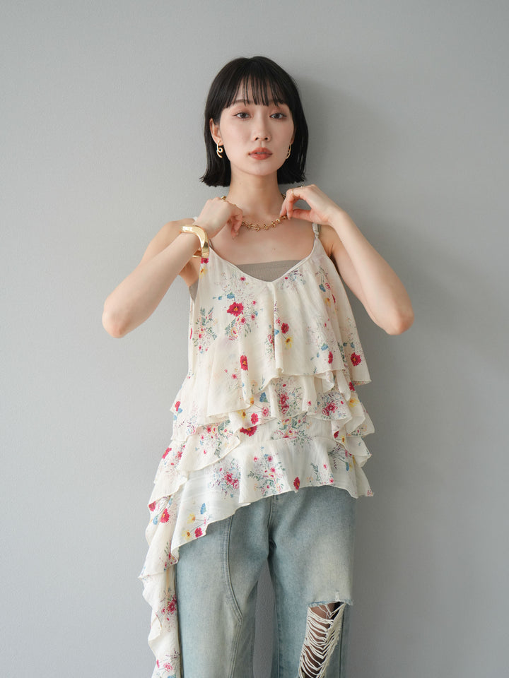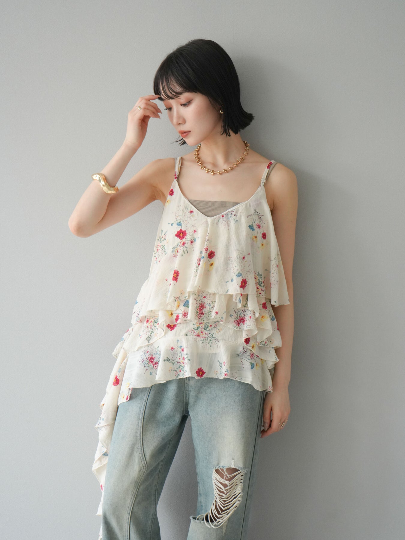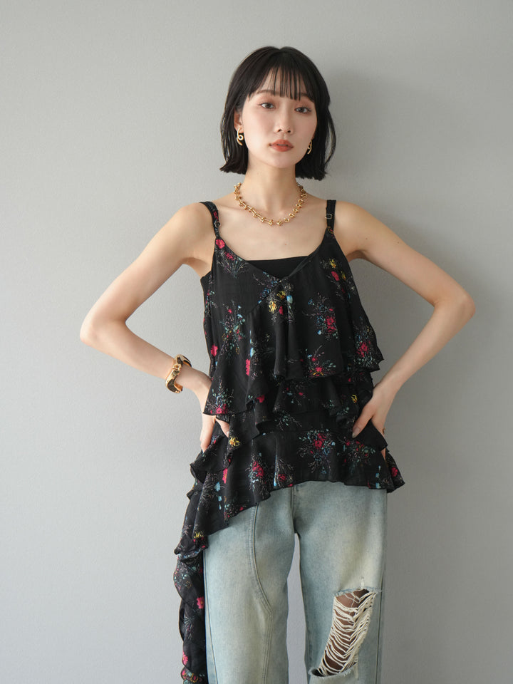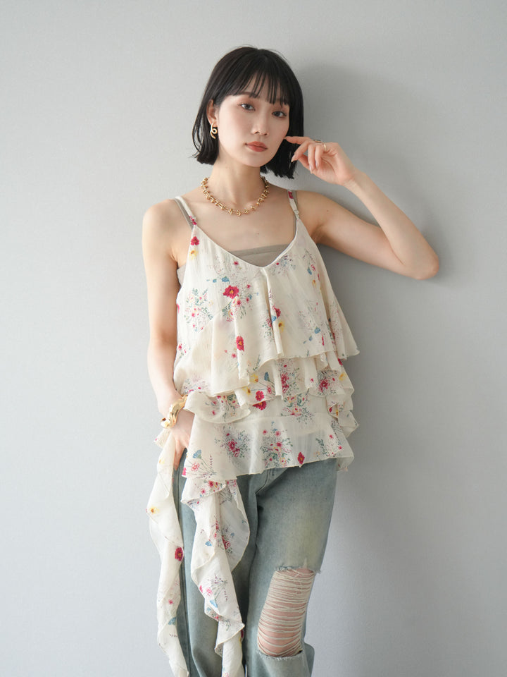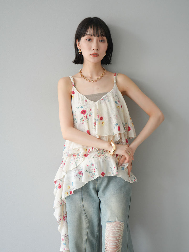 [SET]フラワープリントラッフルキャミソール+ベルトアシンメトリーダメージデニム(2set)