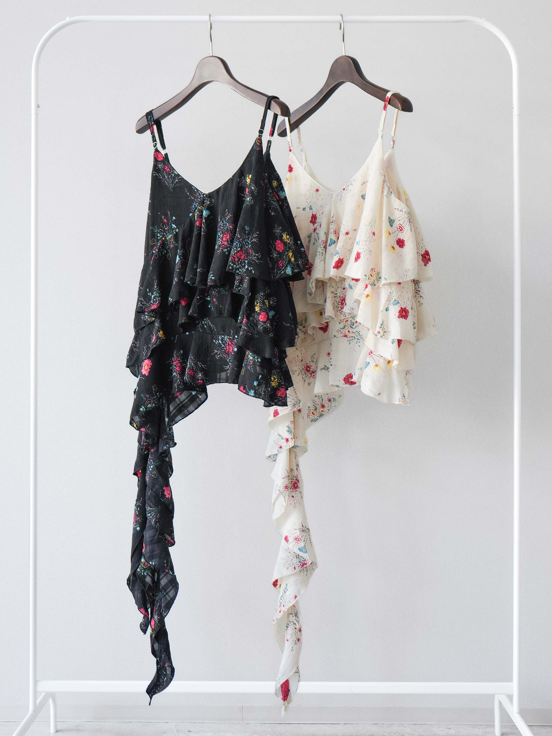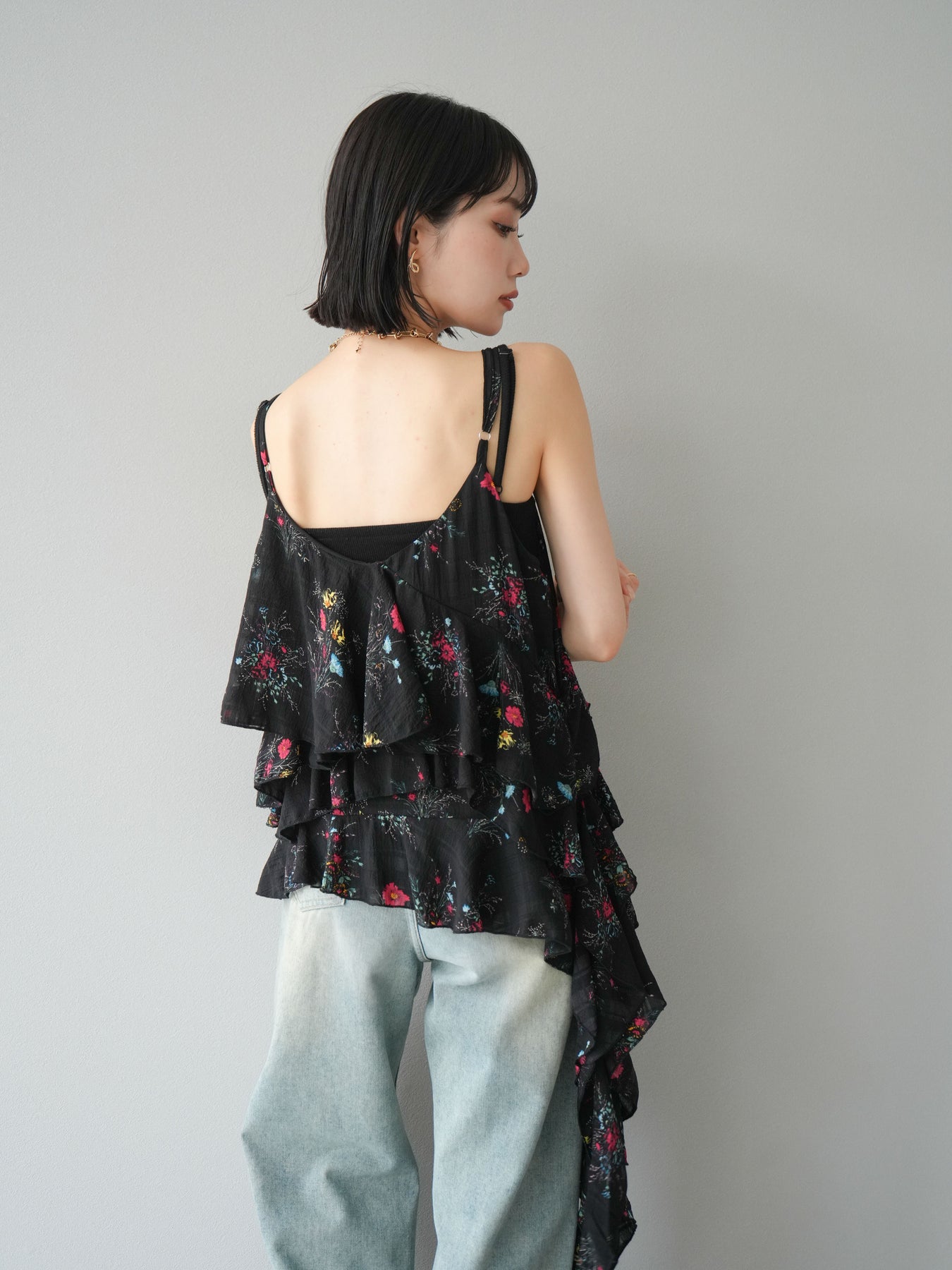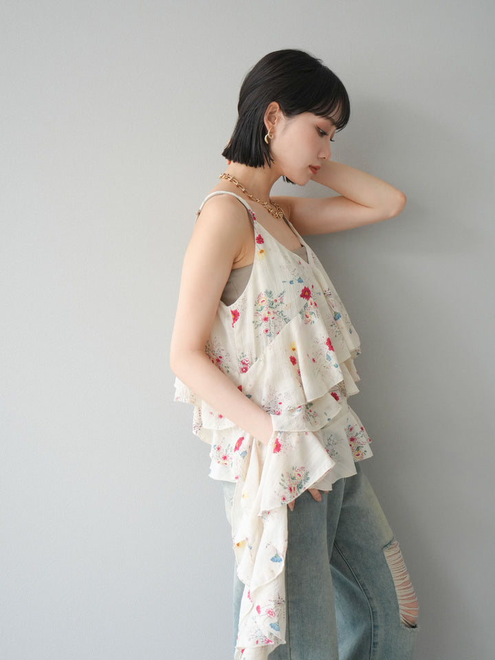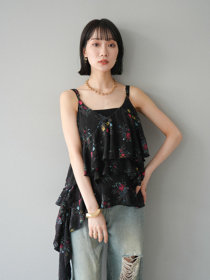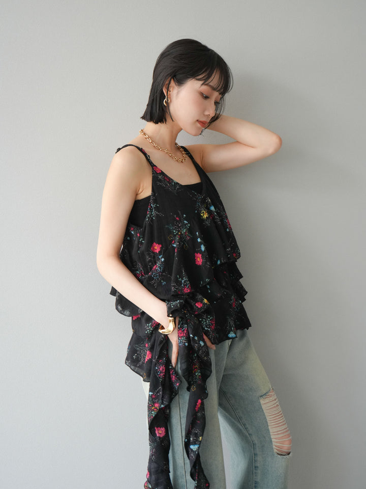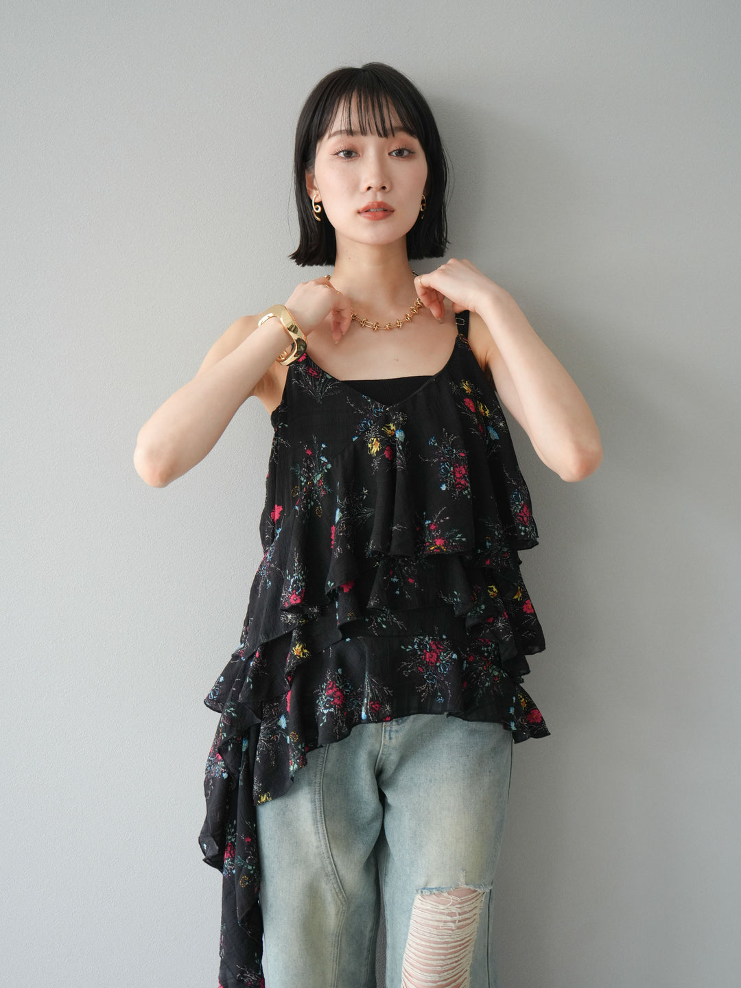 華やかなフラワープリントとたっぷりのラッフルが目を惹くキャミソール。アシンメトリーなヘムラインが動きのあるシルエットを演出し、1枚で主役級の存在感を放ちます。華奢なストラップと軽やかな素材感で、女性らしい抜け感をプラス。デニムやワイドパンツと合わせて、甘さを程よく引き算したスタイリングもおすすめです。 ※ボトムス、キャミソール(インナー)以外の商品は一律でインナーは付属していません
