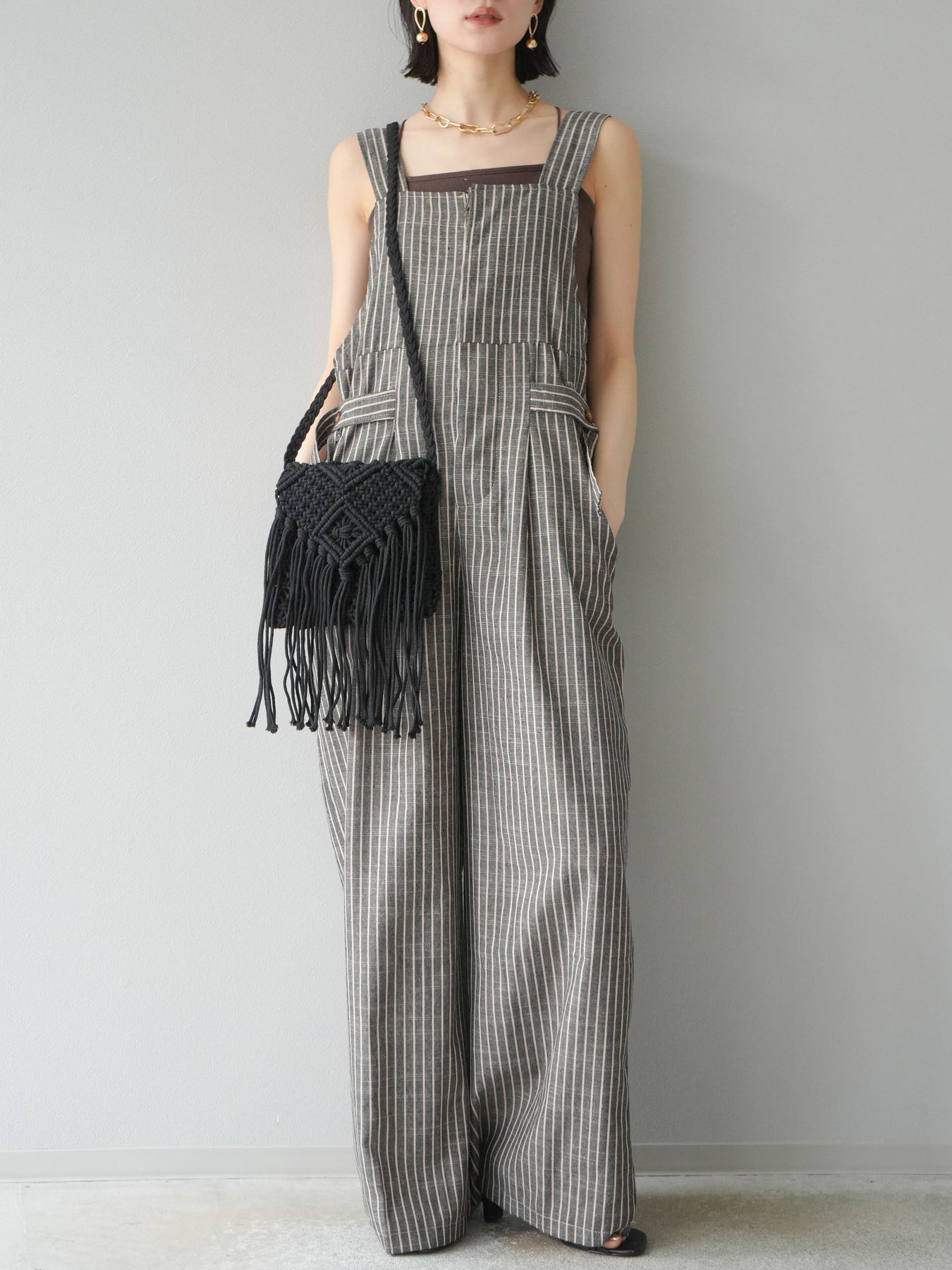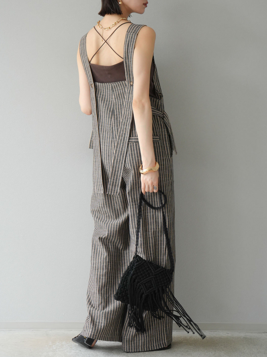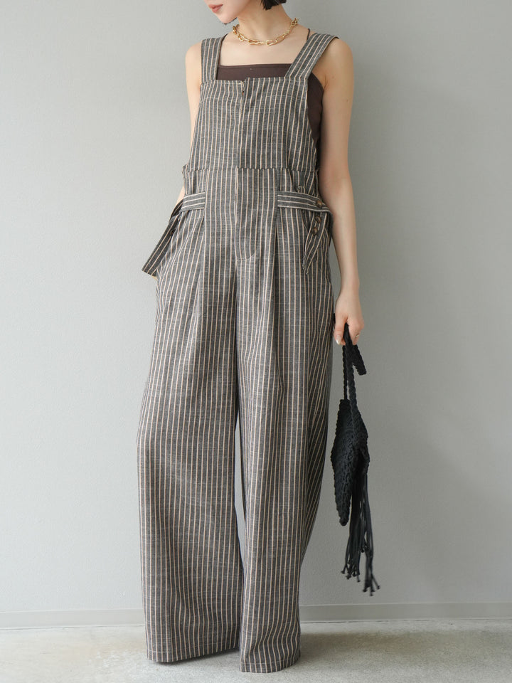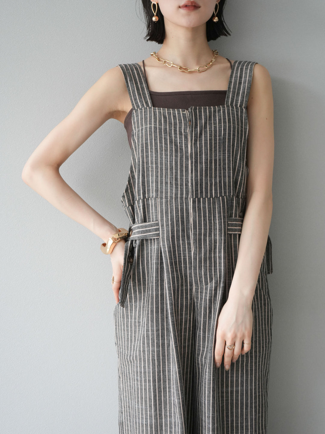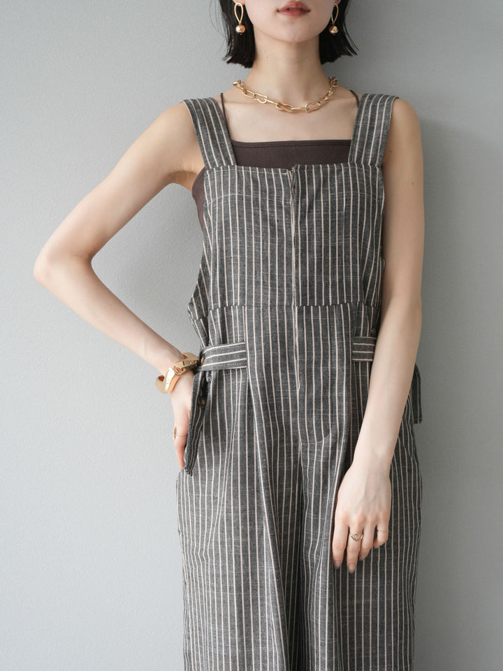 ベルト付きのデザインが特徴的なサロペット。シンプルながらもディテールにこだわり、ウエストのベルトがアクセントとなり、スタイルを引き立てます。ストレートなシルエットと軽やかな素材感で、カジュアルながらも洗練された印象を与える一枚です。ブラック、グレー、ストライプのバリエーションで、様々なスタイルに合わせやすいアイテムです。 ※ボトムス、キャミソール(インナー)以外の商品は一律でインナーは付属していません