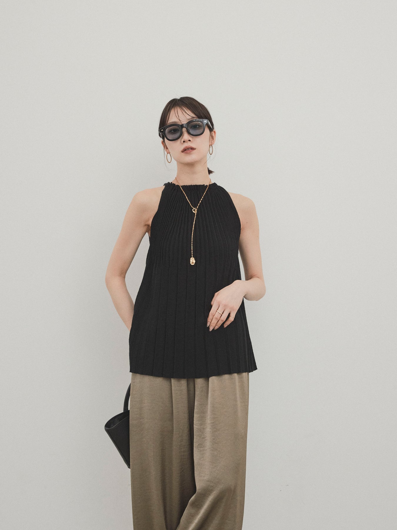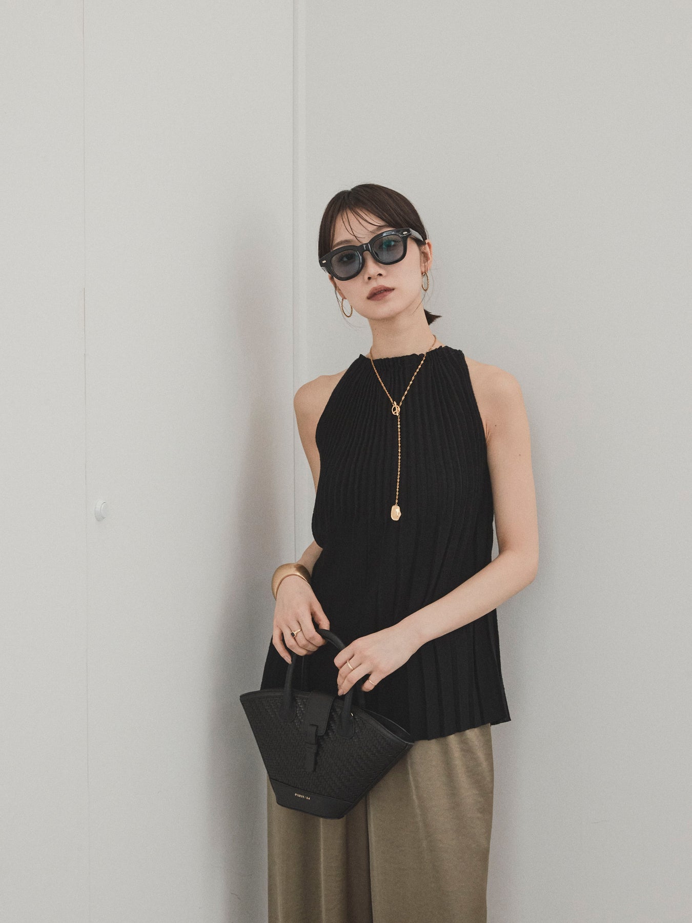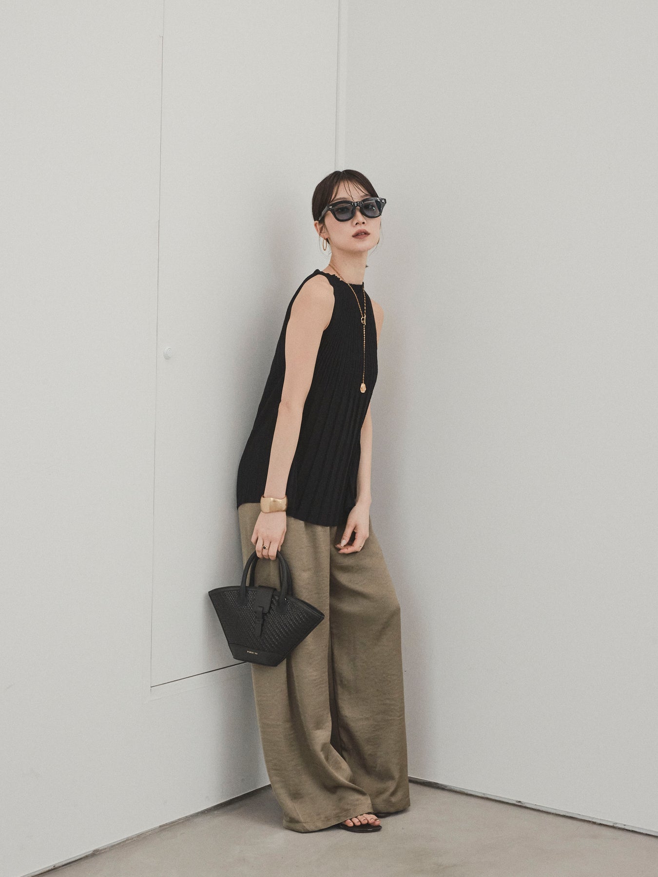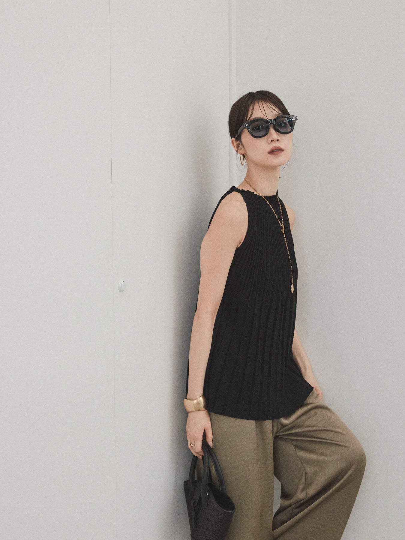 縦ラインが美しいプリーツ編みで仕立てた、大人の洗練を感じさせるニットキャミソール。 身体のラインを拾いすぎない絶妙なシルエットで、スタイルアップも叶える一枚です。 ややハイネック寄りのデザインと肩の露出を抑えた絶妙なアームホールのカットが、ヘルシーながらも上品な印象に。 さらりとした肌あたりのニット素材で、暑い季節でも快適に着用できます。 一枚での着用はもちろん、ジャケットやシャツのインナーとしても活躍する万能トップス。 カジュアルからきれいめまで、幅広いコーディネートに対応できるアイテムです。