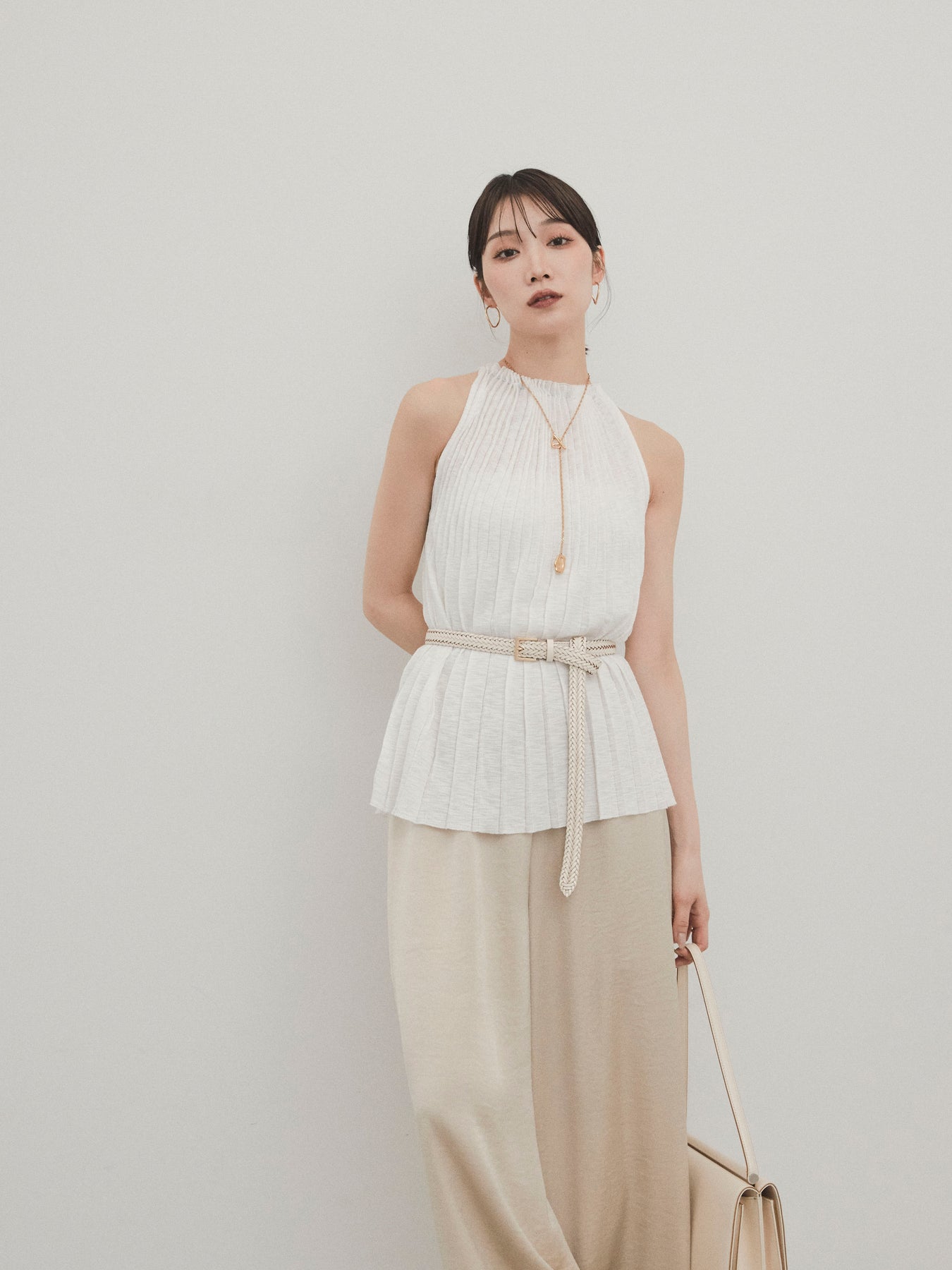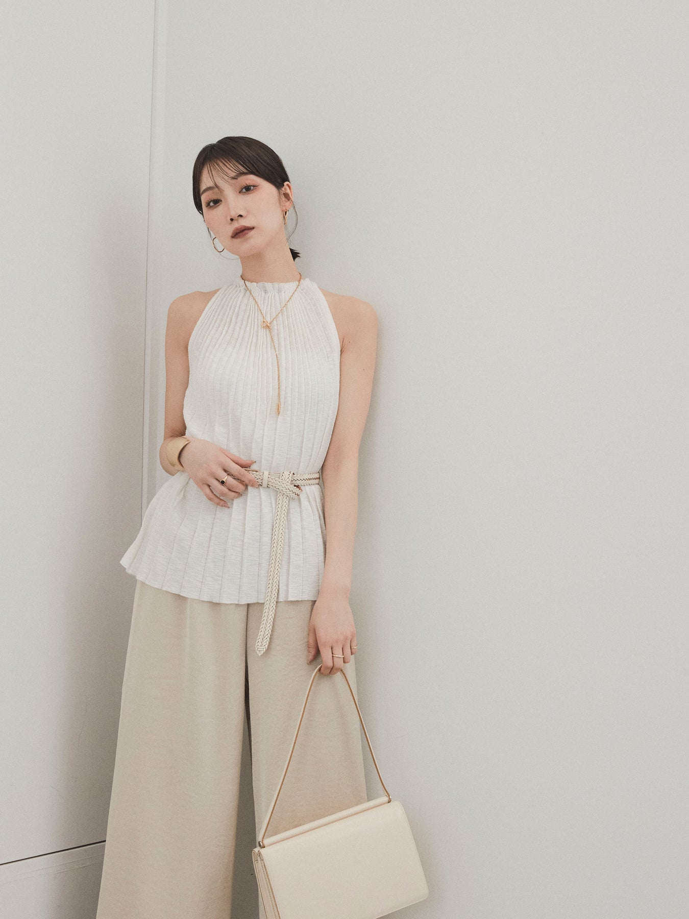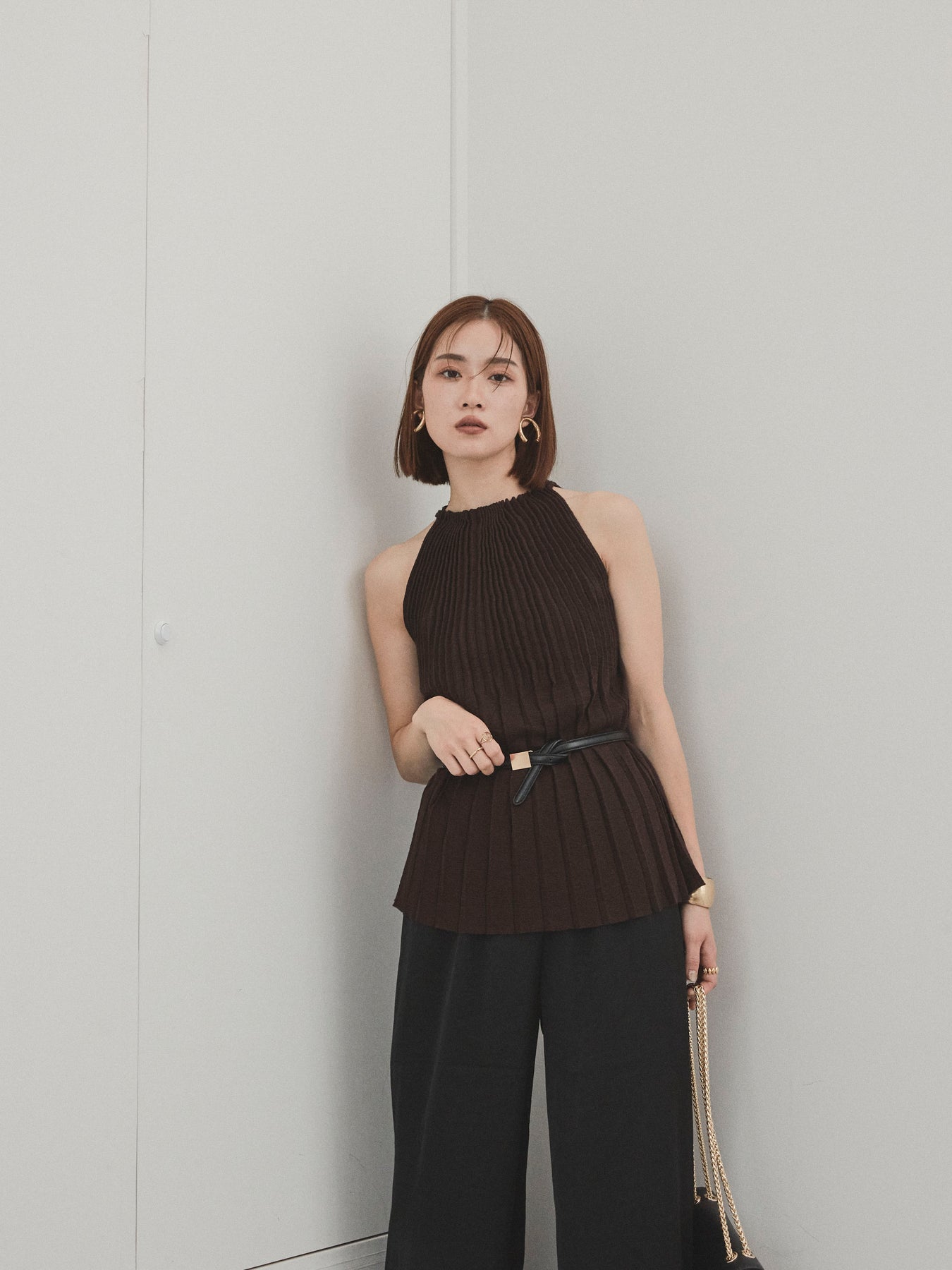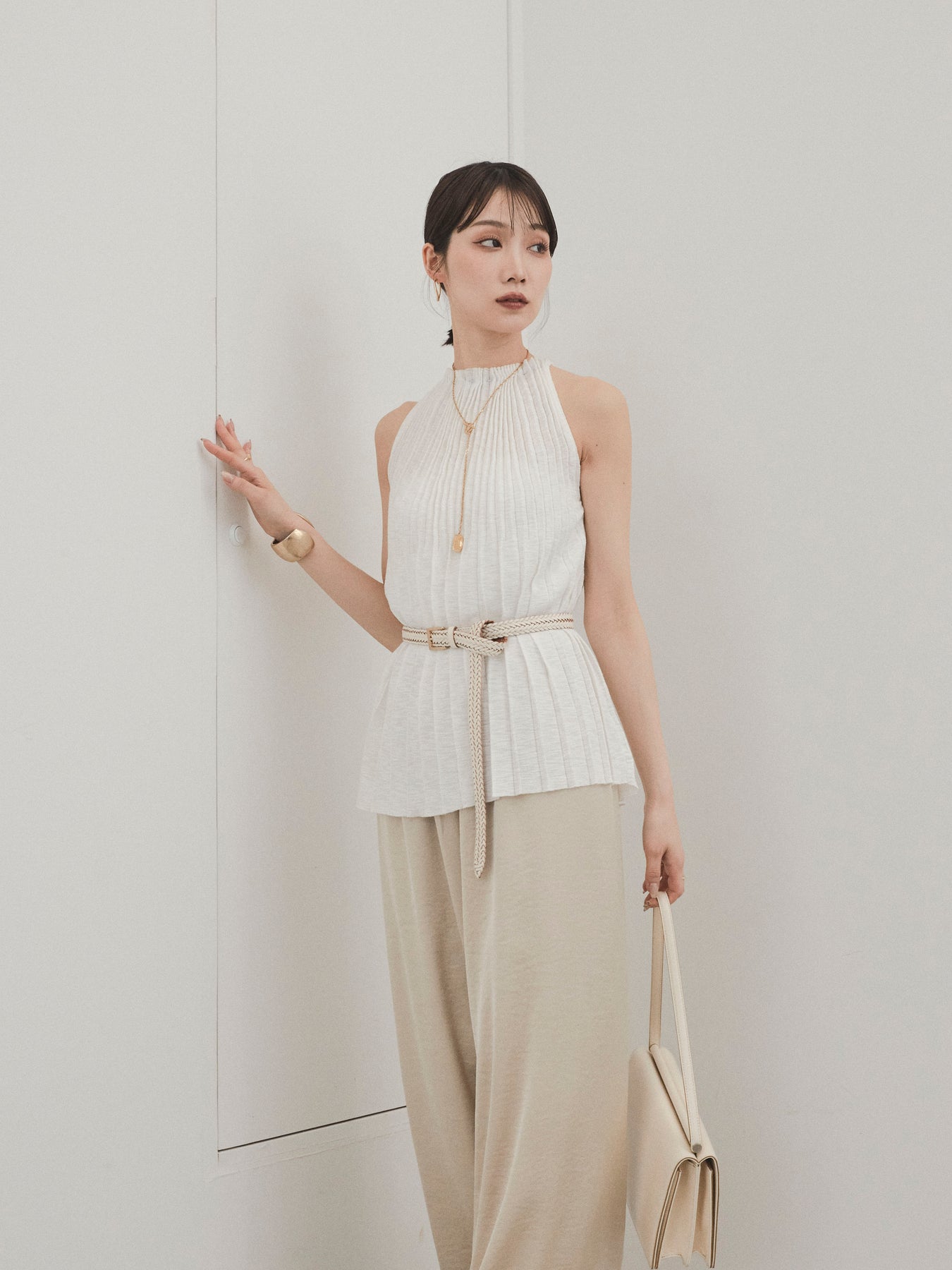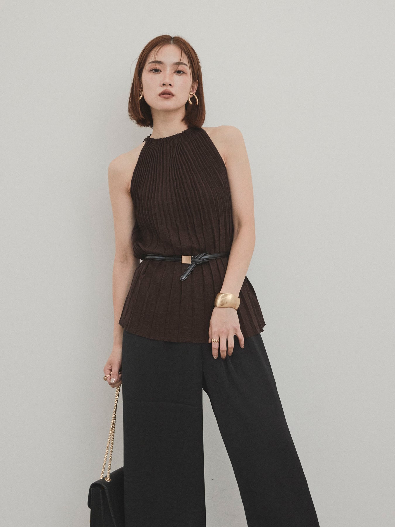 縦ラインが美しいプリーツ編みで仕立てた、大人の洗練を感じさせるニットキャミソール。 身体のラインを拾いすぎない絶妙なシルエットで、スタイルアップも叶える一枚です。 ややハイネック寄りのデザインと肩の露出を抑えた絶妙なアームホールのカットが、ヘルシーながらも上品な印象に。 さらりとした肌あたりのニット素材で、暑い季節でも快適に着用できます。 一枚での着用はもちろん、ジャケットやシャツのインナーとしても活躍する万能トップス。 カジュアルからきれいめまで、幅広いコーディネートに対応できるアイテムです。