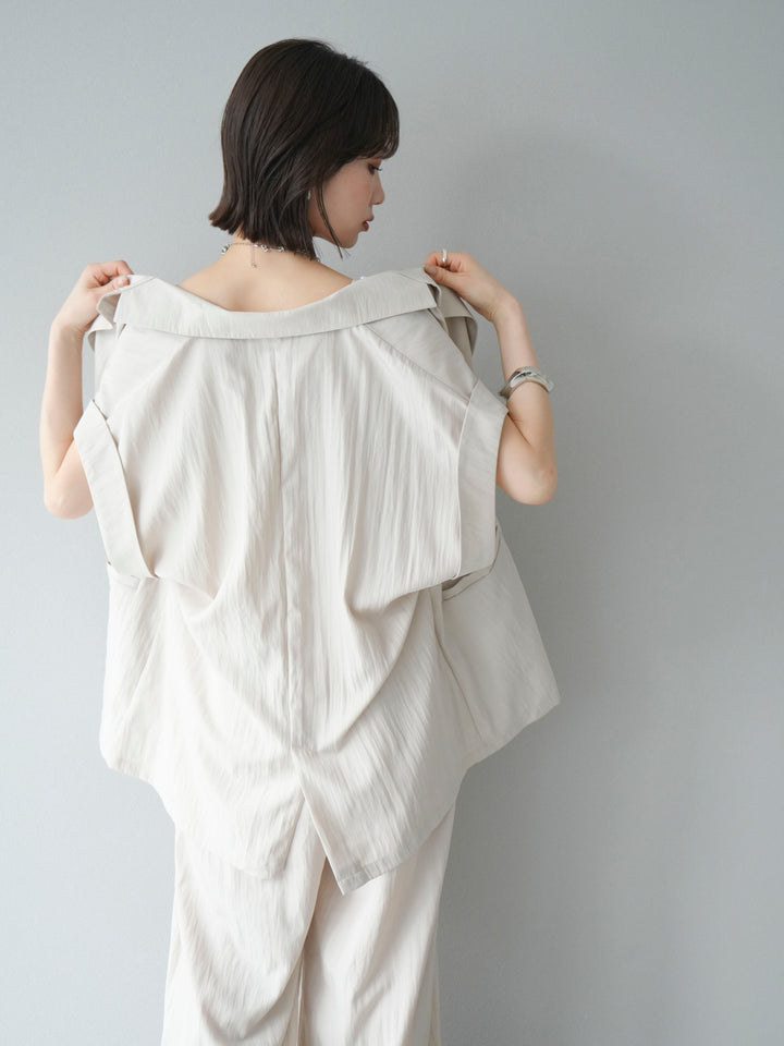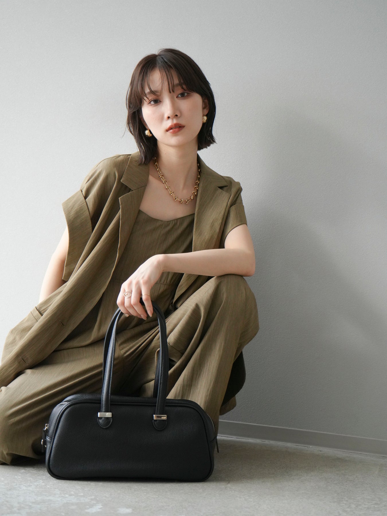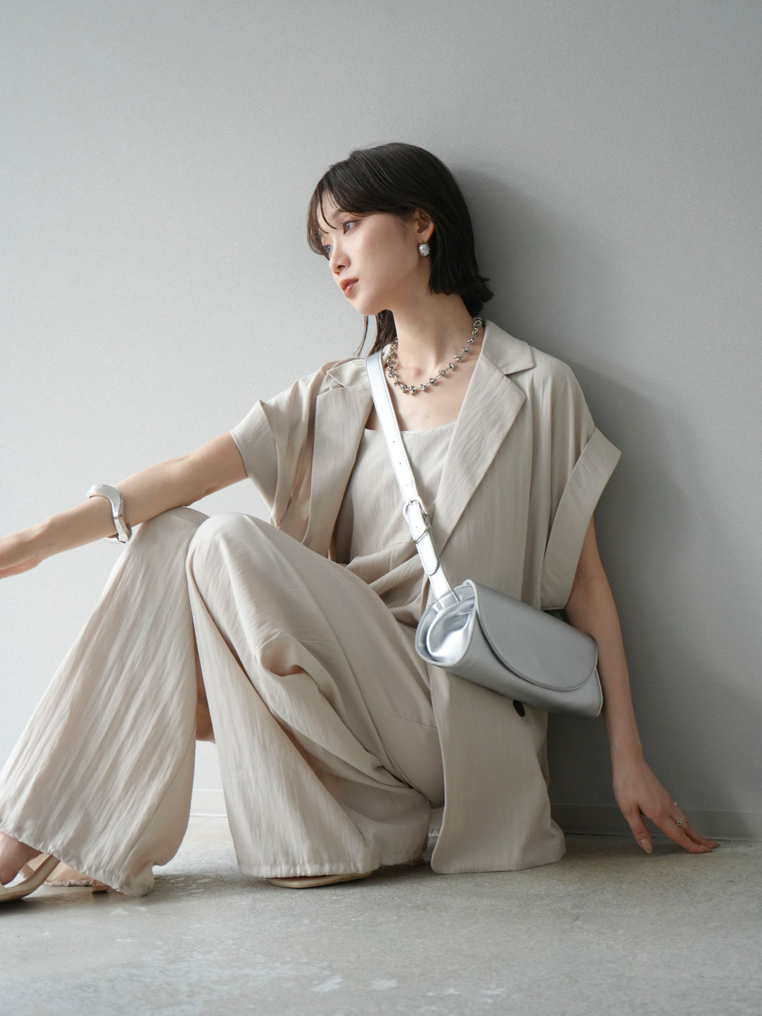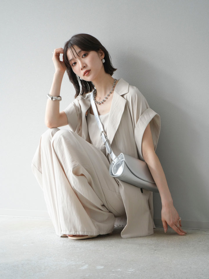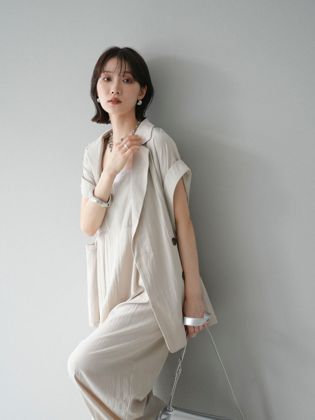 ナチュラルな風合いが魅力のリネンライク素材を使用した、ダブルボタン仕様のノースリーブジレ。肩に程よくかかるフレンチスリーブと、計算されたゆとりのあるシルエットが、抜け感とこなれた印象を演出します。 ヒップが隠れるロング丈で、体型カバーと縦ラインのスタイルアップ効果も抜群。Tシャツやノースリーブトップスの上にさっと羽織るだけで、洗練されたレイヤードスタイルが完成します。セットアップ風の着こなしもおすすめです。 ※ボトムス、キャミソール(インナー)以外の商品は一律でインナーは付属していません。