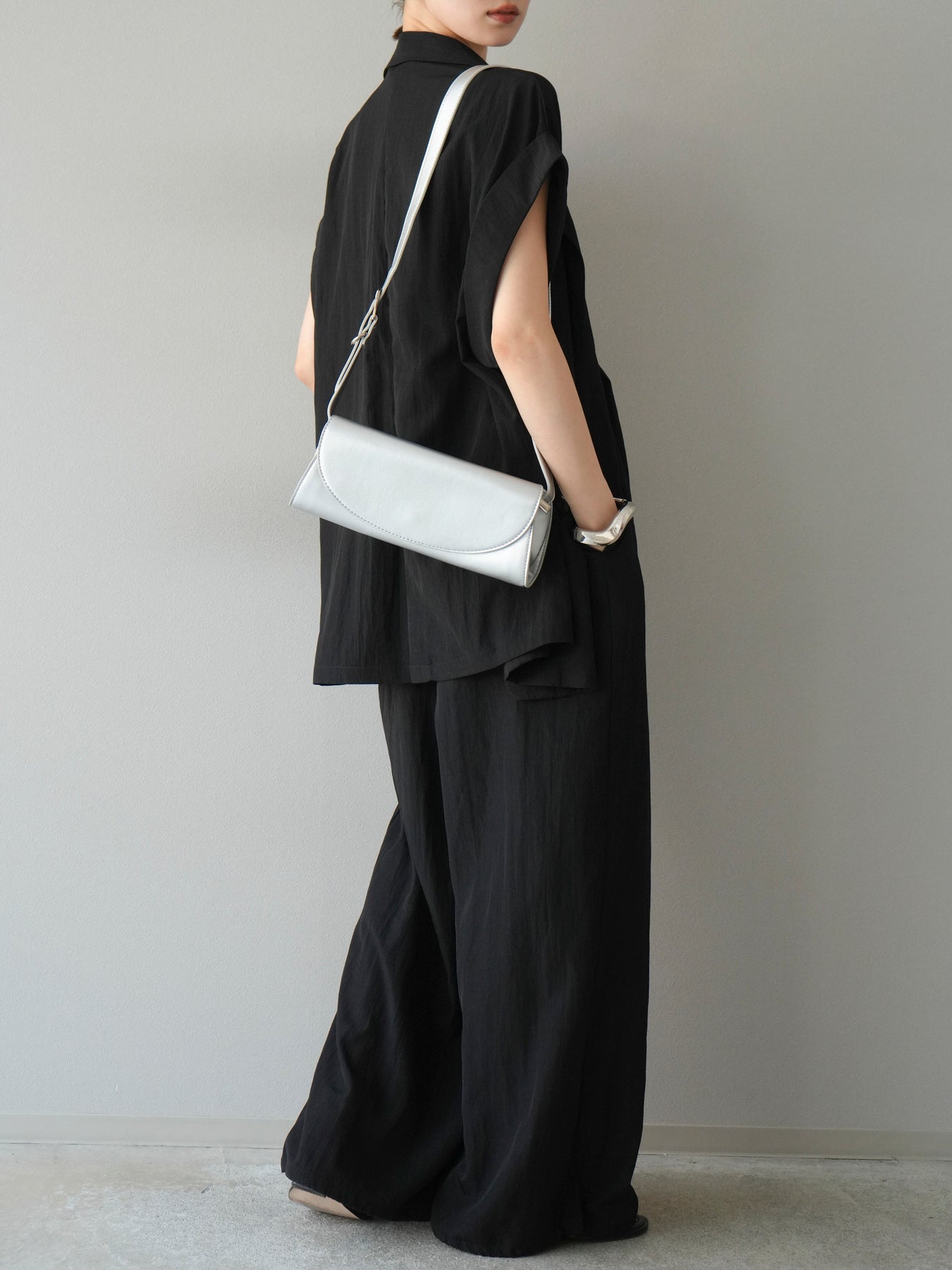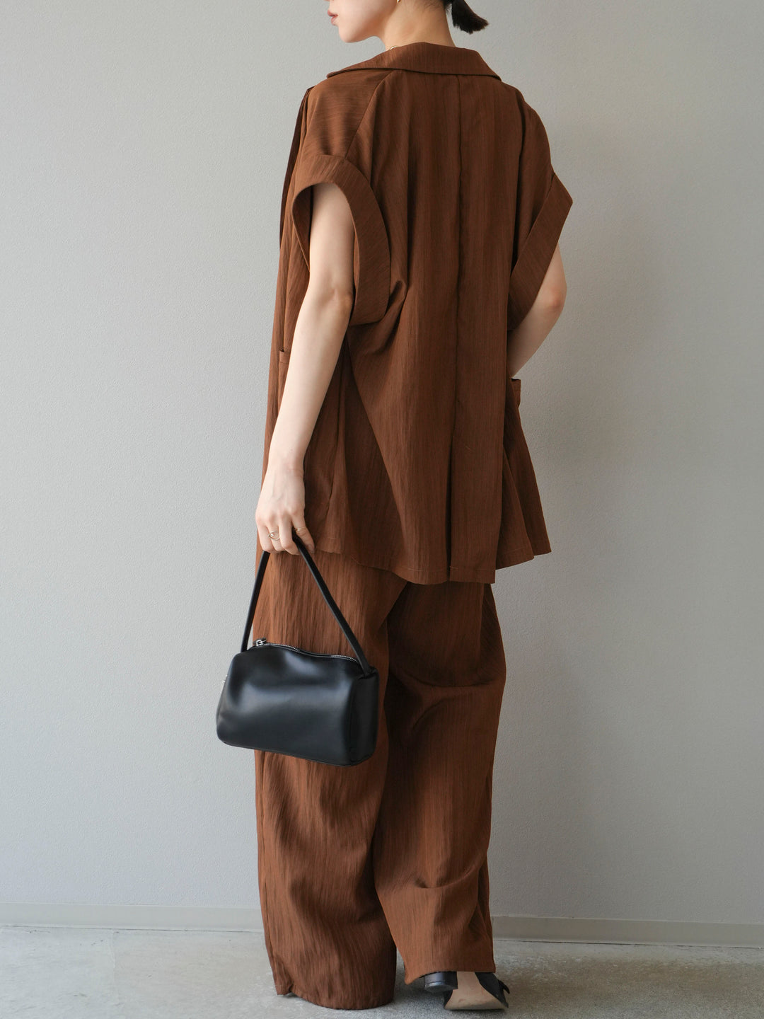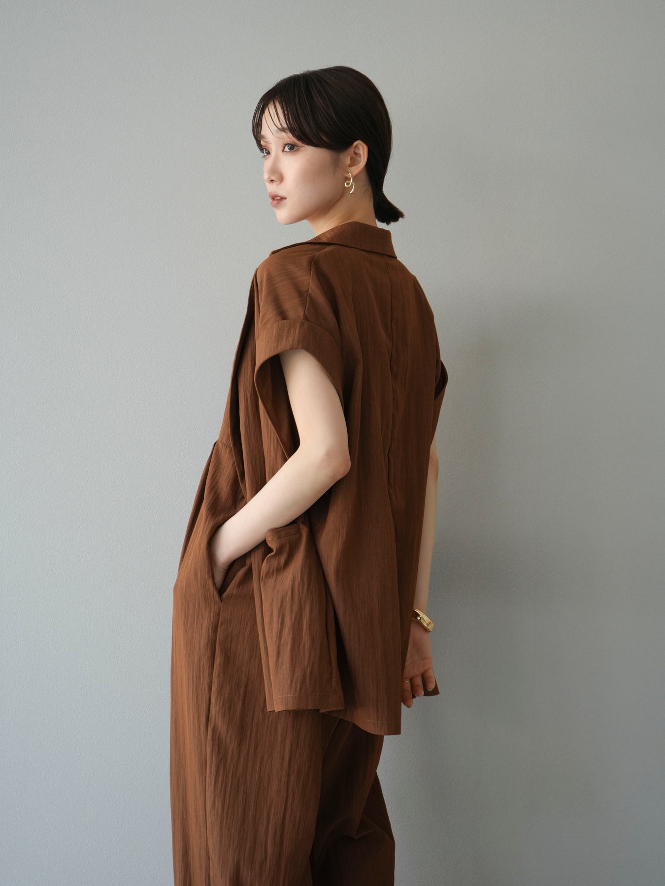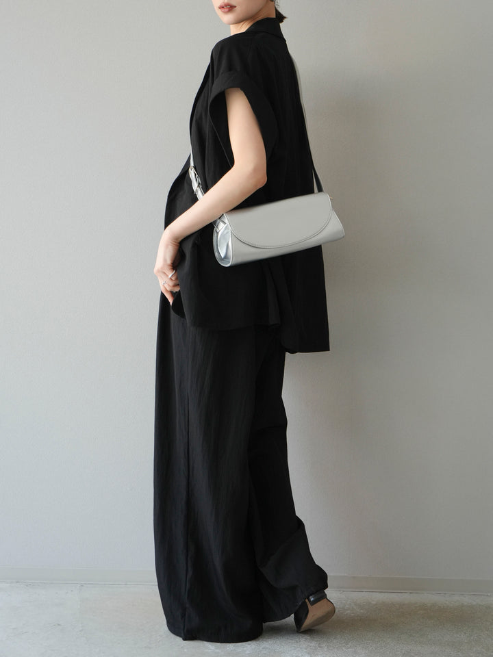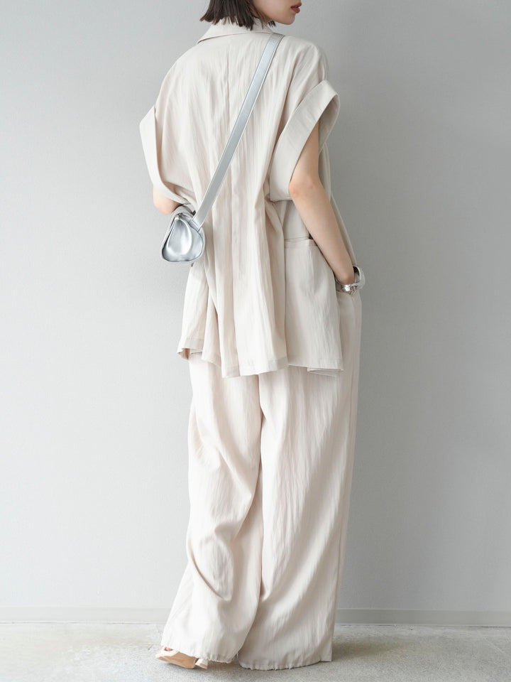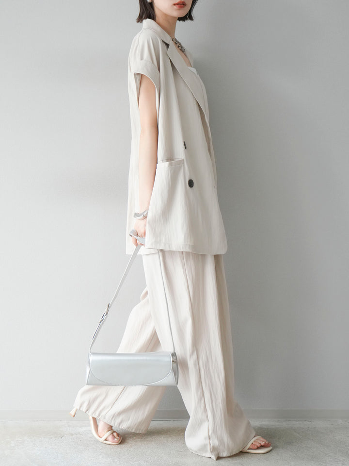 ナチュラルな風合いが魅力のリネンライク素材を使用した、ダブルボタン仕様のノースリーブジレ。肩に程よくかかるフレンチスリーブと、計算されたゆとりのあるシルエットが、抜け感とこなれた印象を演出します。 ヒップが隠れるロング丈で、体型カバーと縦ラインのスタイルアップ効果も抜群。Tシャツやノースリーブトップスの上にさっと羽織るだけで、洗練されたレイヤードスタイルが完成します。セットアップ風の着こなしもおすすめです。 ※ボトムス、キャミソール(インナー)以外の商品は一律でインナーは付属していません。