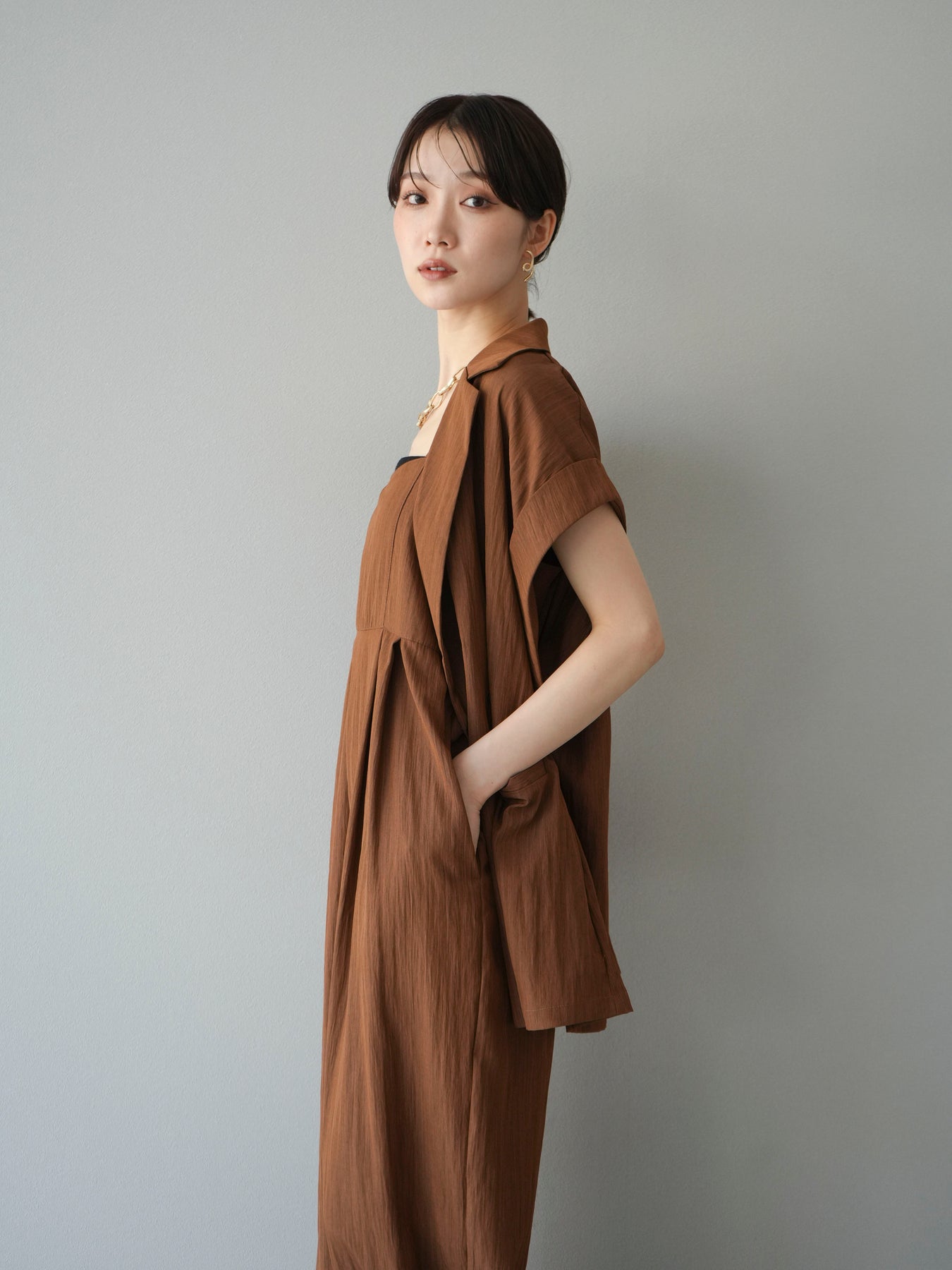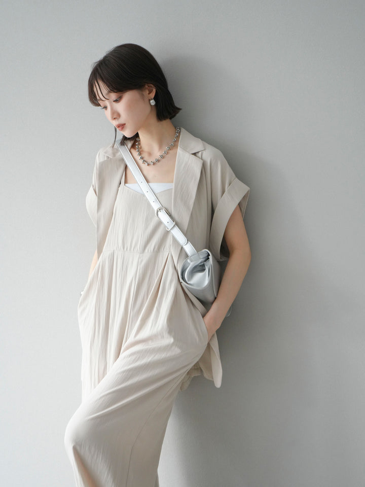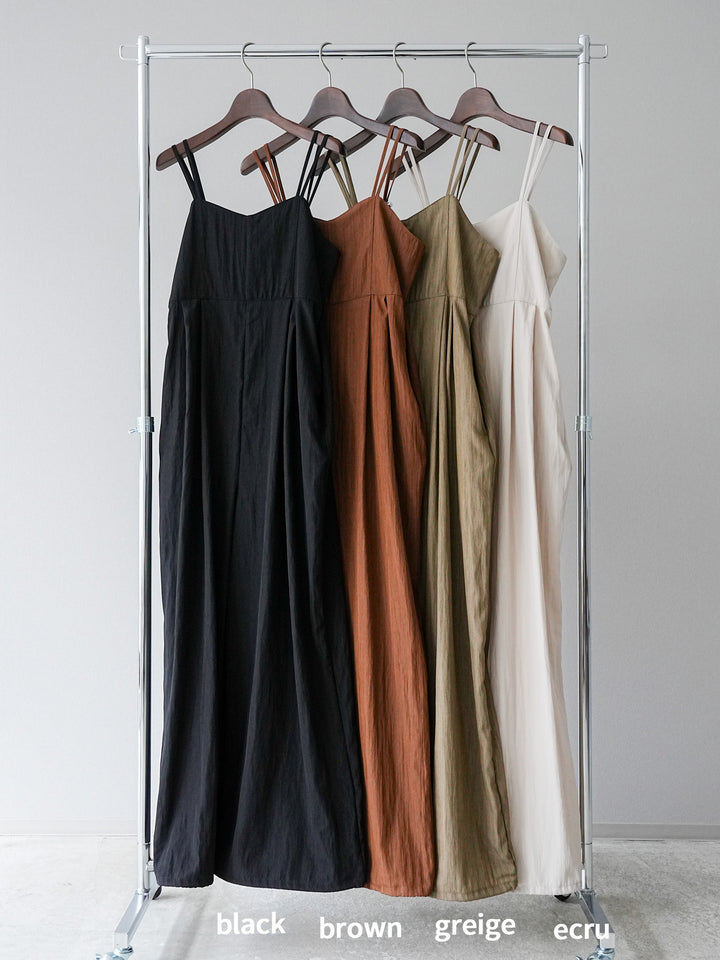バスト90cm 着丈124cm(肩紐部分除く) 股下66cm 渡幅38cm 肩紐全長70cm(結んで調節可) 裾幅調節可能 裏地なし エクリュ・グレージュのみ透け感ややあり 伸縮性なし サイドポケットあり バックジップあり