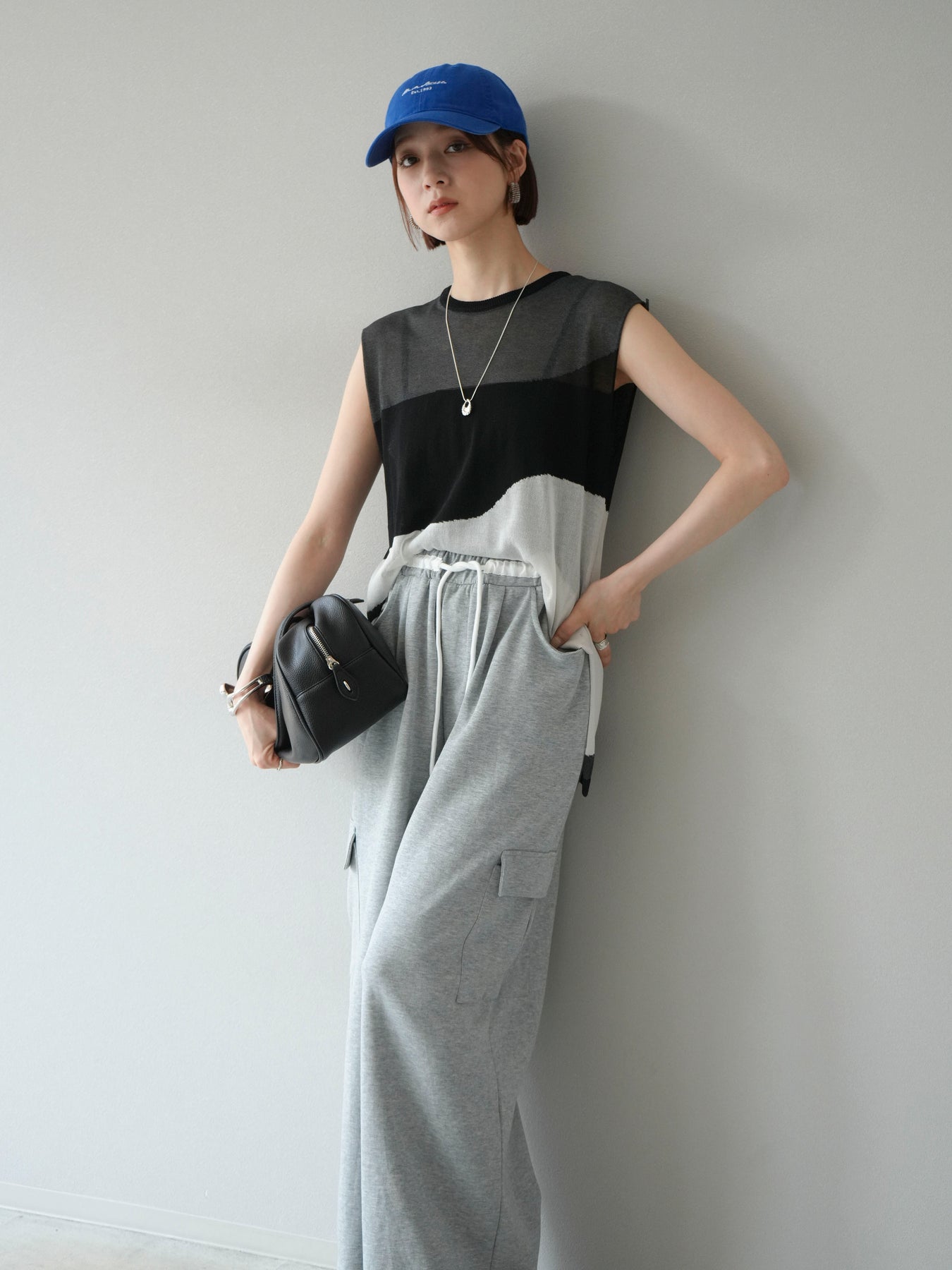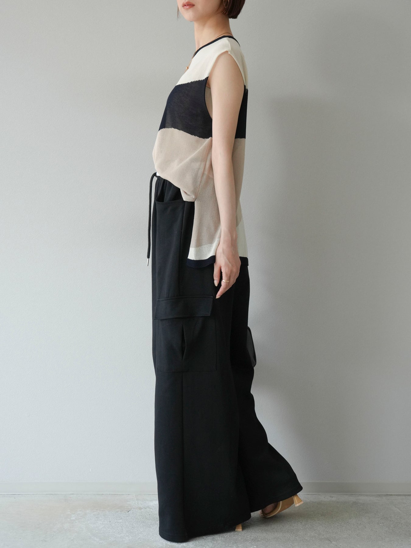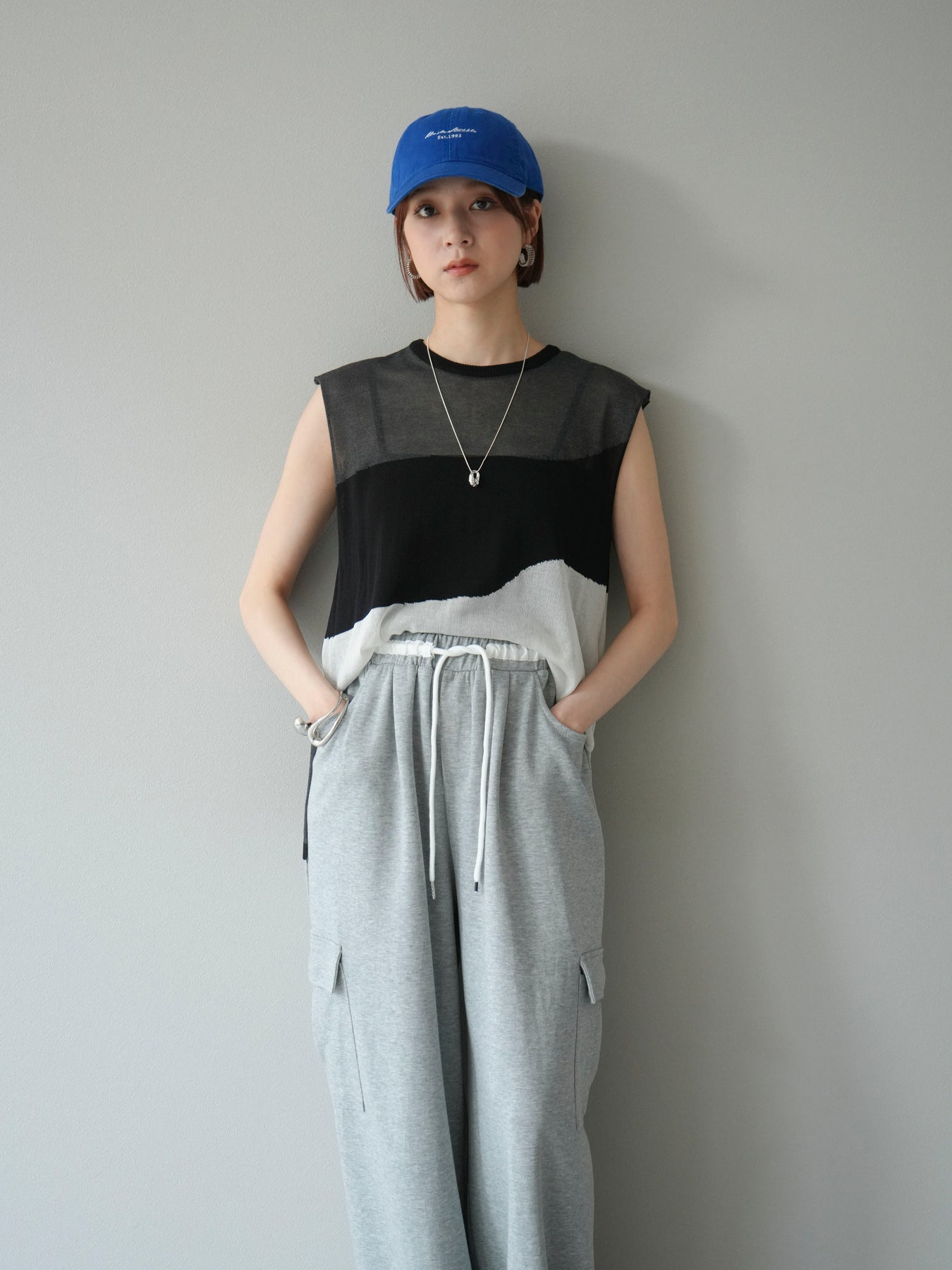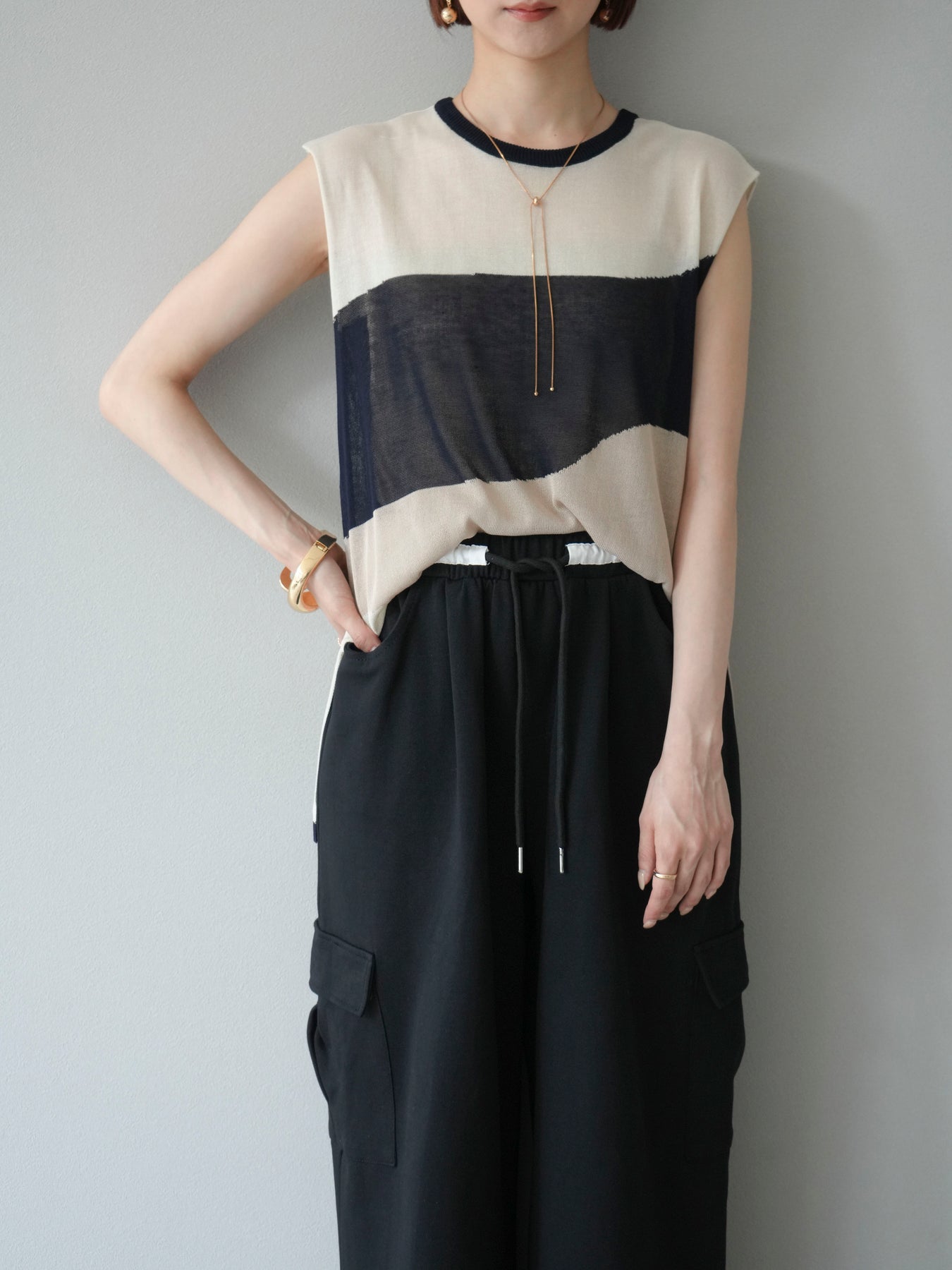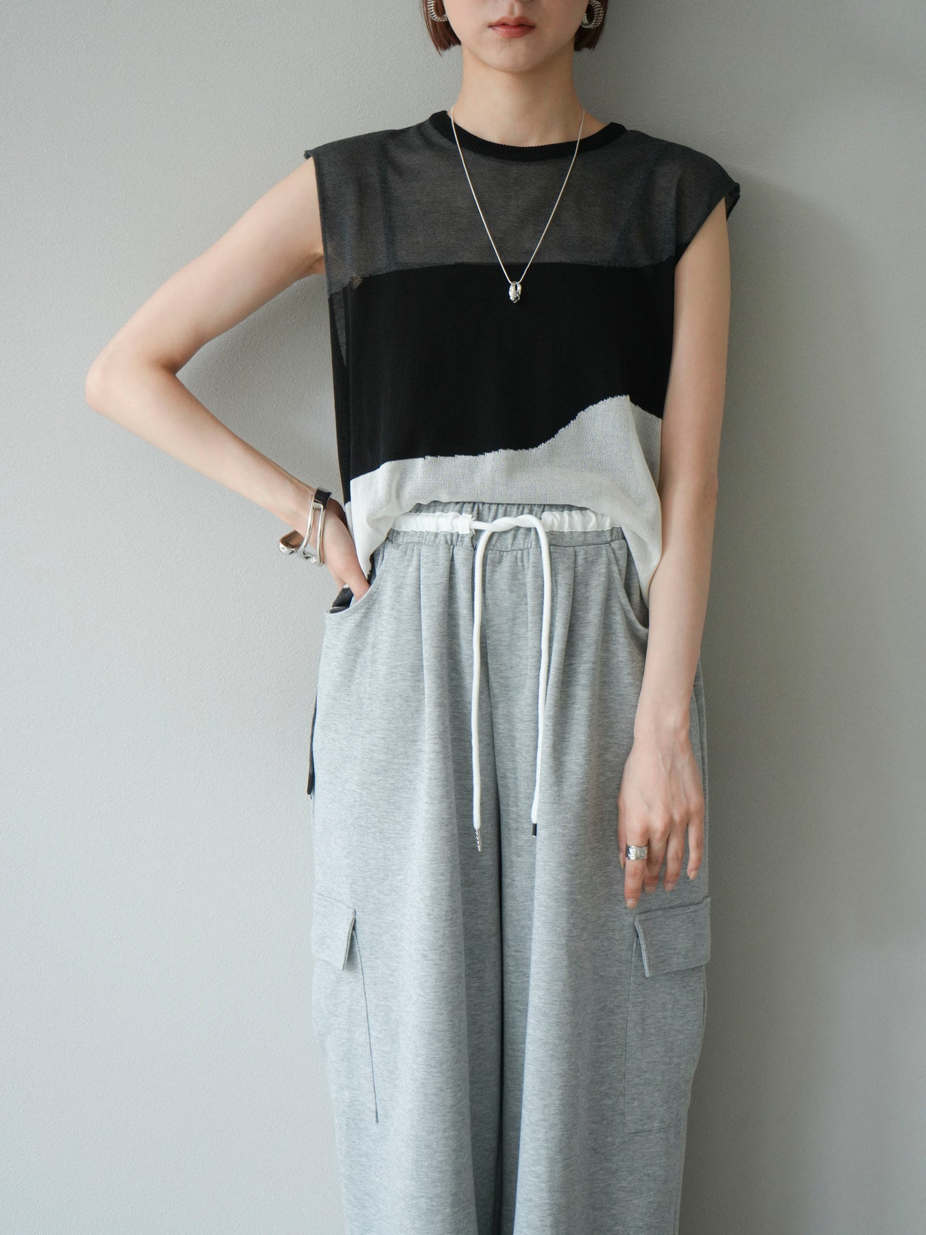[SET]バイカラーシアーニットノースリーブ+ウエストラインサイドポケットスウェットパンツ(2set)