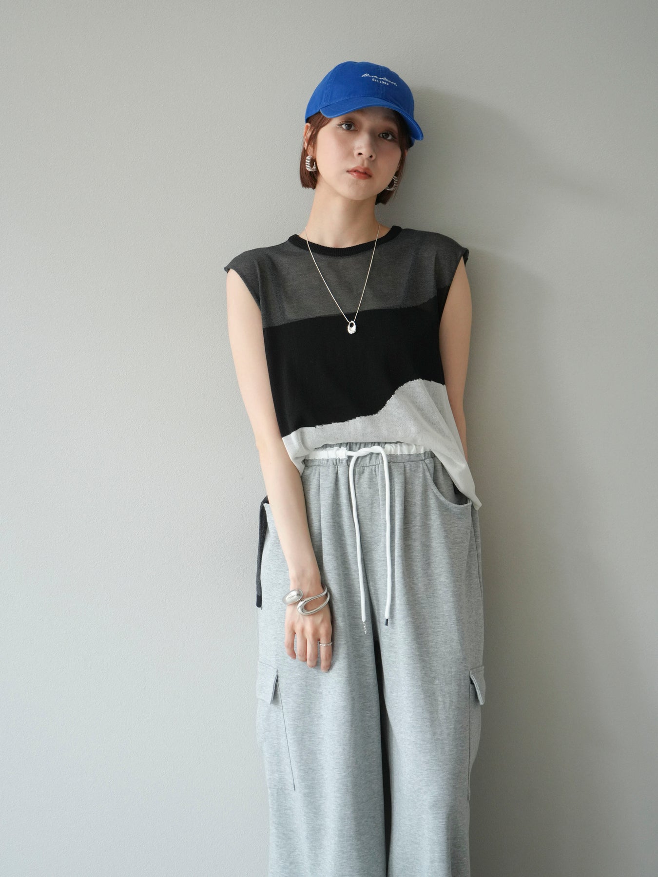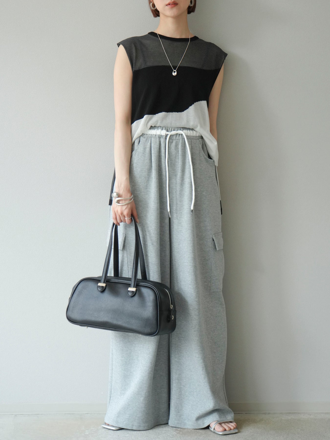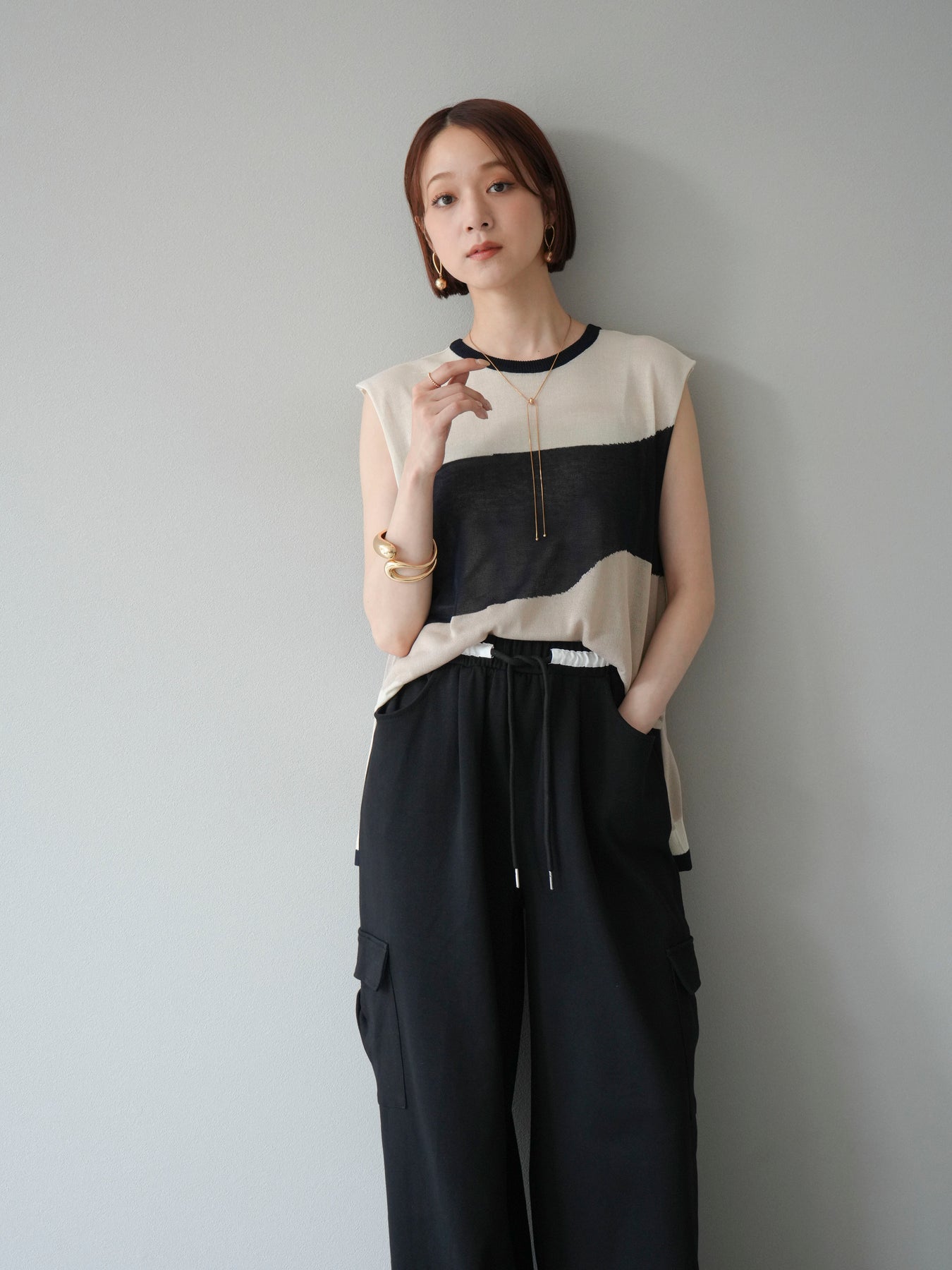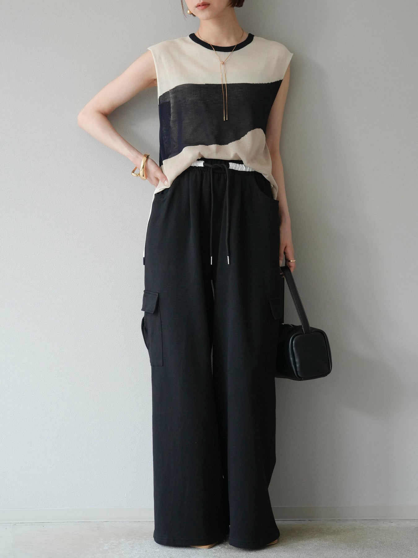 [SET]バイカラーシアーニットノースリーブ+ウエストラインサイドポケットスウェットパンツ(2set)