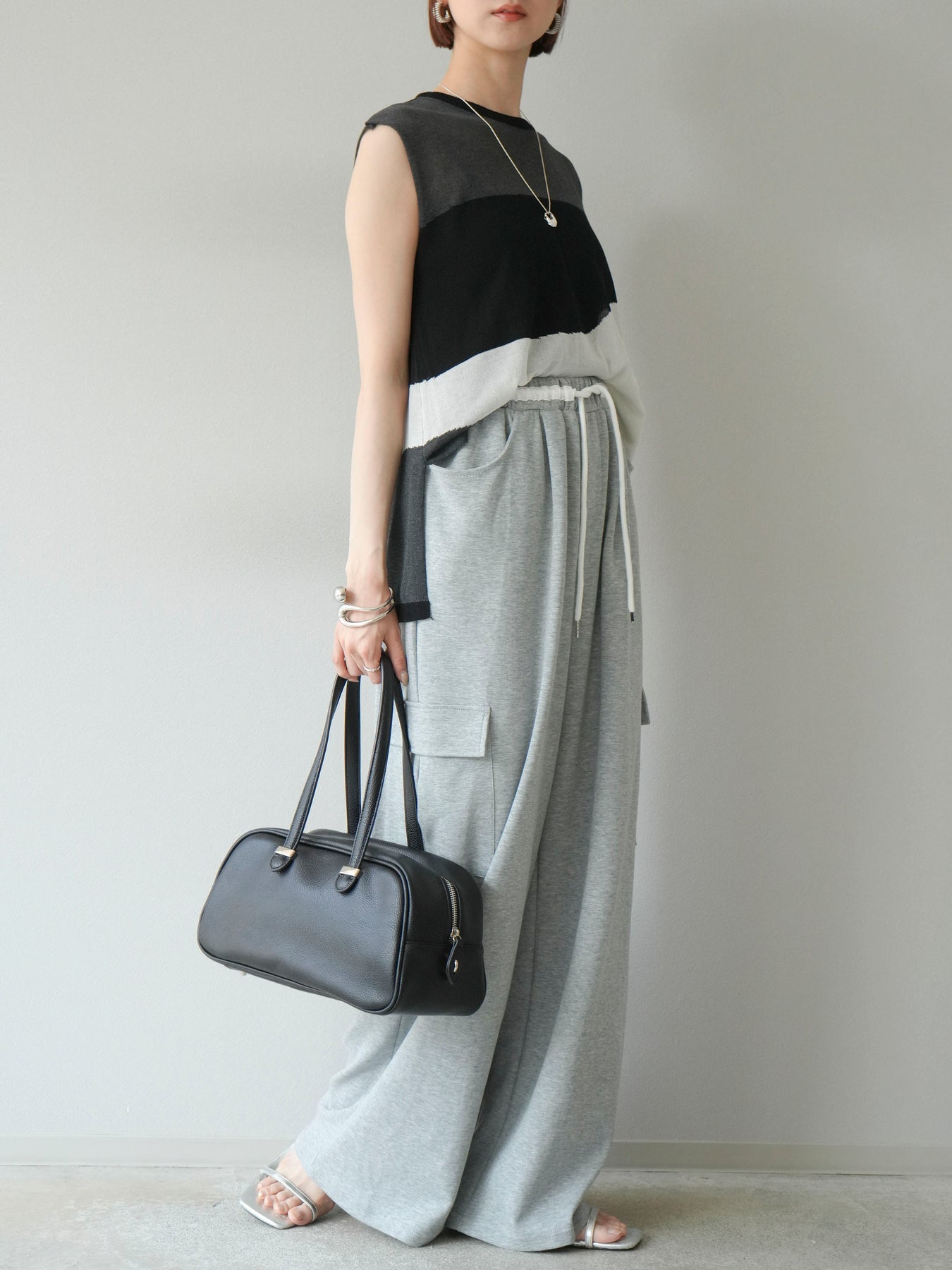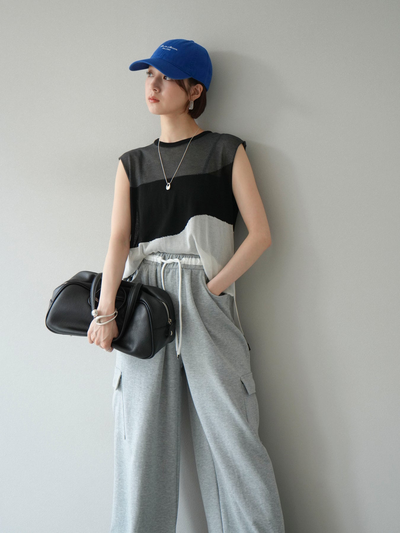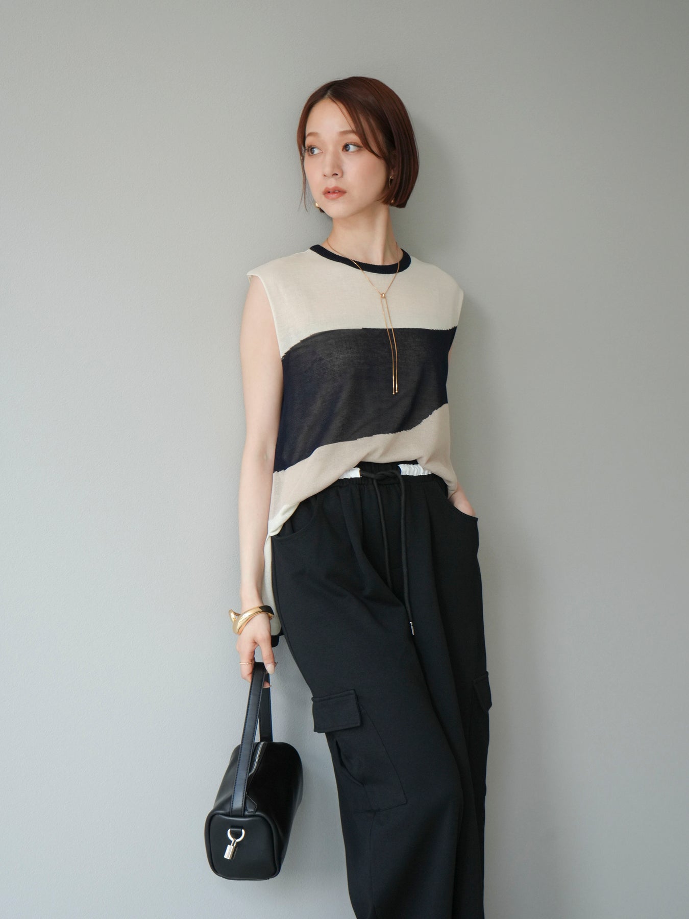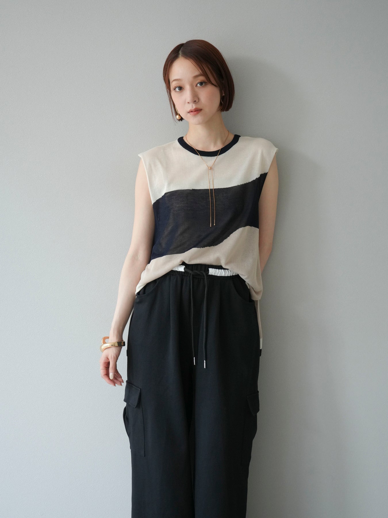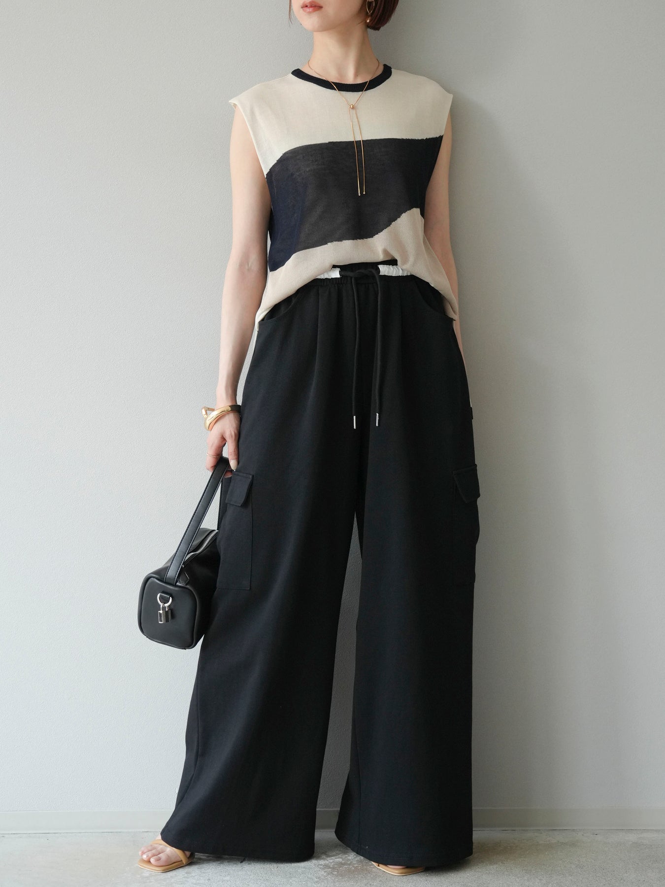 [SET]バイカラーシアーニットノースリーブ+ウエストラインサイドポケットスウェットパンツ(2set)