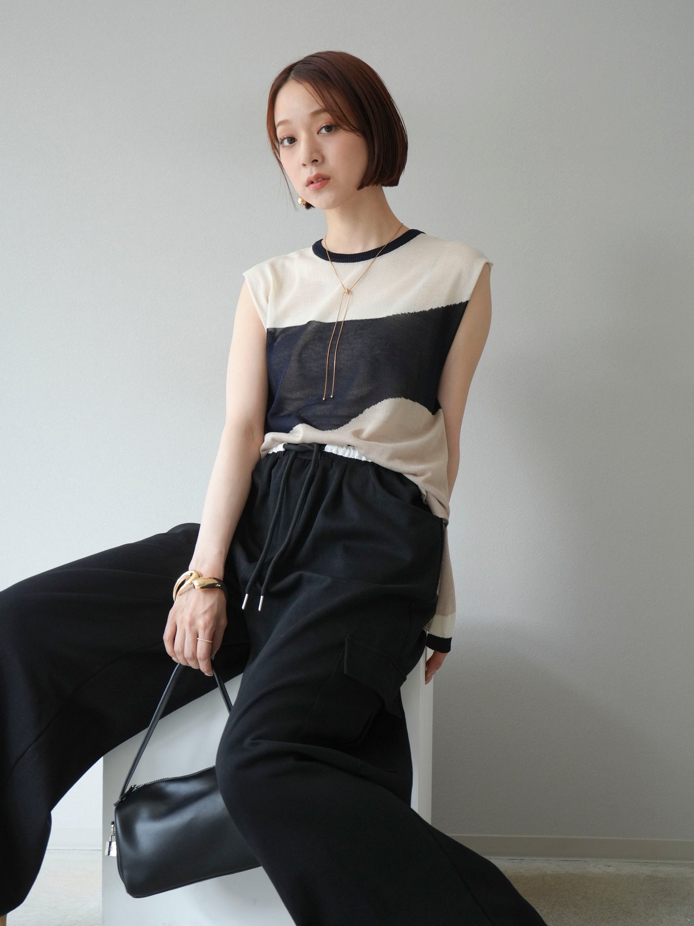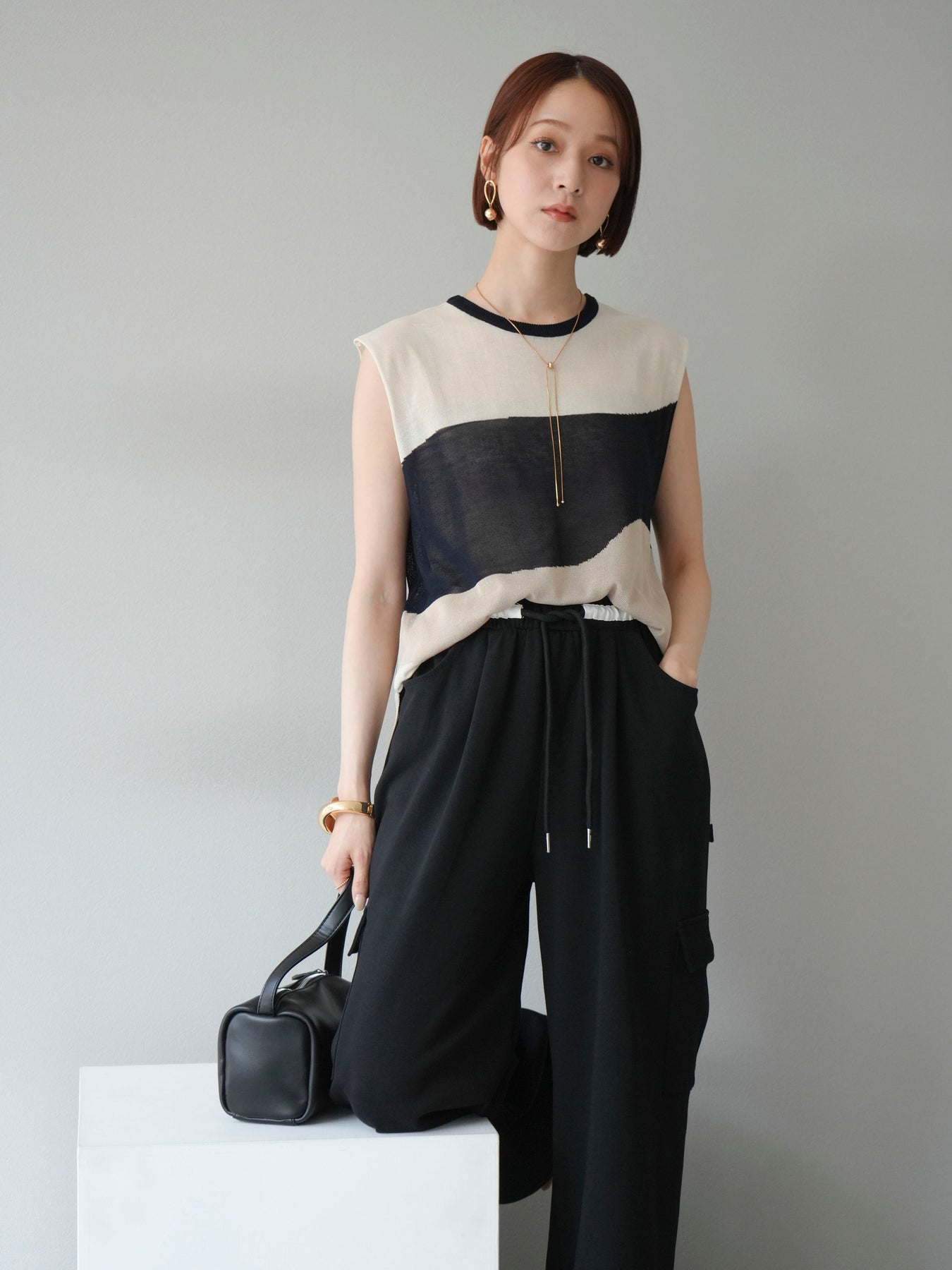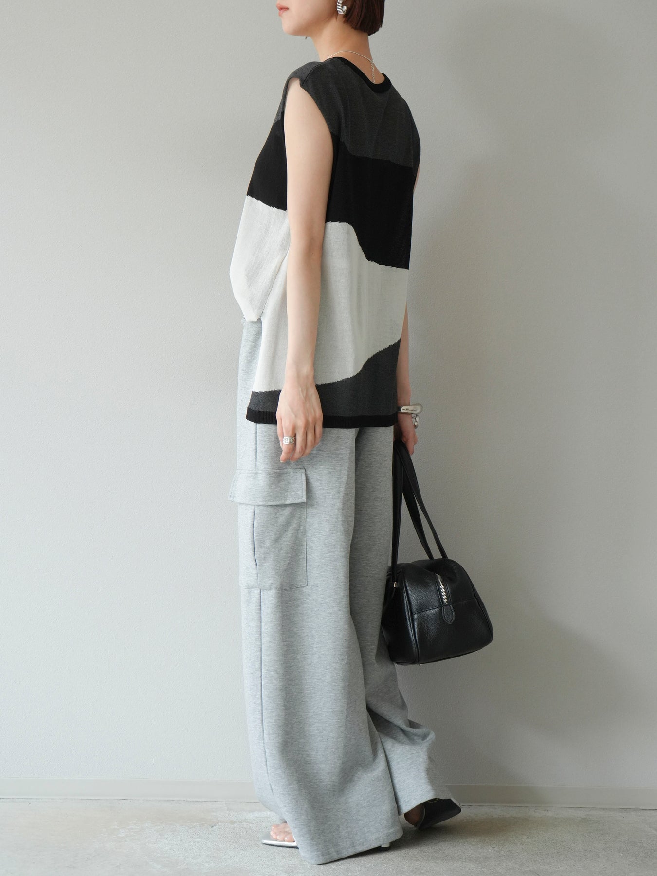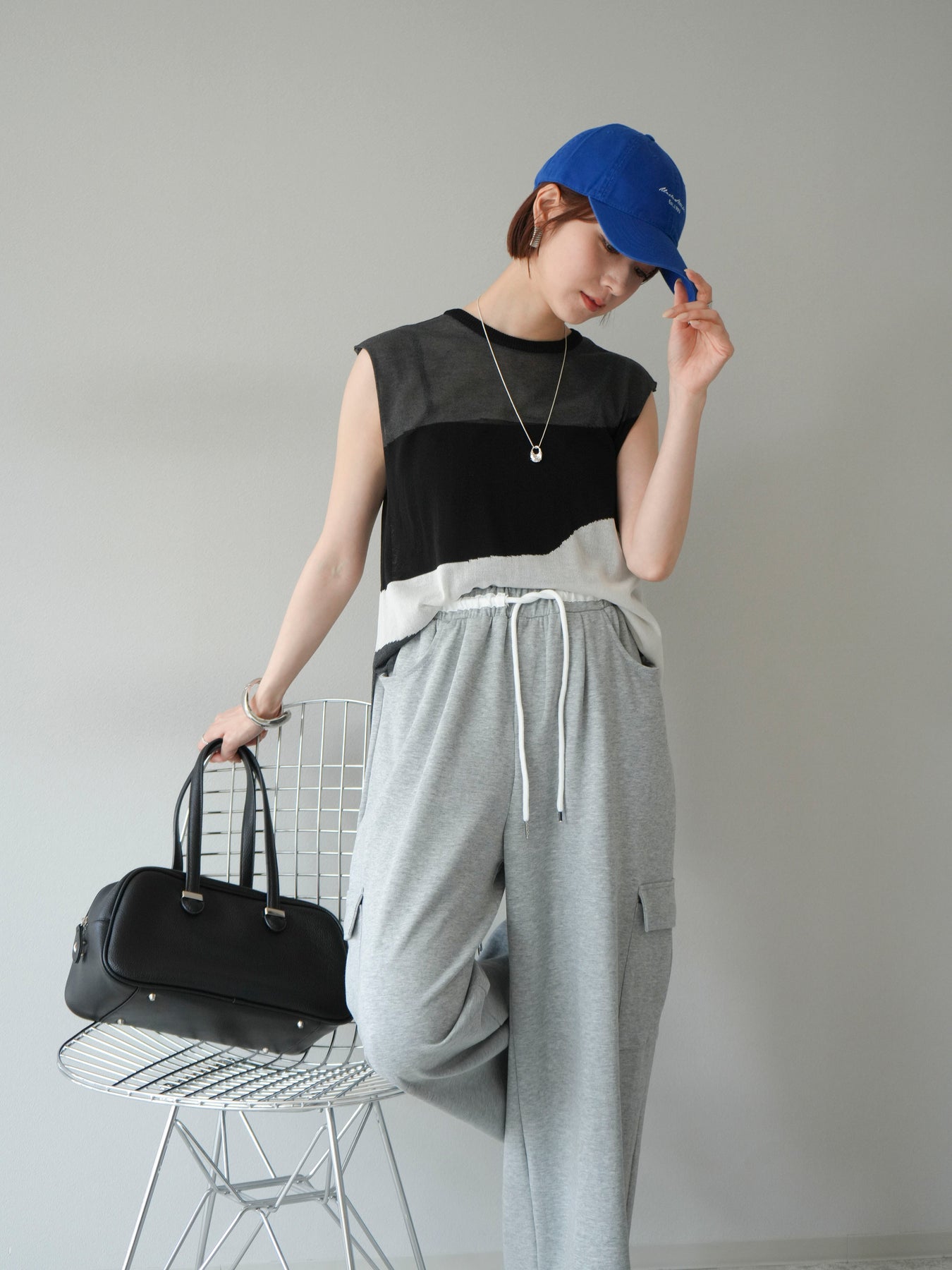 [SET]バイカラーシアーニットノースリーブ+ウエストラインサイドポケットスウェットパンツ(2set)
