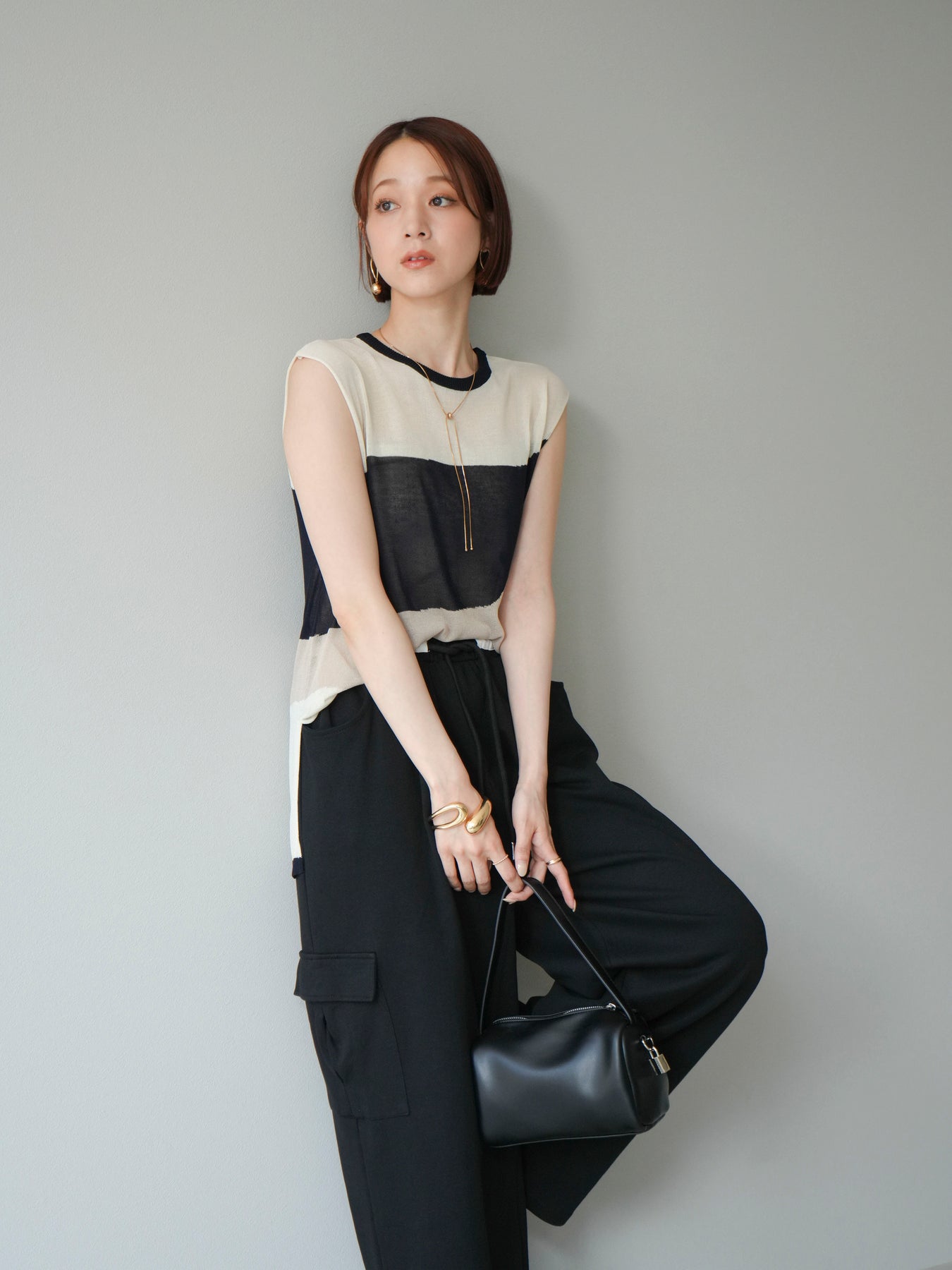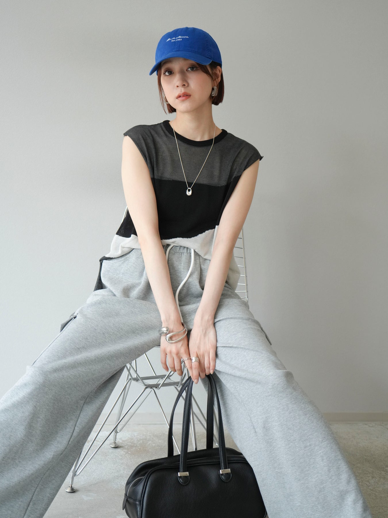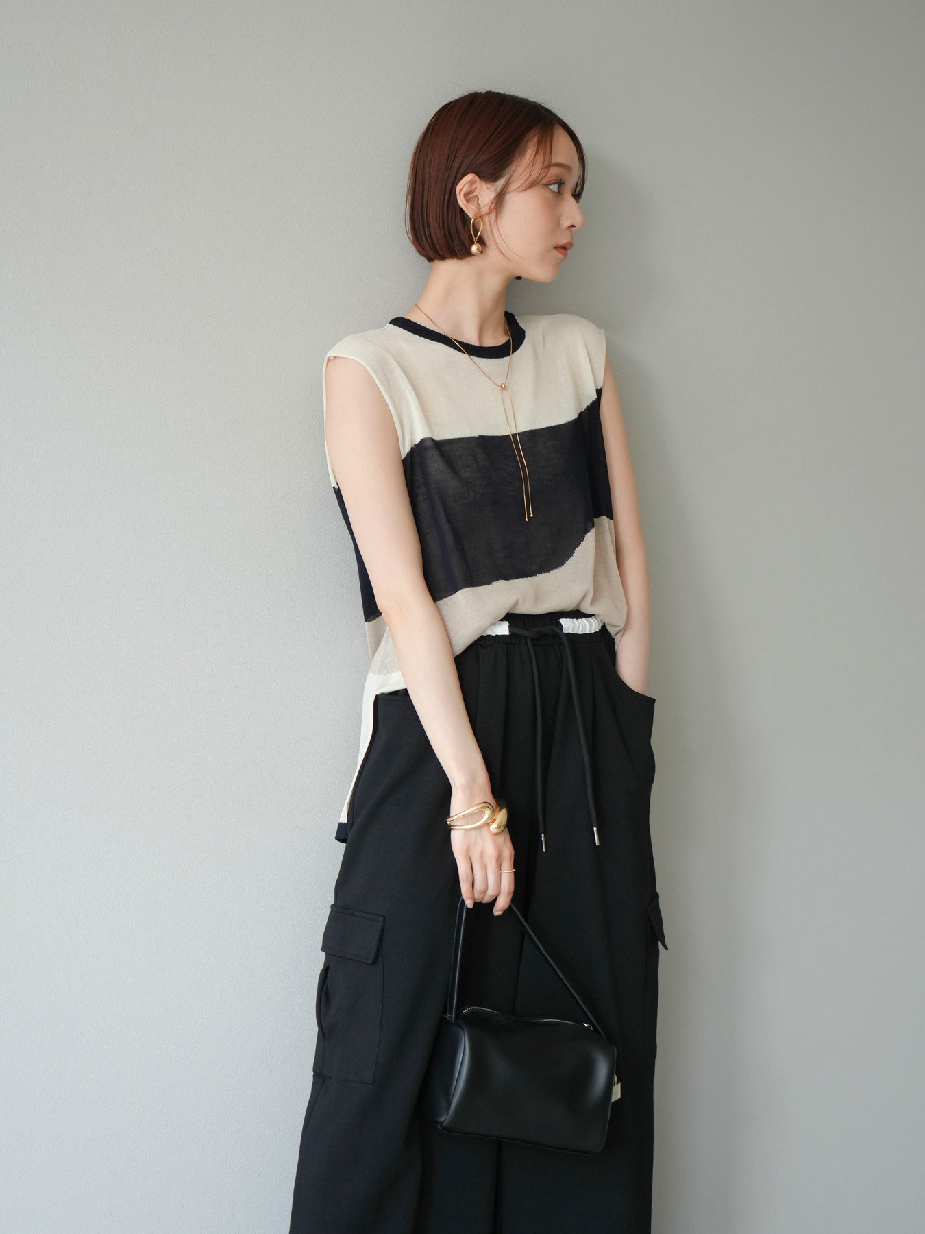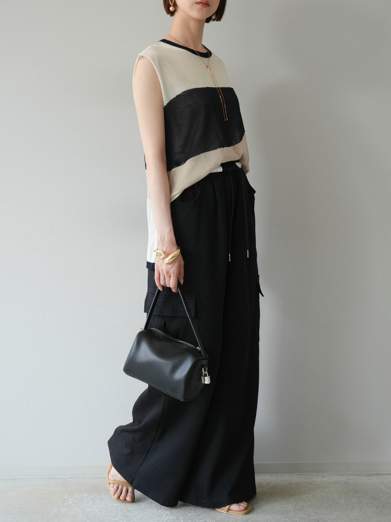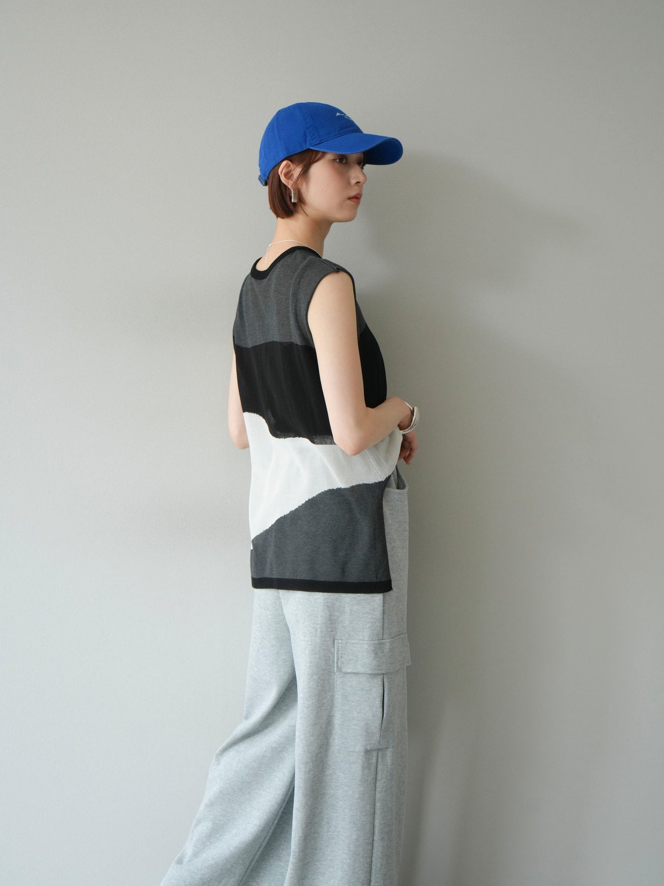 [SET]バイカラーシアーニットノースリーブ+ウエストラインサイドポケットスウェットパンツ(2set)
