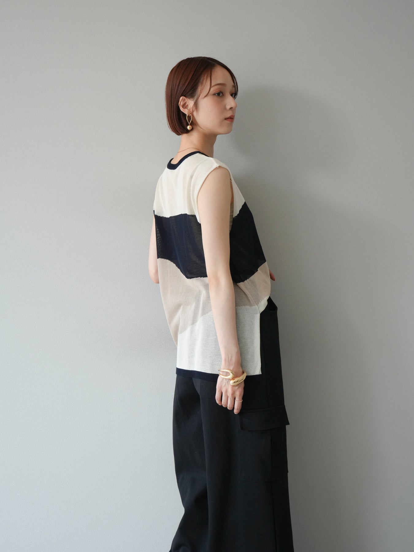 軽やかな素材のノースリーブトップスは絶妙な色のコントラストが特徴で、涼しげなデザインが夏のコーディネートにぴったり。ゆったりとしたシルエットでリラックス感があり、パンツやスカートなど様々なアイテムと相性抜群。シンプルながらも個性的なアイテムとして活躍します。