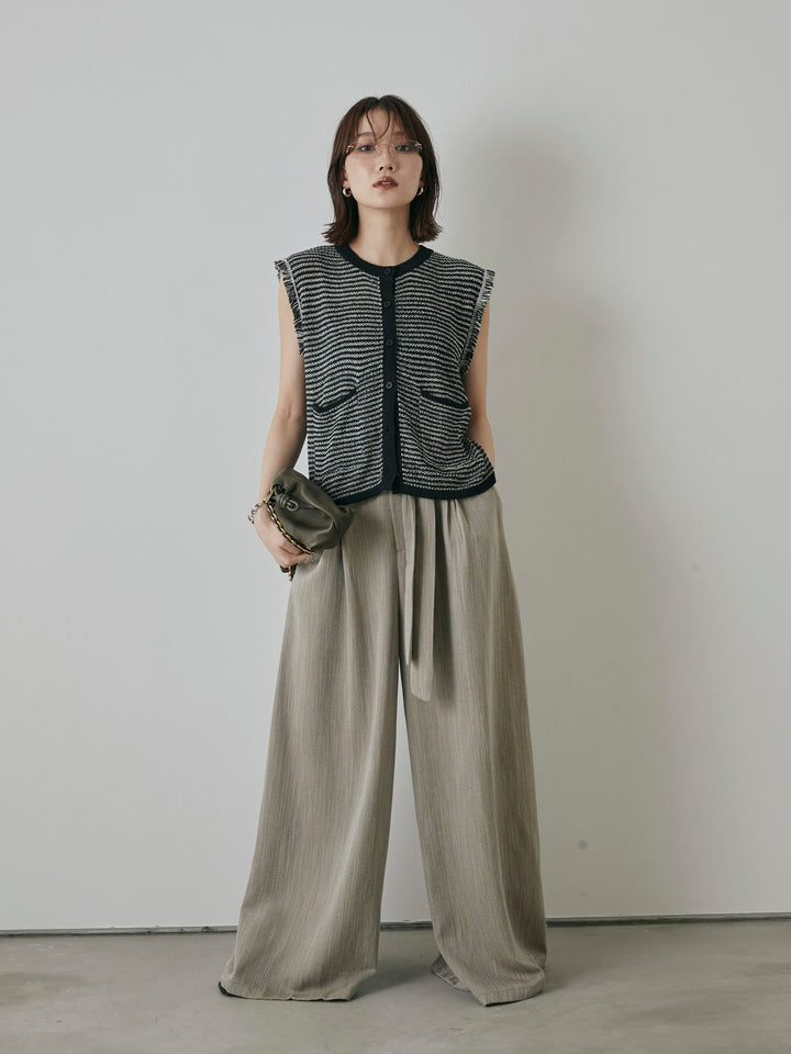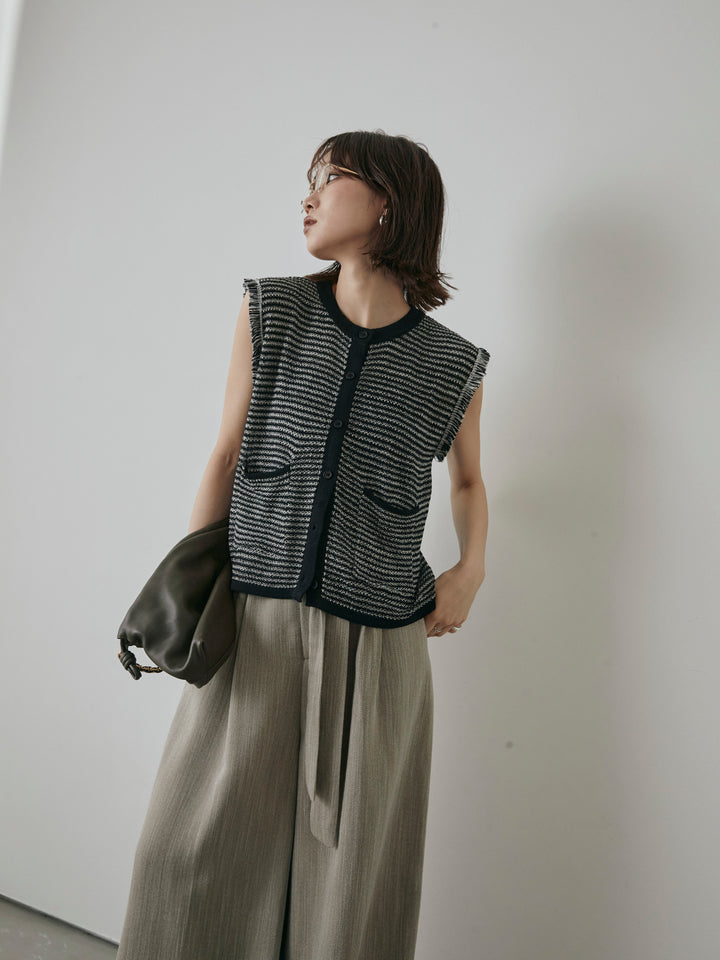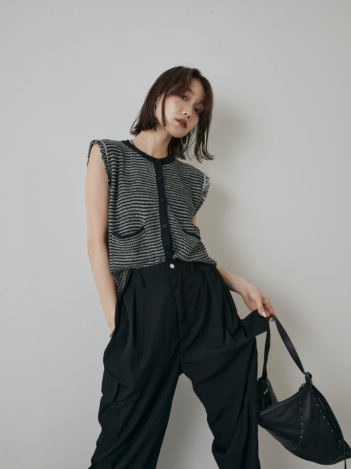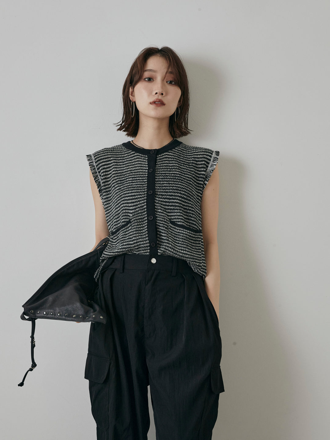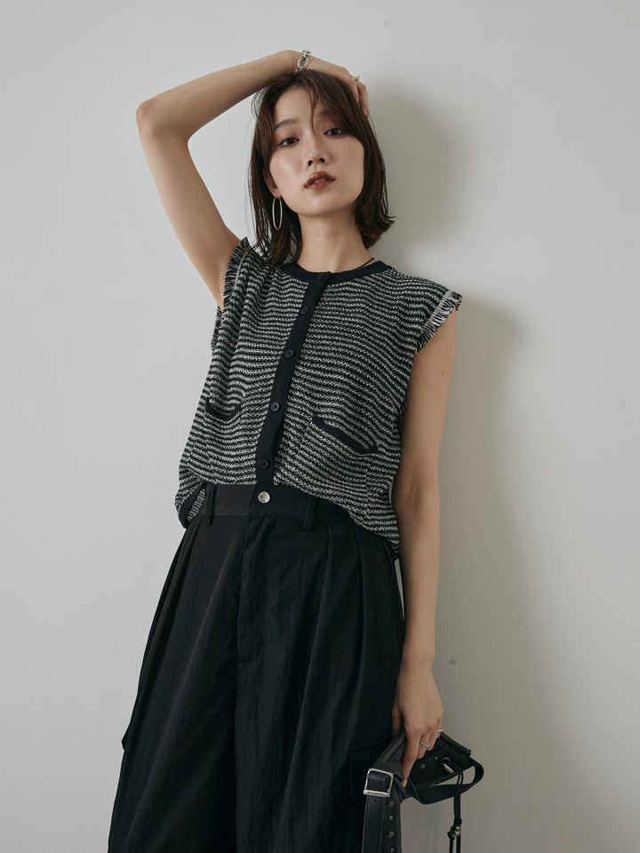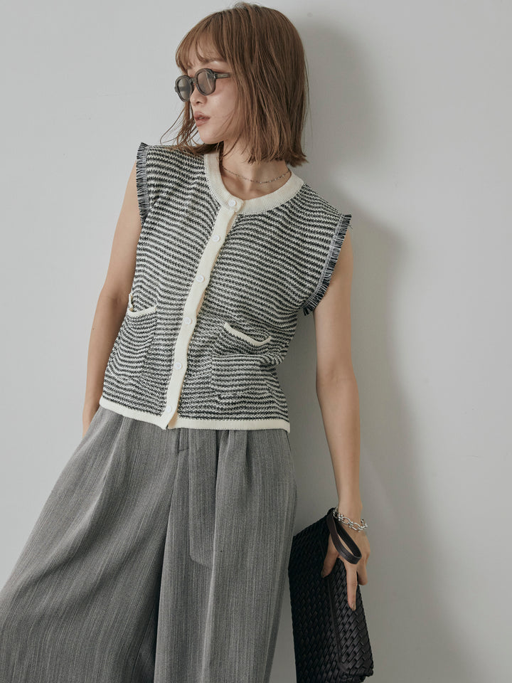 表情豊かな編地とフリンジディテールが魅力の、モード感漂うボーダーニットベスト。 袖口にあしらわれたフリンジがさりげないアクセントとなり、シンプルながらも存在感のあるスタイリングに仕上がります。 程よいゆとりのあるシルエットで、Tシャツやシアートップスとのレイヤードにもぴったり。 フロントはボタン仕様で、羽織りとしてもプルオーバー感覚でも着用可能です。 モノトーン配色のボーダー柄が洗練された印象を与え、カジュアルからきれいめまで幅広く対応。 パンツにもスカートにも合わせやすく、着回し力も抜群の一着です。