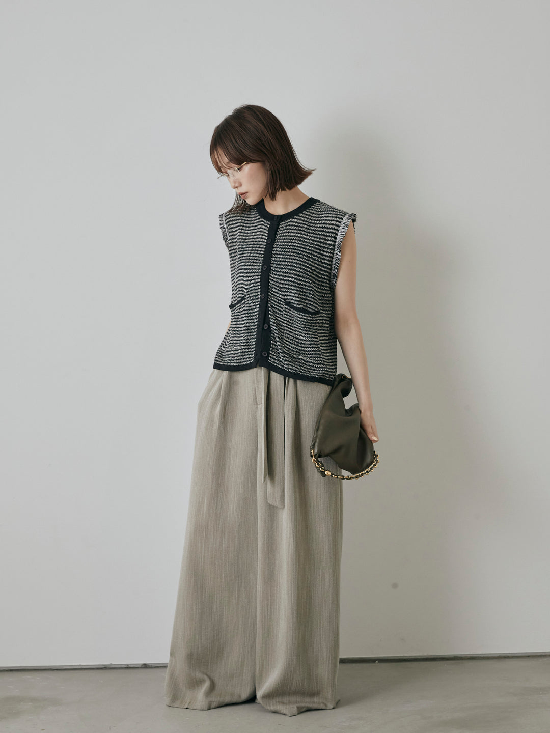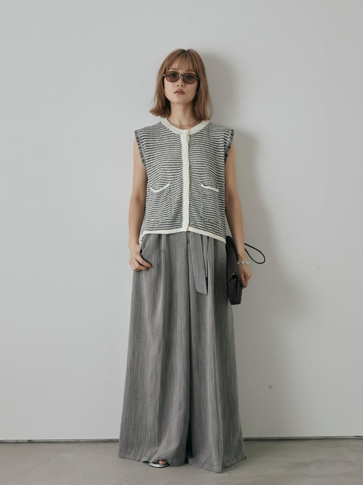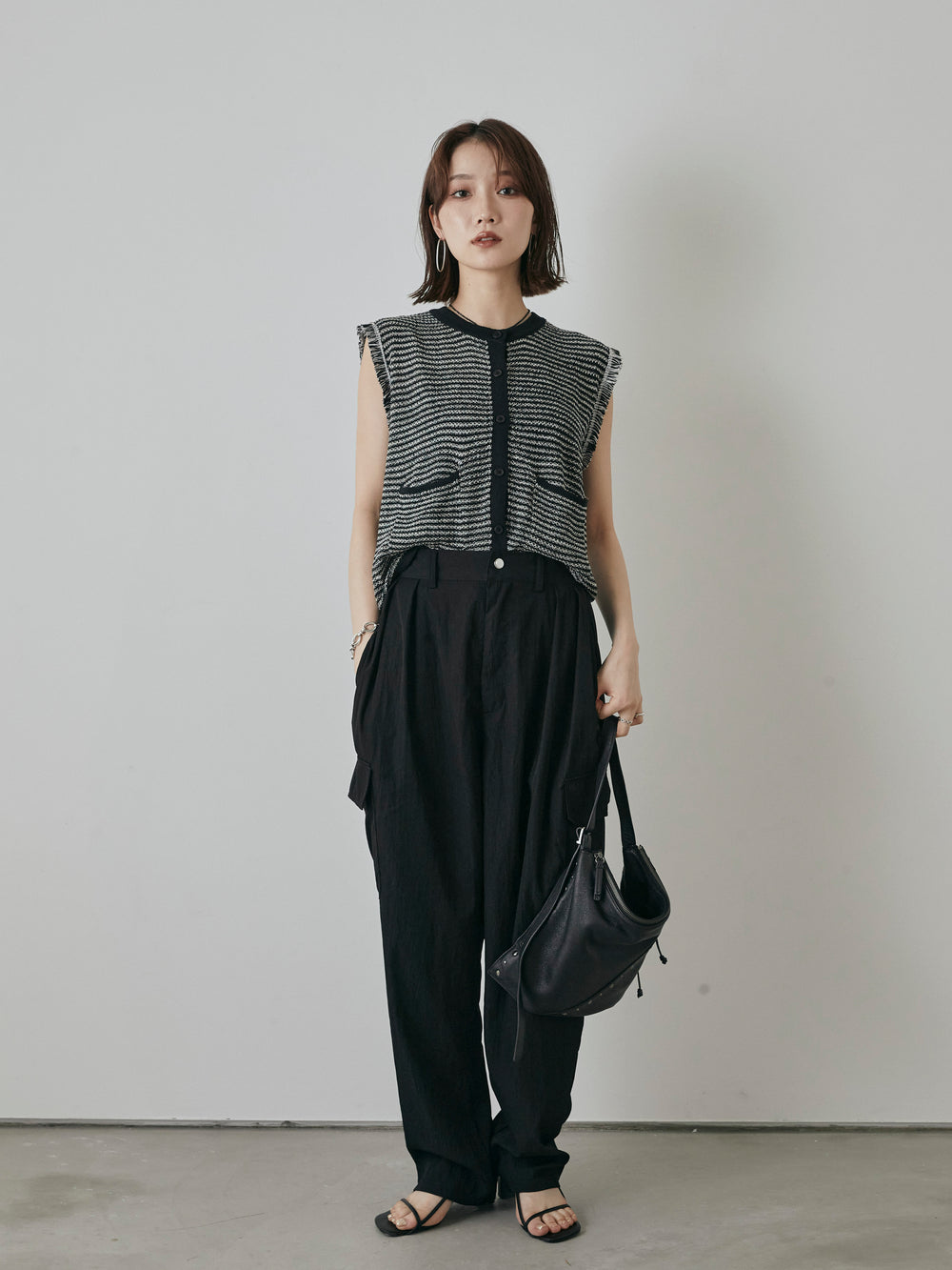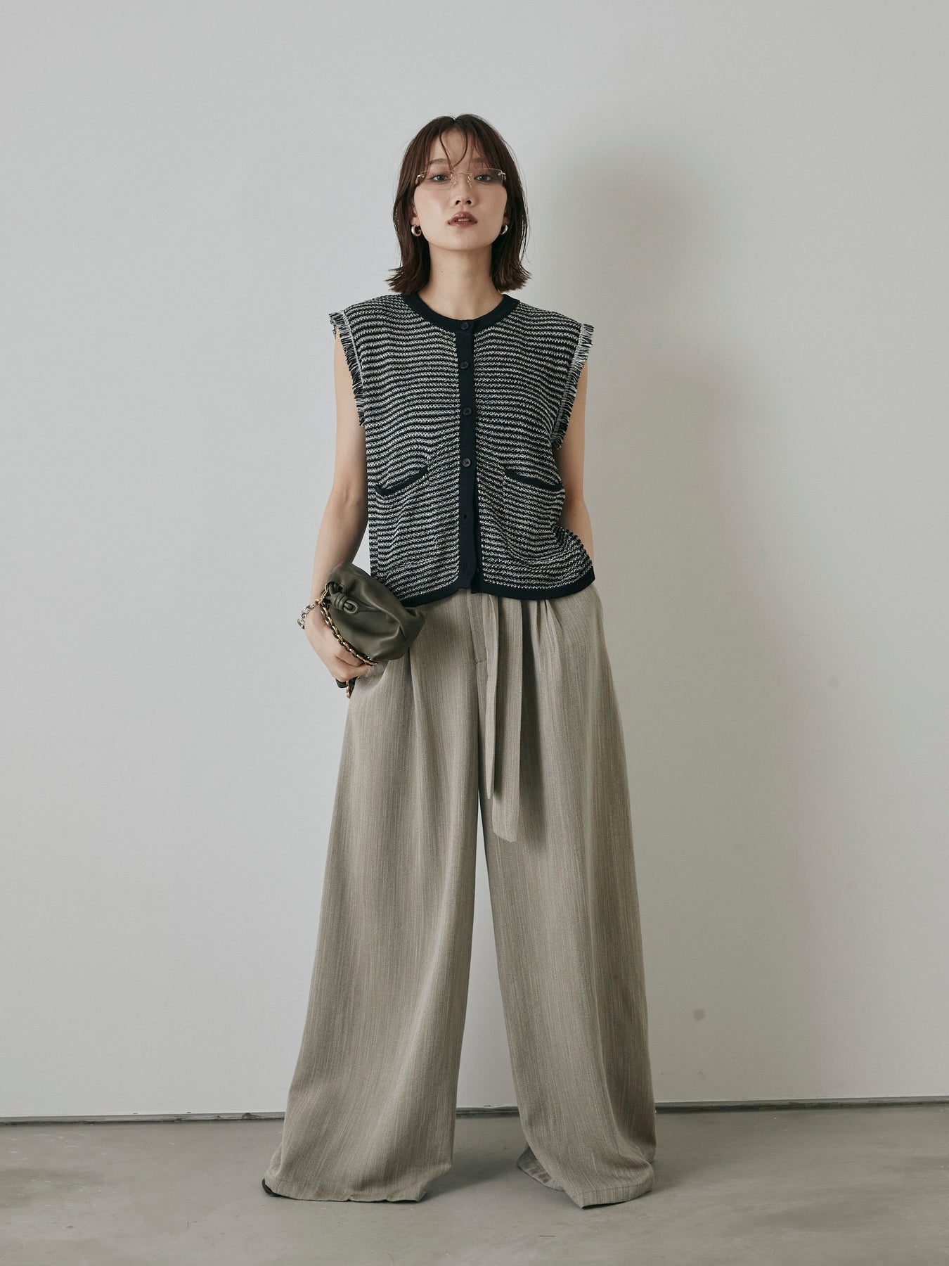 表情豊かな編地とフリンジディテールが魅力の、モード感漂うボーダーニットベスト。 袖口にあしらわれたフリンジがさりげないアクセントとなり、シンプルながらも存在感のあるスタイリングに仕上がります。 程よいゆとりのあるシルエットで、Tシャツやシアートップスとのレイヤードにもぴったり。 フロントはボタン仕様で、羽織りとしてもプルオーバー感覚でも着用可能です。 モノトーン配色のボーダー柄が洗練された印象を与え、カジュアルからきれいめまで幅広く対応。 パンツにもスカートにも合わせやすく、着回し力も抜群の一着です。