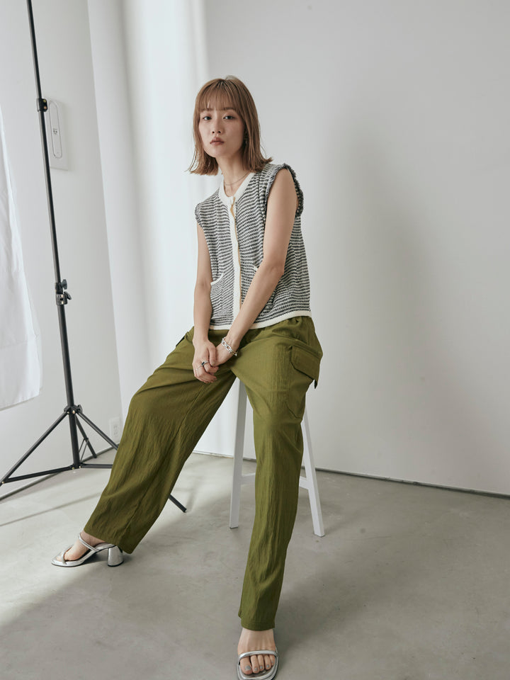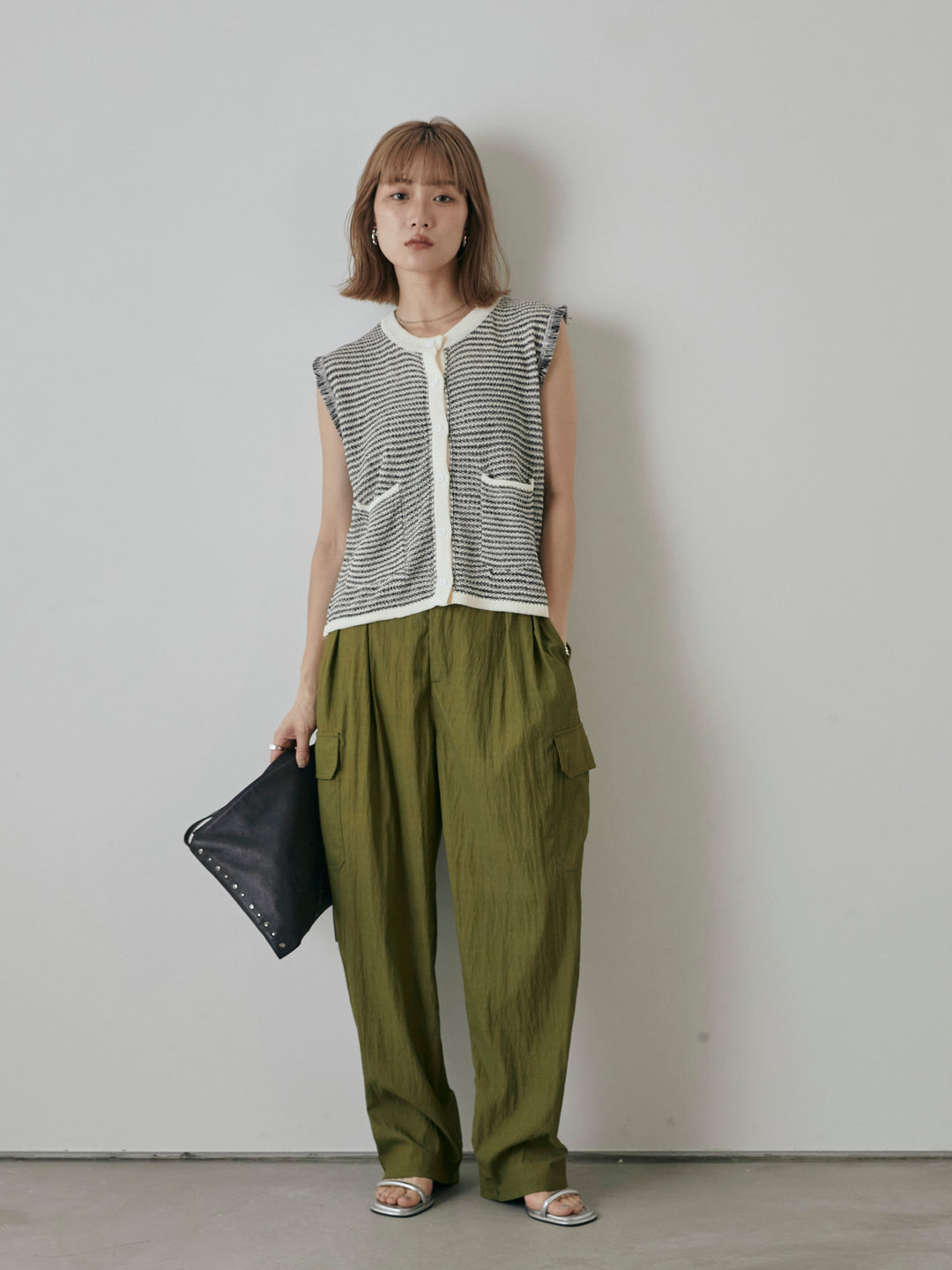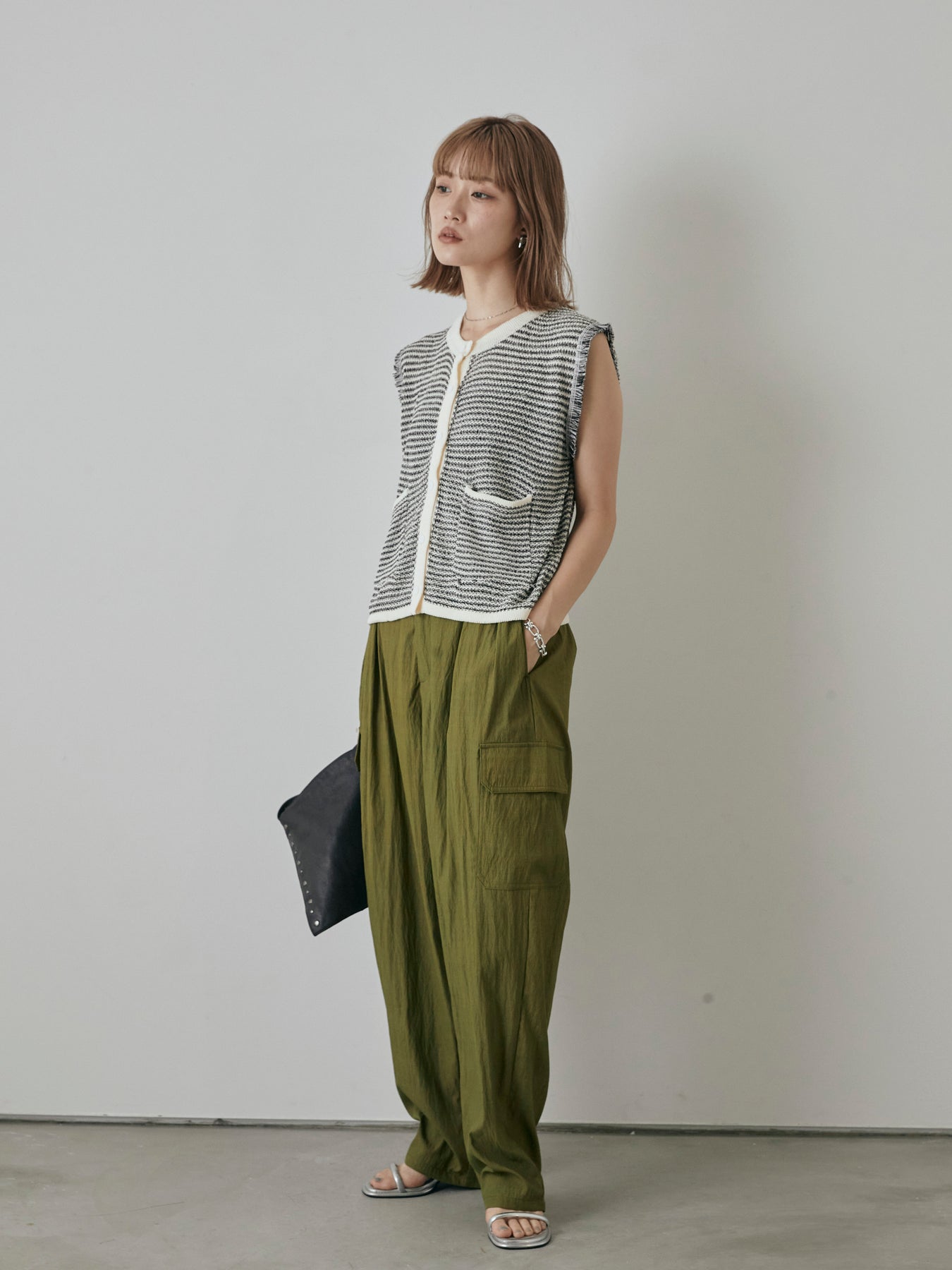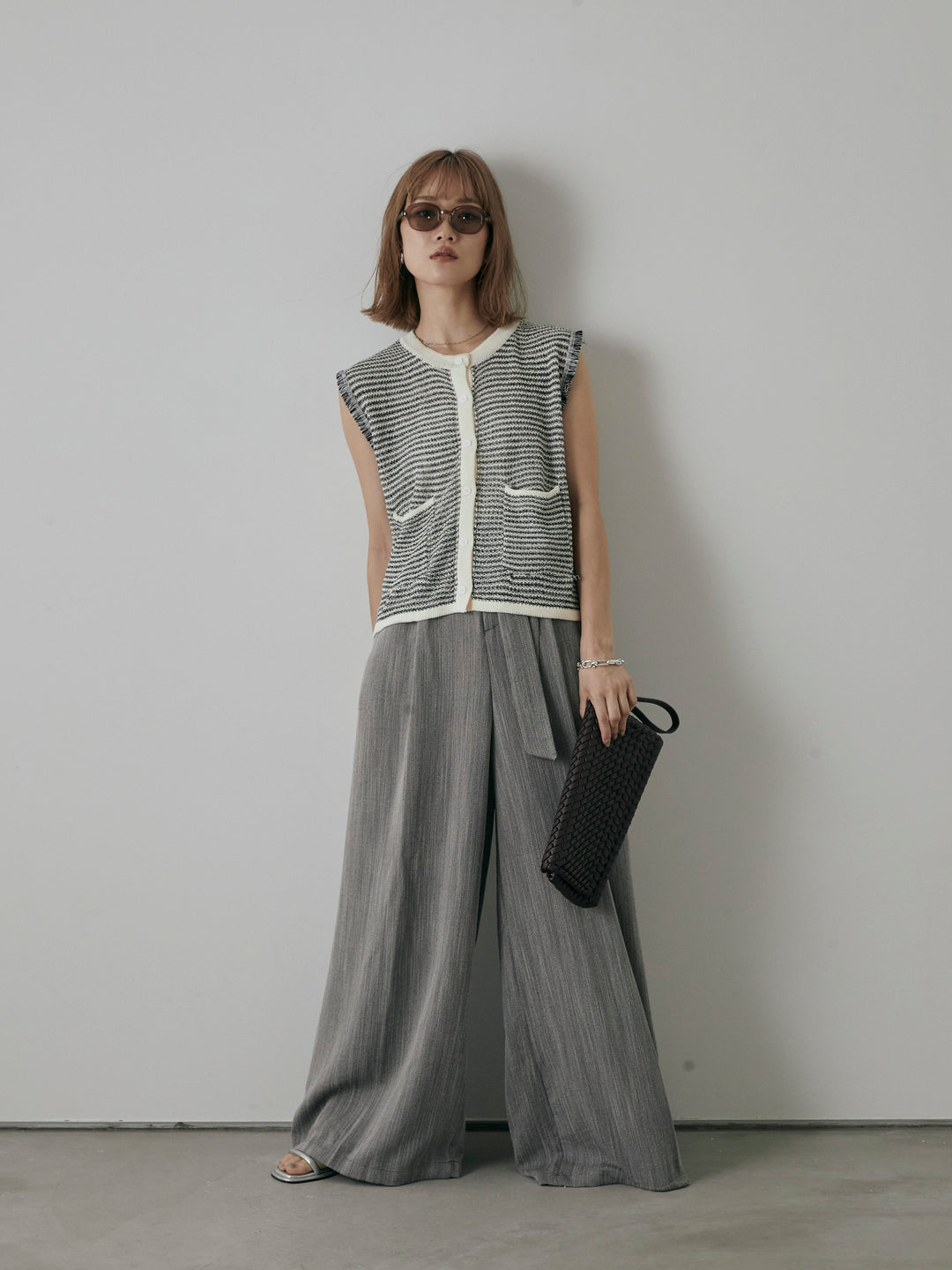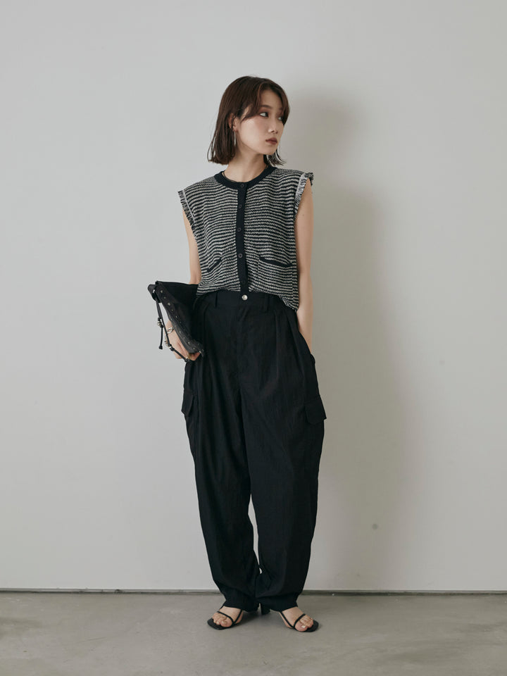 表情豊かな編地とフリンジディテールが魅力の、モード感漂うボーダーニットベスト。 袖口にあしらわれたフリンジがさりげないアクセントとなり、シンプルながらも存在感のあるスタイリングに仕上がります。 程よいゆとりのあるシルエットで、Tシャツやシアートップスとのレイヤードにもぴったり。 フロントはボタン仕様で、羽織りとしてもプルオーバー感覚でも着用可能です。 モノトーン配色のボーダー柄が洗練された印象を与え、カジュアルからきれいめまで幅広く対応。 パンツにもスカートにも合わせやすく、着回し力も抜群の一着です。
