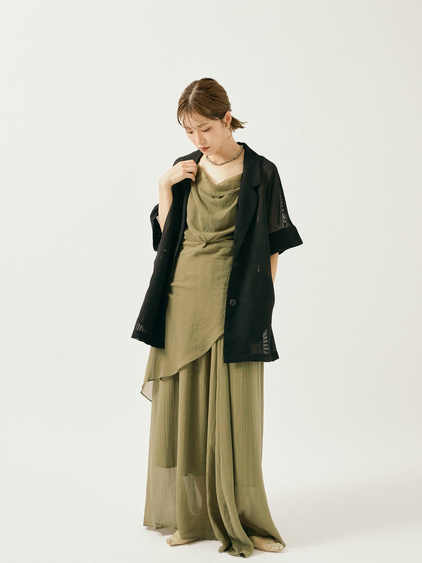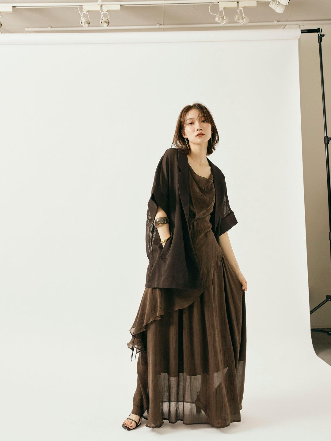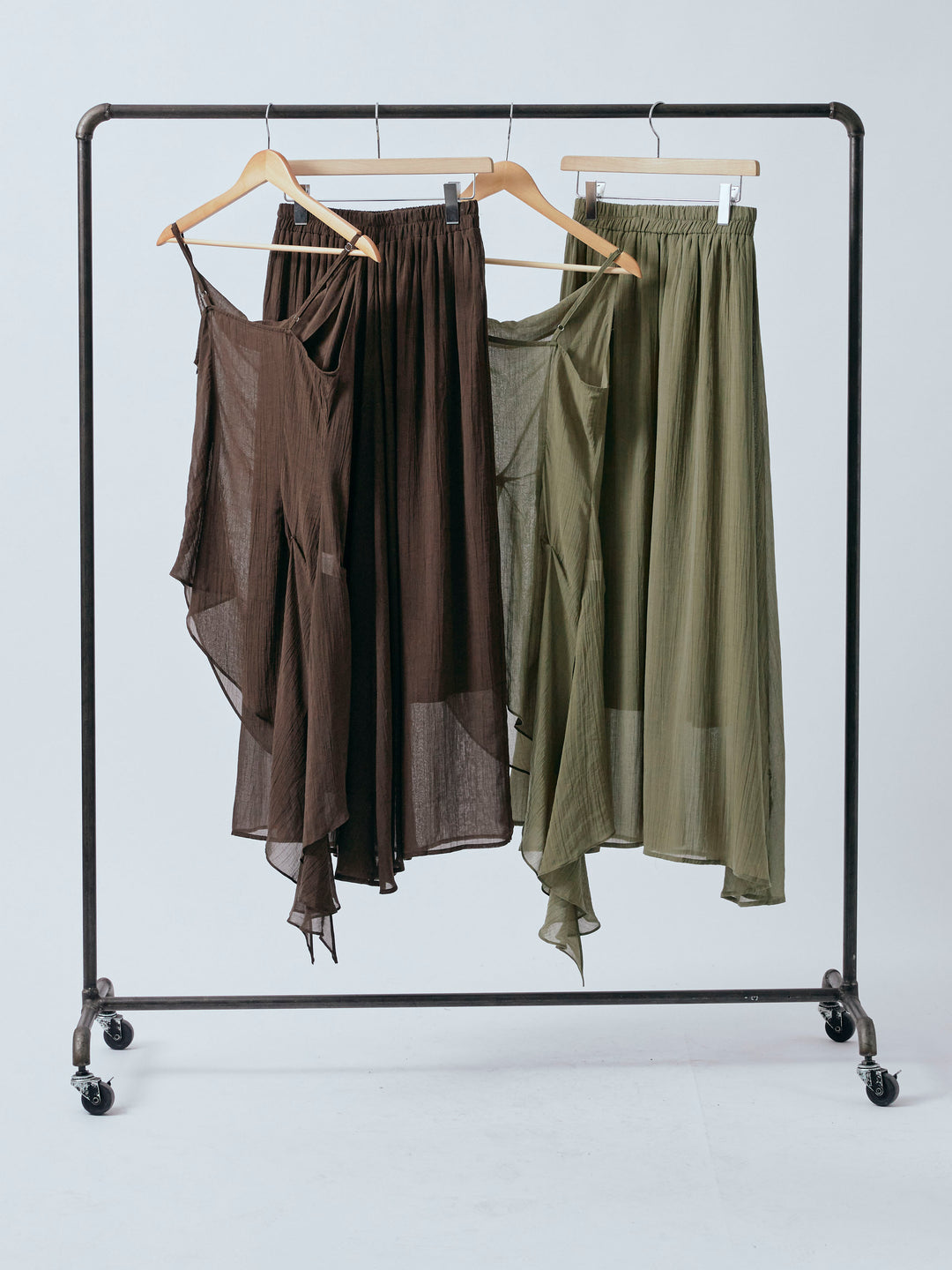 繊細なシアーワッシャー素材が魅力のセットアップ。 ふんわり揺れるラッフルデザインのキャミソールは、 アシンメトリーなシルエットで1枚でも存在感のある仕上がりに。 マキシ丈スカートは動きに合わせて優雅に広がり、 ナチュラルなニュアンスと大人のリラックスムードを演出します。 セットではもちろん、単品使いでも幅広く着まわせるアイテムです。 ※ボトムス、キャミソール(インナー)以外の商品は一律でインナーは付属していません。
