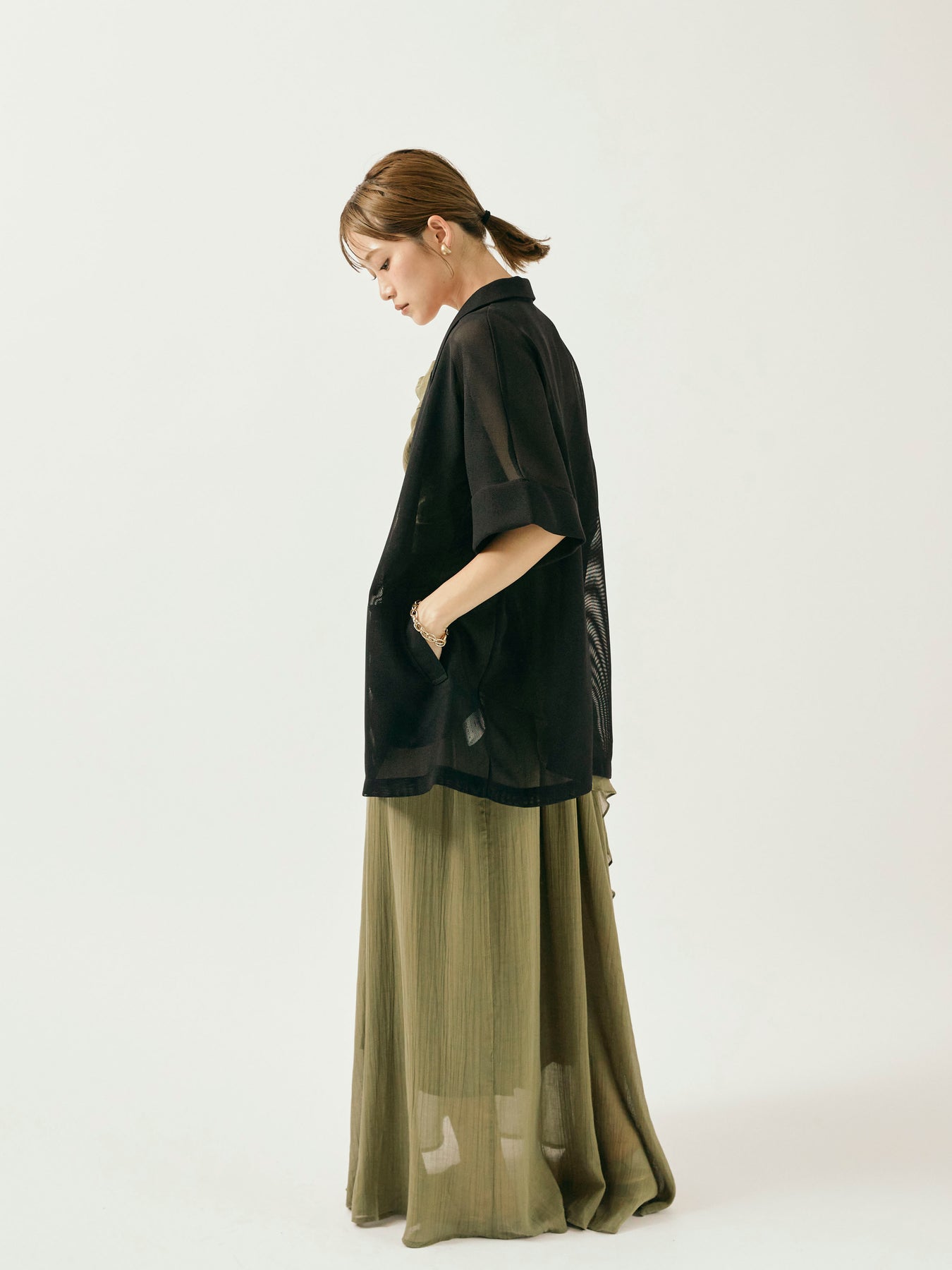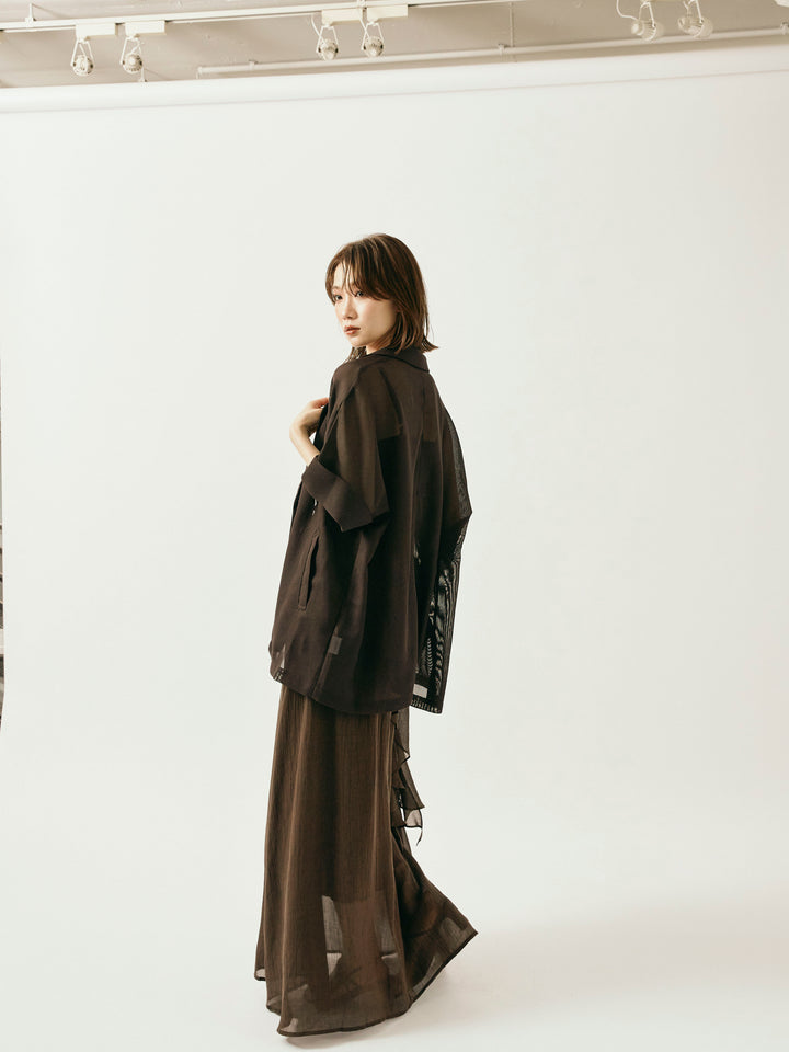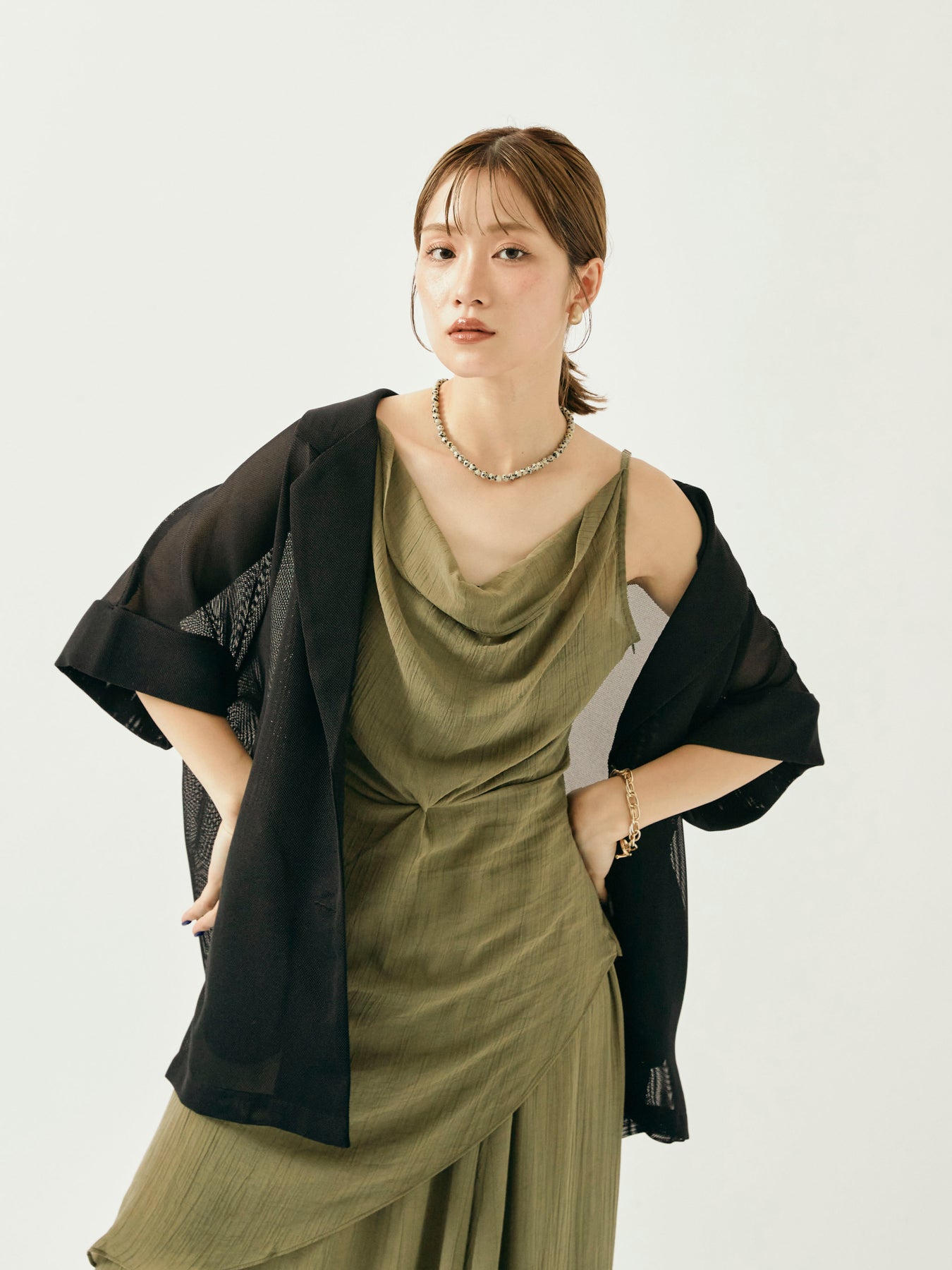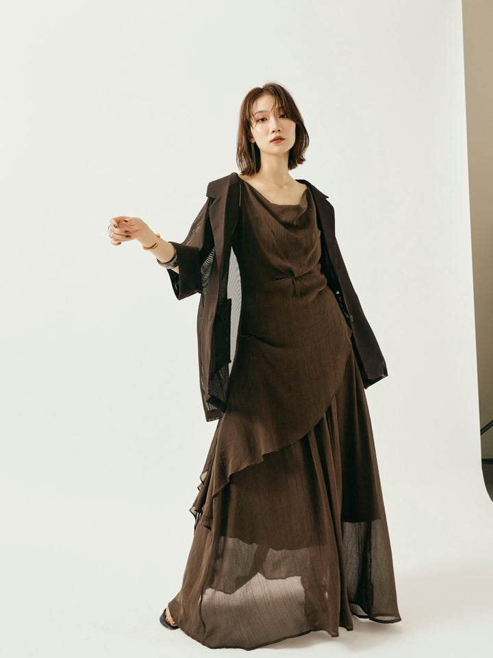 繊細なシアーワッシャー素材が魅力のセットアップ。 ふんわり揺れるラッフルデザインのキャミソールは、 アシンメトリーなシルエットで1枚でも存在感のある仕上がりに。 マキシ丈スカートは動きに合わせて優雅に広がり、 ナチュラルなニュアンスと大人のリラックスムードを演出します。 セットではもちろん、単品使いでも幅広く着まわせるアイテムです。 ※ボトムス、キャミソール(インナー)以外の商品は一律でインナーは付属していません。