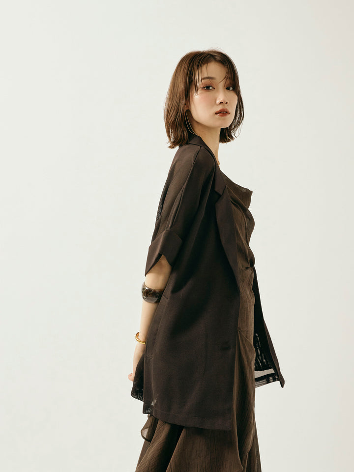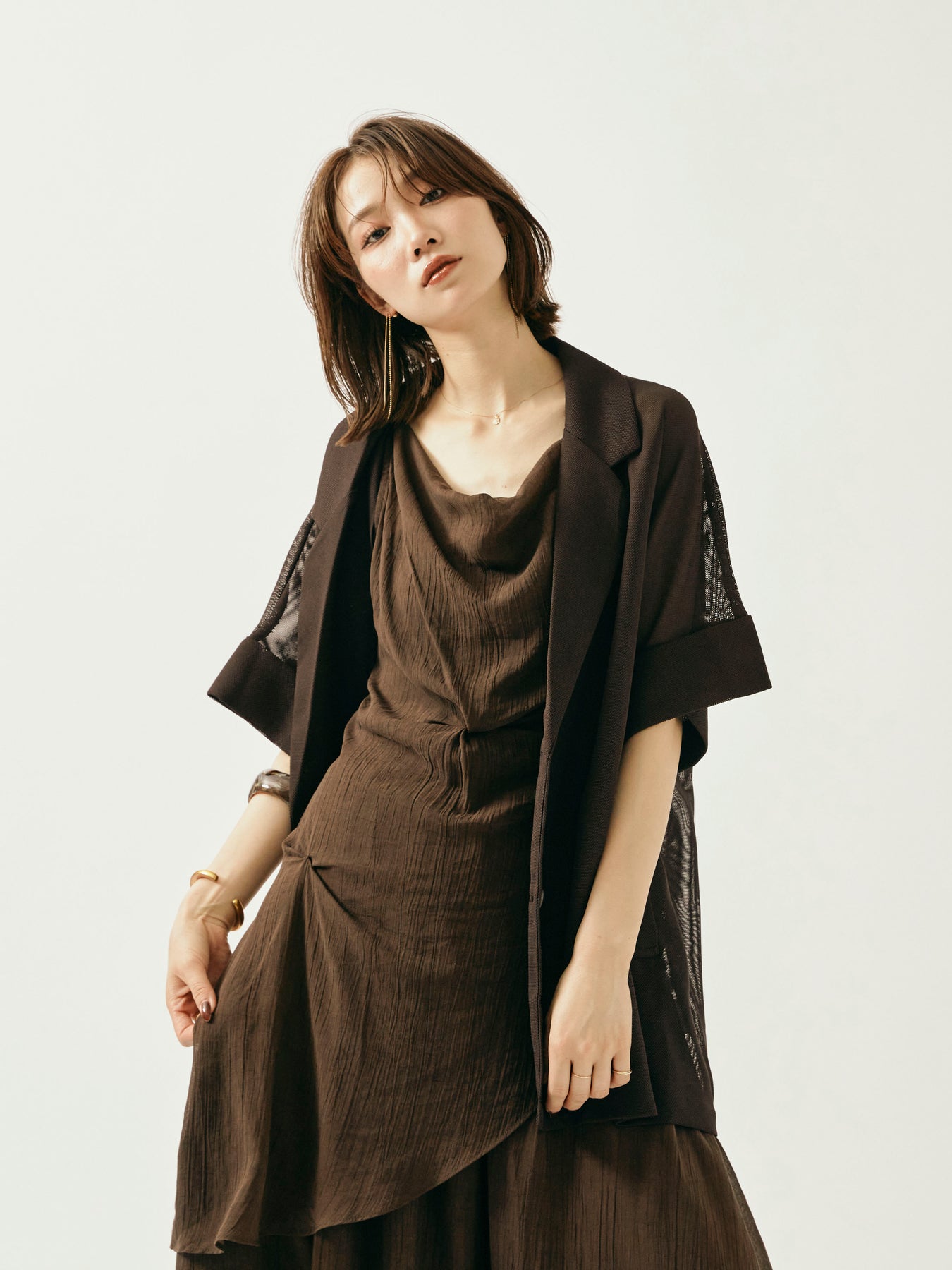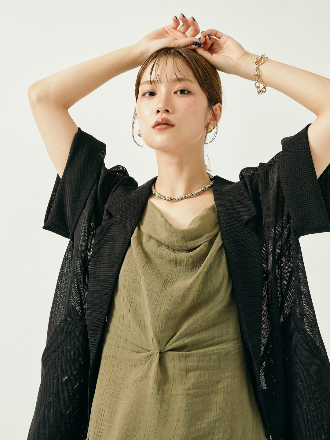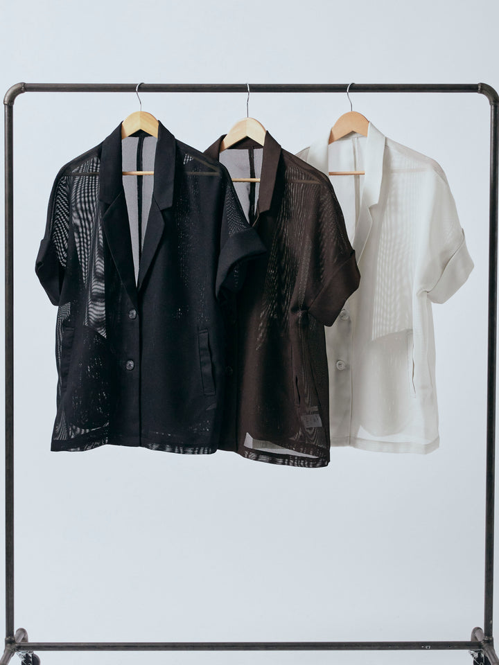 抜け感とクールさを兼ね備えた、メッシュ素材のテーラードジャケット。 ハーフスリーブ&シアーな透け感が、軽やかで夏らしい印象に仕上げてくれます。 テーラードのきちんと感がありながらも、リラクシーなシルエットでこなれ感を演出。 Tシャツやキャミソールとのレイヤードはもちろん、ワンピースの羽織としてもおすすめ。 さらっと羽織るだけで、旬のスタイリングが完成するアイテムです。 ※ボトムス、キャミソール(インナー)以外の商品は一律でインナーは付属していません。