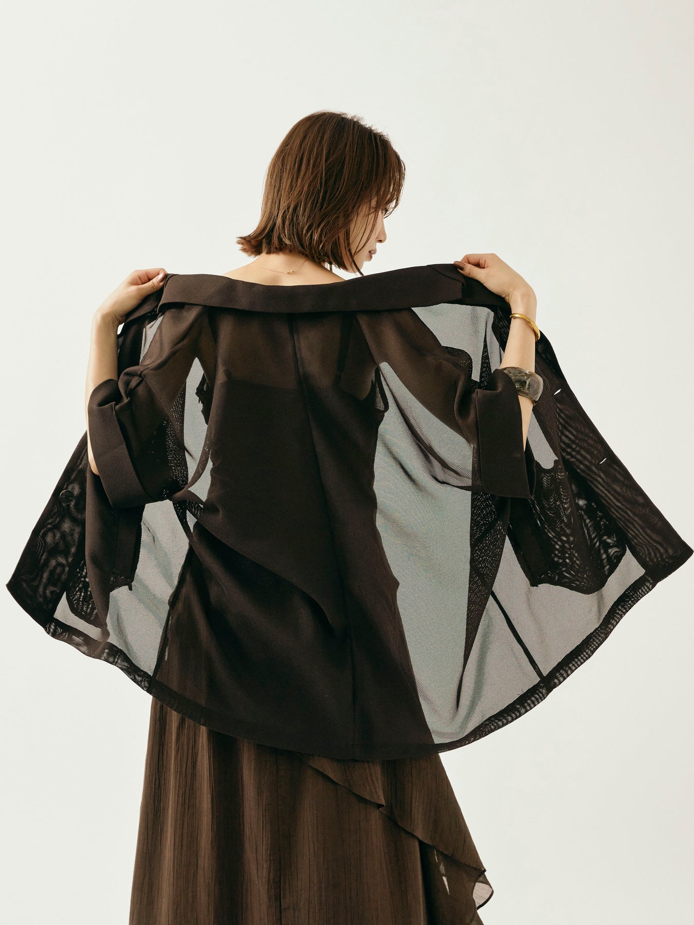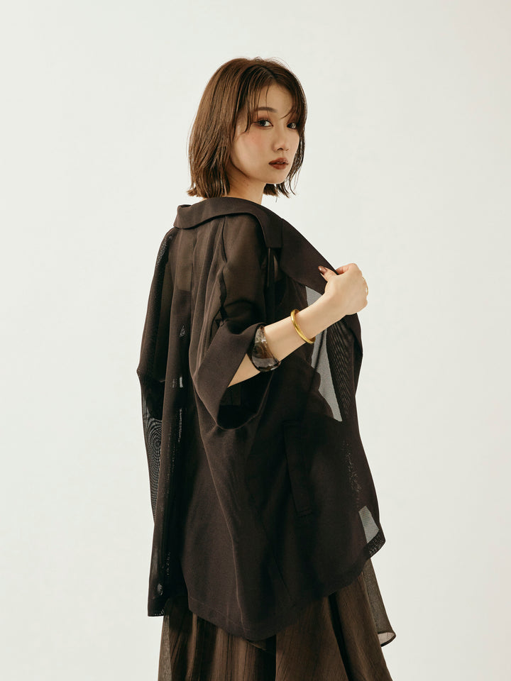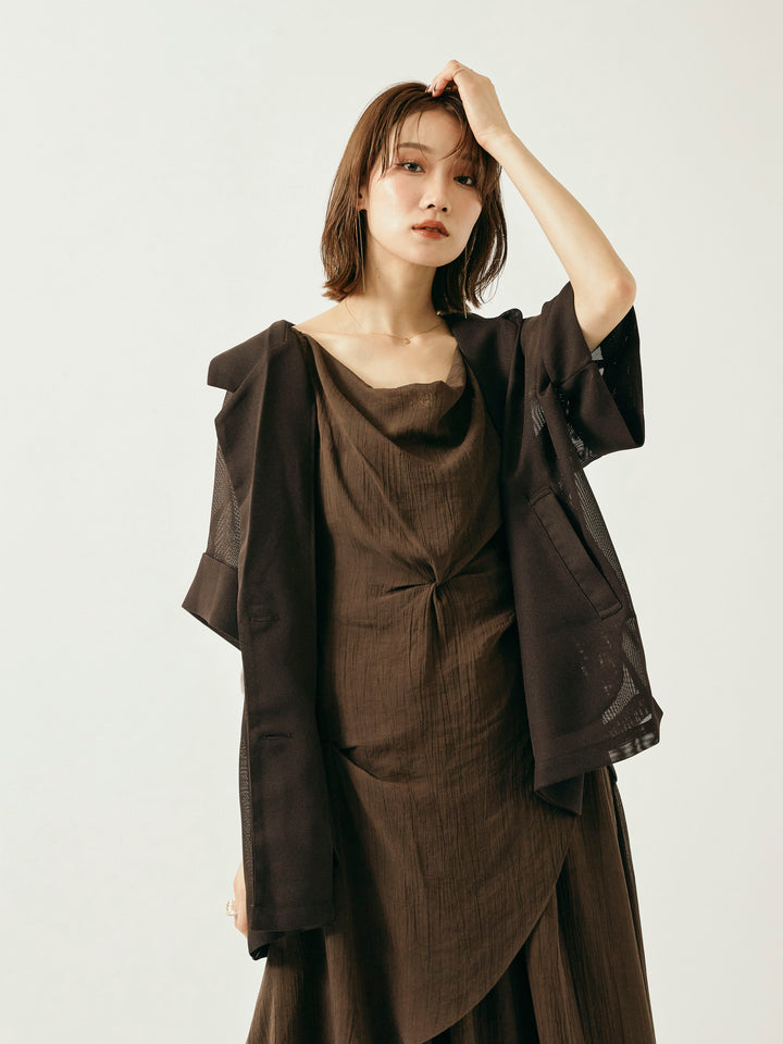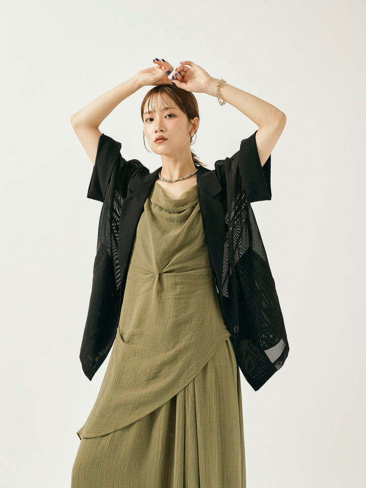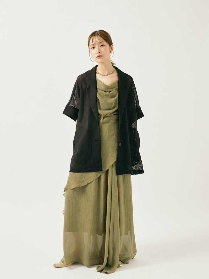 抜け感とクールさを兼ね備えた、メッシュ素材のテーラードジャケット。 ハーフスリーブ&シアーな透け感が、軽やかで夏らしい印象に仕上げてくれます。 テーラードのきちんと感がありながらも、リラクシーなシルエットでこなれ感を演出。 Tシャツやキャミソールとのレイヤードはもちろん、ワンピースの羽織としてもおすすめ。 さらっと羽織るだけで、旬のスタイリングが完成するアイテムです。 ※ボトムス、キャミソール(インナー)以外の商品は一律でインナーは付属していません。