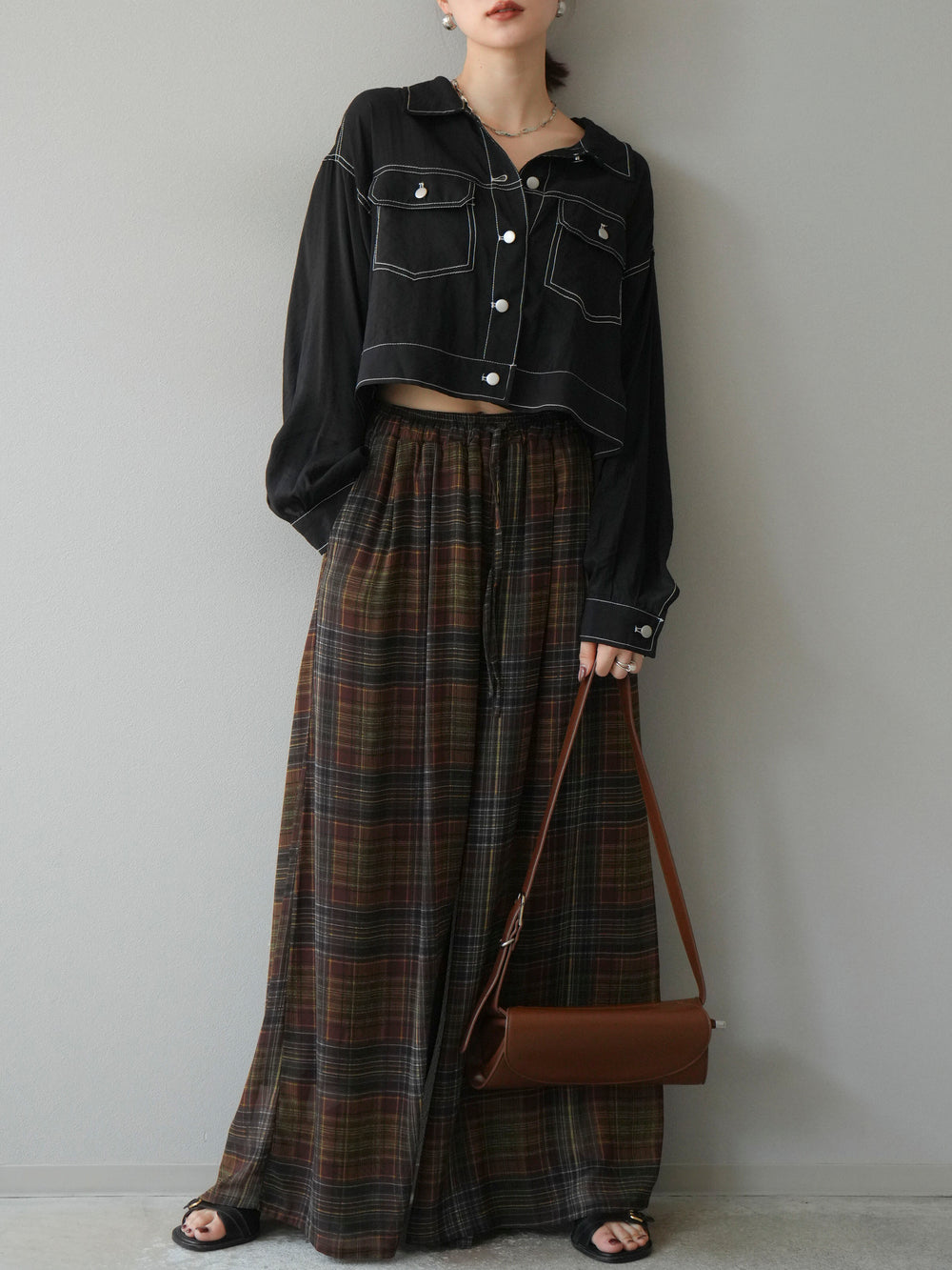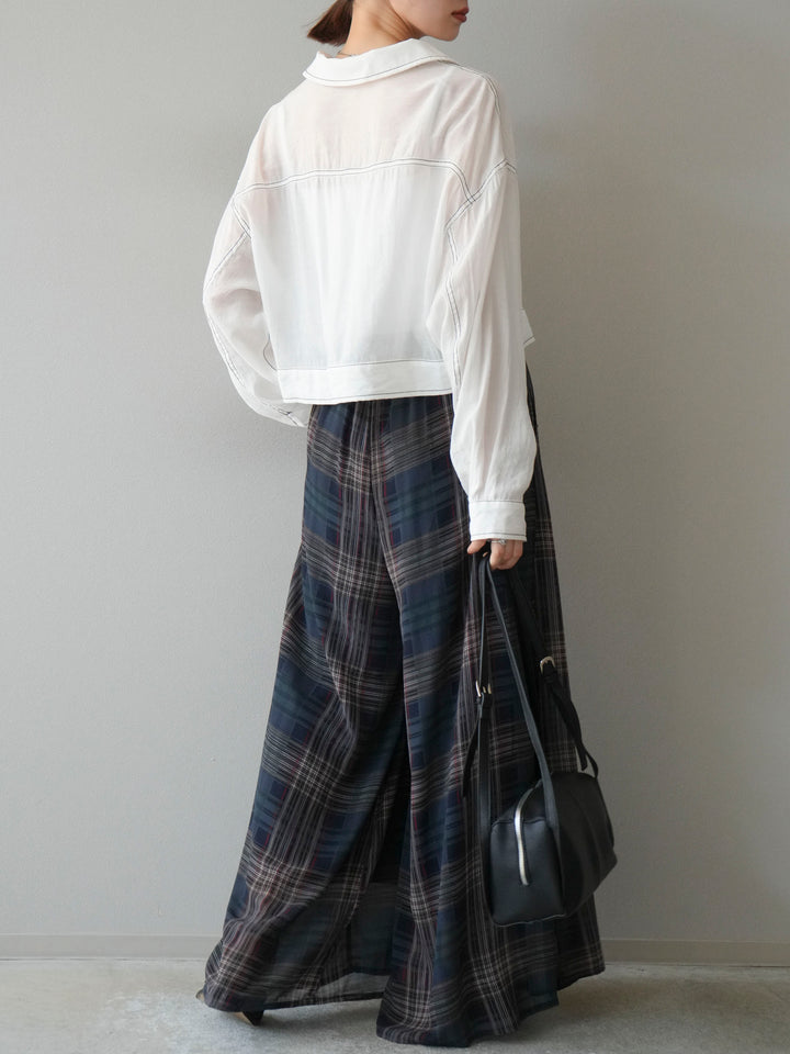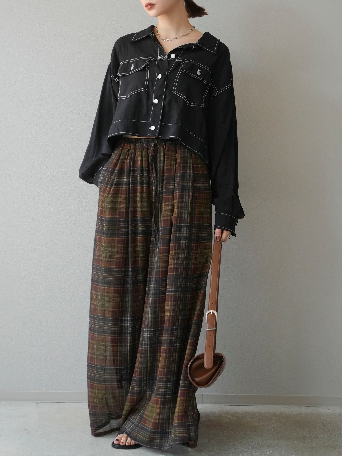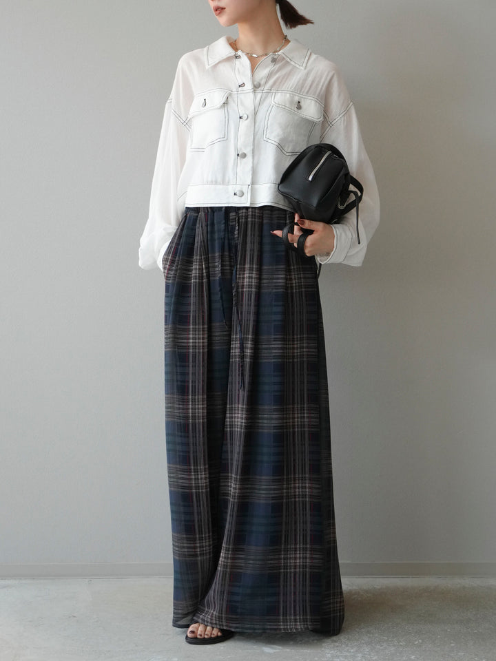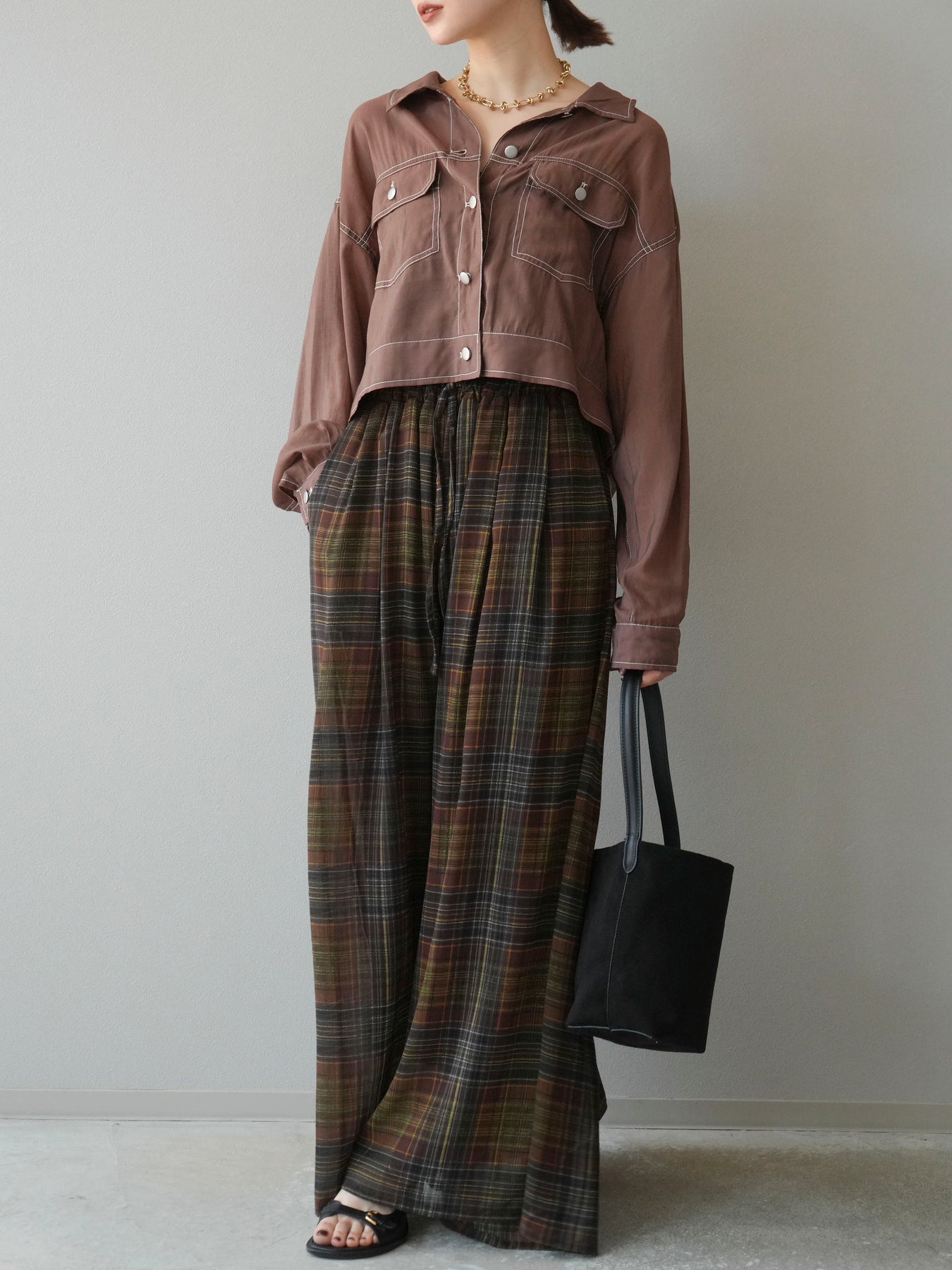 シーズンムード高まるシアー素材に、深みのある配色のチェック柄を施した大人カジュアルなバギーパンツ。程よい透け感が軽やかさと抜け感を演出し、リラックスしながらもスタイルアップが叶う1本です。 ウエストは総ゴム&ドローストリング仕様で、快適な穿き心地。たっぷりとした分量感と落ち感のある生地が、動きに合わせて美しく揺れます。 シンプルなトップスを合わせるだけで、スタイリングに表情を与える主役級アイテムです。