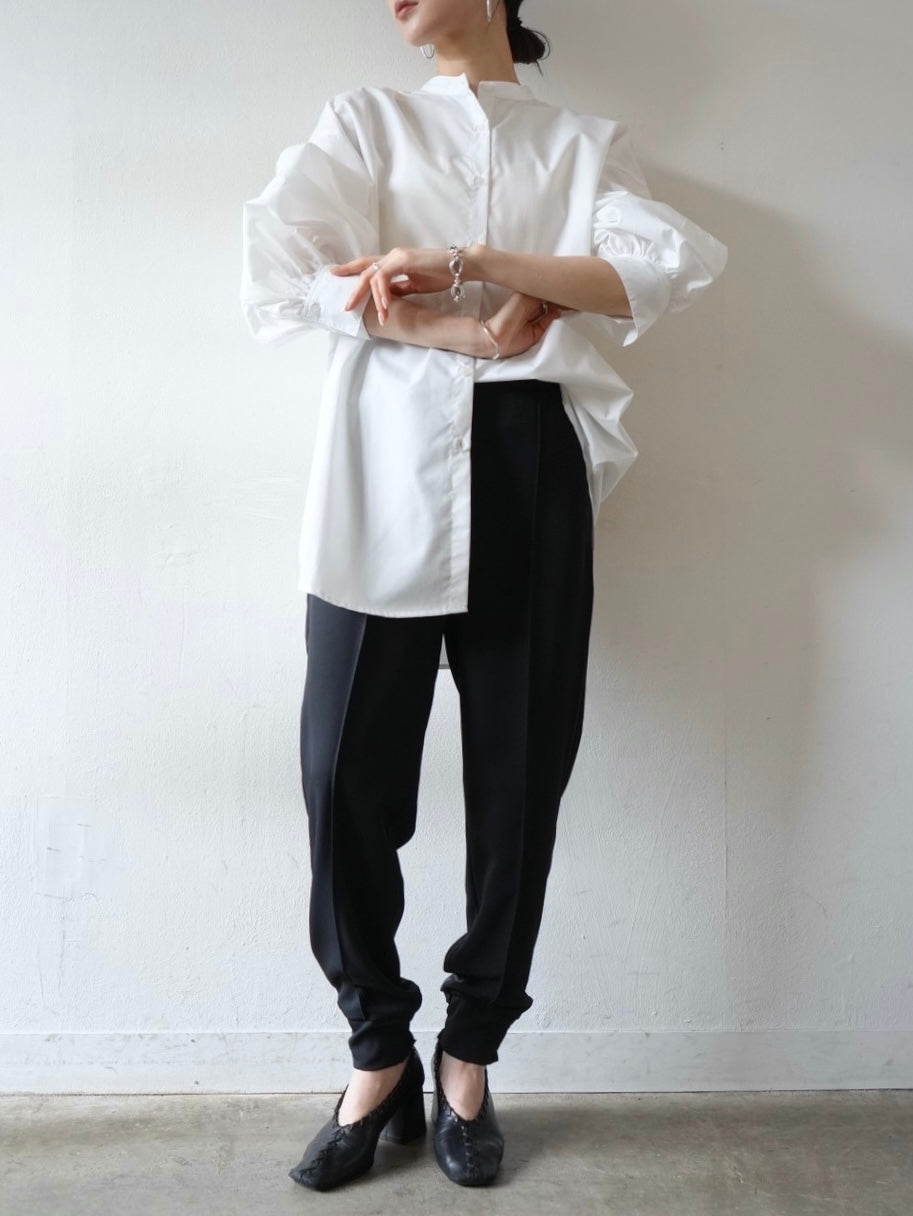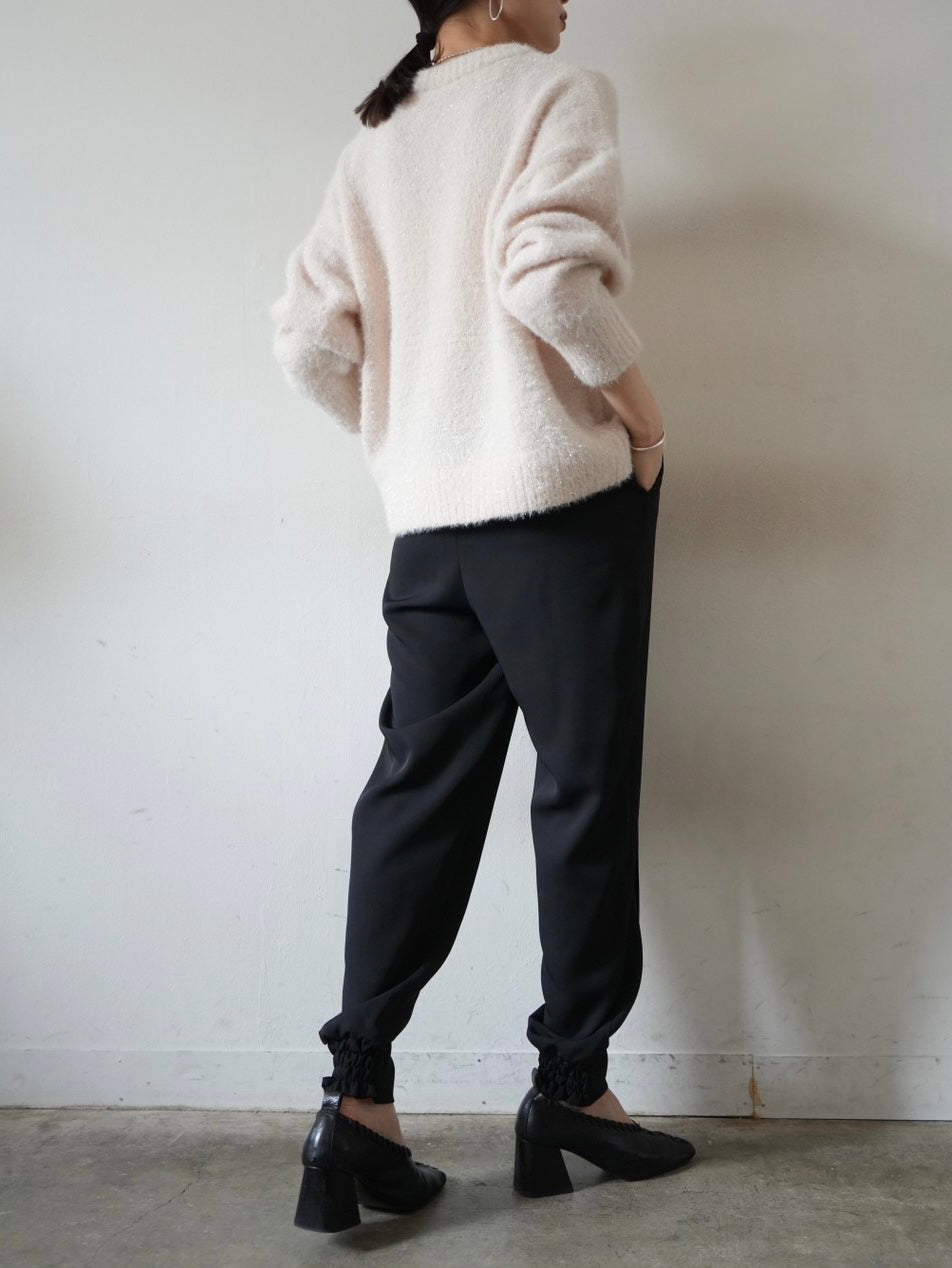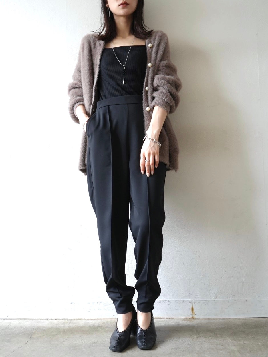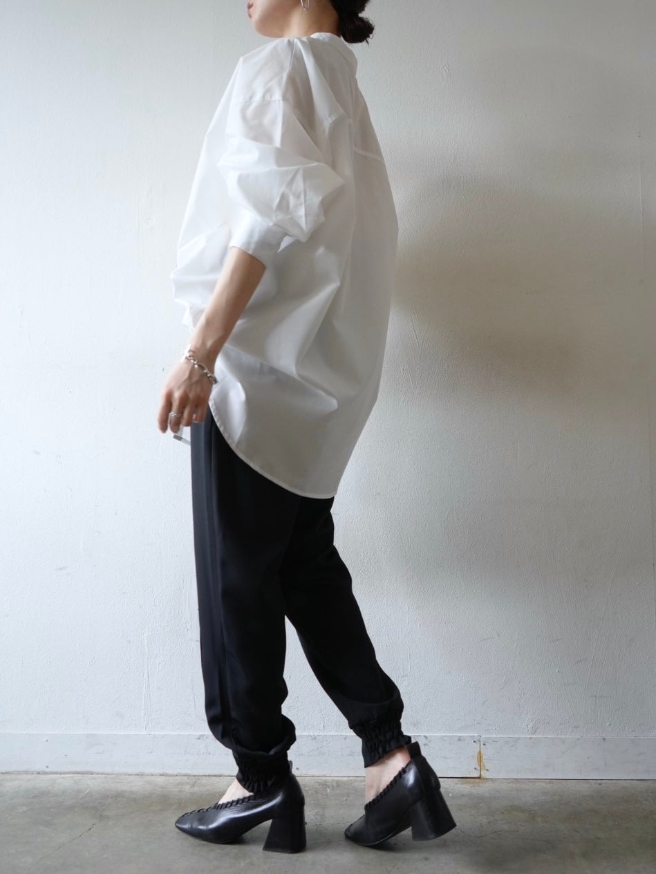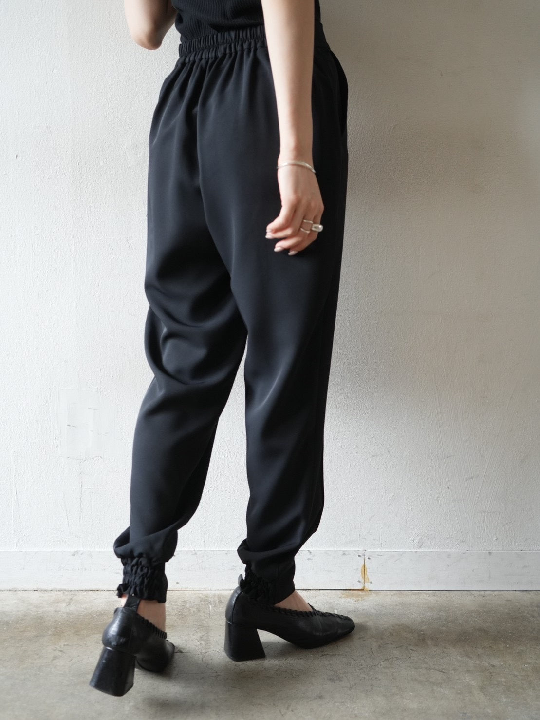 ゆとり加減が絶妙のジョガーパンツは、適度なハリ感と厚みのあるシワになりにくい素材感です。センターシーム入りで太もも部分、足のライン全体がスッキリと見えます。裾の後ろ側はシャーリングゴムを施したトレンド感のあるデザイン。ゆったりとしたヒップ周りに加え、ウエストはバックゴム仕様で動きやすく、エッジの効いたスタイリングを楽しめる1本です。