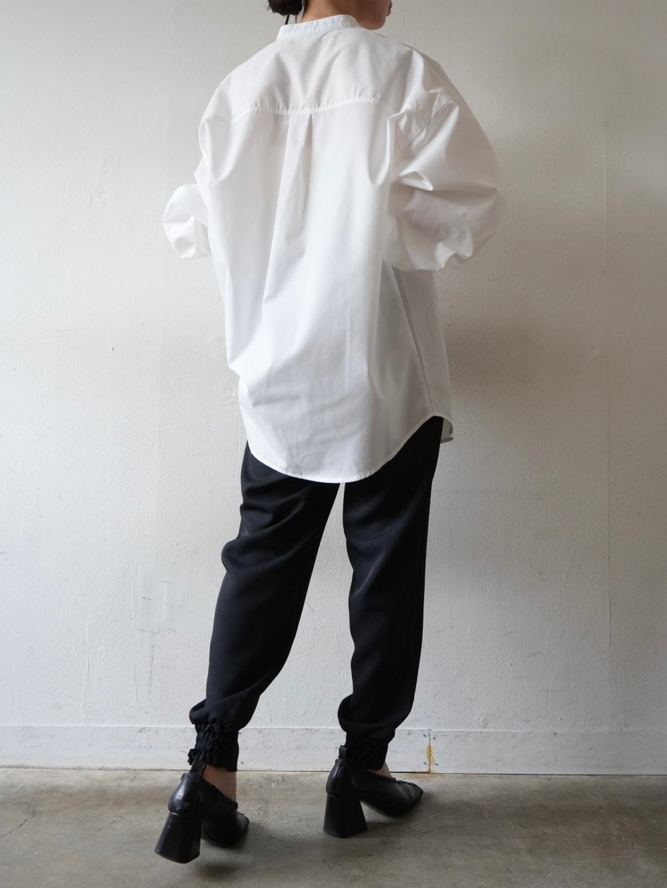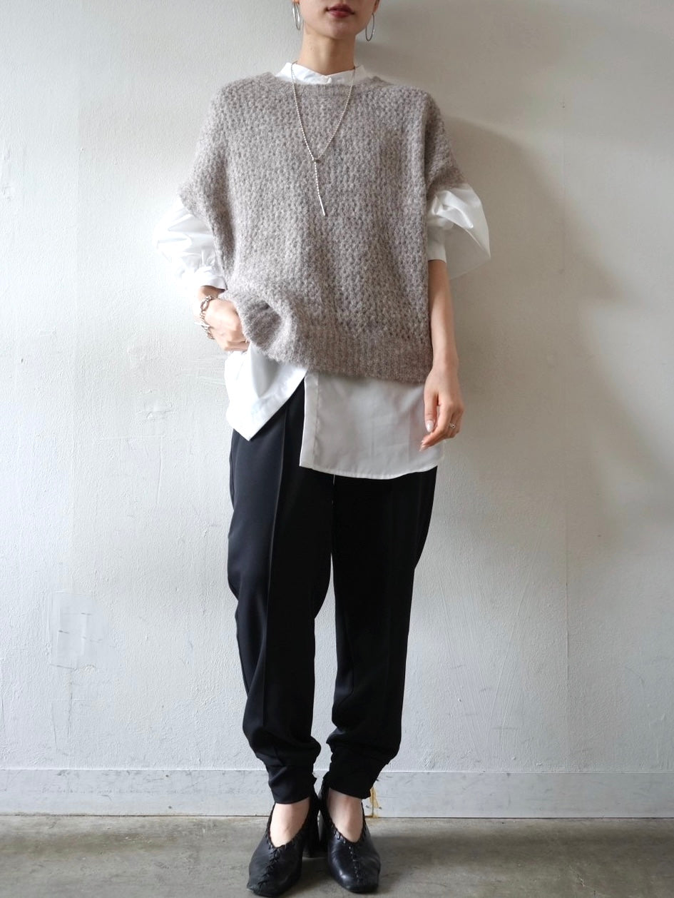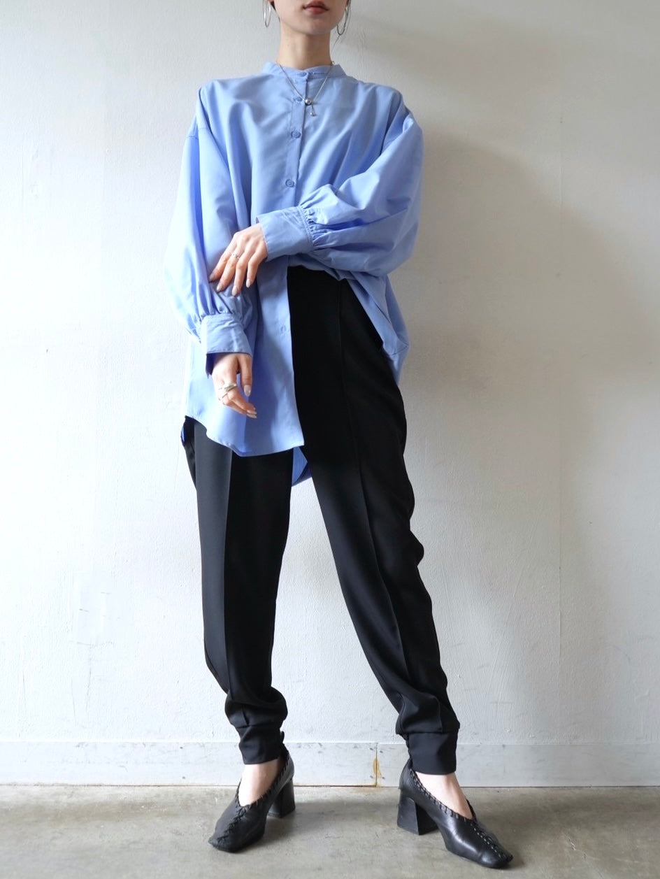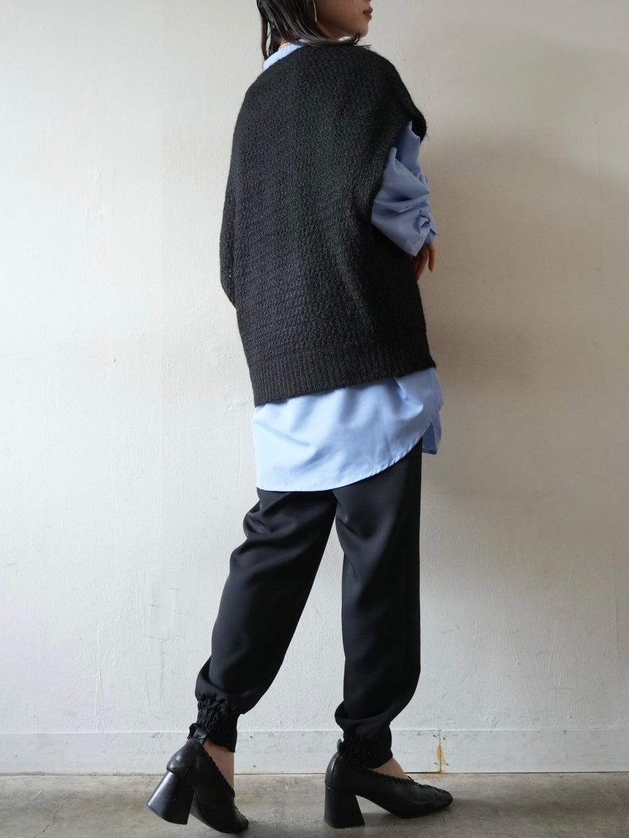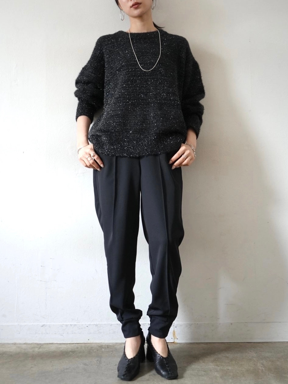 ゆとり加減が絶妙のジョガーパンツは、適度なハリ感と厚みのあるシワになりにくい素材感です。センターシーム入りで太もも部分、足のライン全体がスッキリと見えます。裾の後ろ側はシャーリングゴムを施したトレンド感のあるデザイン。ゆったりとしたヒップ周りに加え、ウエストはバックゴム仕様で動きやすく、エッジの効いたスタイリングを楽しめる1本です。