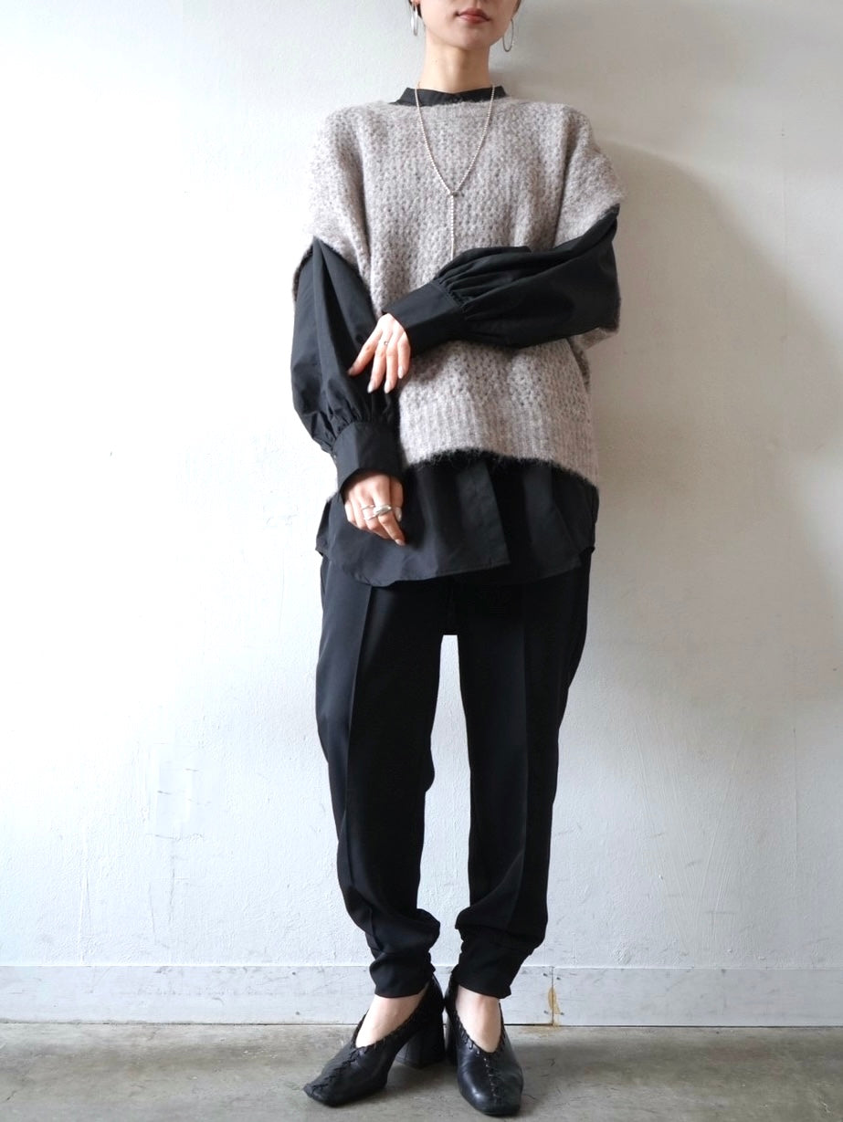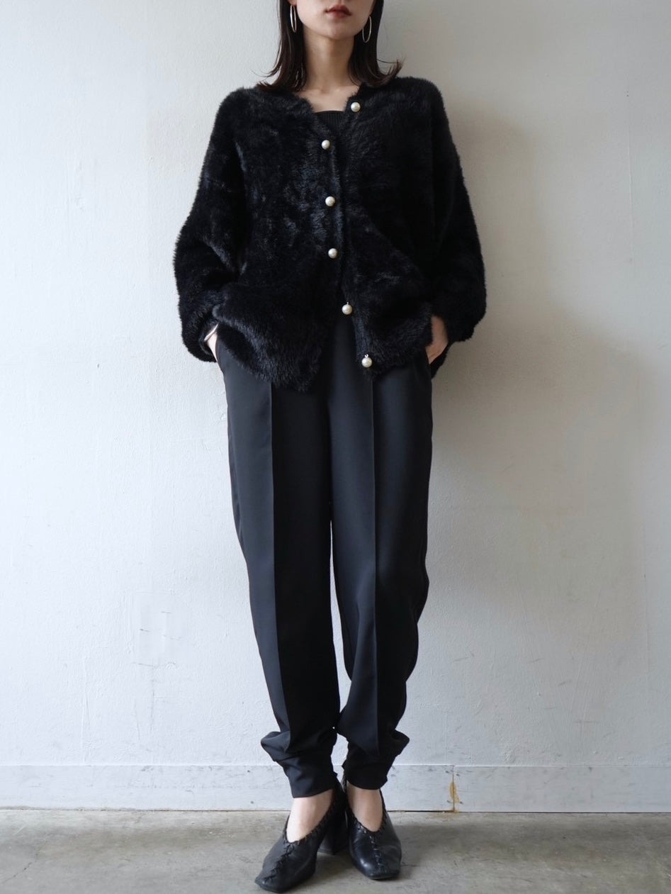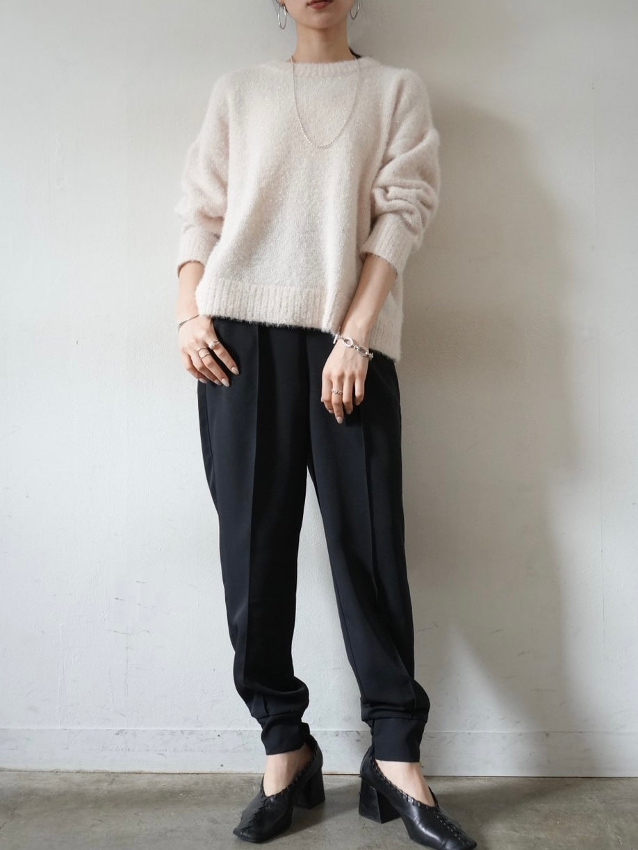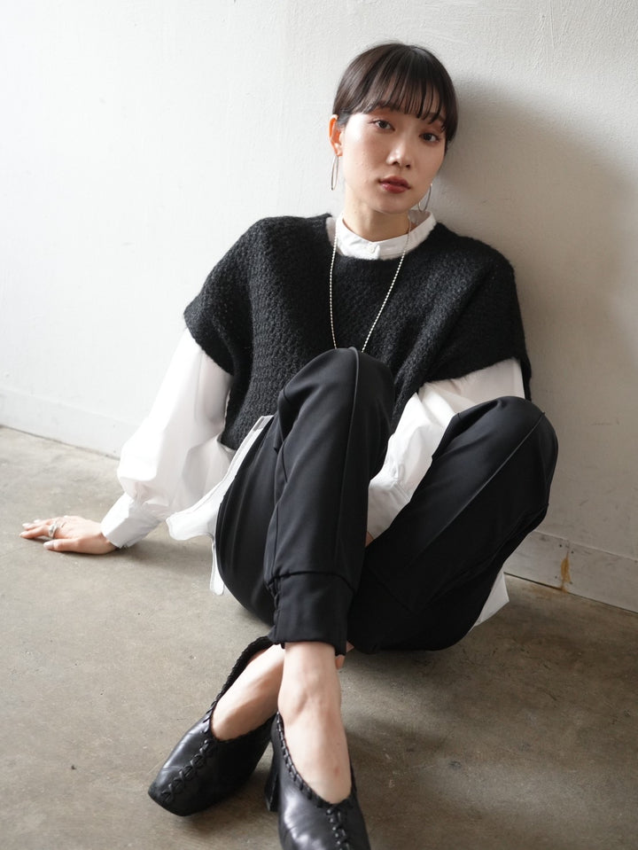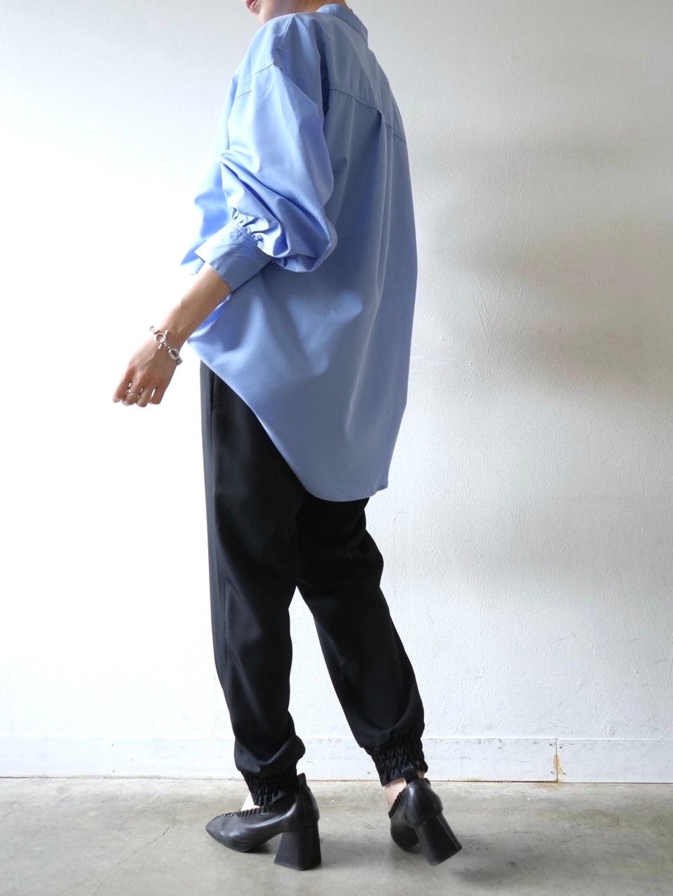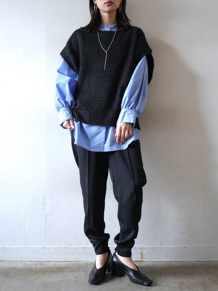ゆとり加減が絶妙のジョガーパンツは、適度なハリ感と厚みのあるシワになりにくい素材感です。センターシーム入りで太もも部分、足のライン全体がスッキリと見えます。裾の後ろ側はシャーリングゴムを施したトレンド感のあるデザイン。ゆったりとしたヒップ周りに加え、ウエストはバックゴム仕様で動きやすく、エッジの効いたスタイリングを楽しめる1本です。