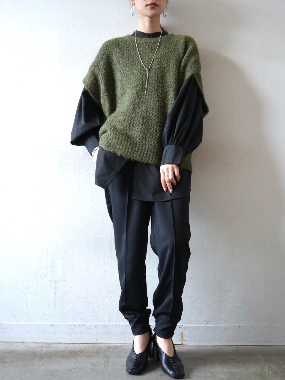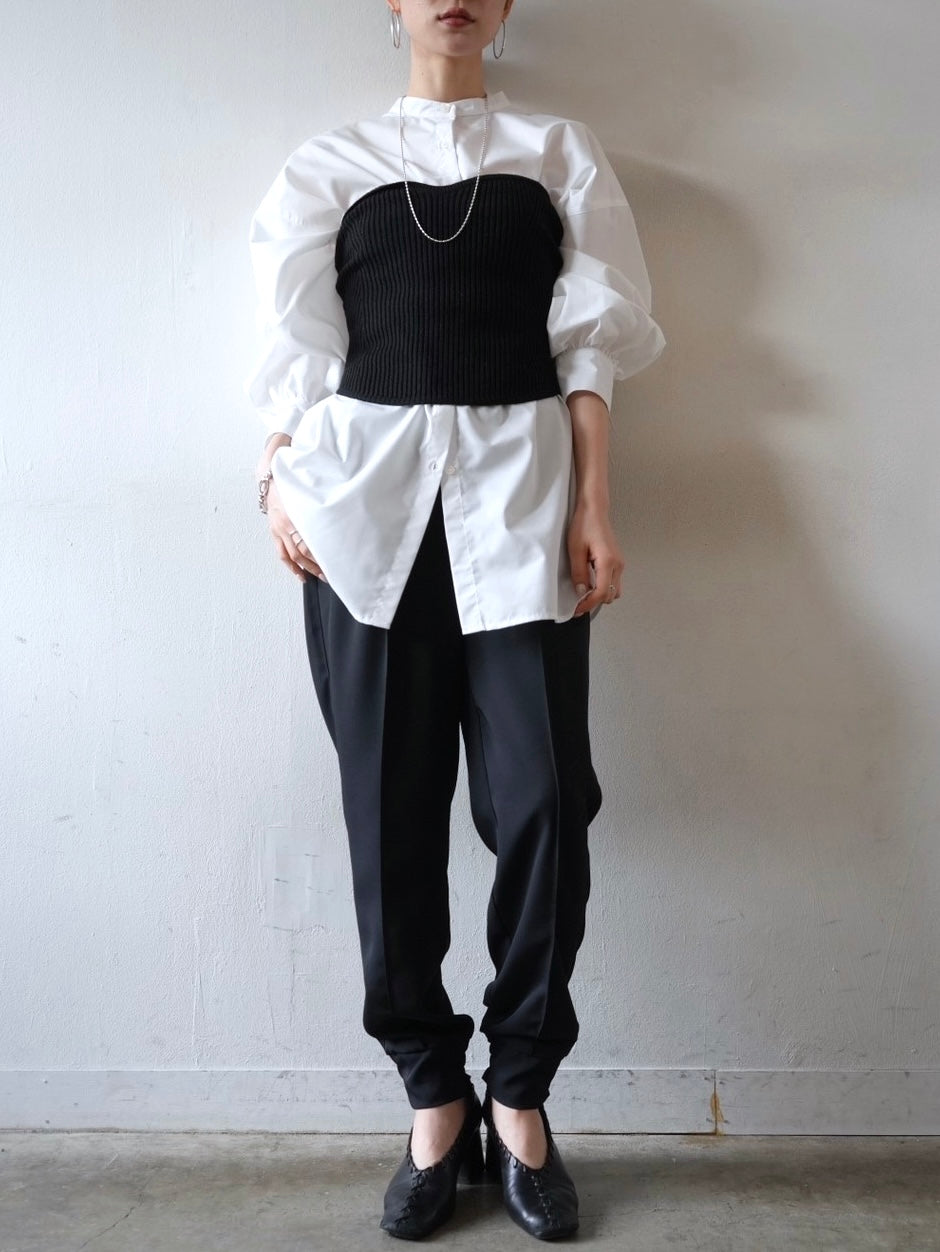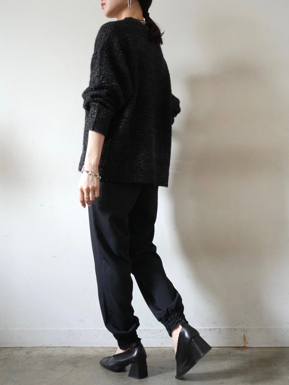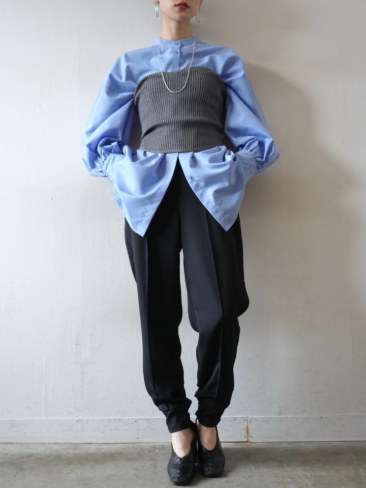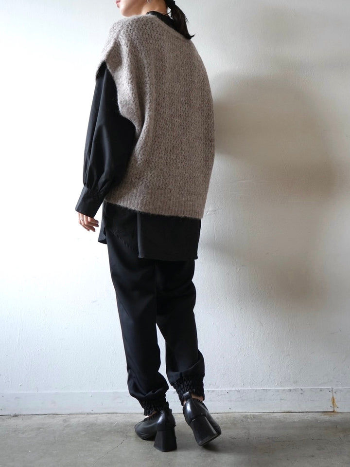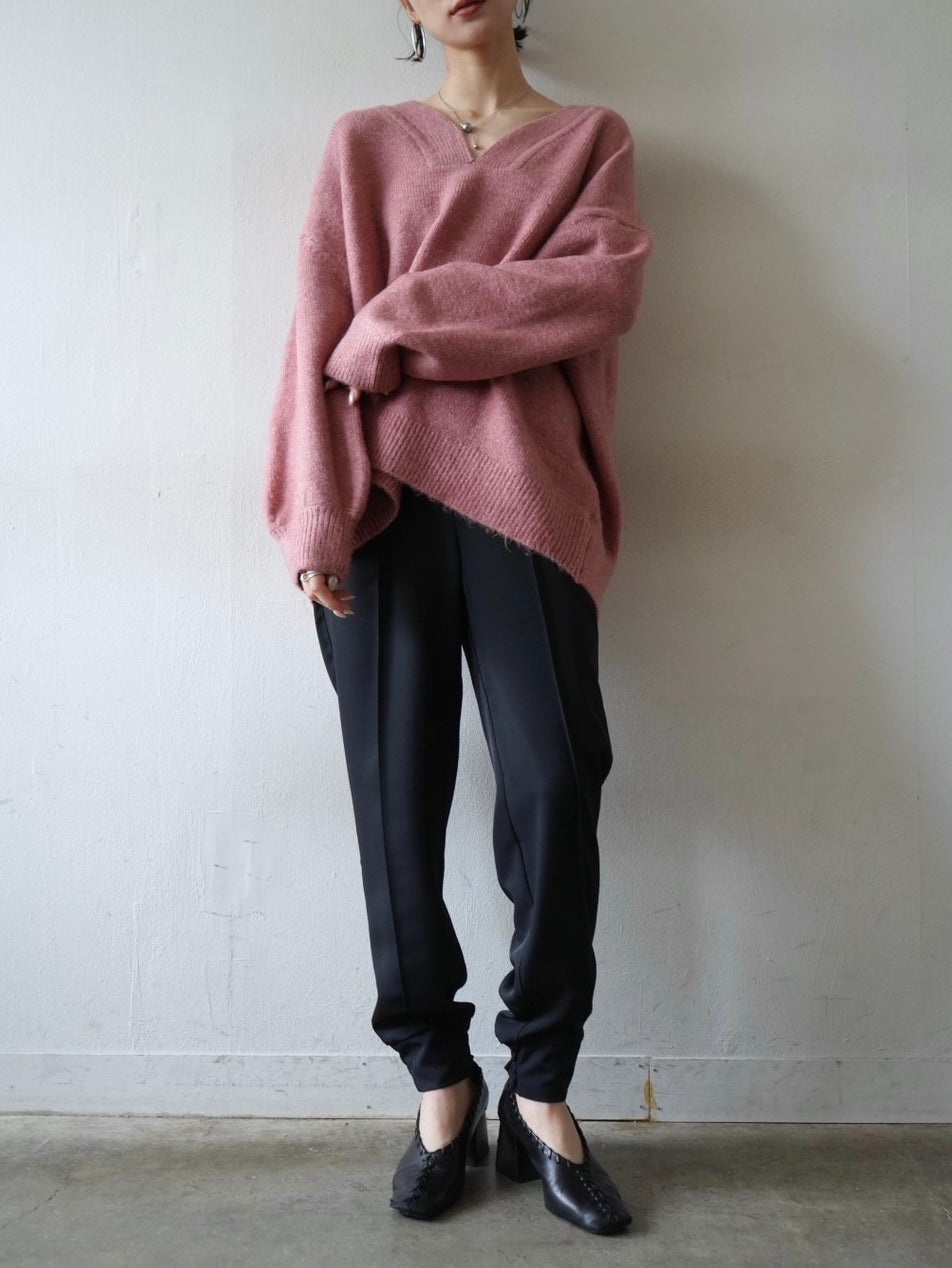 ゆとり加減が絶妙のジョガーパンツは、適度なハリ感と厚みのあるシワになりにくい素材感です。センターシーム入りで太もも部分、足のライン全体がスッキリと見えます。裾の後ろ側はシャーリングゴムを施したトレンド感のあるデザイン。ゆったりとしたヒップ周りに加え、ウエストはバックゴム仕様で動きやすく、エッジの効いたスタイリングを楽しめる1本です。