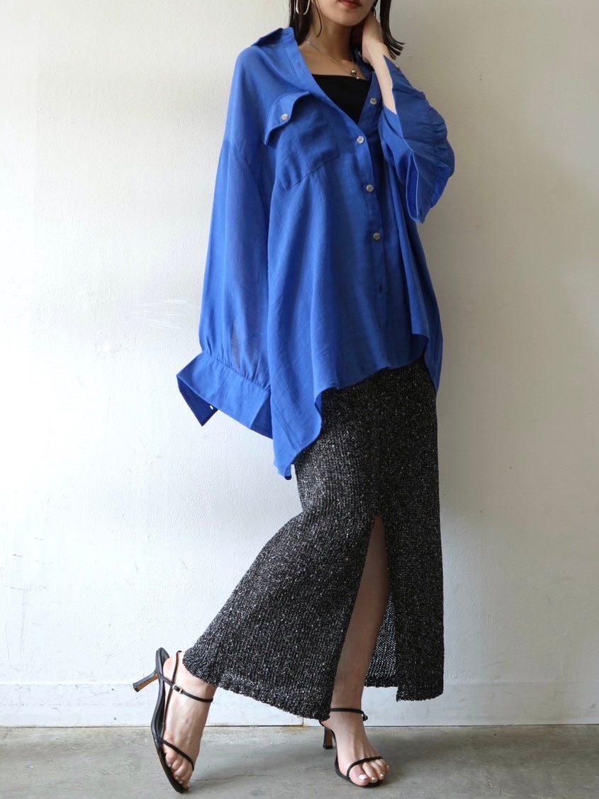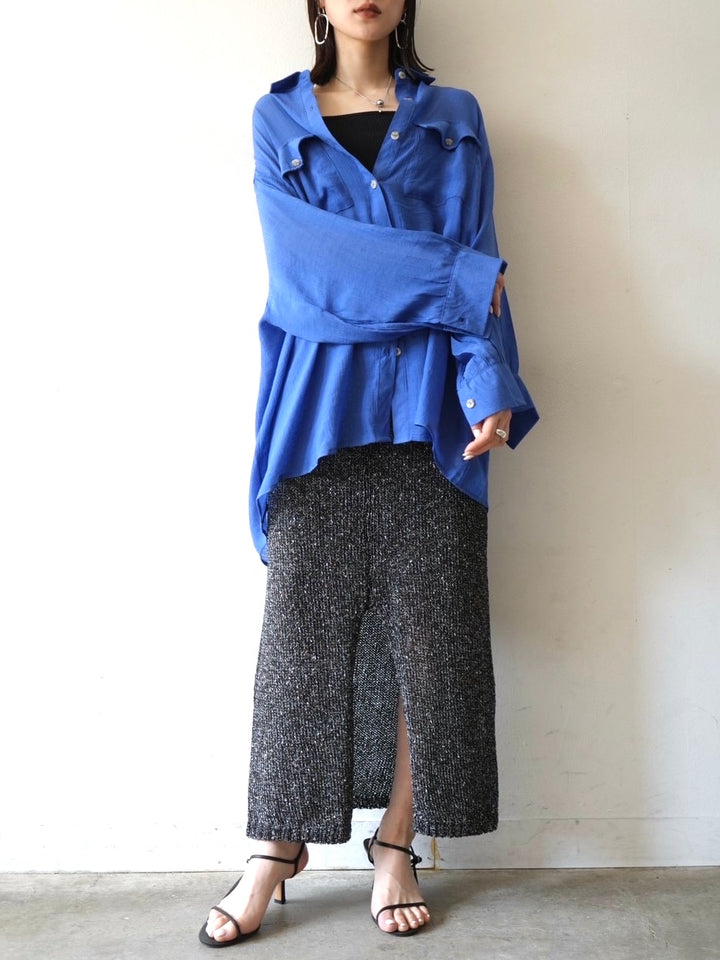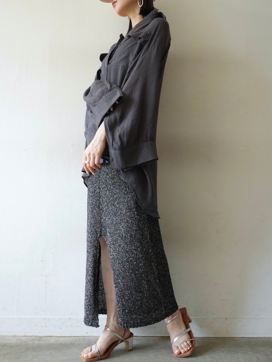 ネップがナチュラル感を高めるリネンタッチ素材のニットスカートは、穿くだけで女性らしさがアップするタイトシルエットで、深く開いたセンタースリットが覗く足をきれいに見せてくれます。伸縮性があるので動きやすく、前と後ろを逆にしてバックスリットで穿くなど、その日の気分やコーデに合わせて楽しめます。同素材のニットとのセットアップコーデもおすすめです。