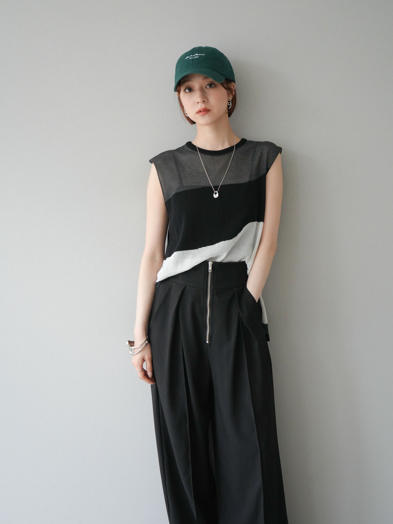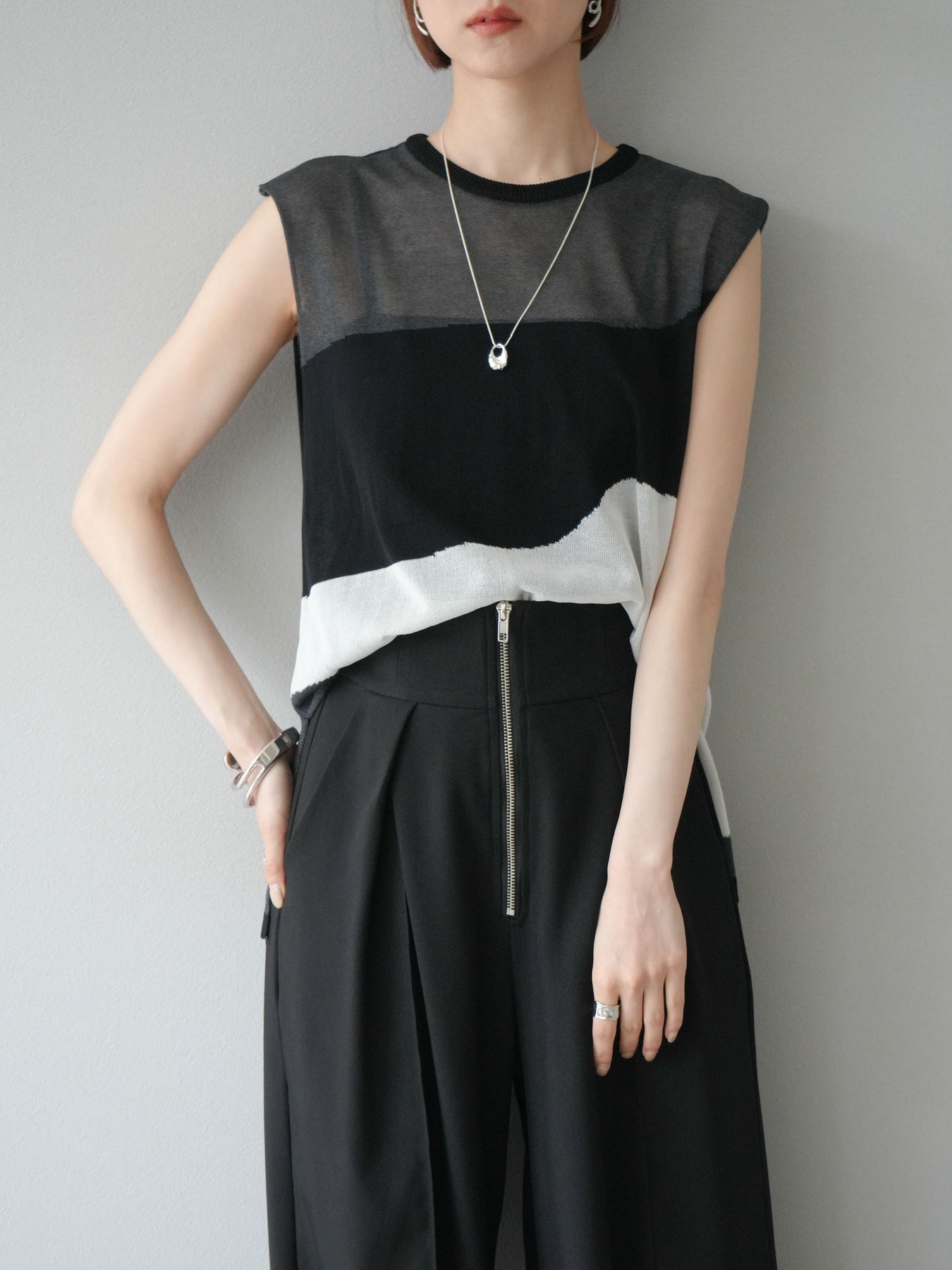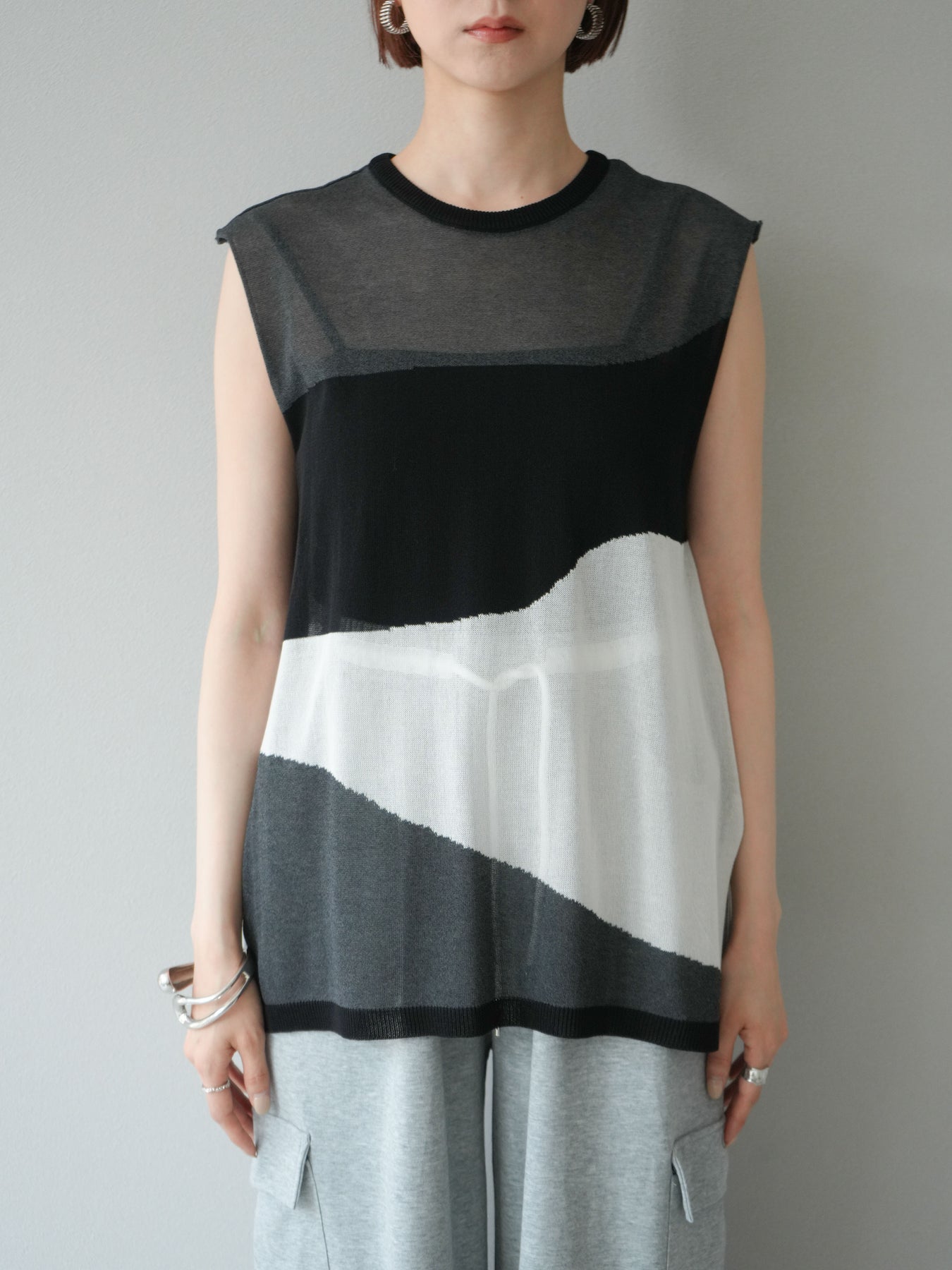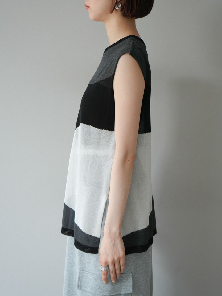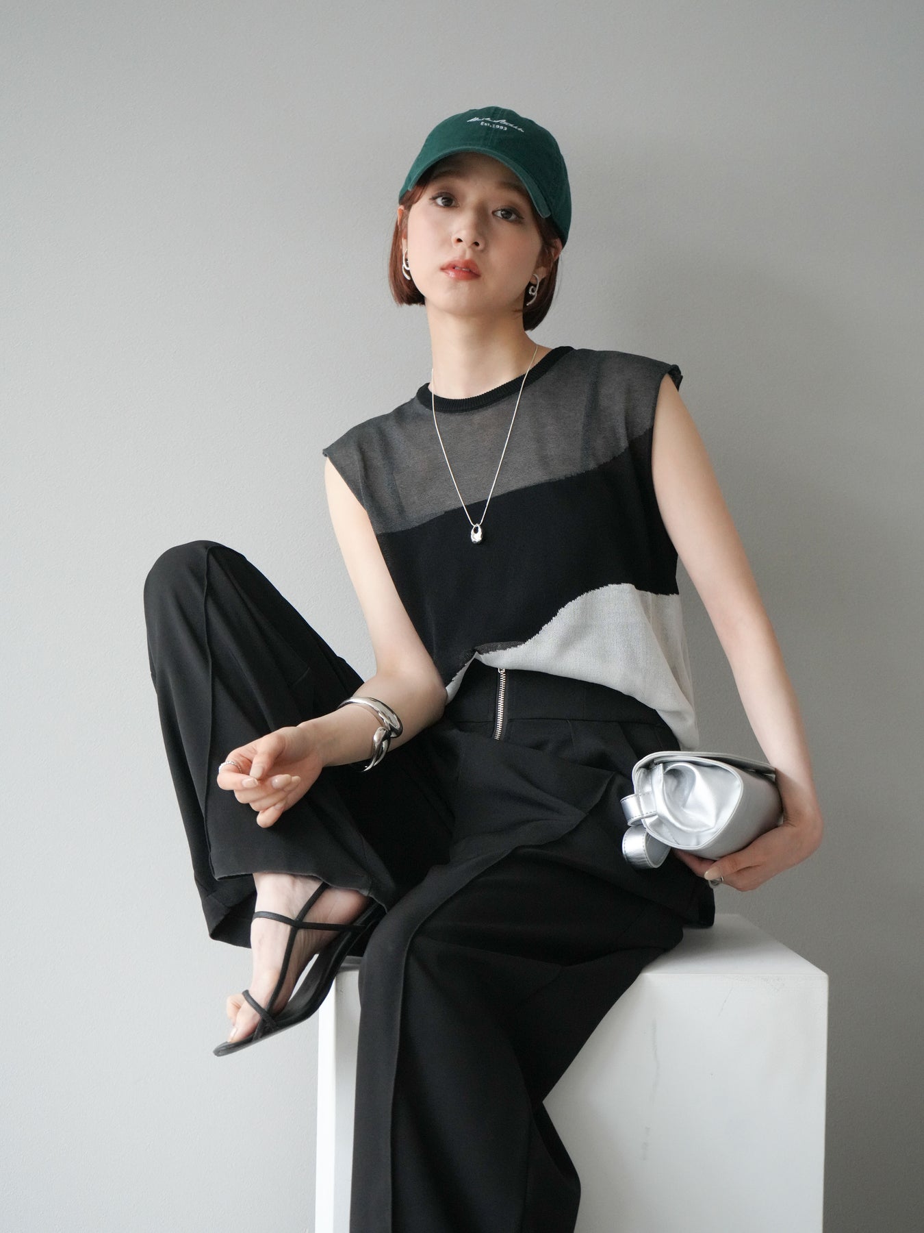 透け感のあるシアーニットと大胆なバイカラーデザインが目を惹く、ノースリーブプルオーバー。柔らかく落ち感のある素材で、身体のラインを拾いすぎず、すっきりとしたシルエットを演出します。裾にかけてやや広がるフレア感が、動きのある軽やかな印象に。インナーにタンクトップやキャミソールを合わせてレイヤードスタイルを楽しむのがおすすめ。モード感のあるデザインながらも、シンプルなボトムスと合わせるだけでスタイリングが完成する主役級トップスです。 ※ボトムス、キャミソール(インナー)以外の商品は一律でインナーは付属していません。