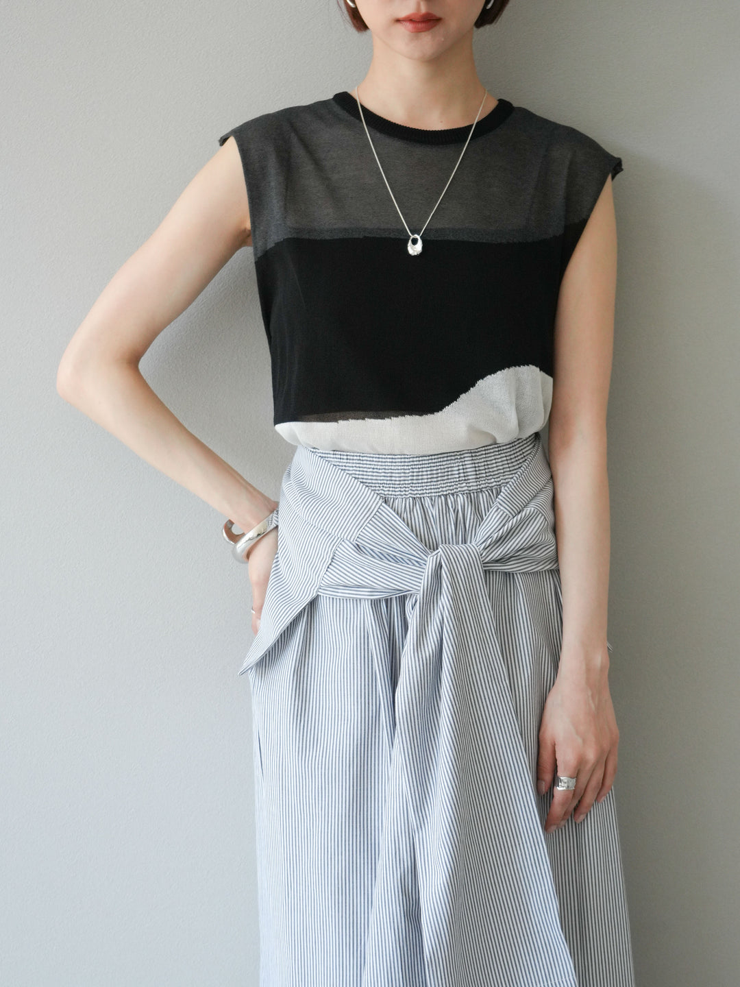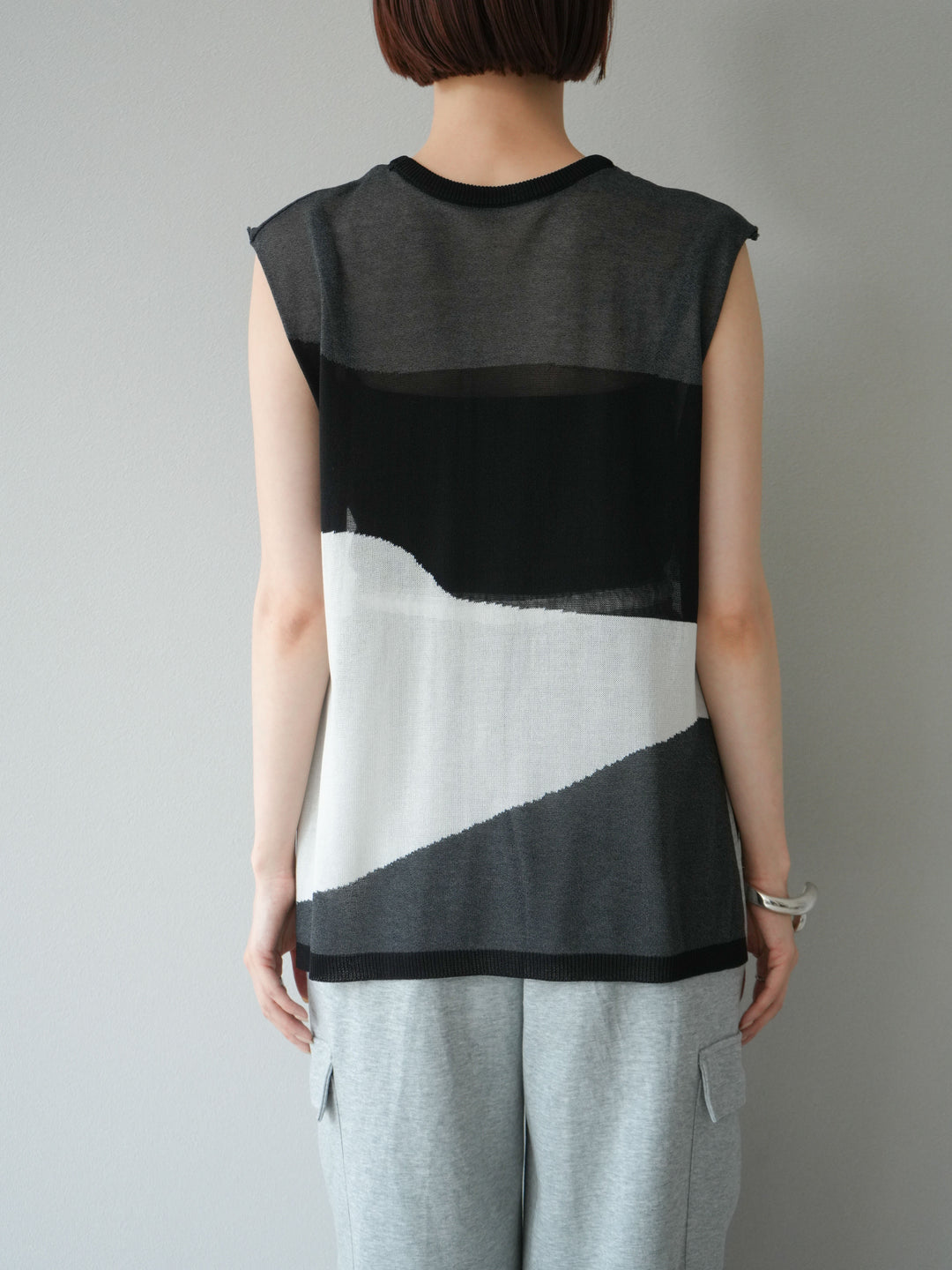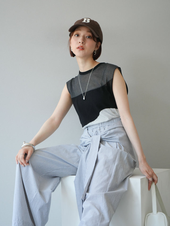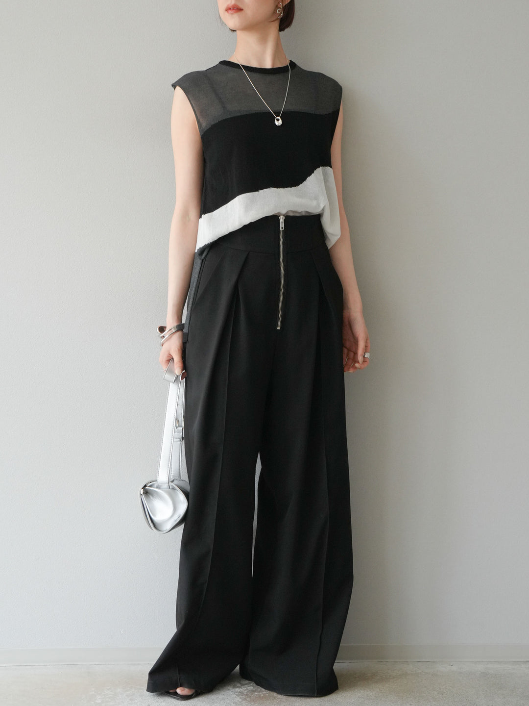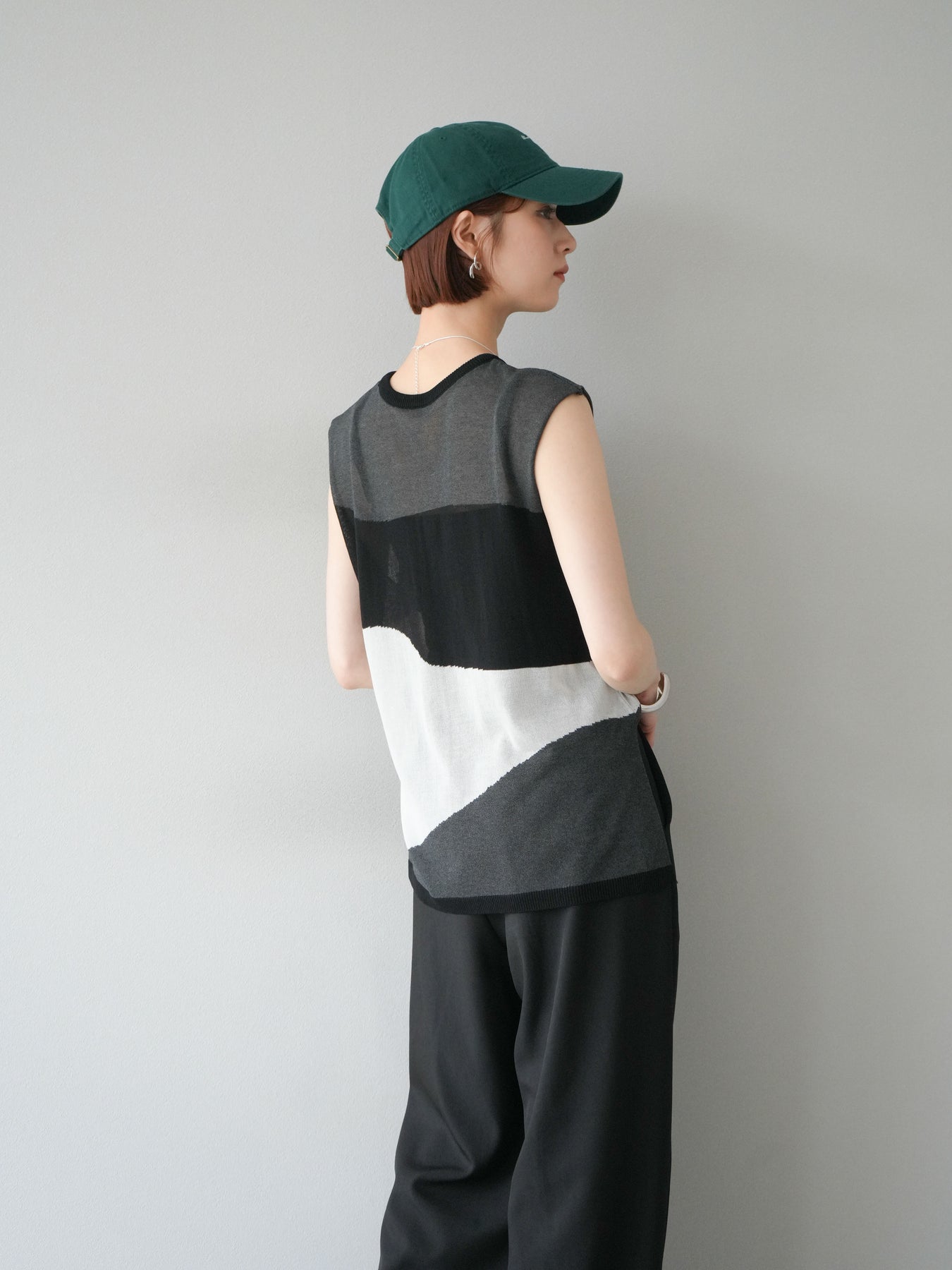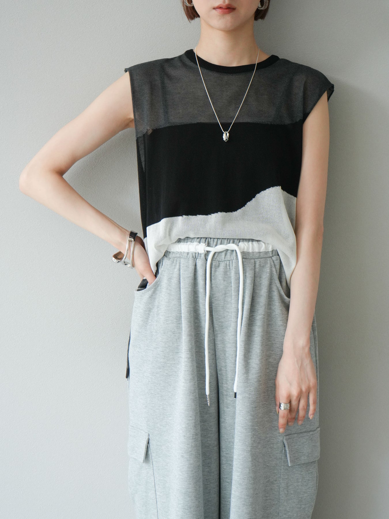 透け感のあるシアーニットと大胆なバイカラーデザインが目を惹く、ノースリーブプルオーバー。柔らかく落ち感のある素材で、身体のラインを拾いすぎず、すっきりとしたシルエットを演出します。裾にかけてやや広がるフレア感が、動きのある軽やかな印象に。インナーにタンクトップやキャミソールを合わせてレイヤードスタイルを楽しむのがおすすめ。モード感のあるデザインながらも、シンプルなボトムスと合わせるだけでスタイリングが完成する主役級トップスです。 ※ボトムス、キャミソール(インナー)以外の商品は一律でインナーは付属していません。