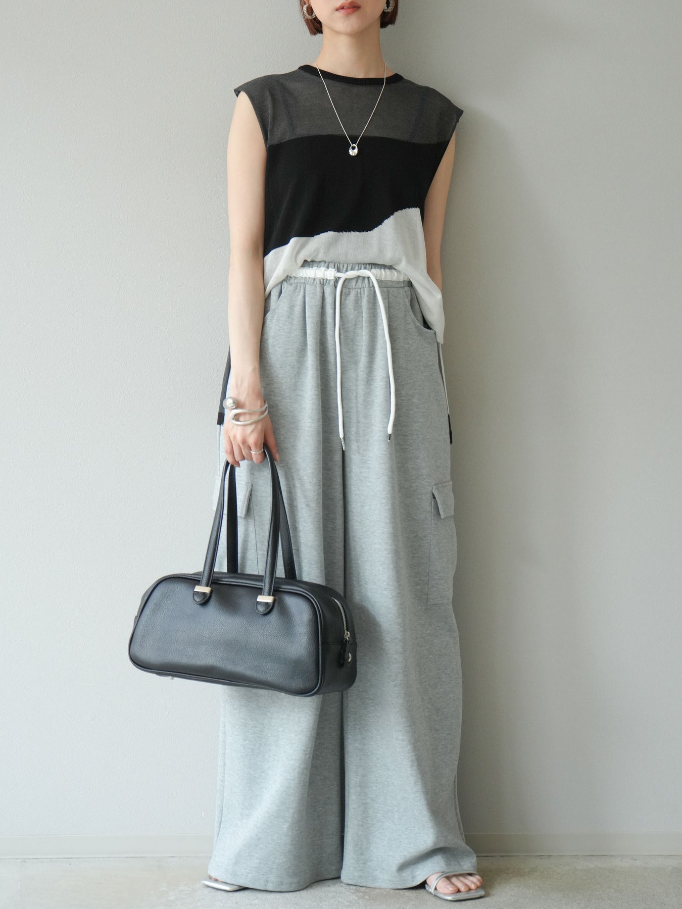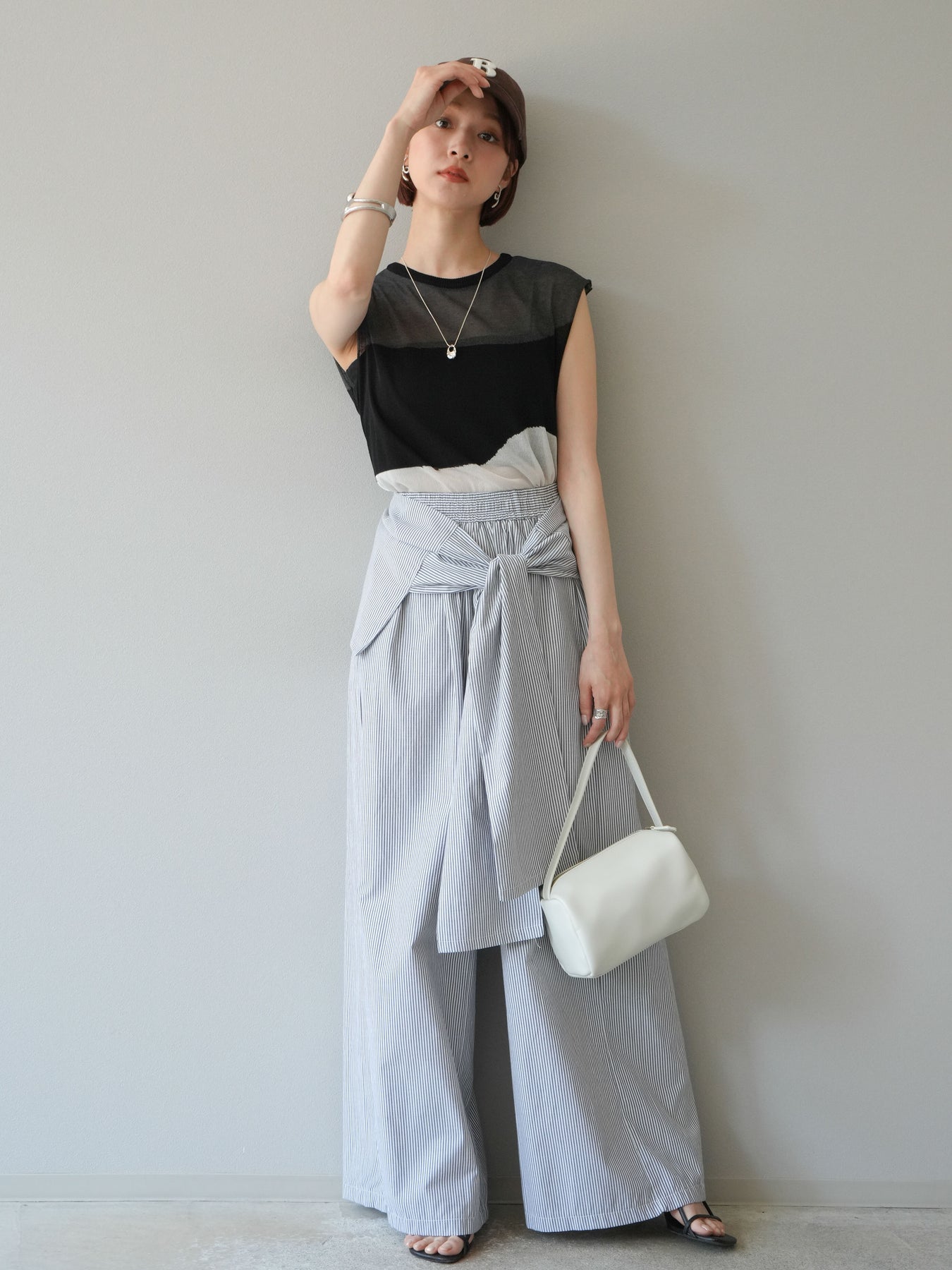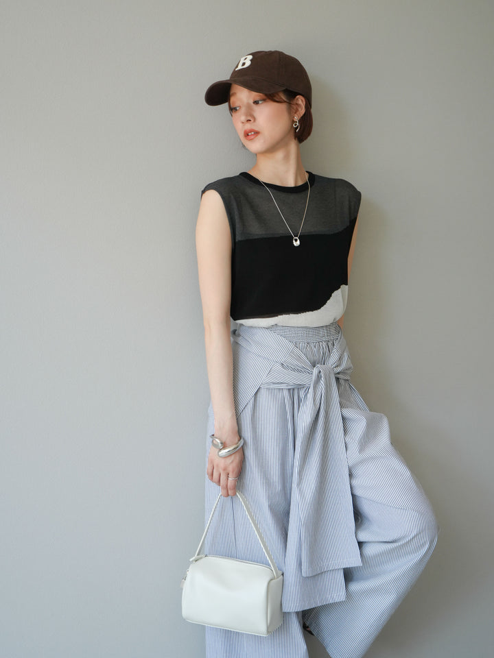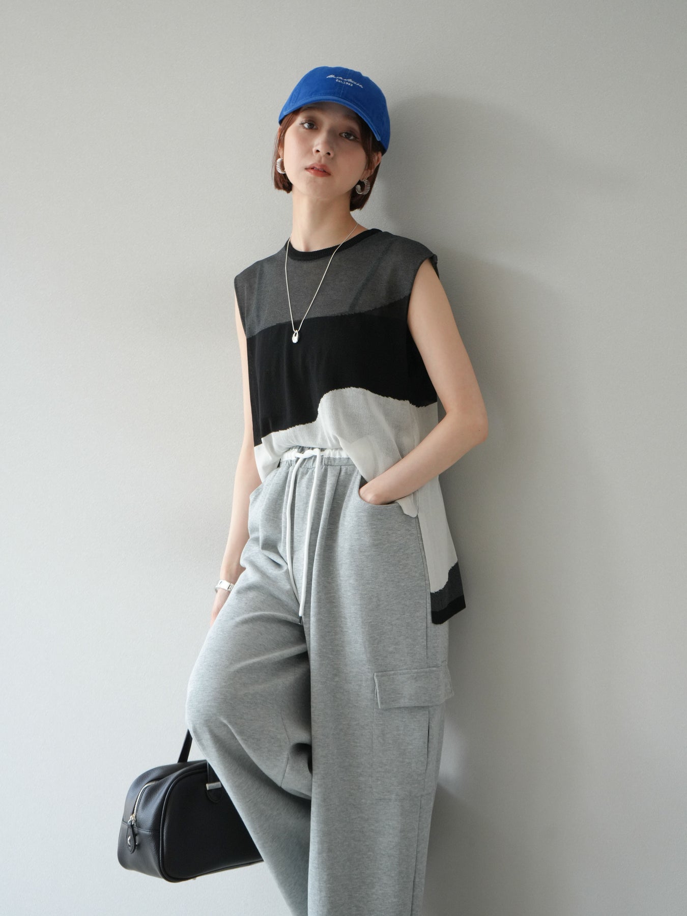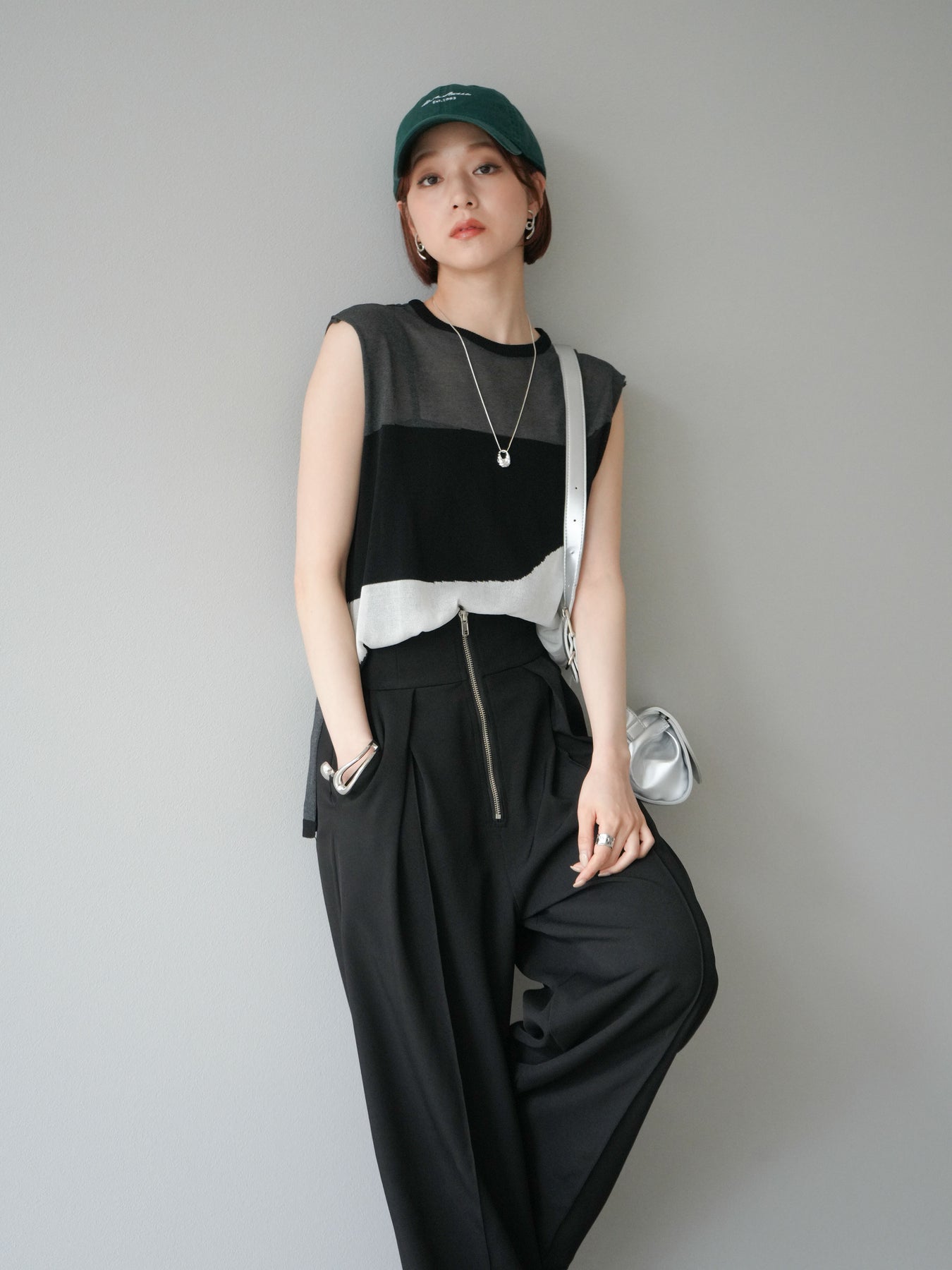 透け感のあるシアーニットと大胆なバイカラーデザインが目を惹く、ノースリーブプルオーバー。柔らかく落ち感のある素材で、身体のラインを拾いすぎず、すっきりとしたシルエットを演出します。裾にかけてやや広がるフレア感が、動きのある軽やかな印象に。インナーにタンクトップやキャミソールを合わせてレイヤードスタイルを楽しむのがおすすめ。モード感のあるデザインながらも、シンプルなボトムスと合わせるだけでスタイリングが完成する主役級トップスです。 ※ボトムス、キャミソール(インナー)以外の商品は一律でインナーは付属していません。