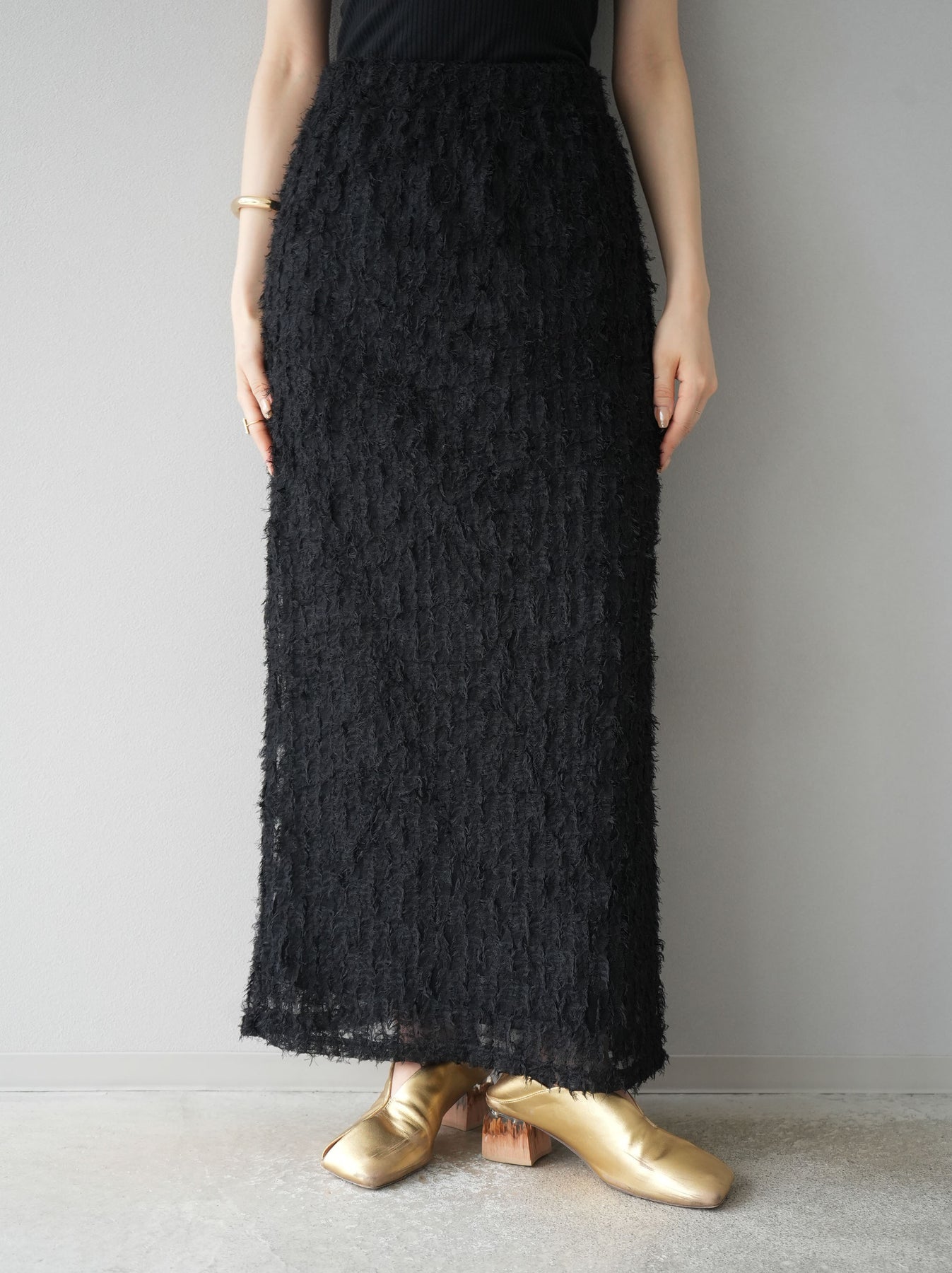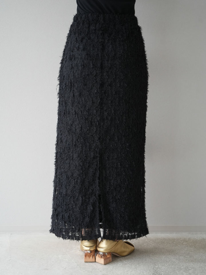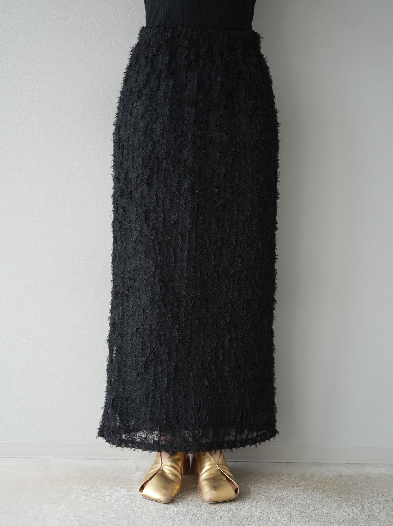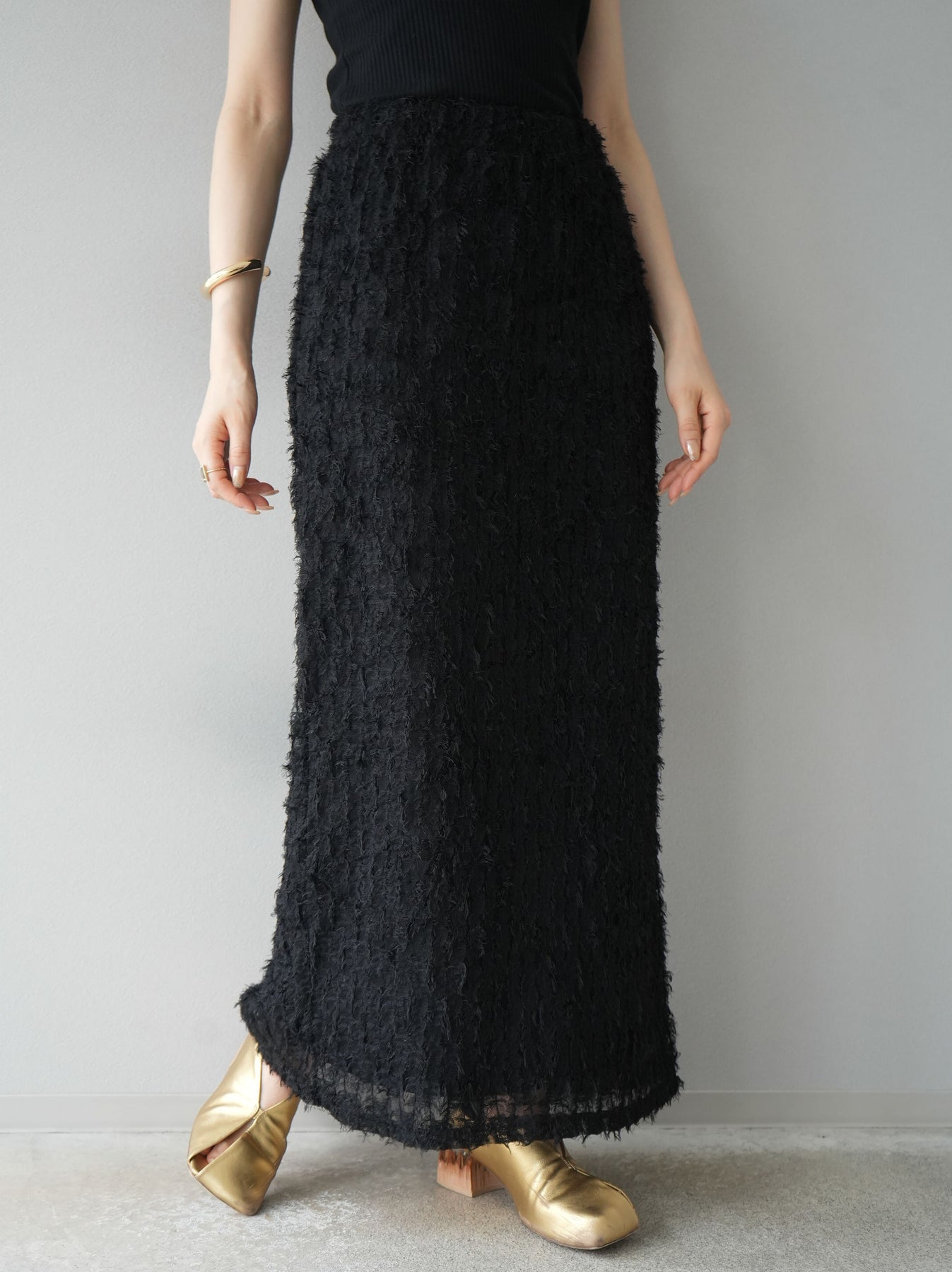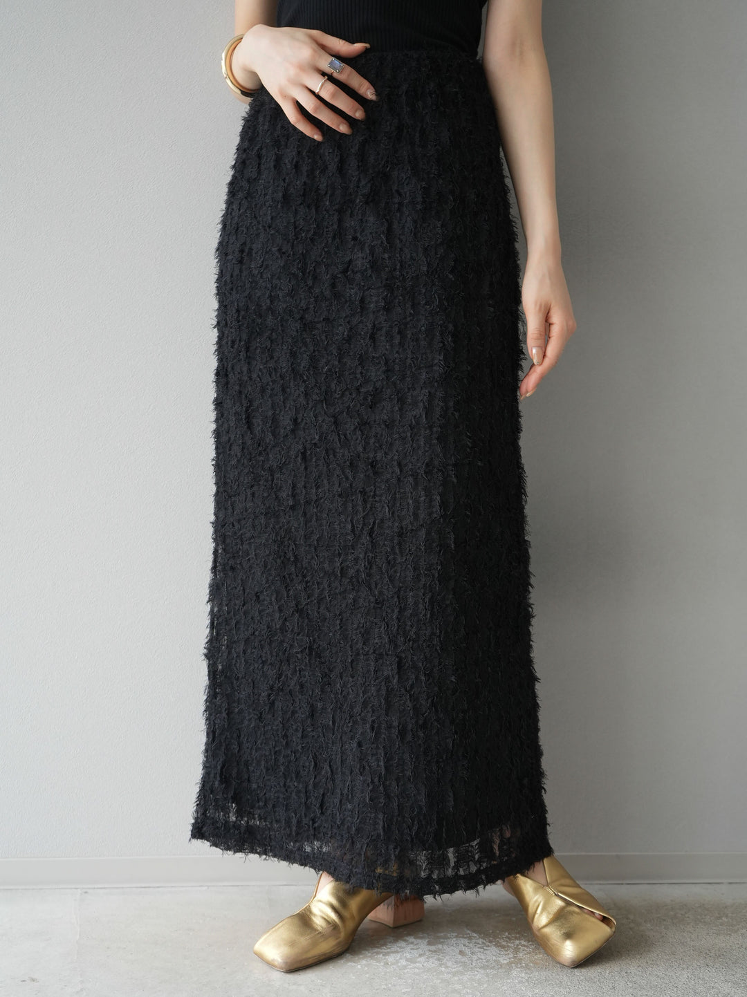 ふんわりとしたチュール素材にフリンジデザインが施されたスカートです。軽やかさと動きが加わり、コーディネートに個性をプラス。ウエストはゴム仕様で快適な着心地。シンプルなトップスと合わせるだけで、存在感のあるスタイルが完成します。トレンド感溢れるデザインで、さりげなくモードな雰囲気を演出。さまざまなシーンで活躍すること間違いなしのアイテムです。