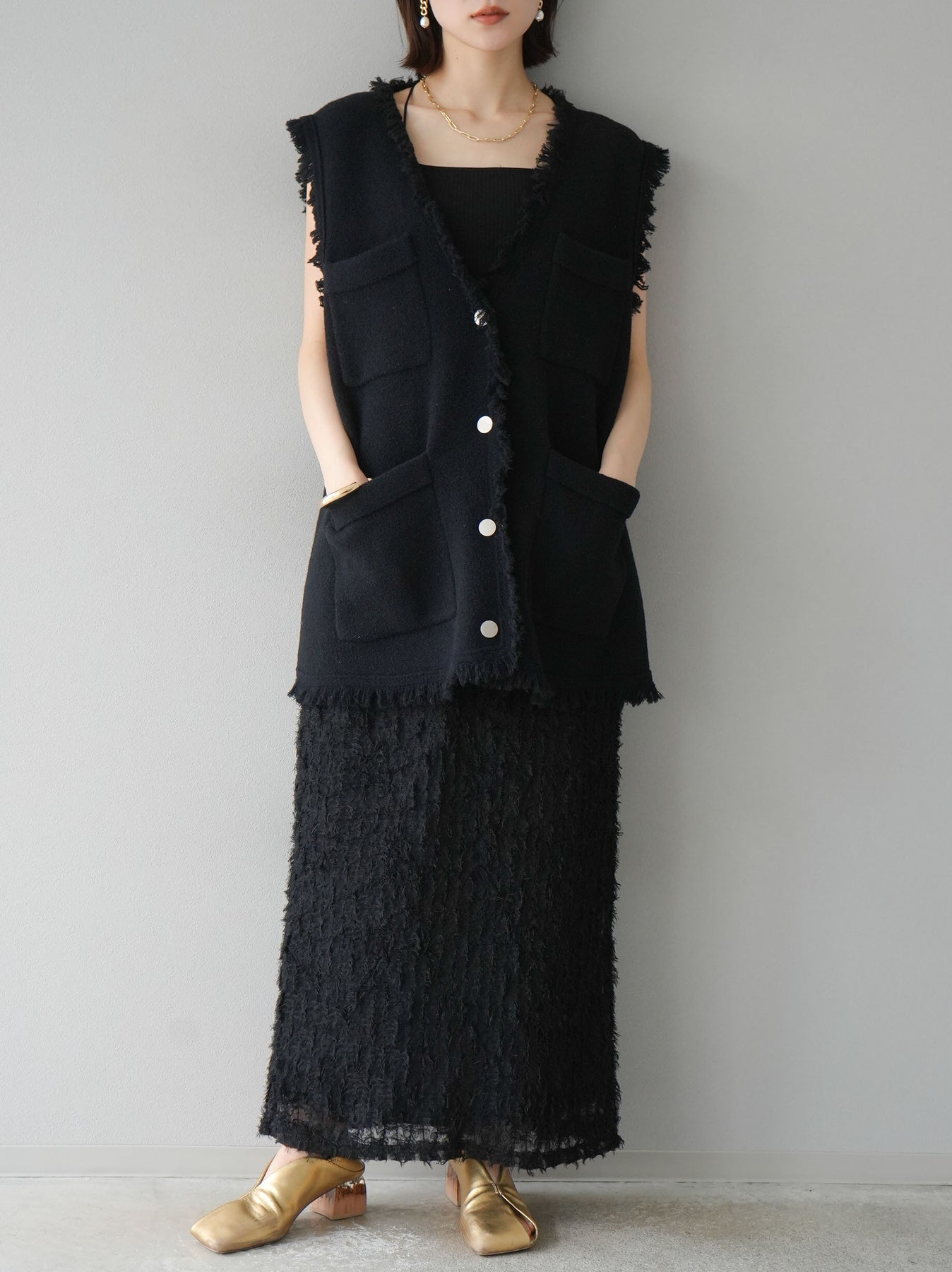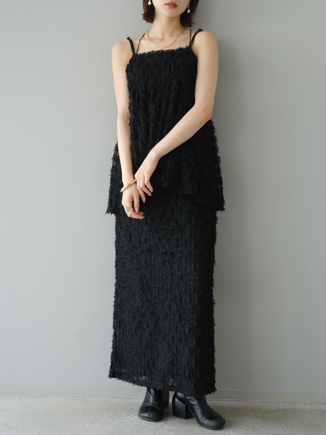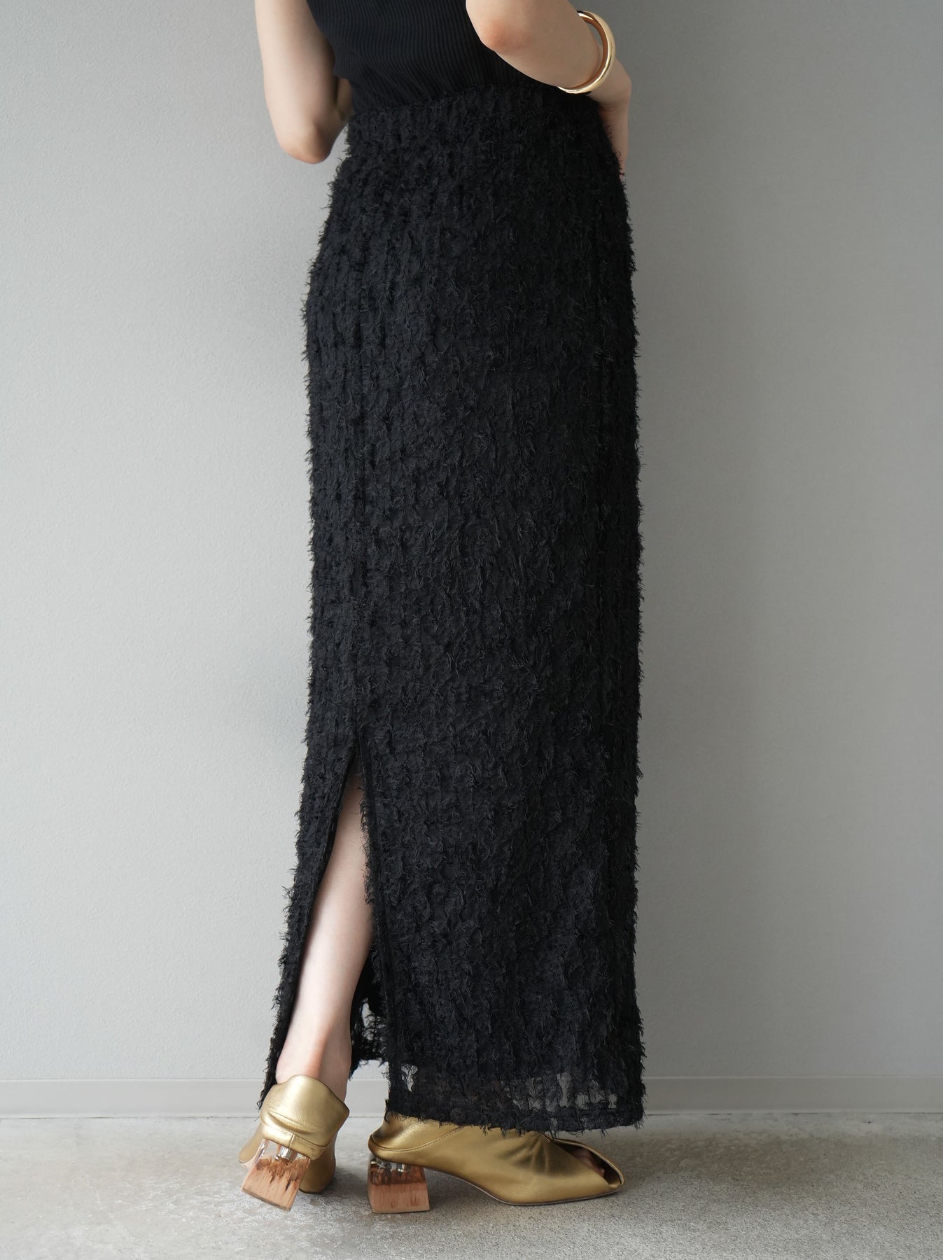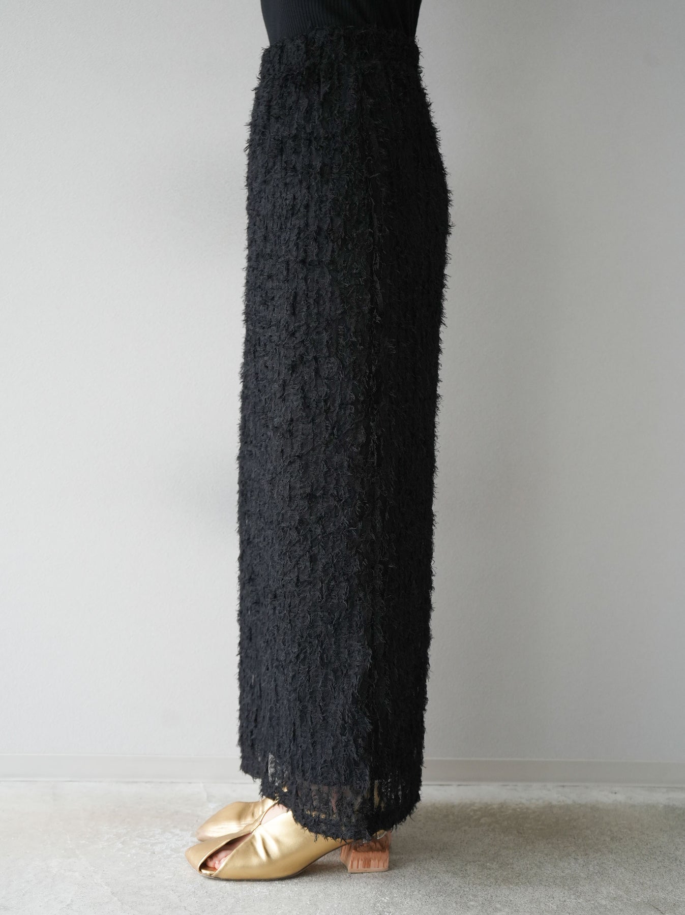 ふんわりとしたチュール素材にフリンジデザインが施されたスカートです。軽やかさと動きが加わり、コーディネートに個性をプラス。ウエストはゴム仕様で快適な着心地。シンプルなトップスと合わせるだけで、存在感のあるスタイルが完成します。トレンド感溢れるデザインで、さりげなくモードな雰囲気を演出。さまざまなシーンで活躍すること間違いなしのアイテムです。