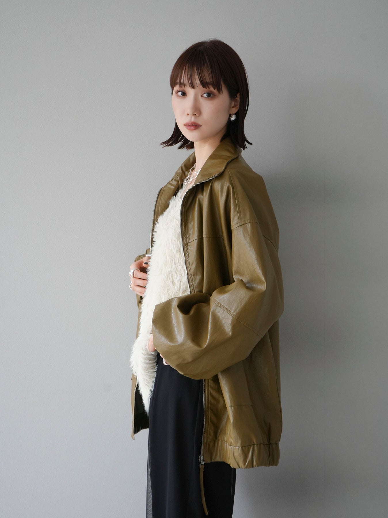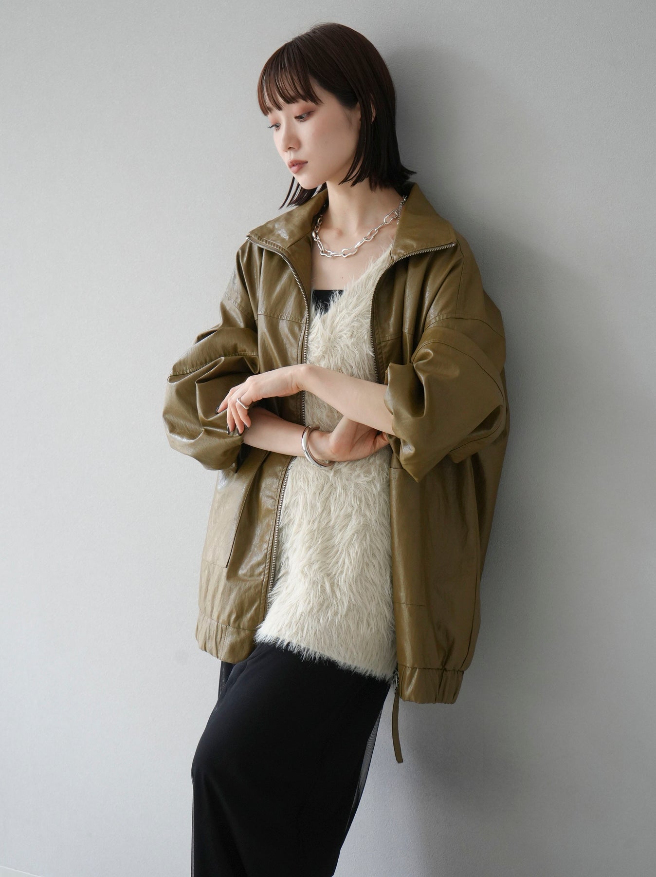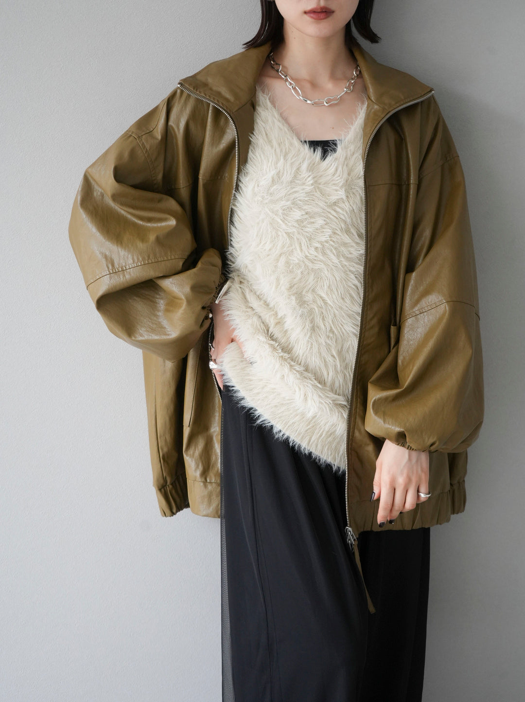 フェイクレザー素材を使用したオーバーサイズブルゾンは、ボリューム感あるシルエットが特徴的です。シンプルながらも存在感のあるデザインで、カジュアルからモードスタイルまで幅広いコーディネートに対応可能。季節の変わり目にさらりと羽織れる軽やかさも魅力です。トレンド感を押さえた一着で、秋冬のコーディネートに取り入れやすいアイテムとなっています。 ※ボトムス、キャミソール(インナー)以外の商品は一律でインナーは付属していません