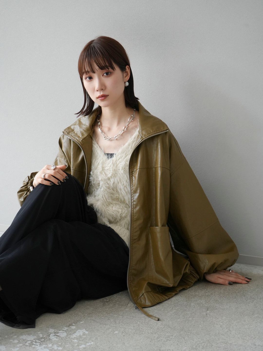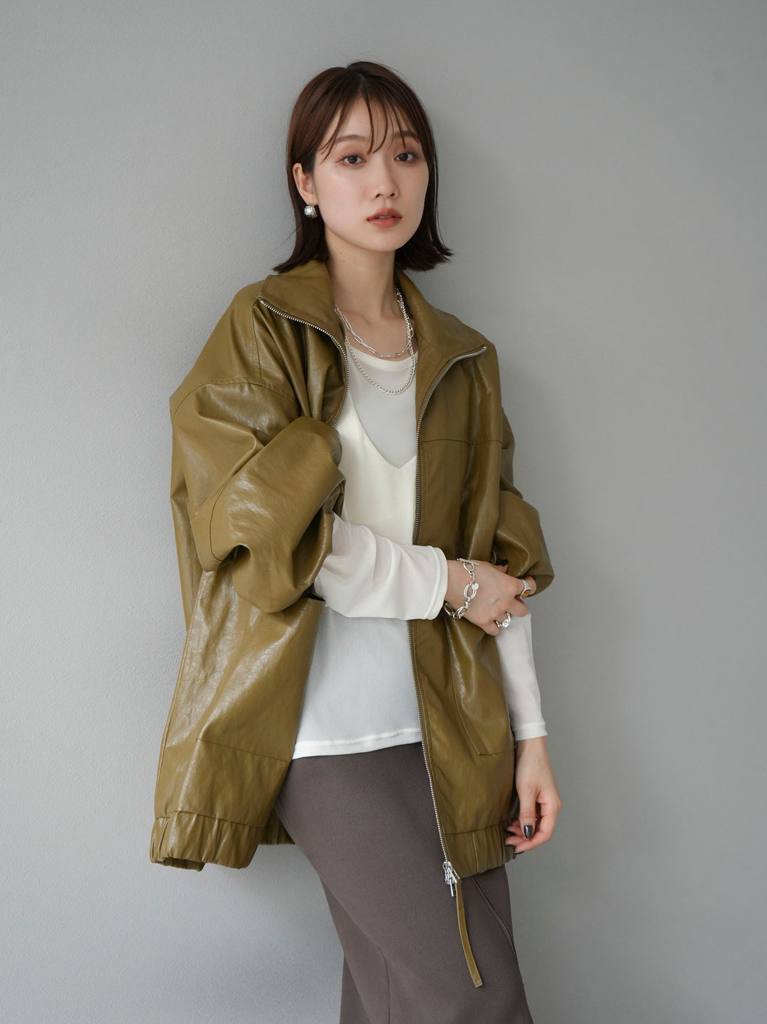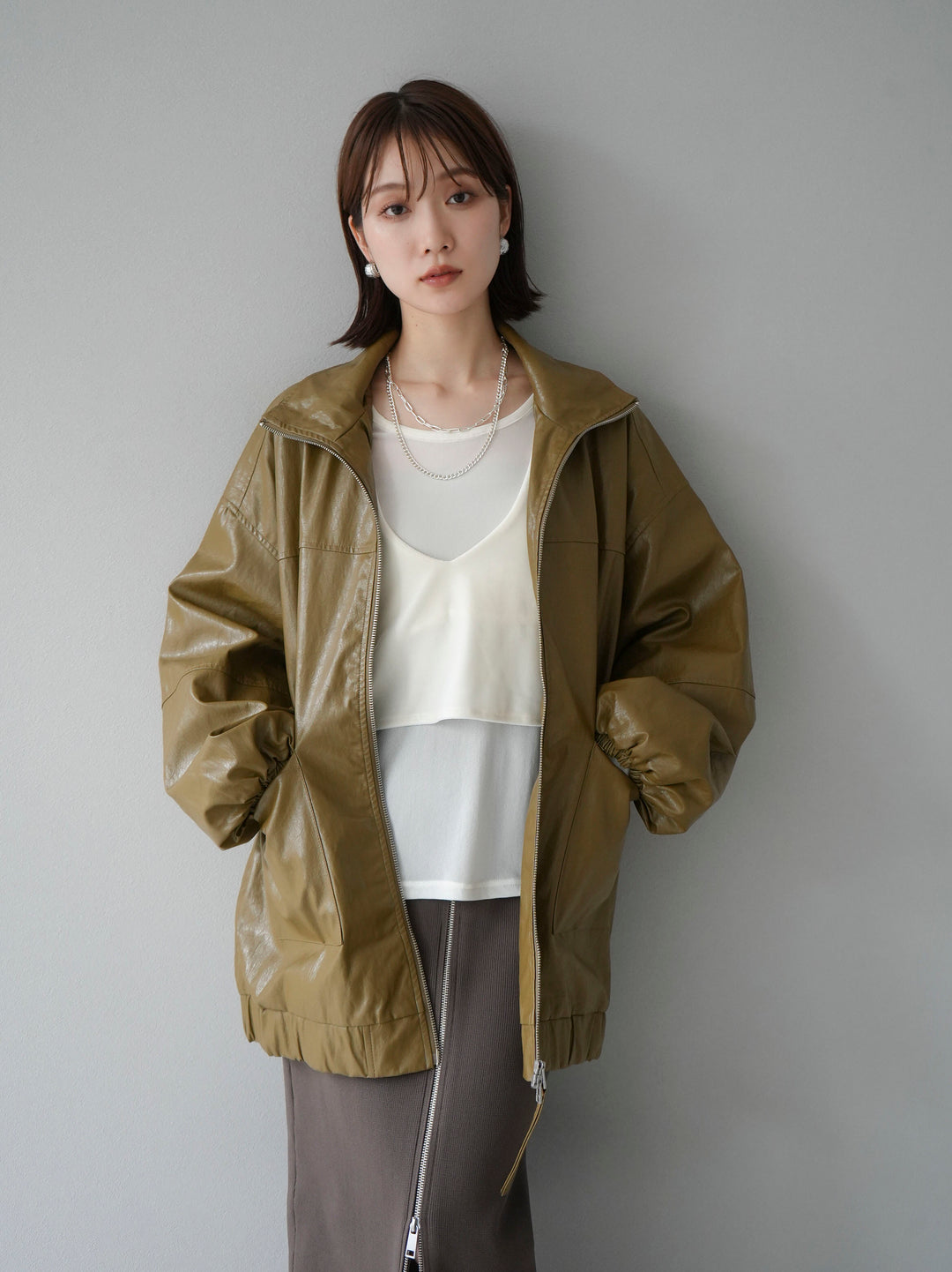 フェイクレザー素材を使用したオーバーサイズブルゾンは、ボリューム感あるシルエットが特徴的です。シンプルながらも存在感のあるデザインで、カジュアルからモードスタイルまで幅広いコーディネートに対応可能。季節の変わり目にさらりと羽織れる軽やかさも魅力です。トレンド感を押さえた一着で、秋冬のコーディネートに取り入れやすいアイテムとなっています。 ※ボトムス、キャミソール(インナー)以外の商品は一律でインナーは付属していません