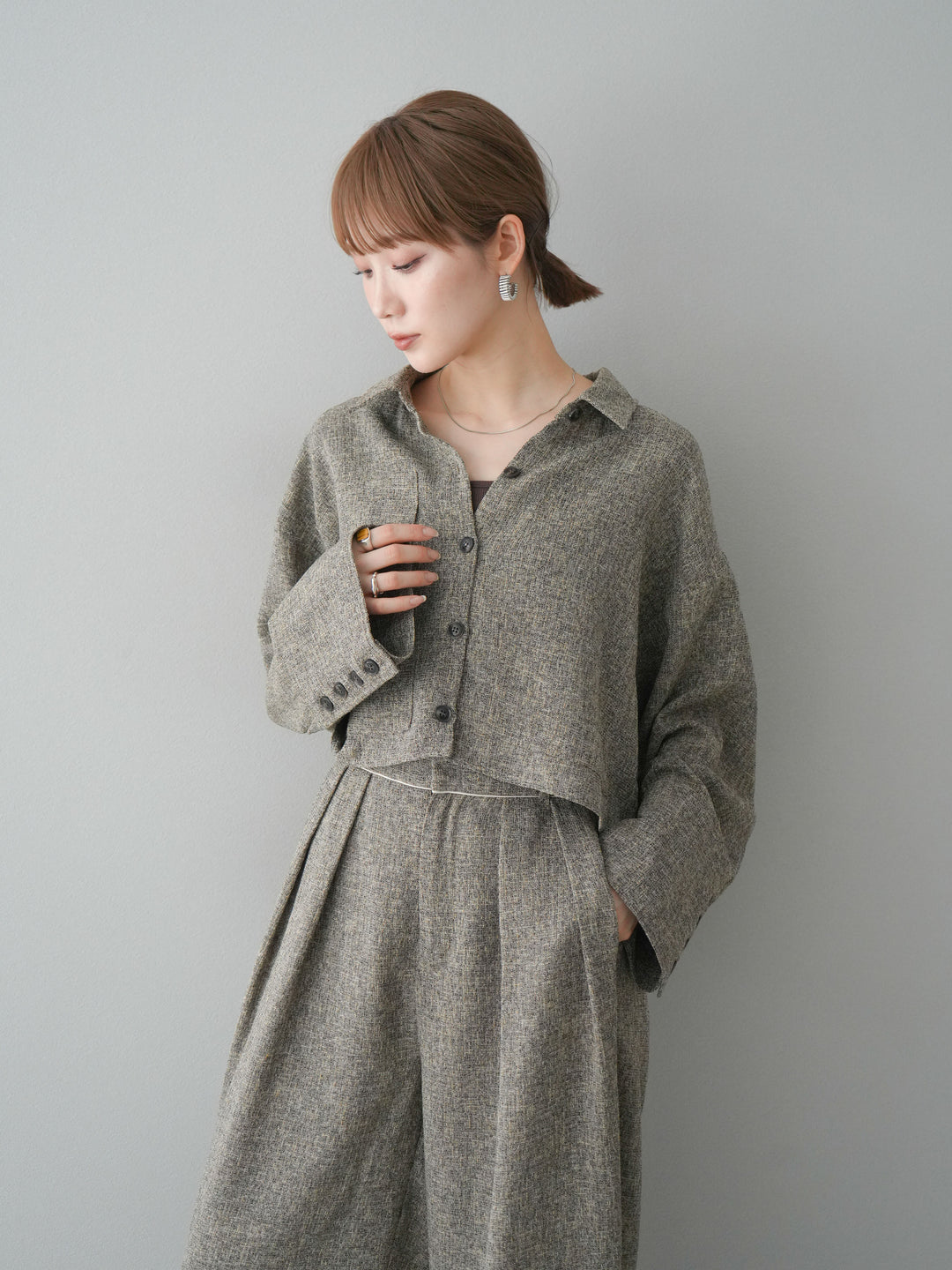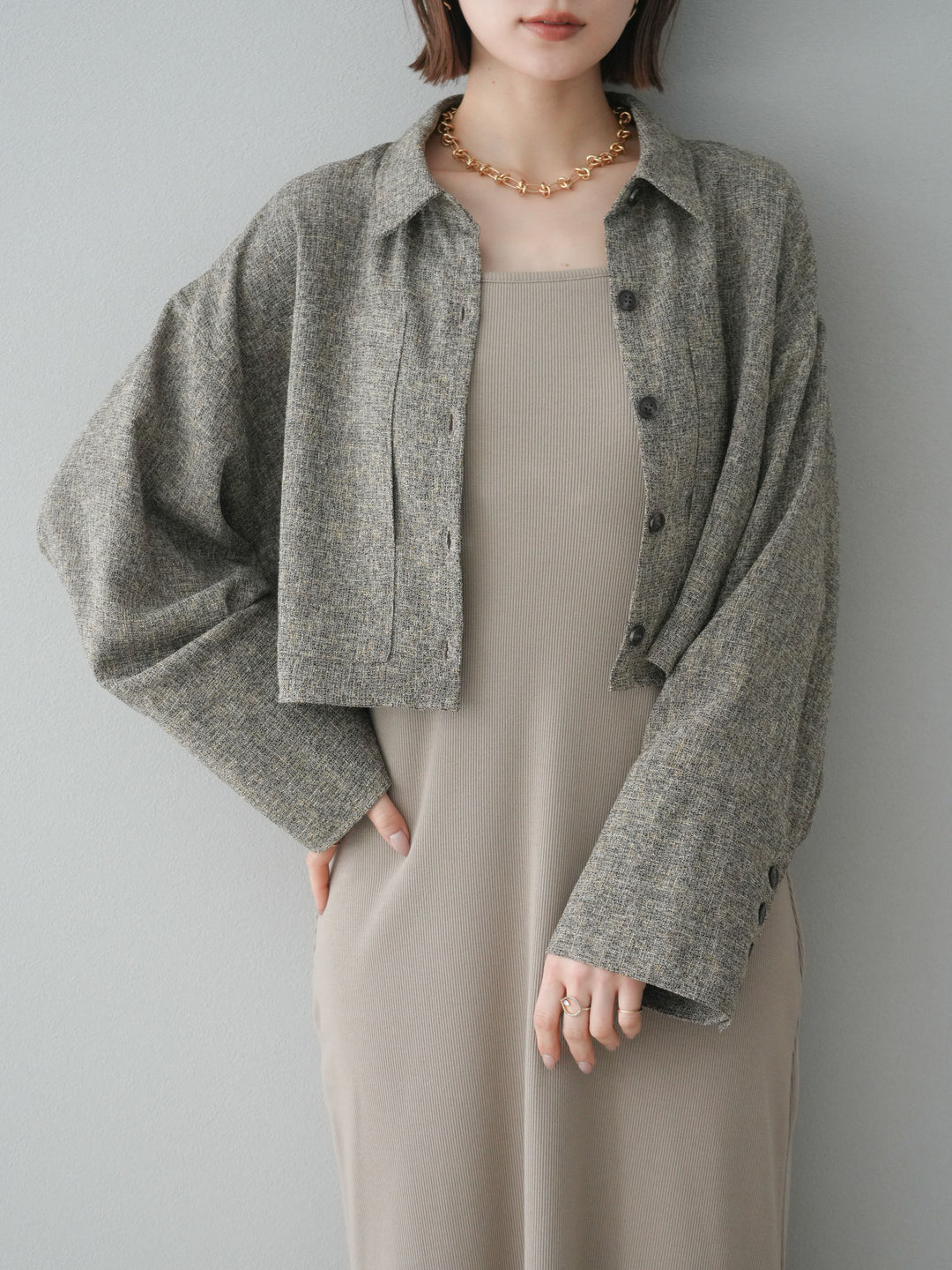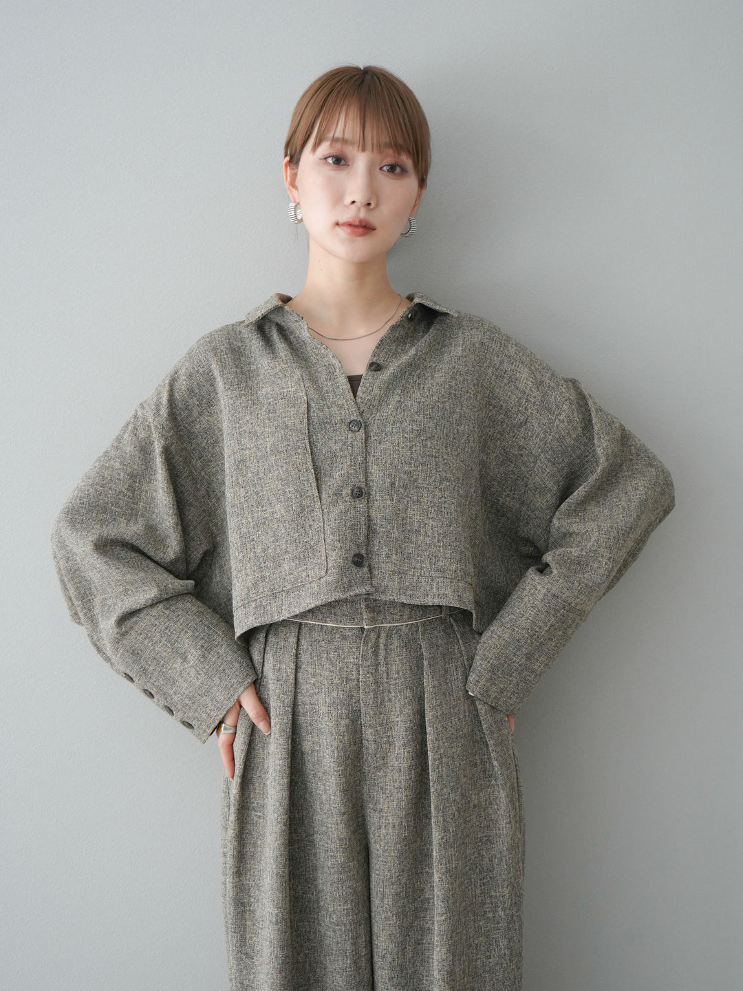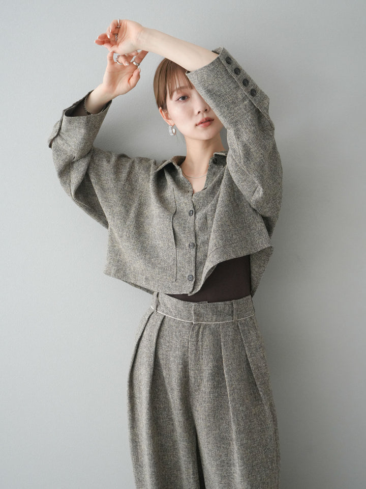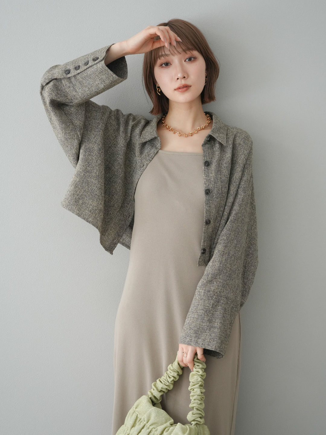 トレンドのサマーツイード素材を使用したショートシャツ。程よいハリ感のある生地が、洗練された印象を演出します。大きめのカフスデザインがアクセントになり、袖をまくってもおしゃれなシルエットに。ショート丈なので、ワンピースやハイウエストボトムスと好相性。羽織りとしても活躍し、幅広いスタイリングが楽しめるアイテムです。 ※ボトムス、キャミソール(インナー)以外の商品は一律でインナーは付属していません