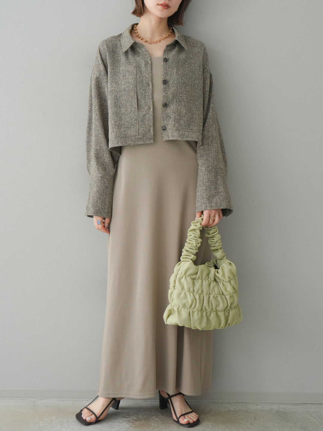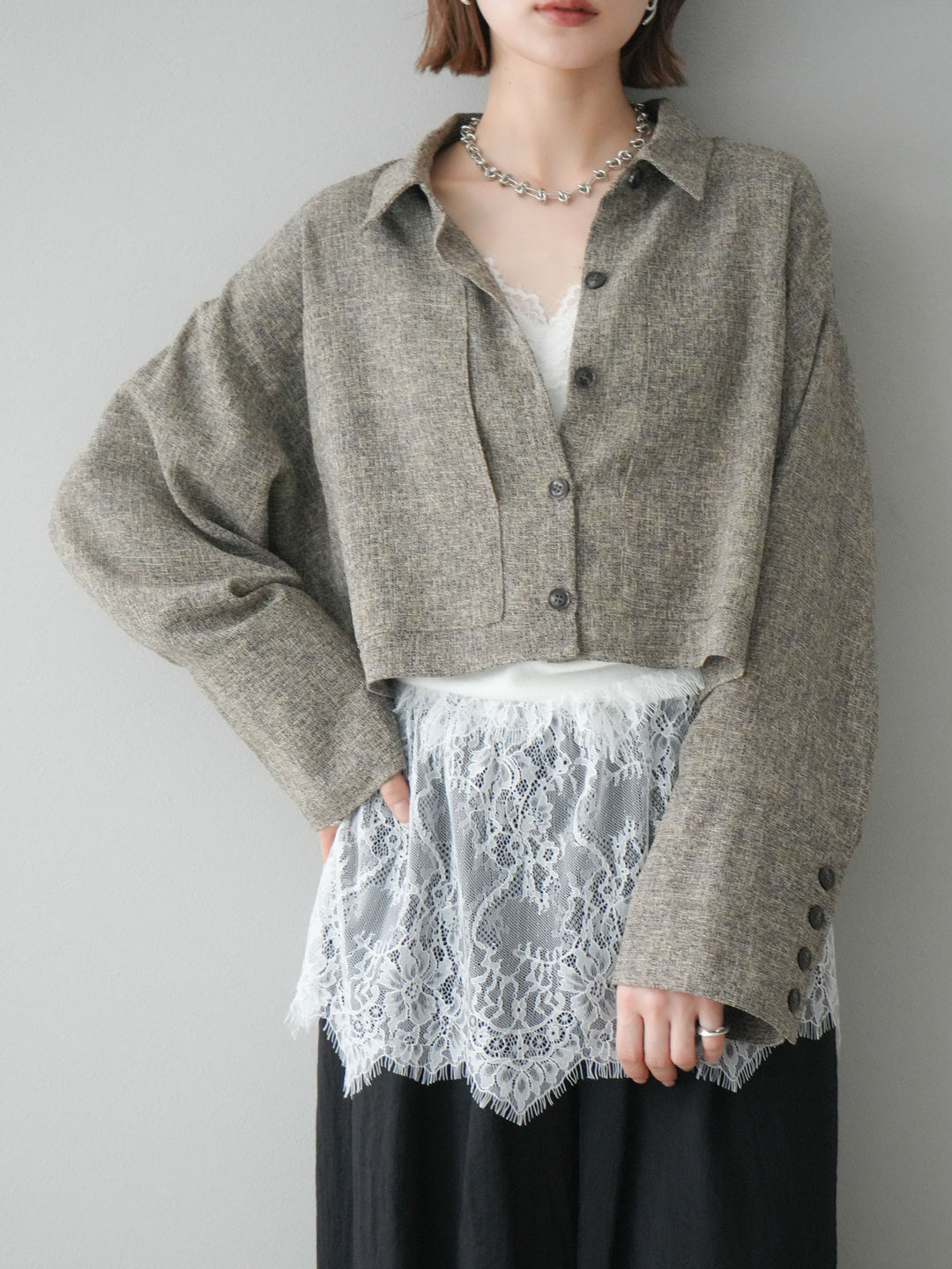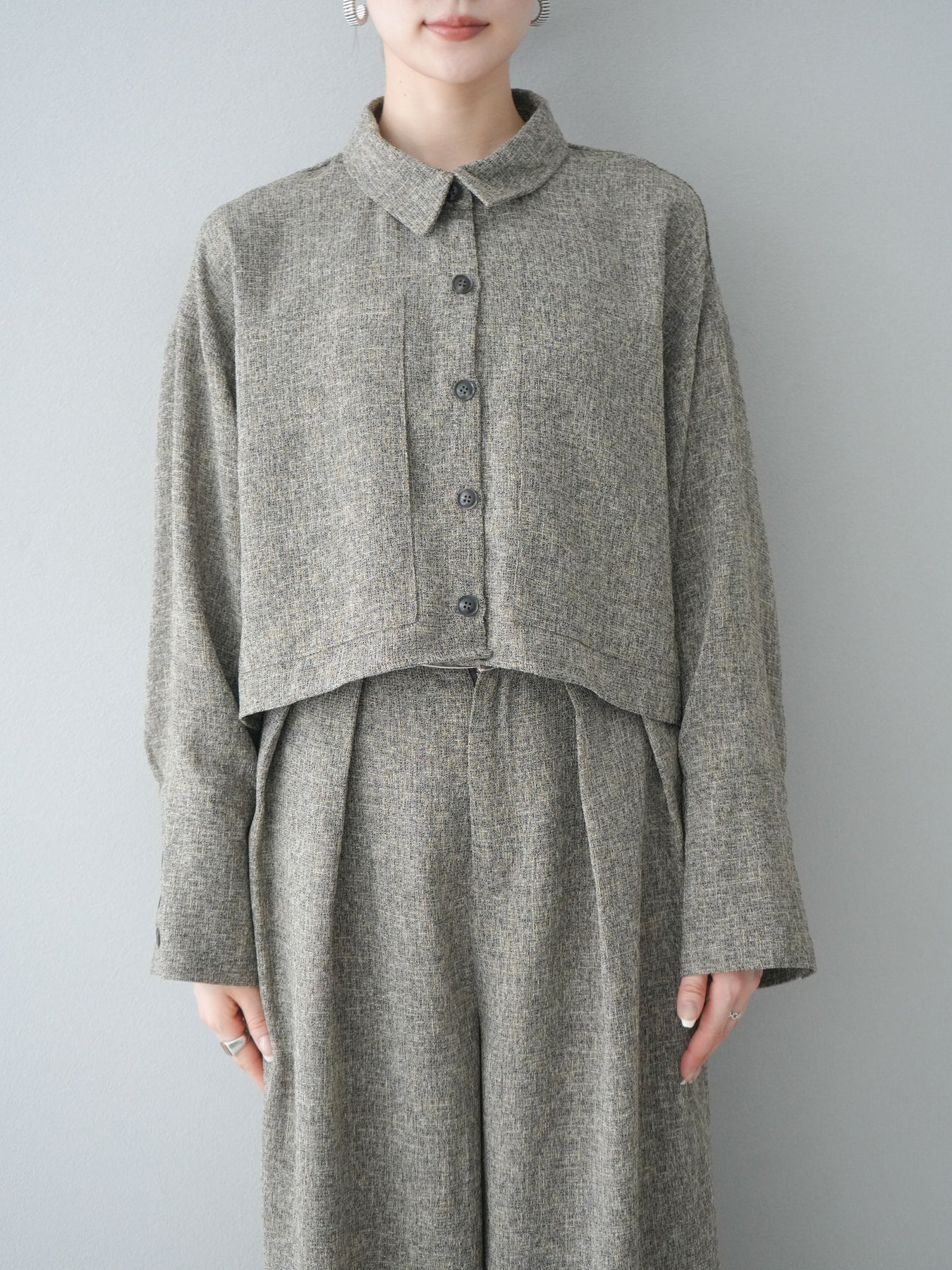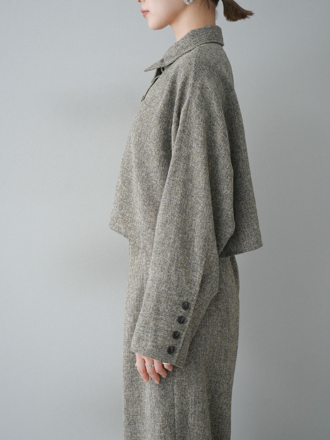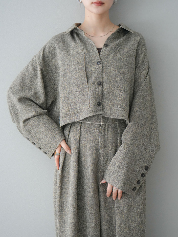 トレンドのサマーツイード素材を使用したショートシャツ。程よいハリ感のある生地が、洗練された印象を演出します。大きめのカフスデザインがアクセントになり、袖をまくってもおしゃれなシルエットに。ショート丈なので、ワンピースやハイウエストボトムスと好相性。羽織りとしても活躍し、幅広いスタイリングが楽しめるアイテムです。 ※ボトムス、キャミソール(インナー)以外の商品は一律でインナーは付属していません