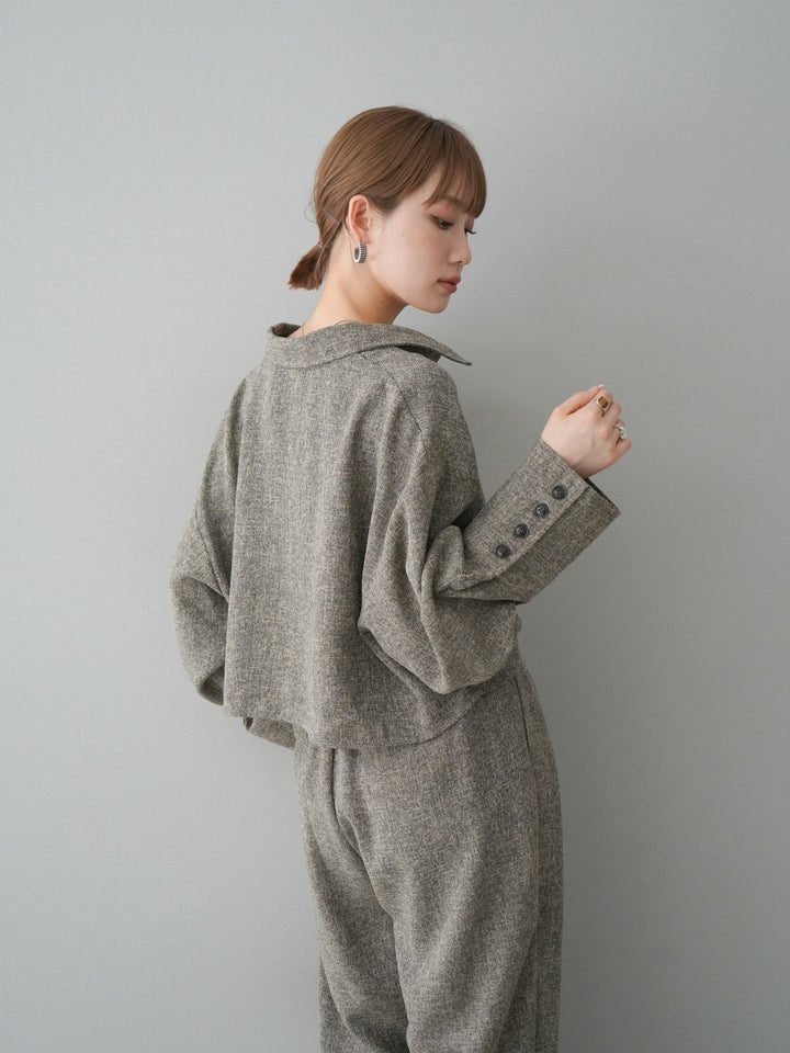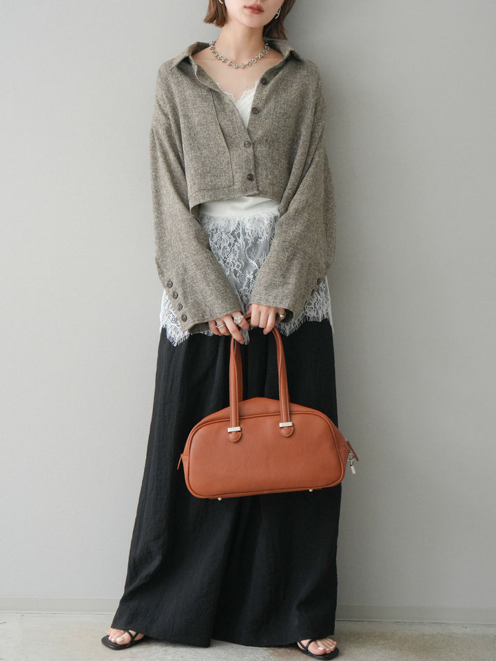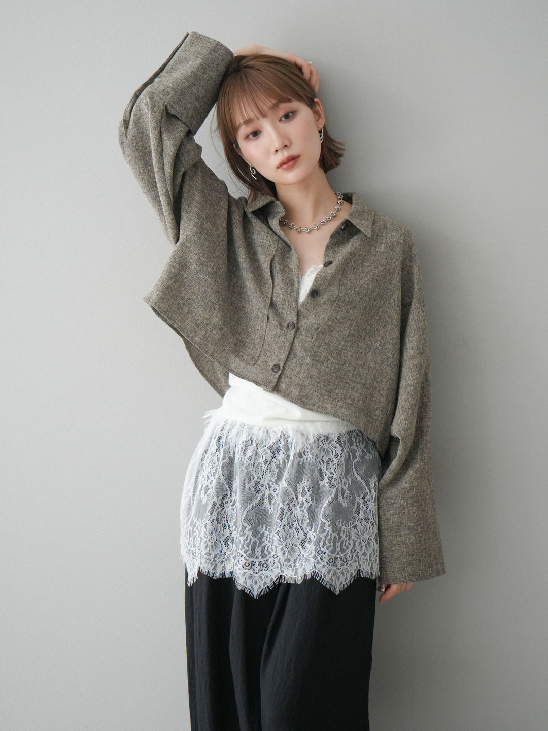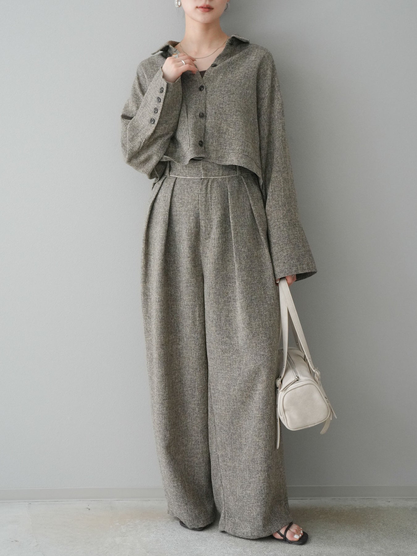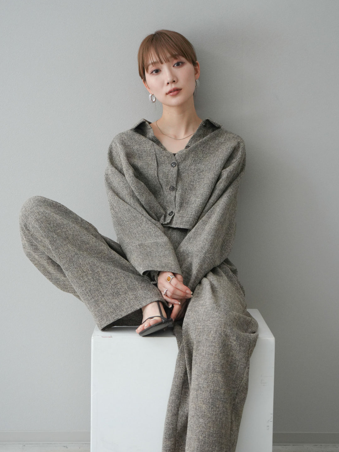 トレンドのサマーツイード素材を使用したショートシャツ。程よいハリ感のある生地が、洗練された印象を演出します。大きめのカフスデザインがアクセントになり、袖をまくってもおしゃれなシルエットに。ショート丈なので、ワンピースやハイウエストボトムスと好相性。羽織りとしても活躍し、幅広いスタイリングが楽しめるアイテムです。 ※ボトムス、キャミソール(インナー)以外の商品は一律でインナーは付属していません