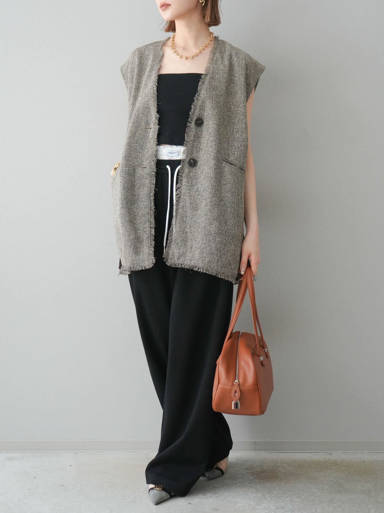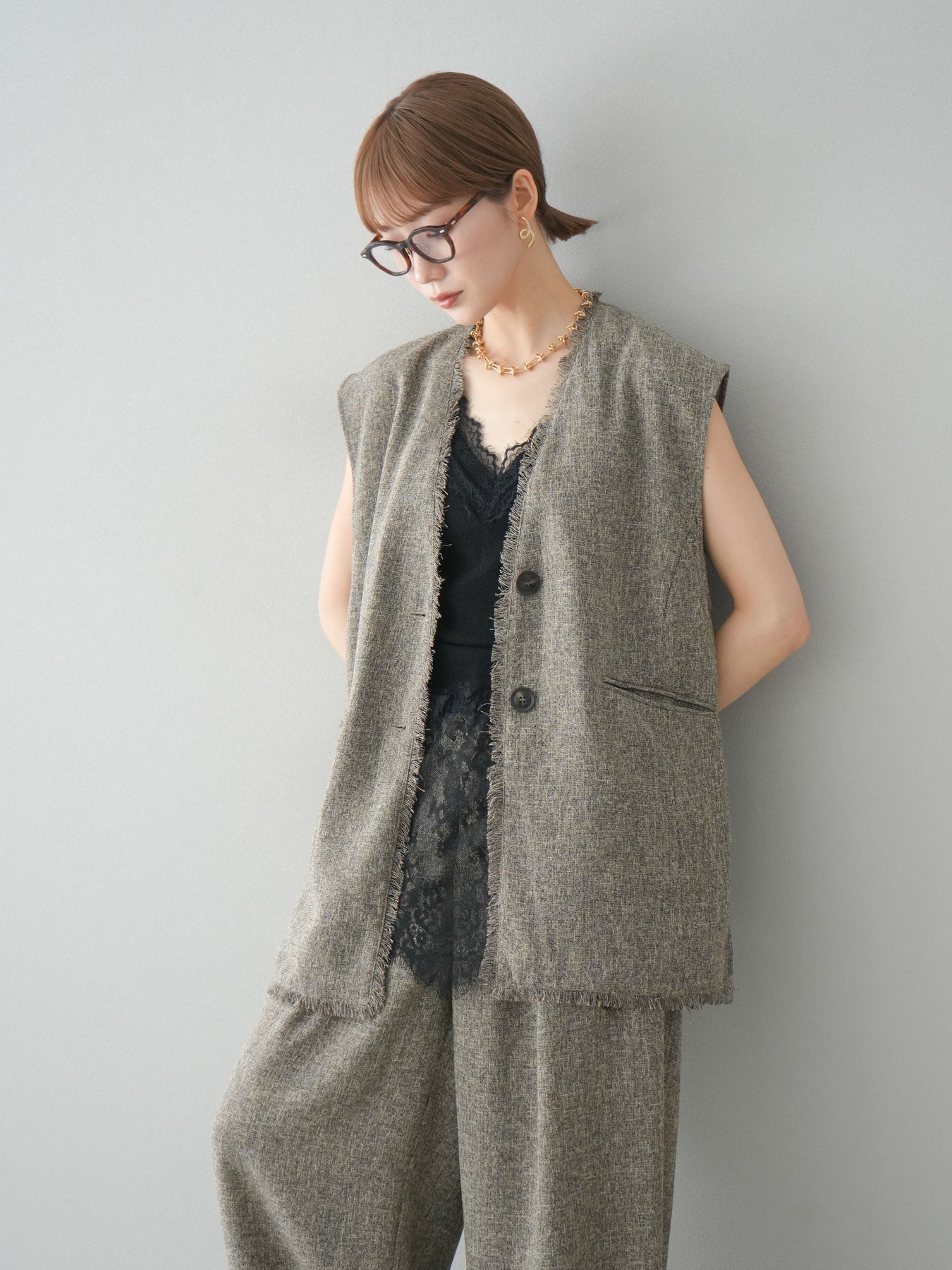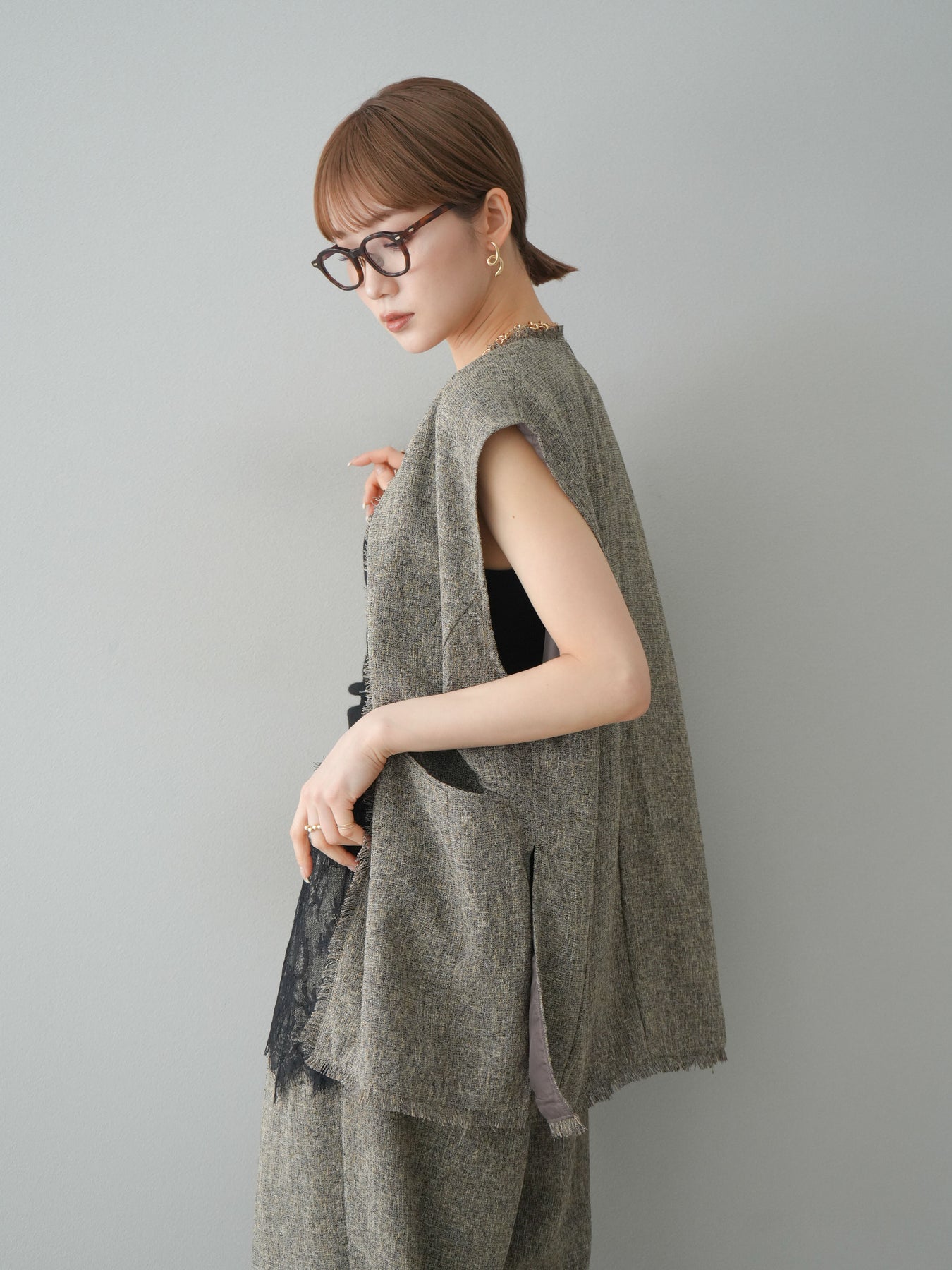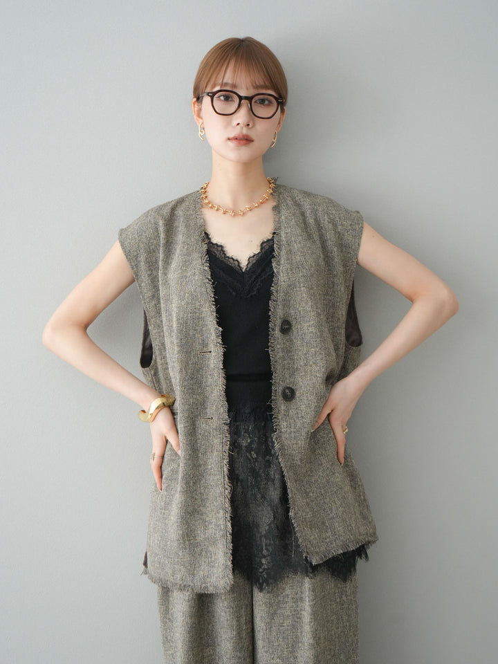 品のあるツイード素材にフリンジデザインをプラスした、こなれ感漂うジレ。 リラクシーなシルエットで羽織るだけで洗練された印象に。 Tシャツやキャミソールとレイヤードすれば、カジュアルからきれいめまで幅広く着こなせる一枚。 オンオフ問わず活躍する、トレンド感たっぷりのアイテムです。 ※ボトムス、キャミソール(インナー)以外の商品は一律でインナーは付属していません