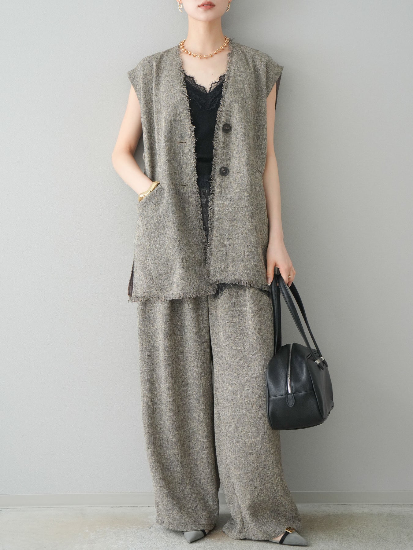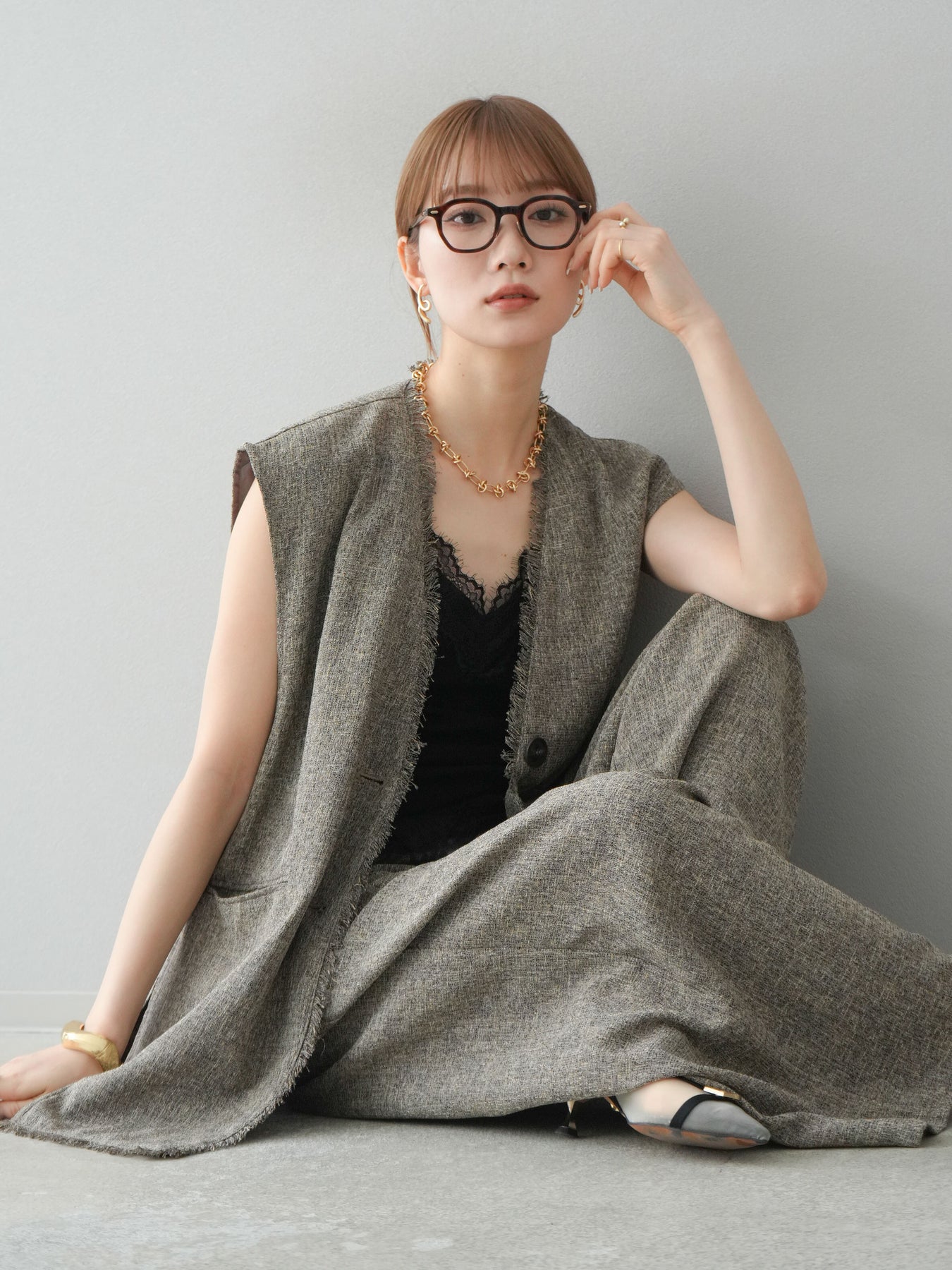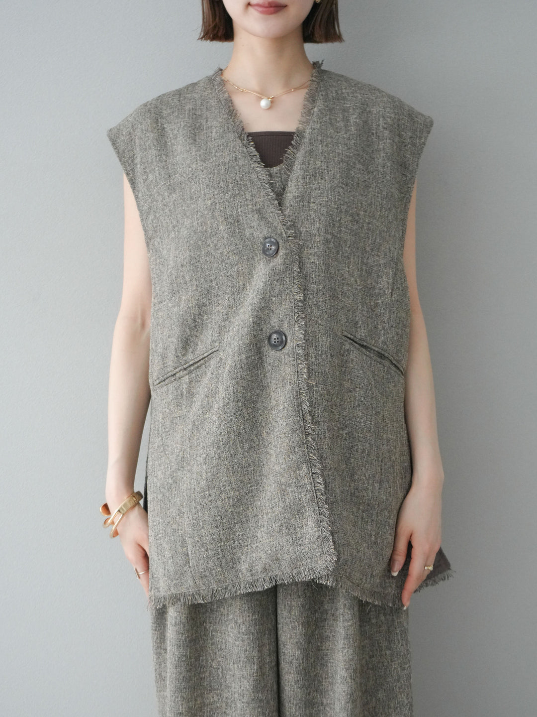 品のあるツイード素材にフリンジデザインをプラスした、こなれ感漂うジレ。 リラクシーなシルエットで羽織るだけで洗練された印象に。 Tシャツやキャミソールとレイヤードすれば、カジュアルからきれいめまで幅広く着こなせる一枚。 オンオフ問わず活躍する、トレンド感たっぷりのアイテムです。 ※ボトムス、キャミソール(インナー)以外の商品は一律でインナーは付属していません