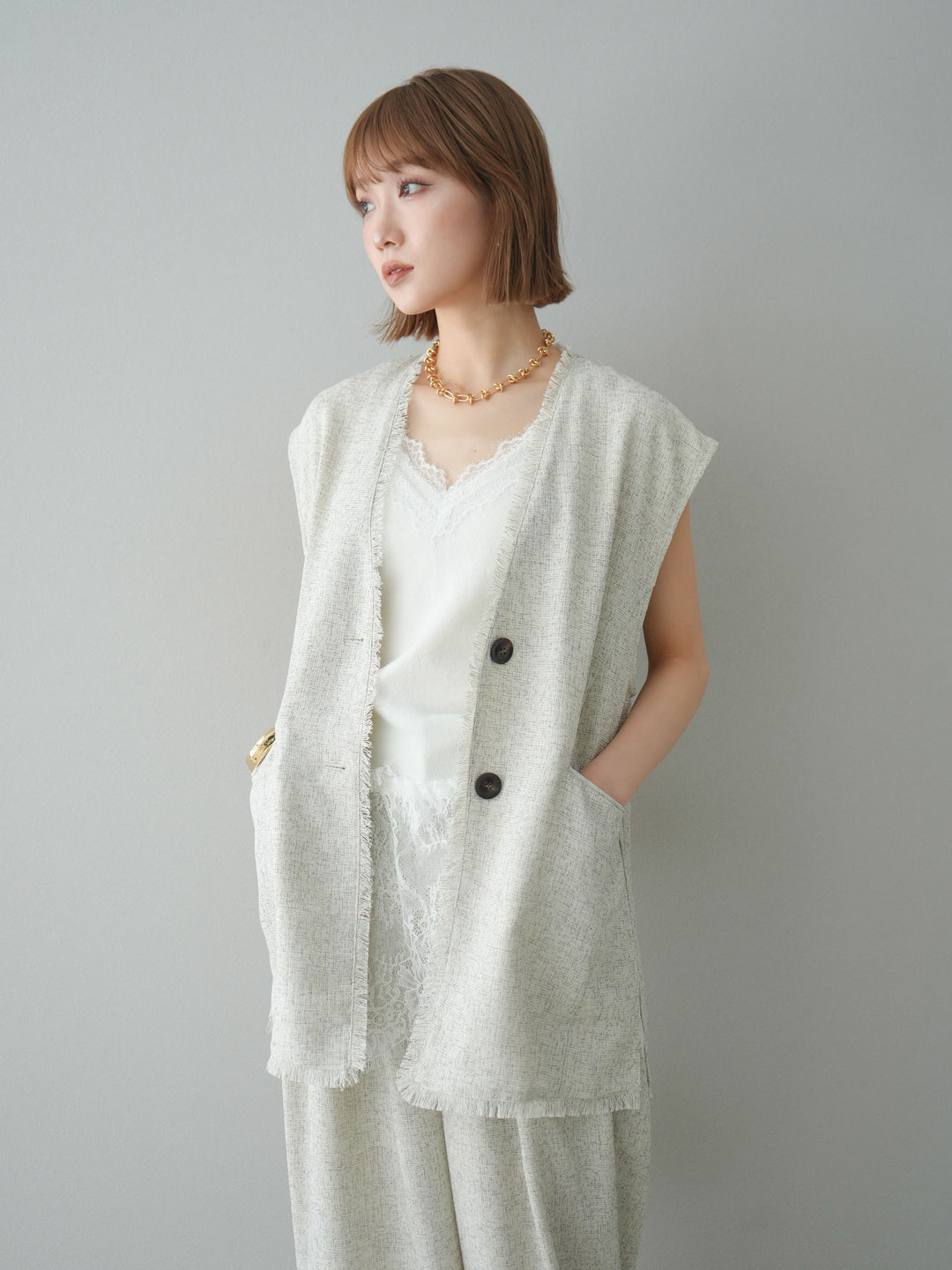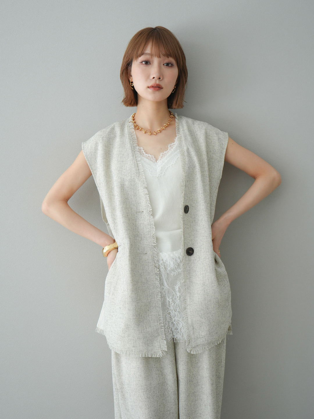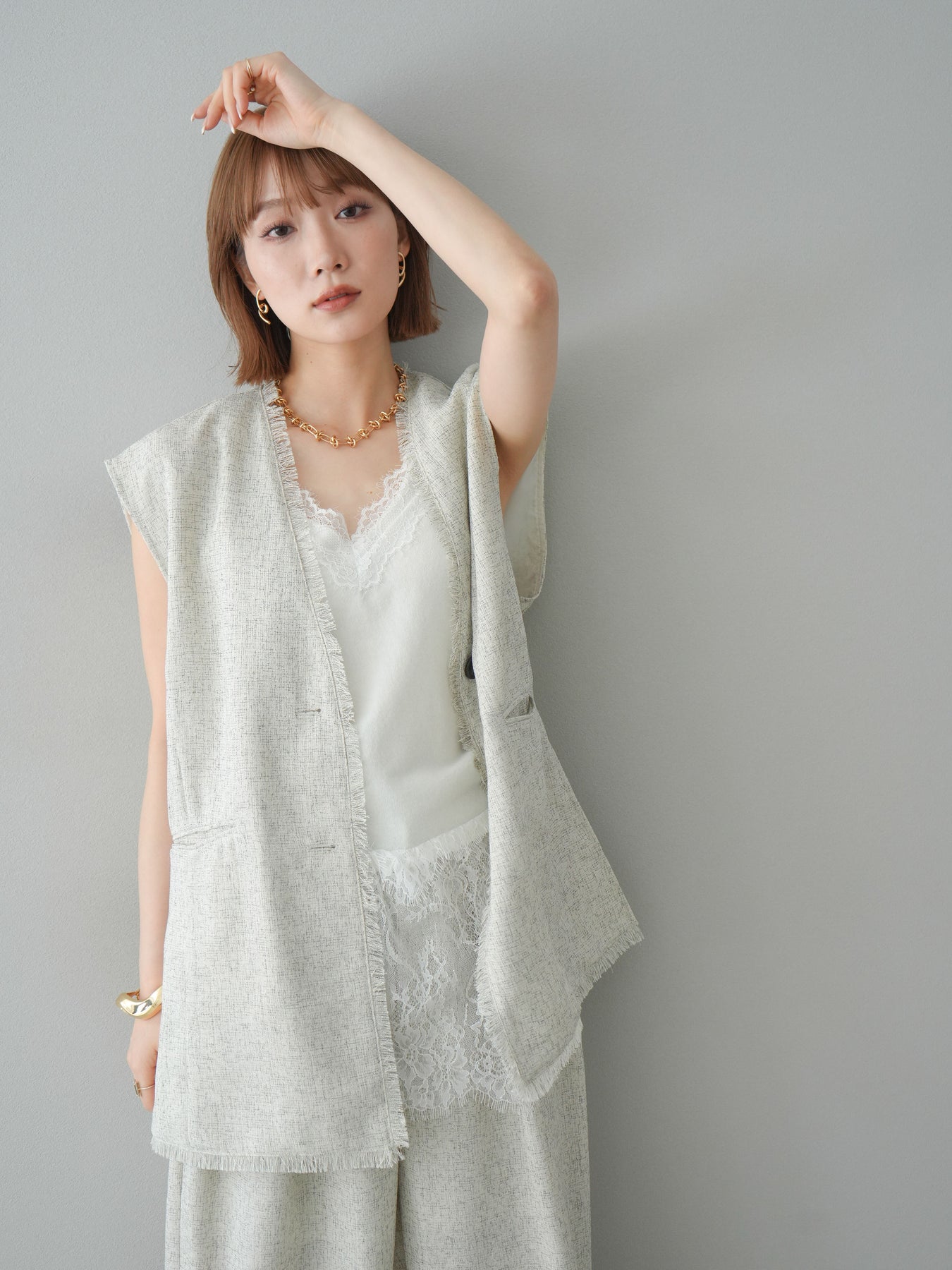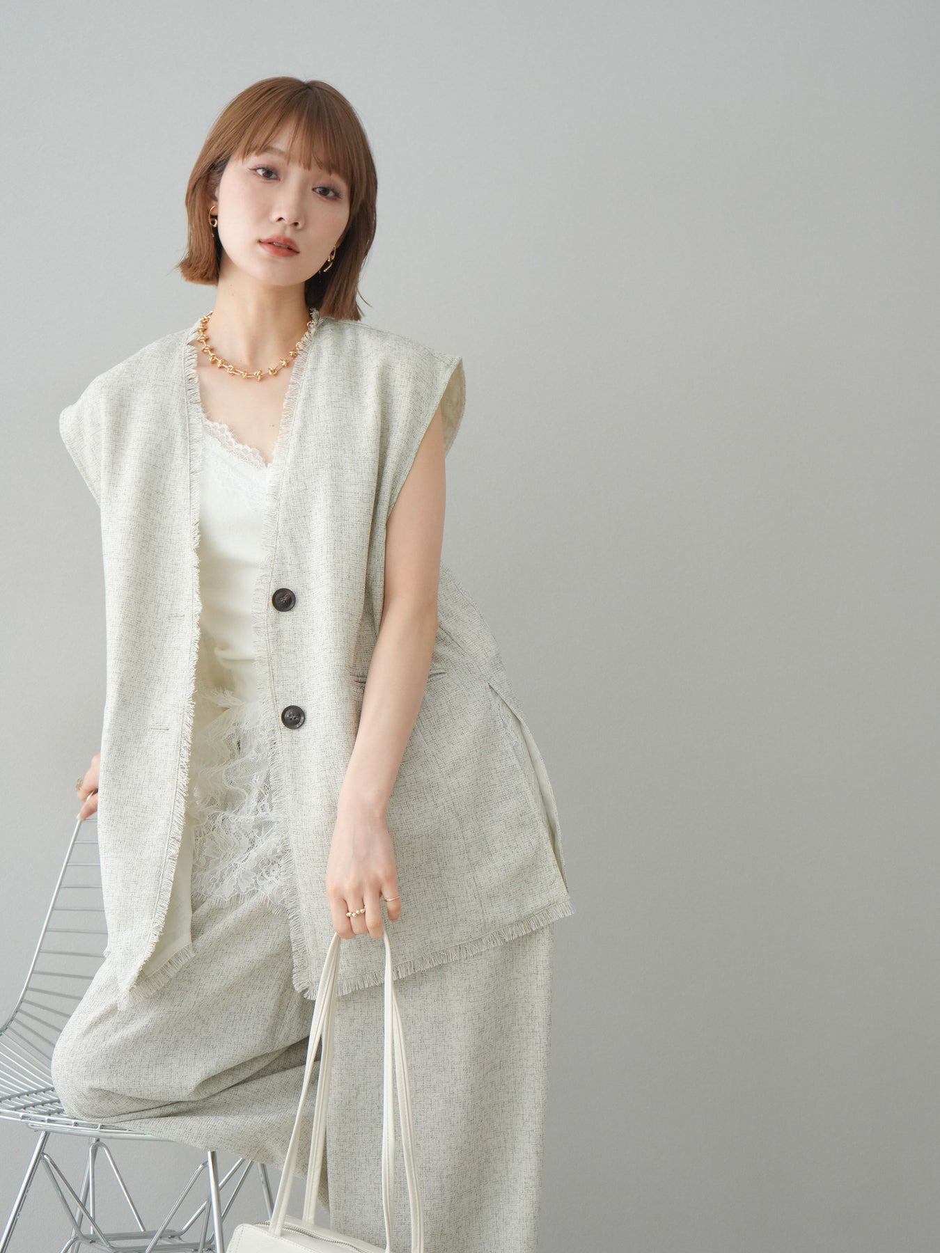 品のあるツイード素材にフリンジデザインをプラスした、こなれ感漂うジレ。 リラクシーなシルエットで羽織るだけで洗練された印象に。 Tシャツやキャミソールとレイヤードすれば、カジュアルからきれいめまで幅広く着こなせる一枚。 オンオフ問わず活躍する、トレンド感たっぷりのアイテムです。 ※ボトムス、キャミソール(インナー)以外の商品は一律でインナーは付属していません