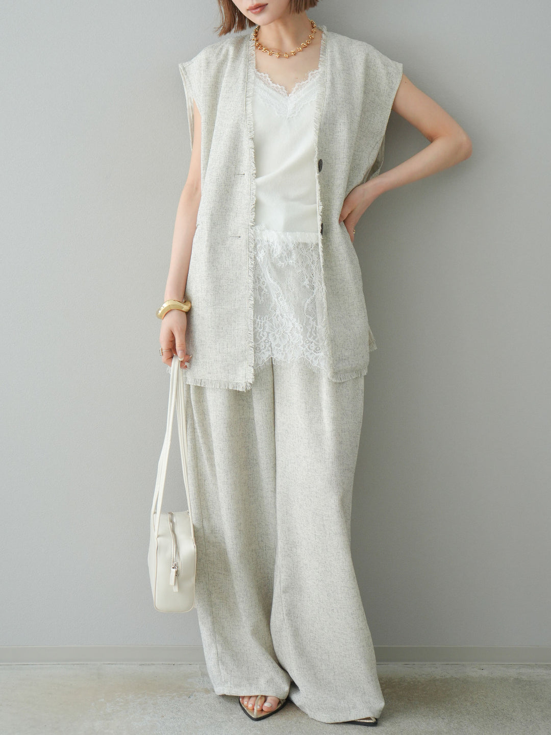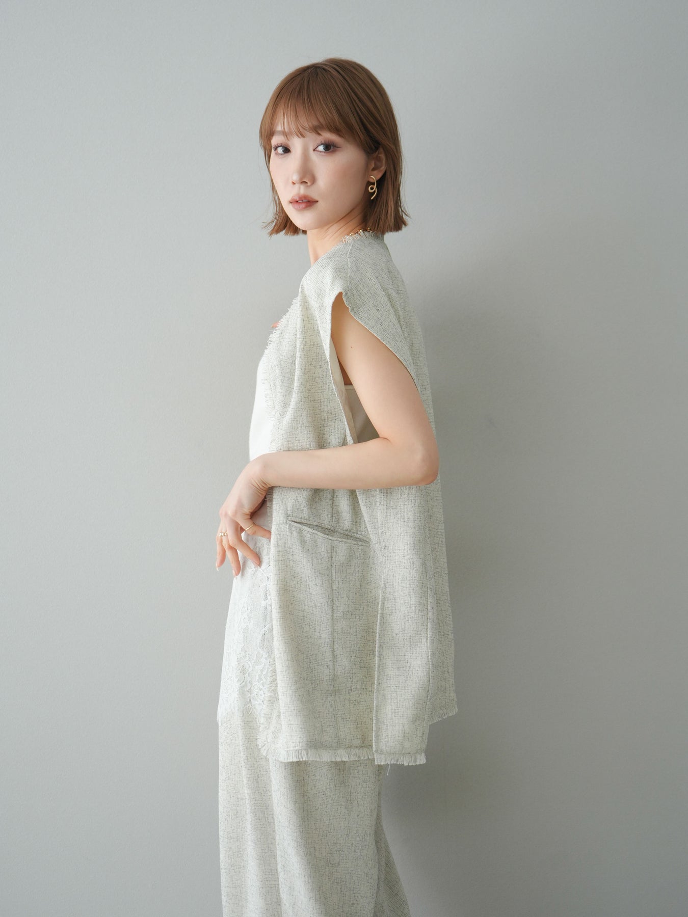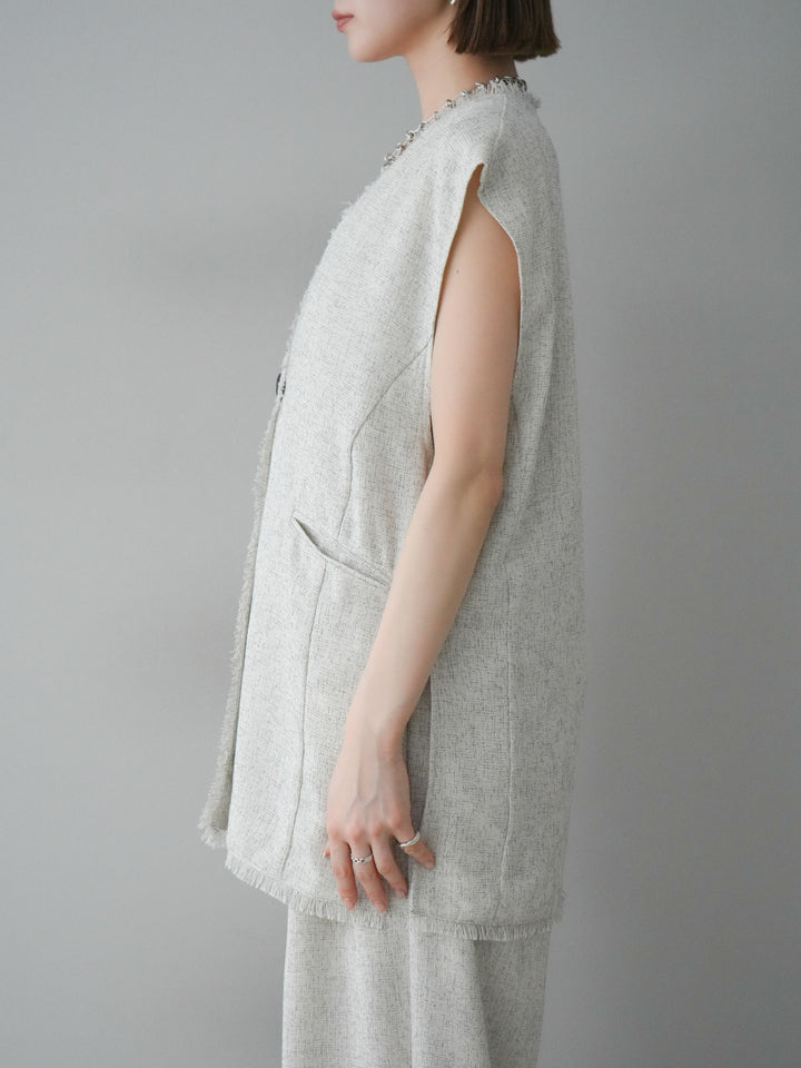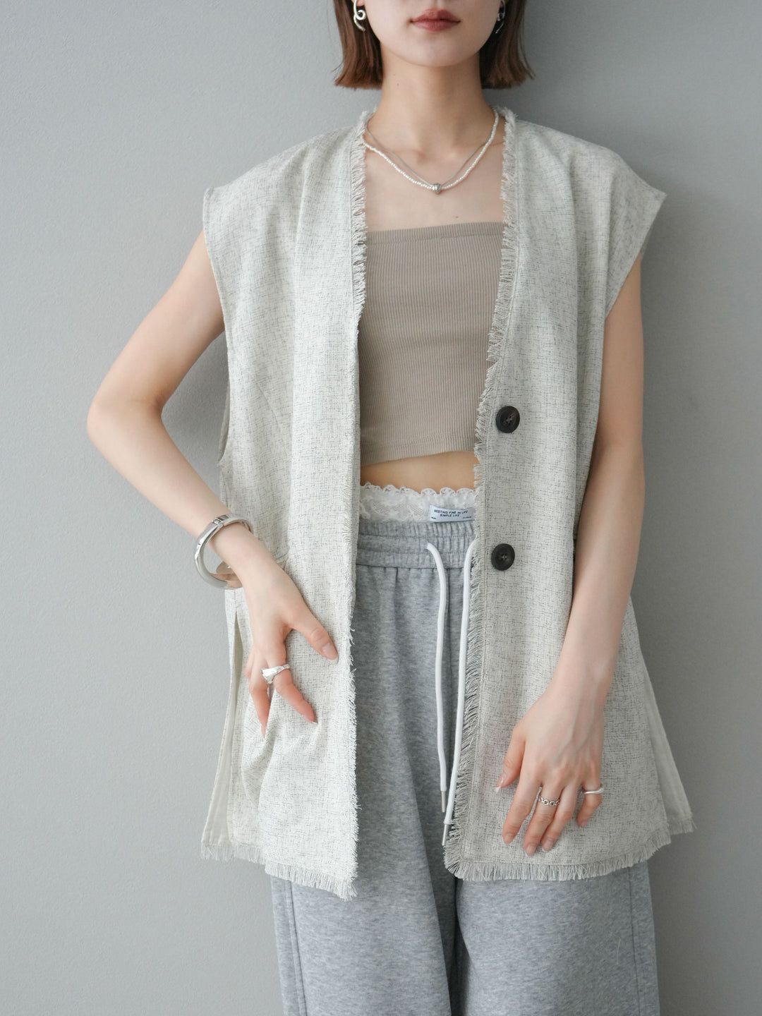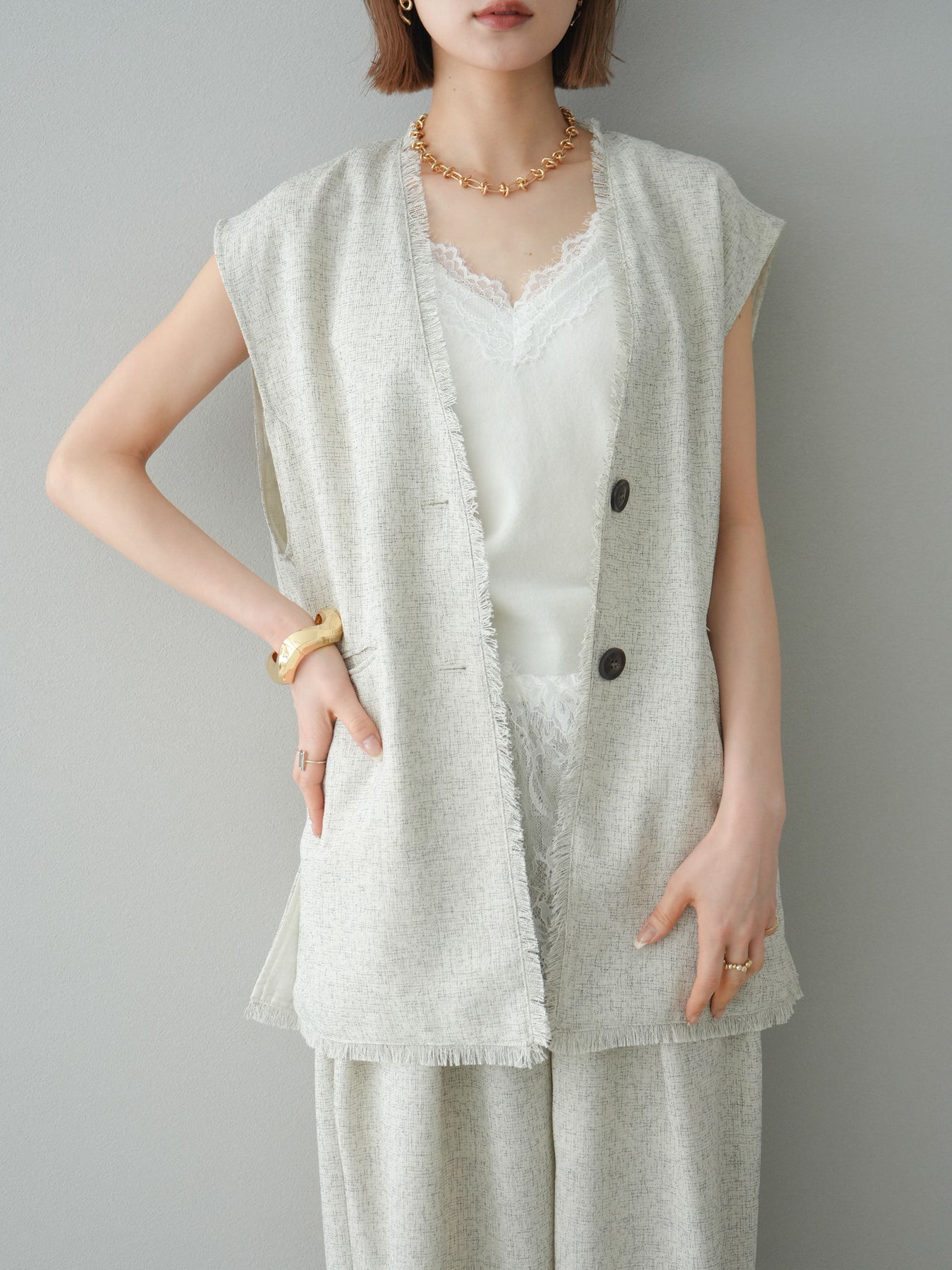 品のあるツイード素材にフリンジデザインをプラスした、こなれ感漂うジレ。 リラクシーなシルエットで羽織るだけで洗練された印象に。 Tシャツやキャミソールとレイヤードすれば、カジュアルからきれいめまで幅広く着こなせる一枚。 オンオフ問わず活躍する、トレンド感たっぷりのアイテムです。 ※ボトムス、キャミソール(インナー)以外の商品は一律でインナーは付属していません
