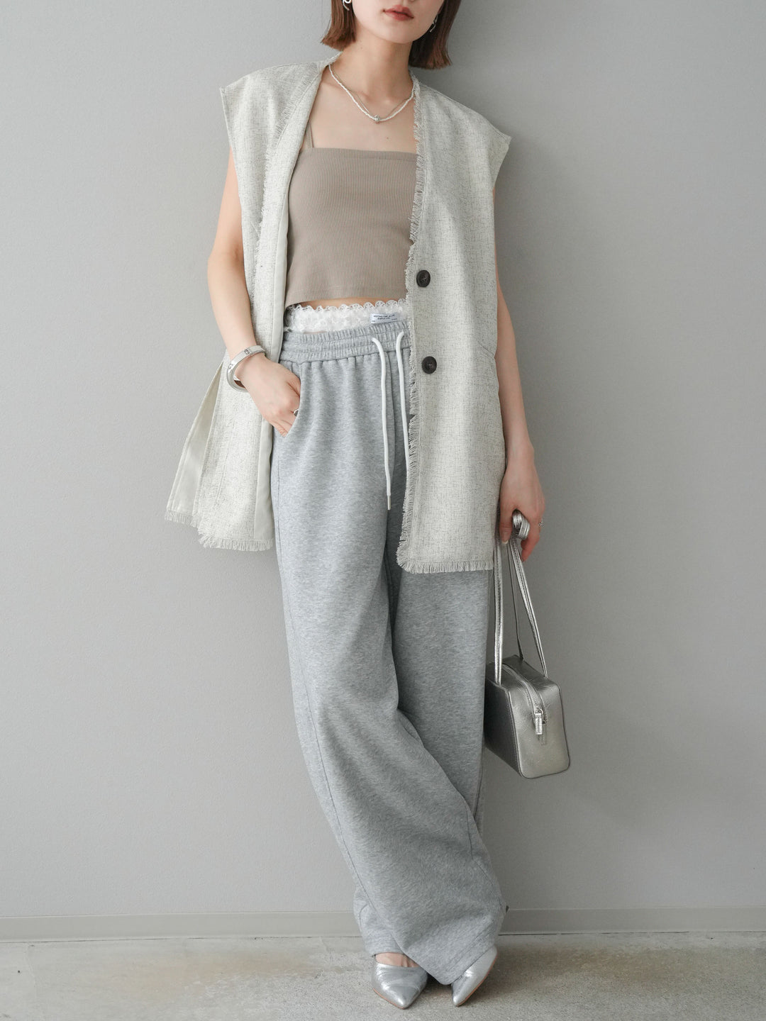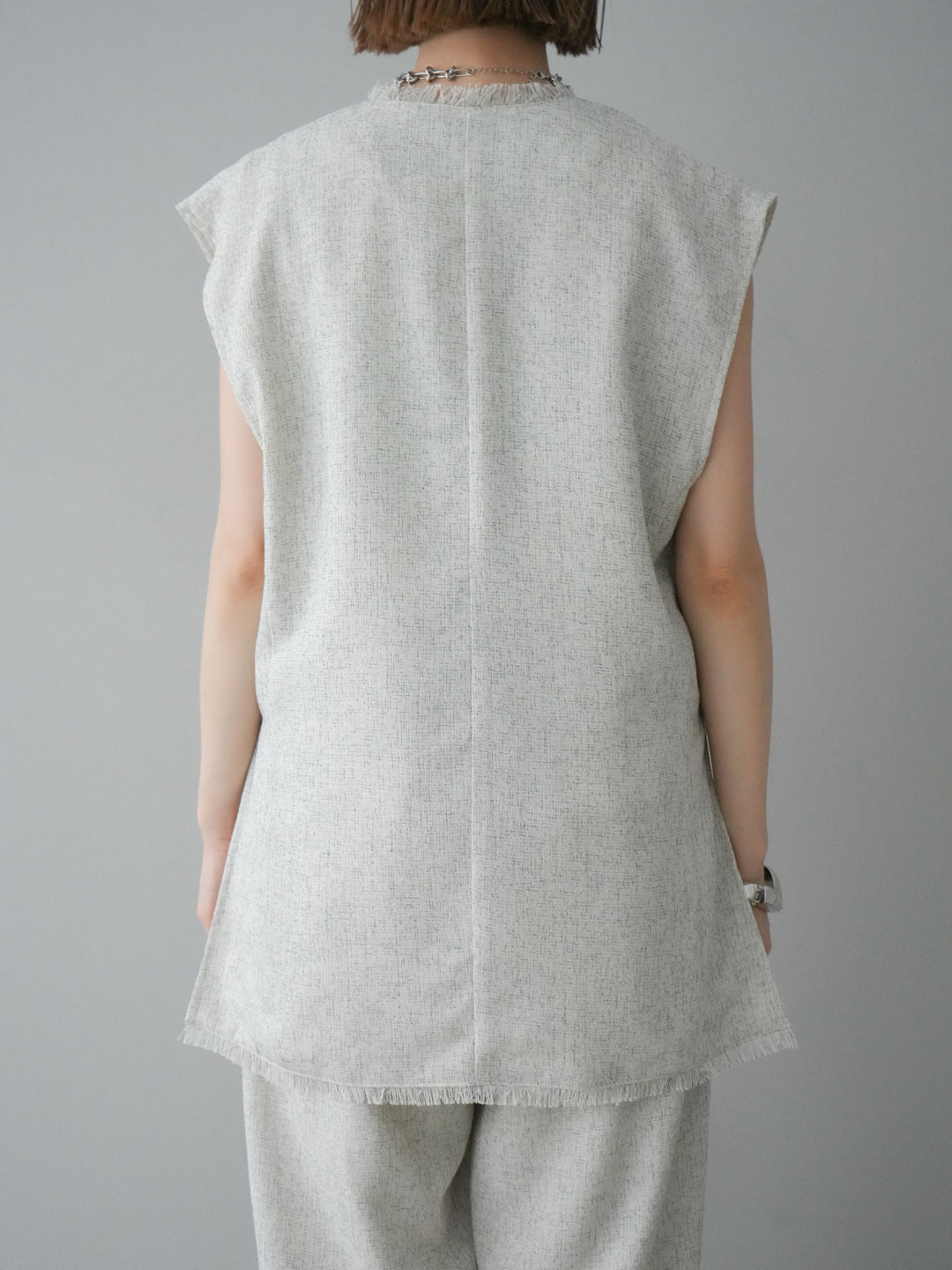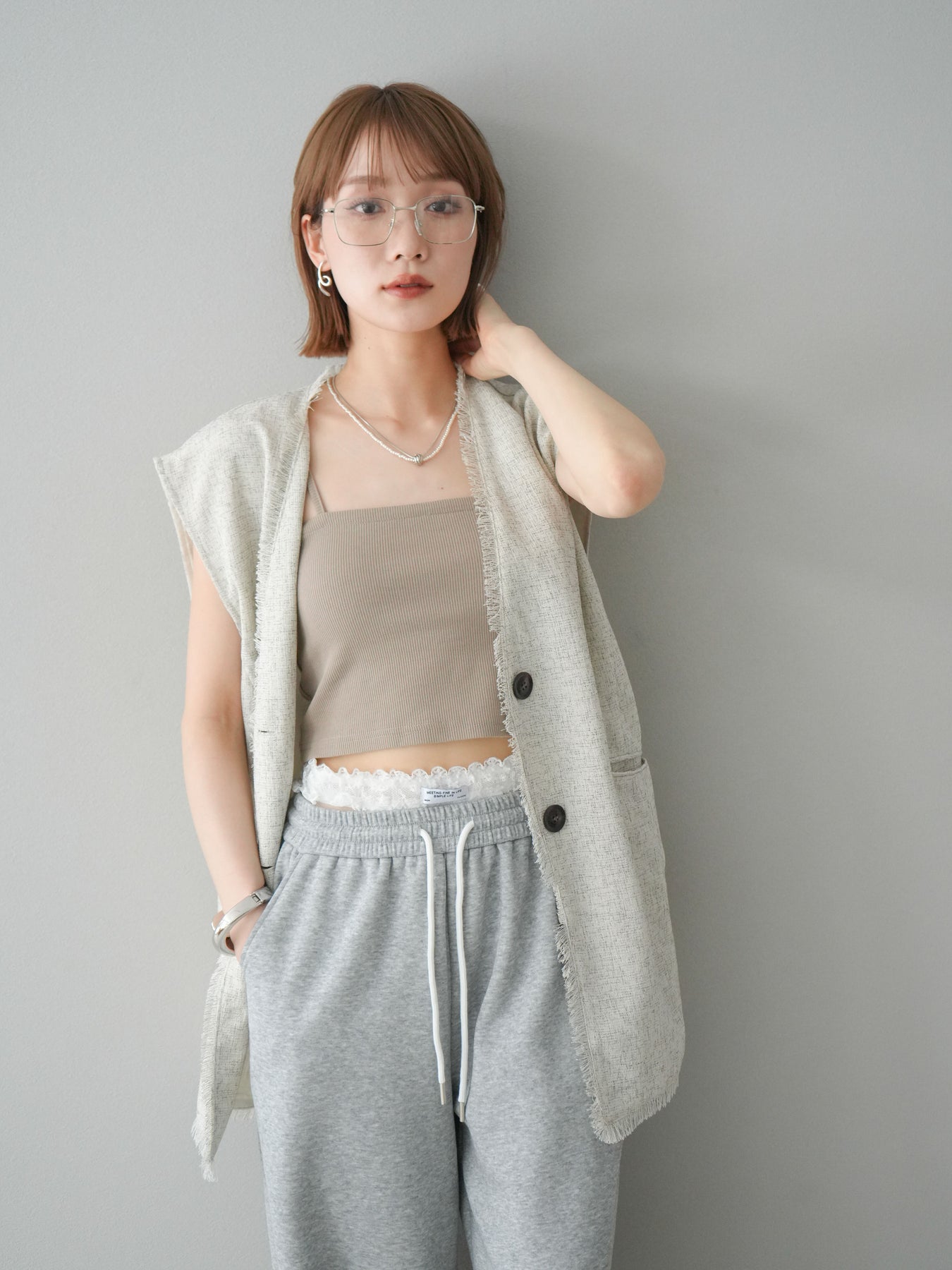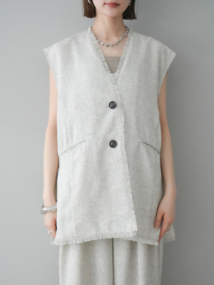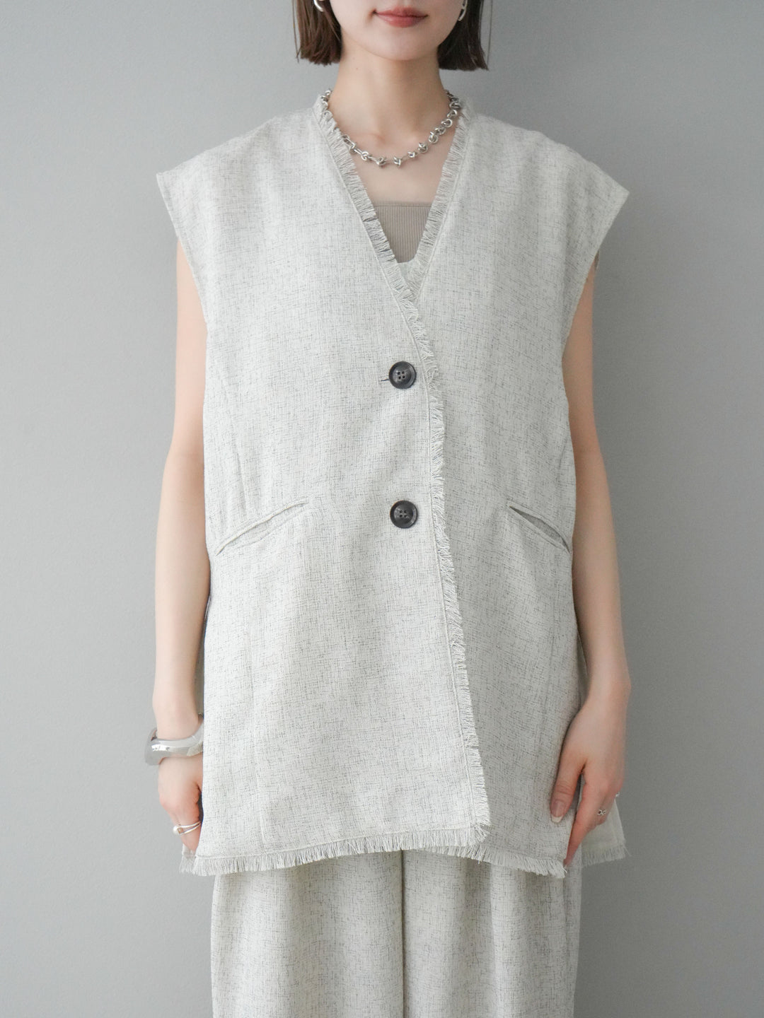 品のあるツイード素材にフリンジデザインをプラスした、こなれ感漂うジレ。 リラクシーなシルエットで羽織るだけで洗練された印象に。 Tシャツやキャミソールとレイヤードすれば、カジュアルからきれいめまで幅広く着こなせる一枚。 オンオフ問わず活躍する、トレンド感たっぷりのアイテムです。 ※ボトムス、キャミソール(インナー)以外の商品は一律でインナーは付属していません