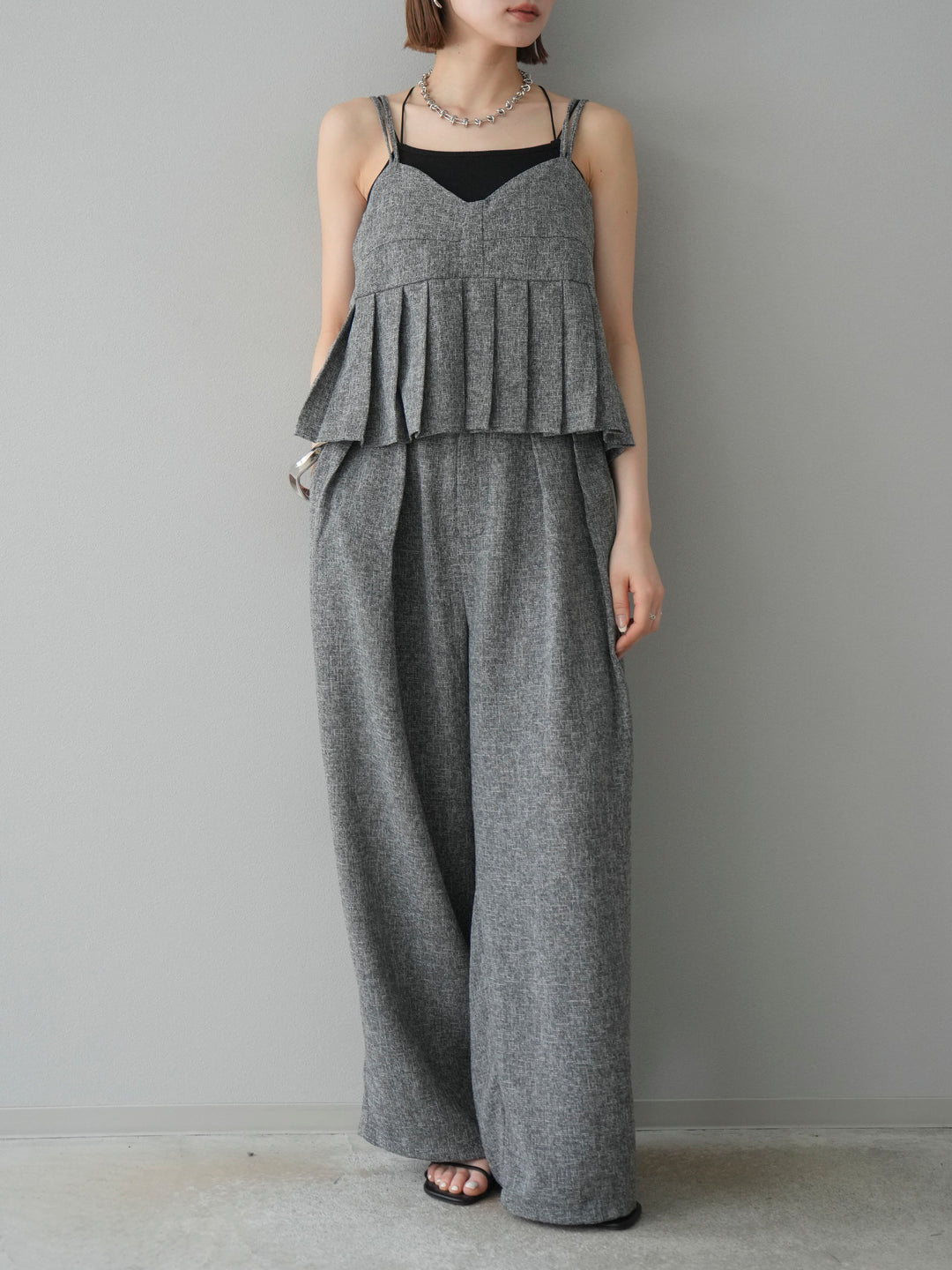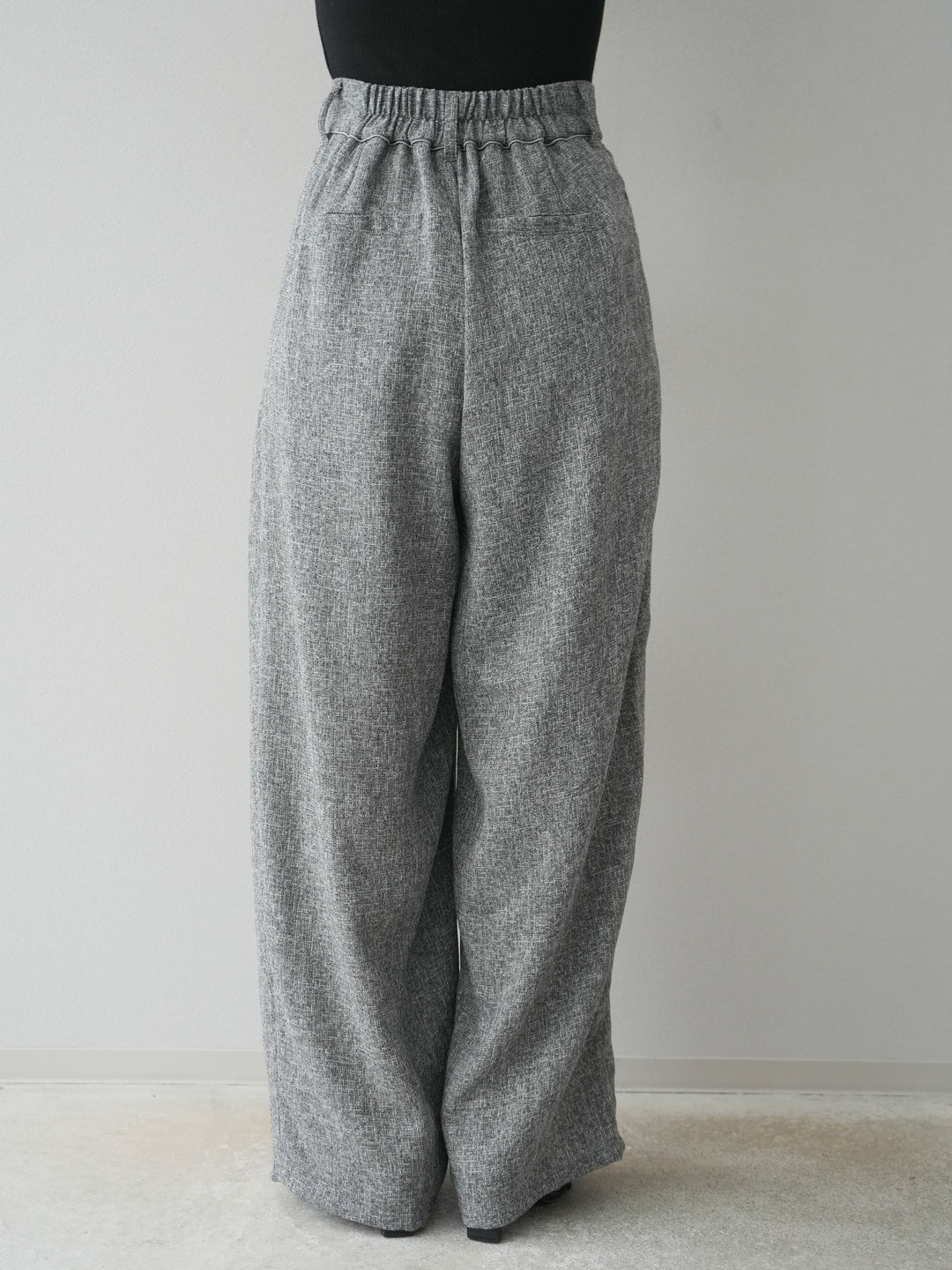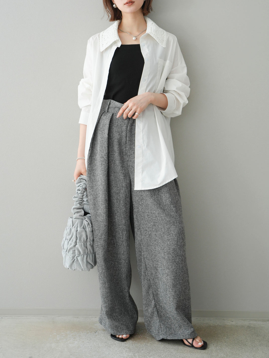 軽やかなツイード素材で仕立てたワイドパンツ。落ち感のあるシルエットが、上品で洗練された印象を演出します。ウエストはすっきりとしたデザインで、トップスをインしてもバランスよく決まる一枚。トレンドのセットアップスタイルはもちろん、シンプルなトップスと合わせても旬のムードに仕上がります。 ※ボトムス、キャミソール(インナー)以外の商品は一律でインナーは付属していません。