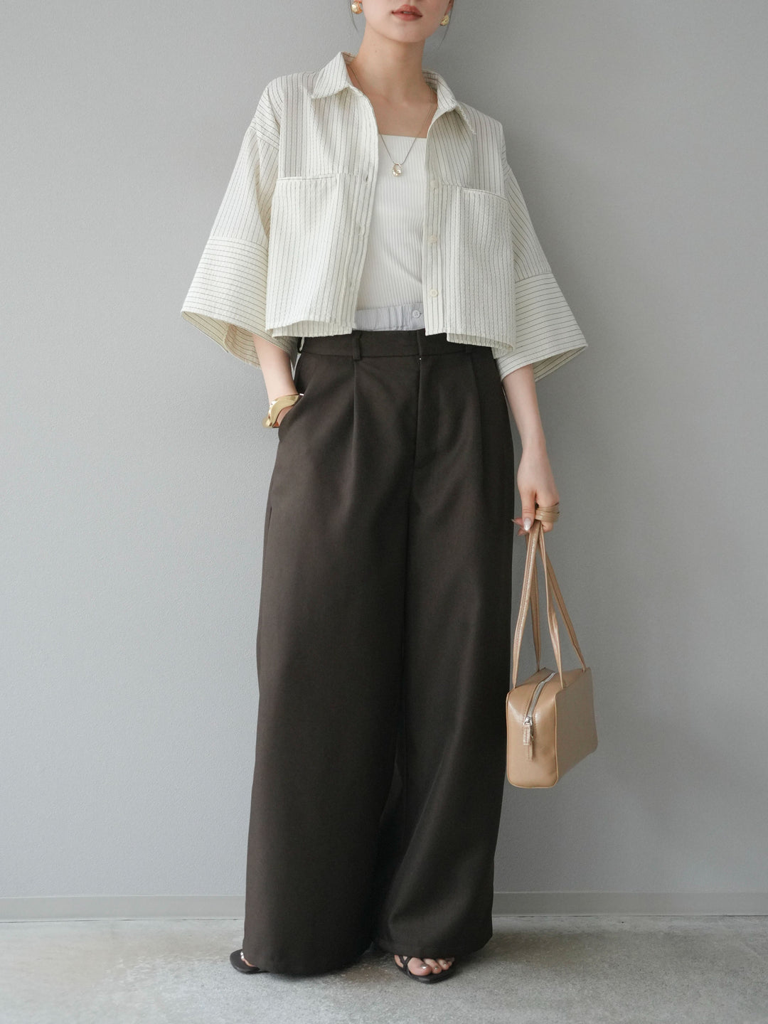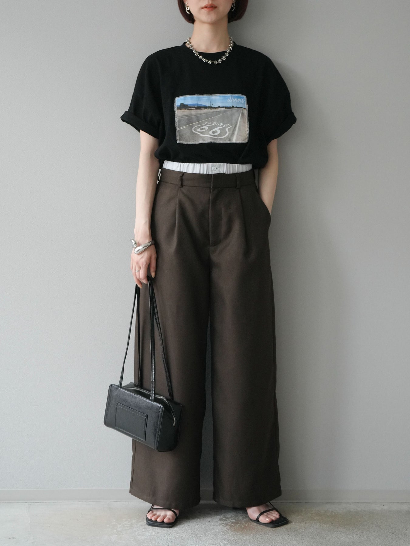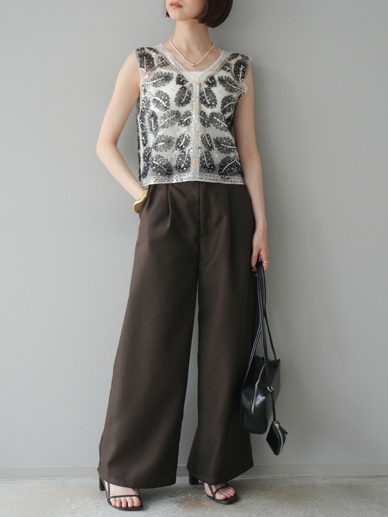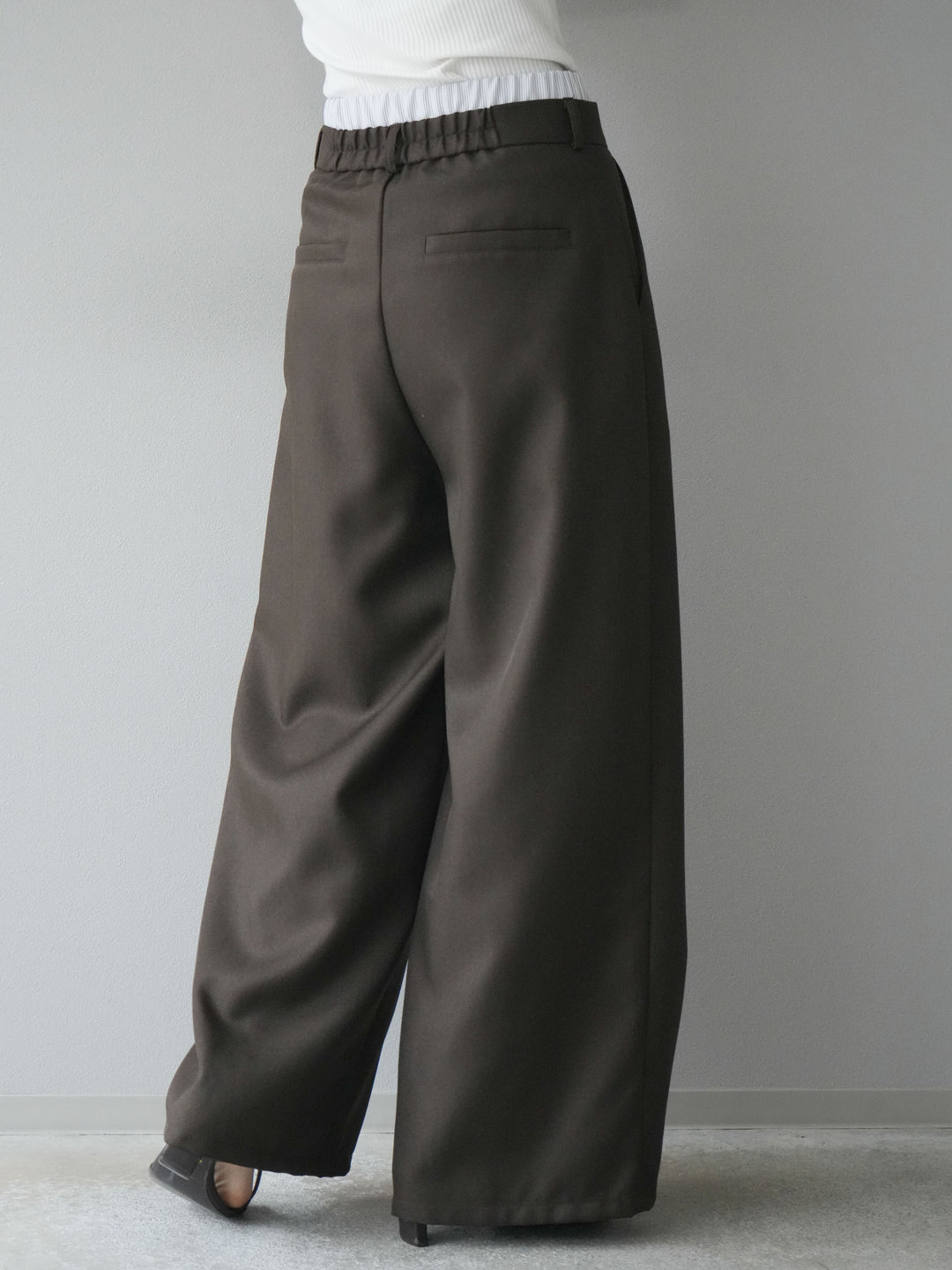トレンドライクなダブルウエスト風デザインが目を惹くワイドパンツ。ヘザーツイルのやや杢調の表情が上品で、カジュアルからきれいめまで幅広いスタイリングにマッチします。タック入りのゆったりシルエットが脚のラインを拾わず、リラクシーな穿き心地も魅力。ウエストゴム仕様で着脱もスムーズです。 ※ボトムス、キャミソール(インナー)以外の商品は一律でインナーは付属していません。